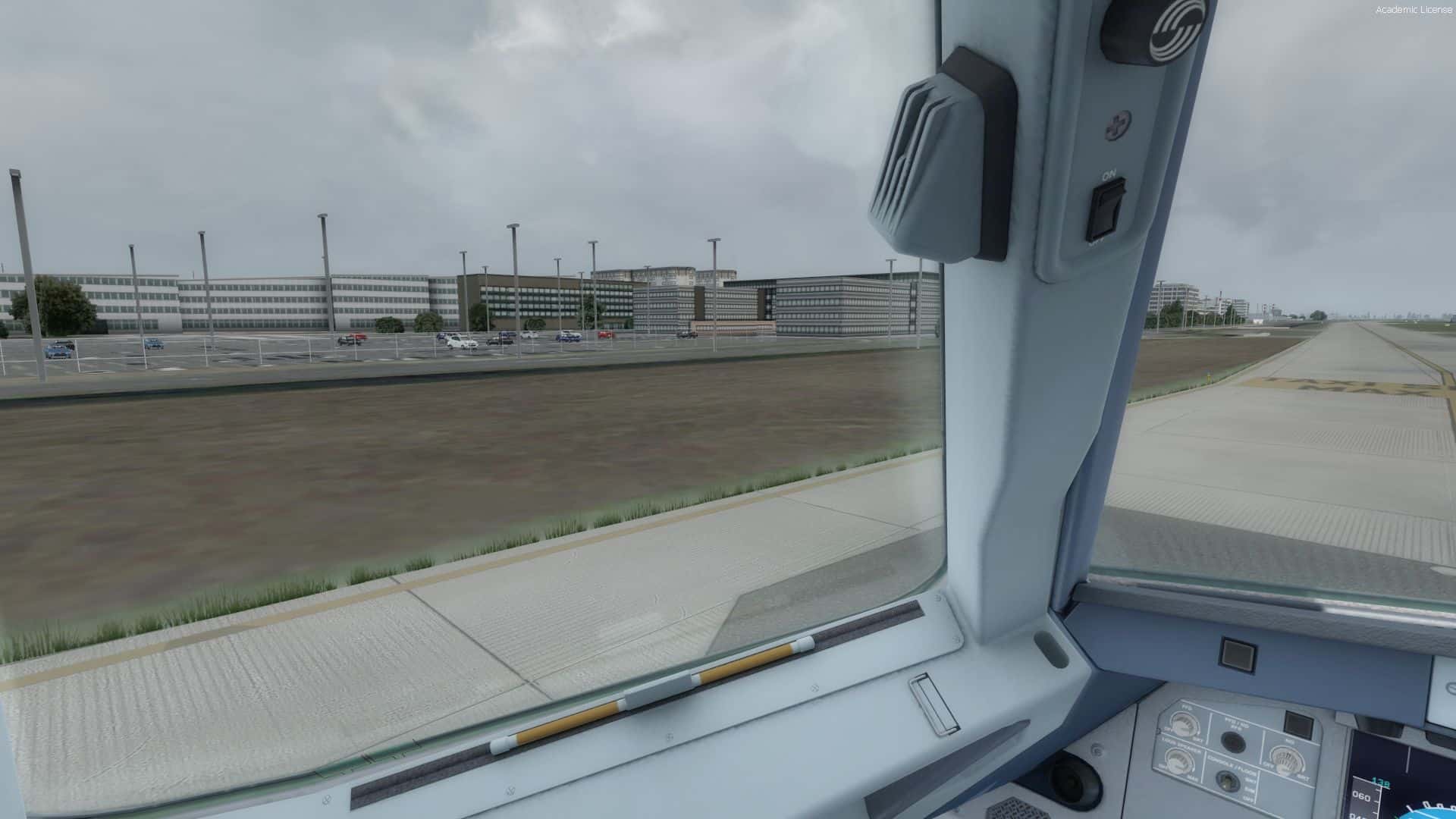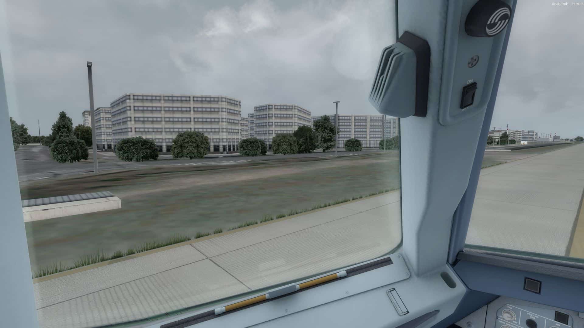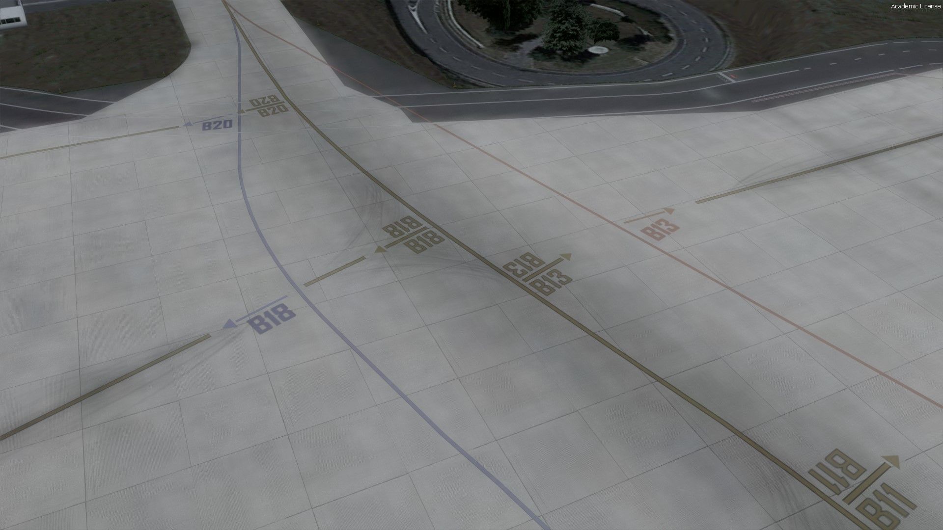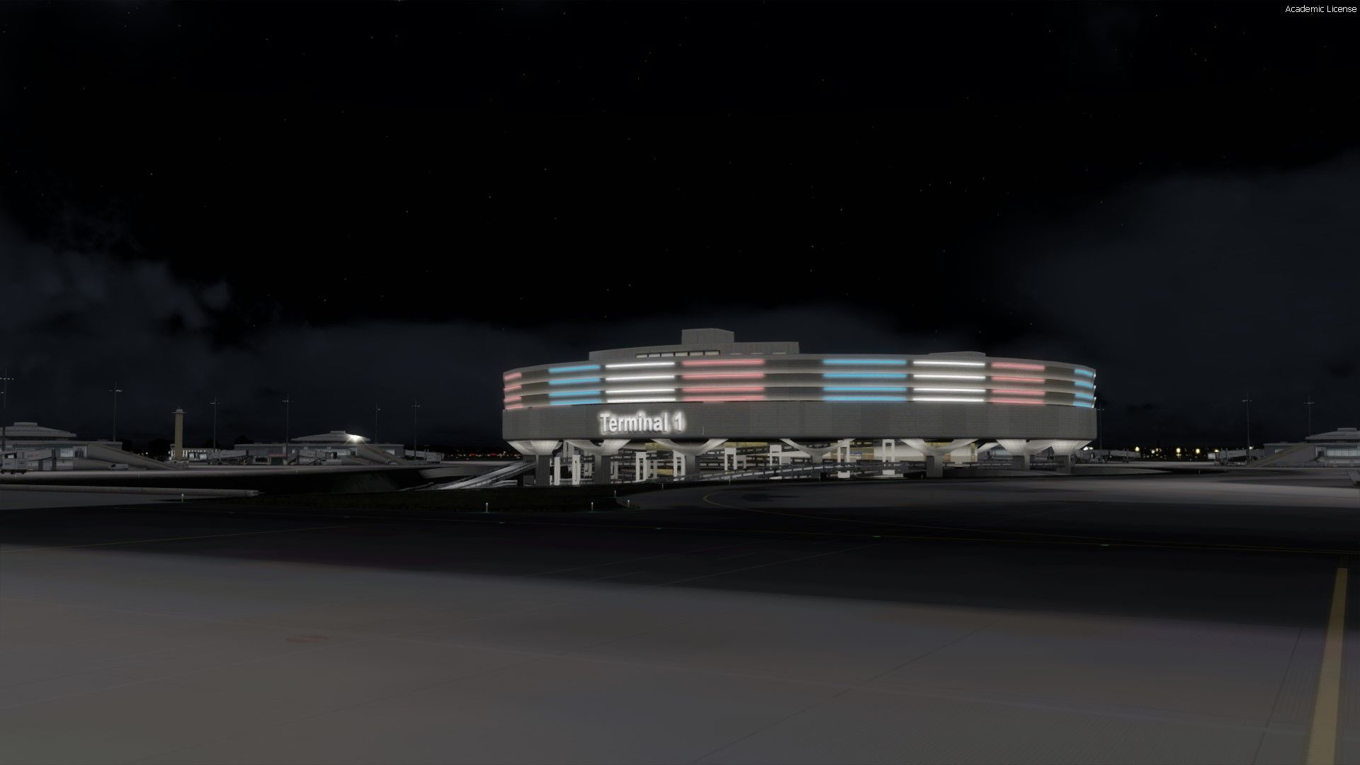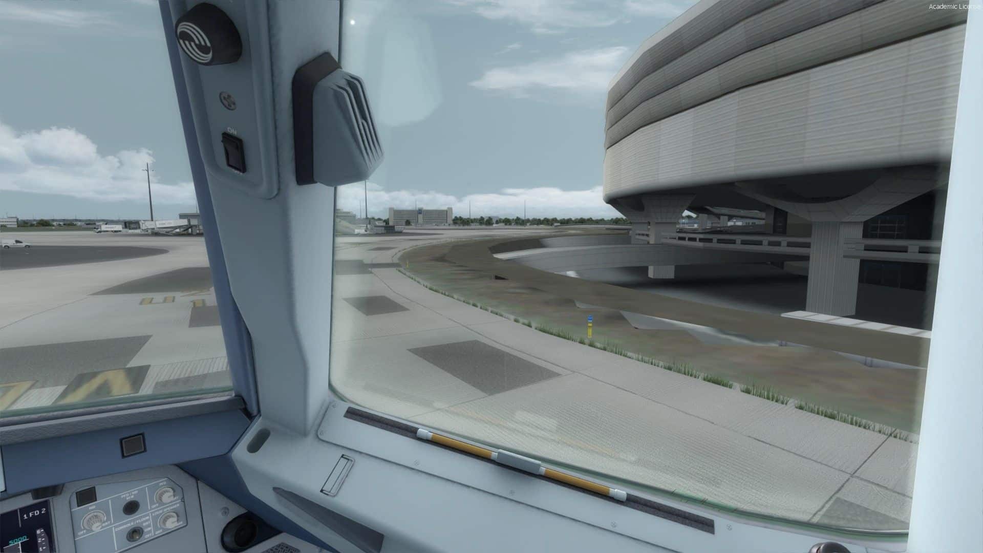 Die sogenannte Landside, der Bereich in dem Passagiere mit Auto, Taxi oder Bus ankommen bzw. abgeholt werden, ist bei dieser speziellen Bauform des Terminals direkt vom Rollfeld einzusehen. Sie befindet sich unterhalb des runden Gebäudes, ist aber von Taxi2Gate nicht mit besonderen Einzelheiten ausgestattet worden. Die Frage ob derartige Bereiche mit aufwendigeren Details dekortiert werden sollten, ist oftmals ein großer Streitpunkt bei neuen Szenerien. Eine Option (beispielsweise in einem Konfigurationstool o.ä.) für mehr Details wie zum Bespiel Fahrzeuge oder Laternen, die den Bereich lebendiger machen, hätte meiner Meinung nach einen guten Kompromiss zwischen Performance und „Eye-Candy“ dargestellt.