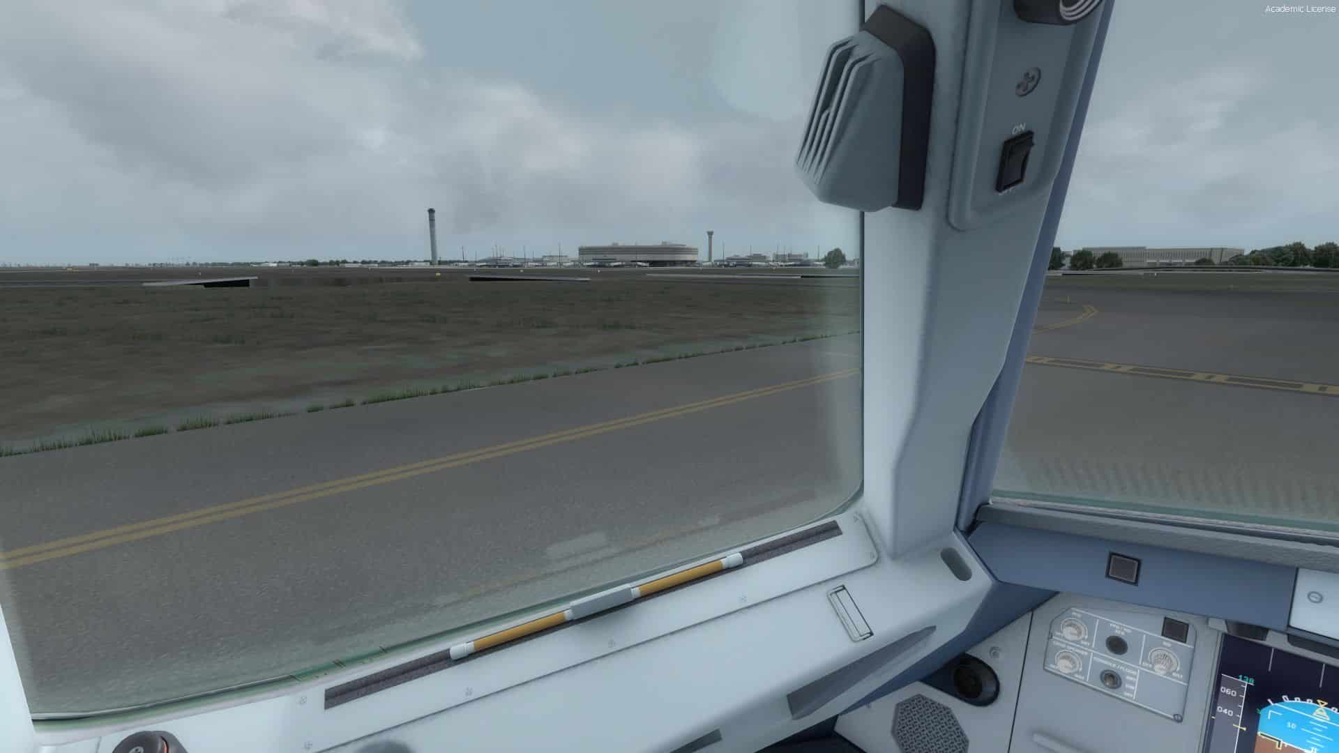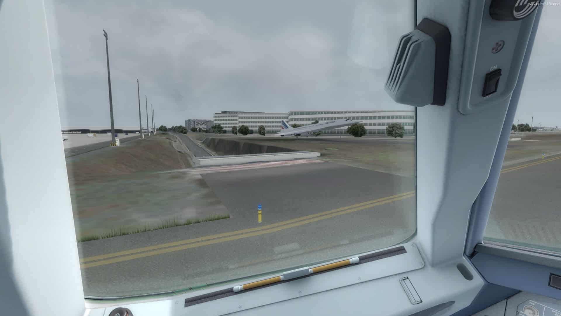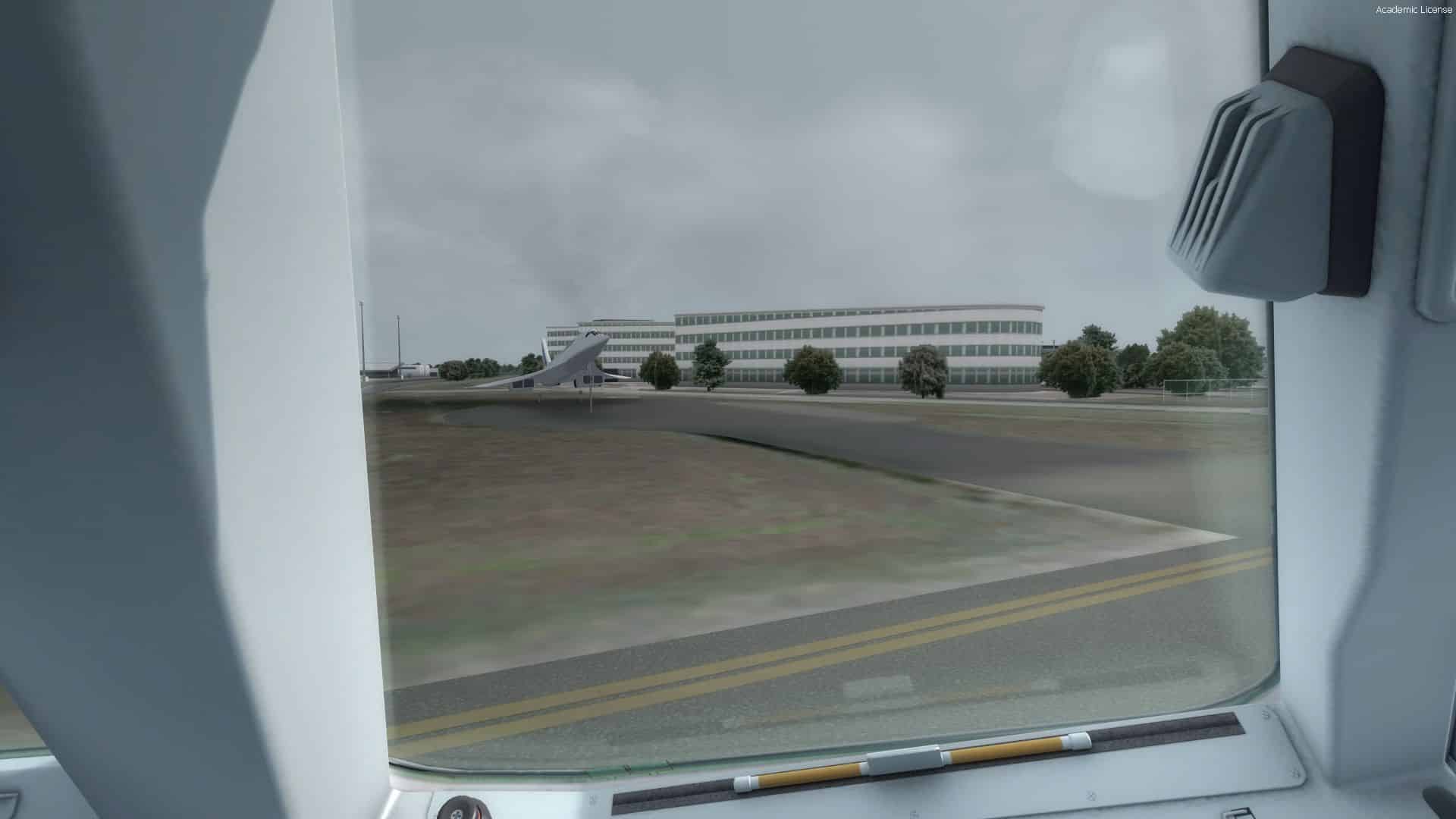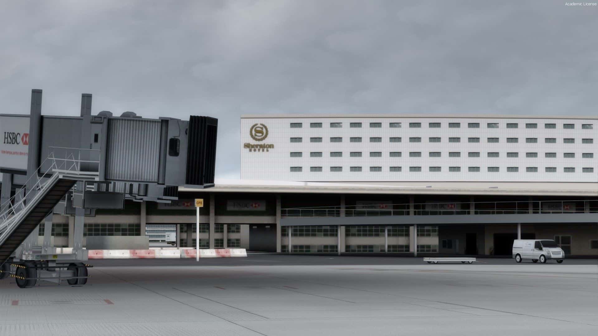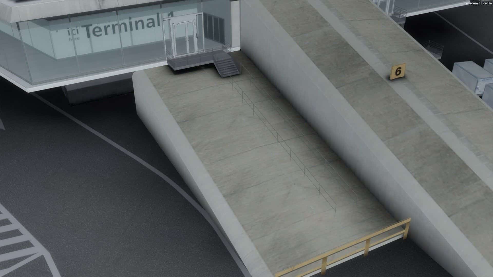 Die sogenannte Landside, der Bereich in dem Passagiere mit Auto, Taxi oder Bus ankommen bzw. abgeholt werden, ist bei dieser speziellen Bauform des Terminals direkt vom Rollfeld einzusehen. Sie befindet sich unterhalb des runden Gebäudes, ist aber von Taxi2Gate nicht mit besonderen Einzelheiten ausgestattet worden. Die Frage ob derartige Bereiche mit aufwendigeren Details dekortiert werden sollten, ist oftmals ein großer Streitpunkt bei neuen Szenerien. Eine Option (beispielsweise in einem Konfigurationstool o.ä.) für mehr Details wie zum Bespiel Fahrzeuge oder Laternen, die den Bereich lebendiger machen, hätte meiner Meinung nach einen guten Kompromiss zwischen Performance und „Eye-Candy“ dargestellt.