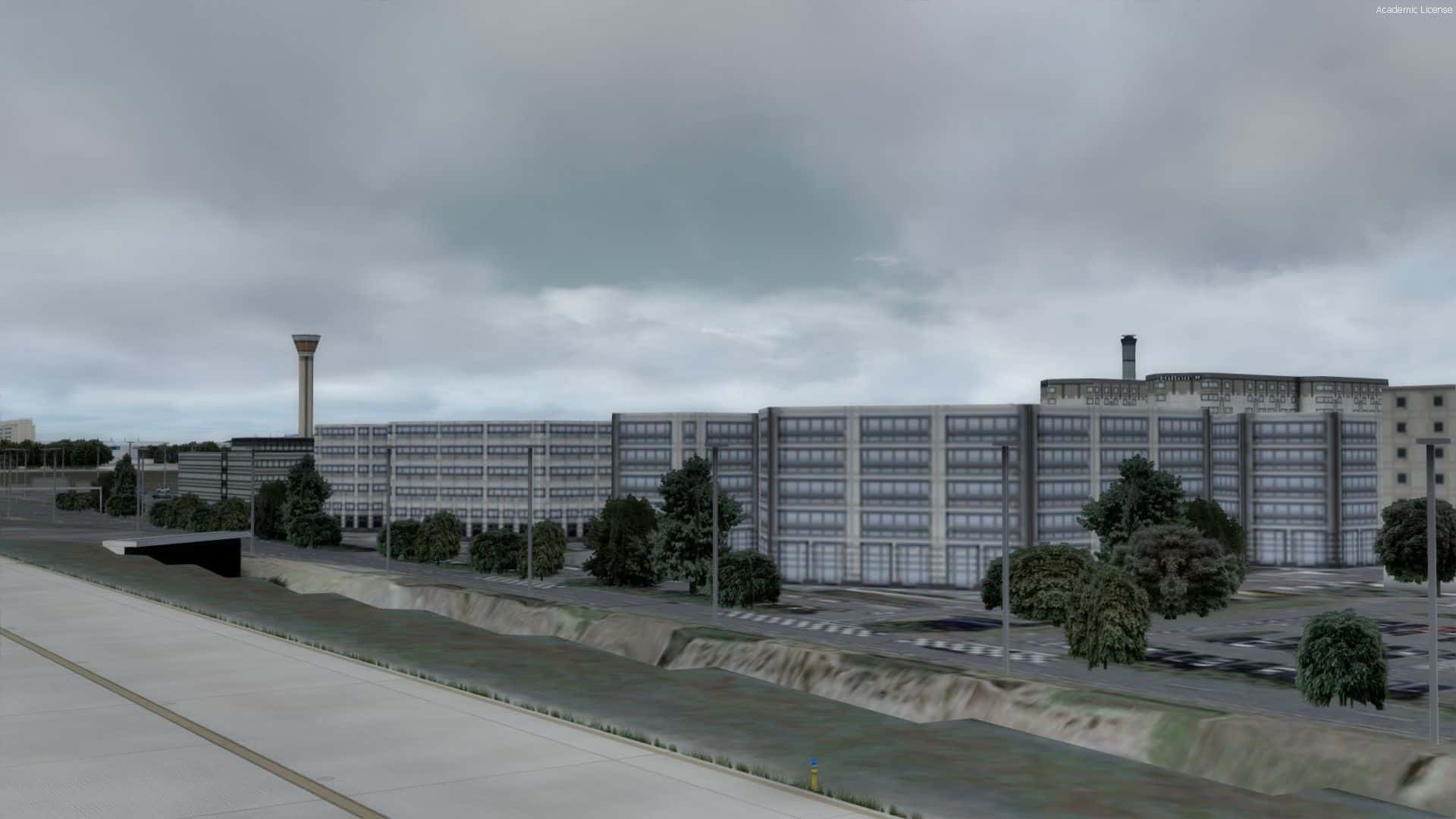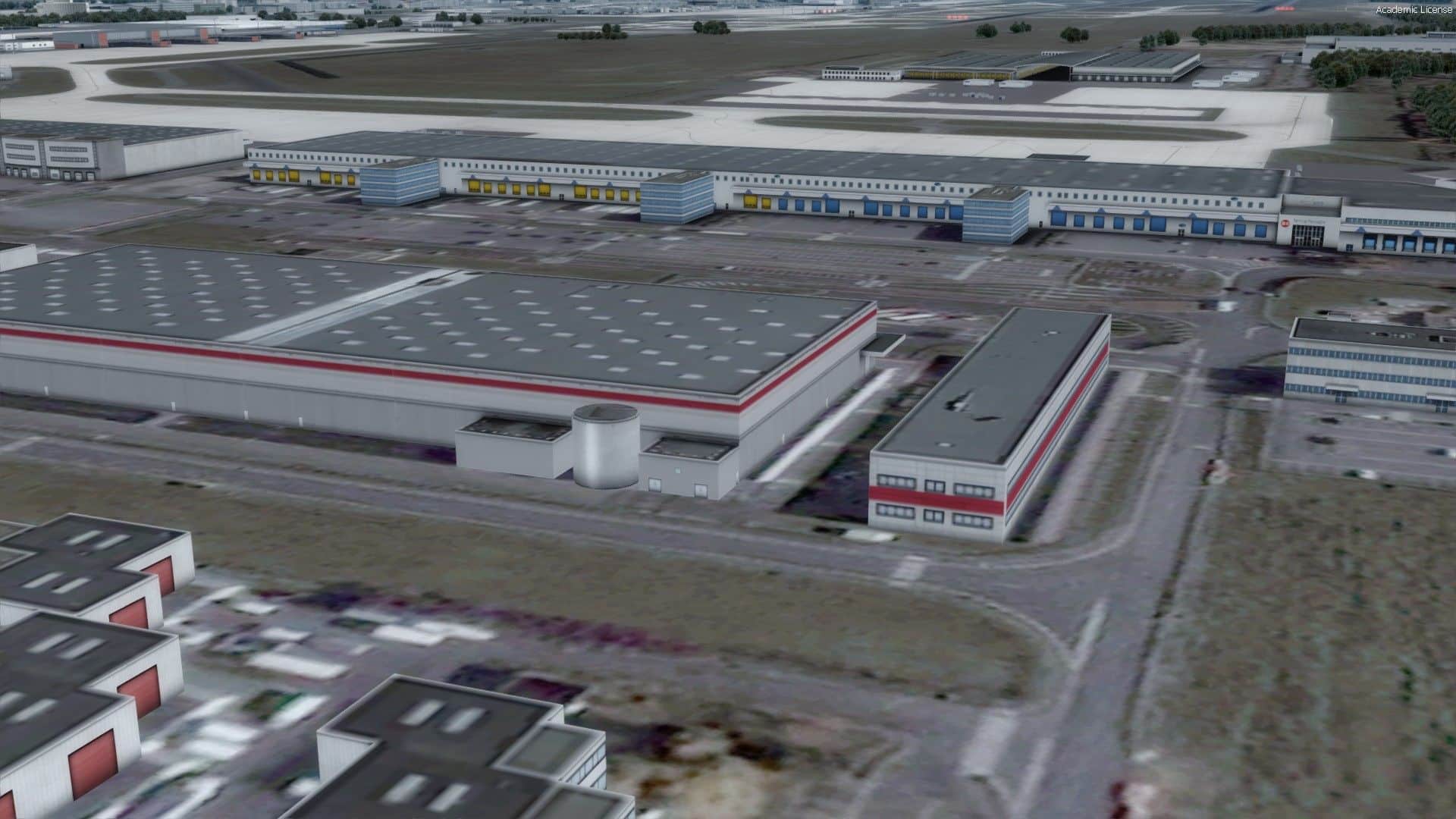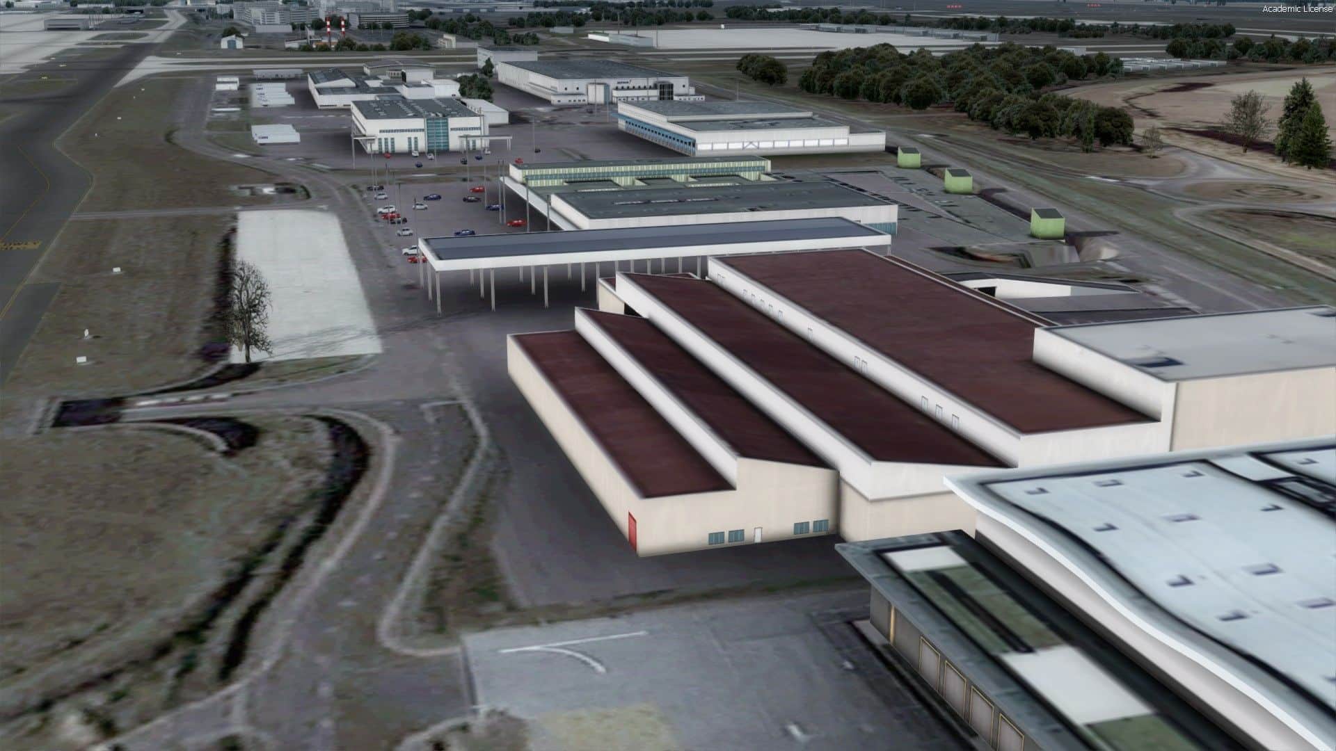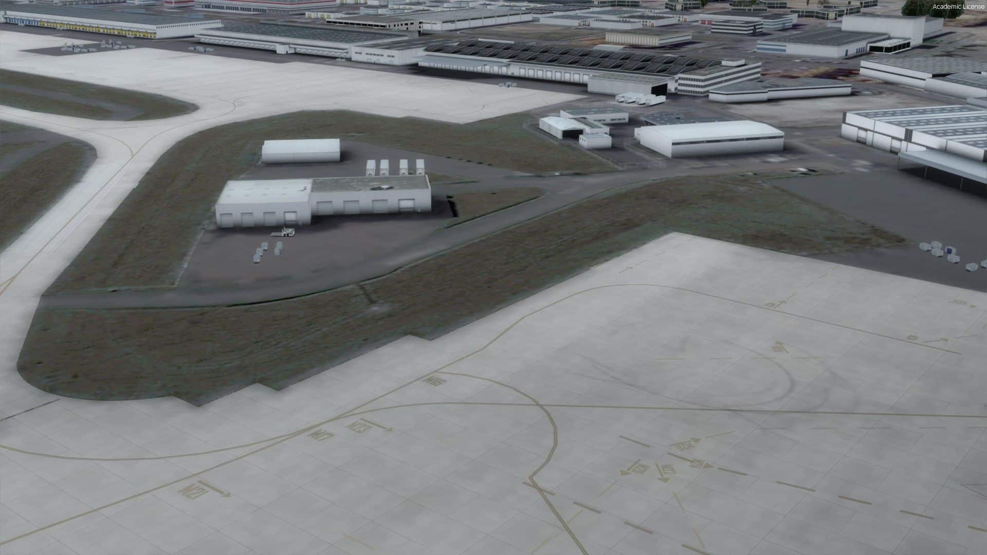 Um den Flughafen herum liegen Felder und im Westen ein Gewerbegebiet. Taxi2Gate hat das Umfeld auf einer Fototextur umgesetzt und einige zusätzliche Gebäude modelliert.
