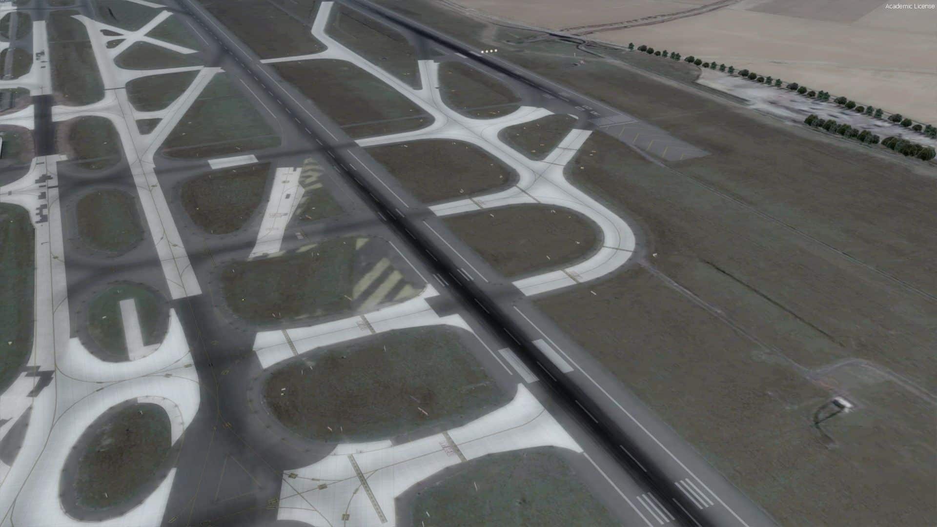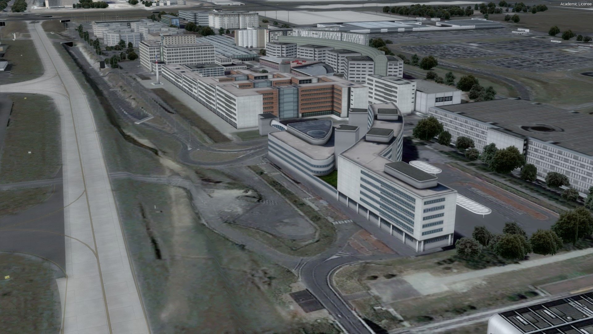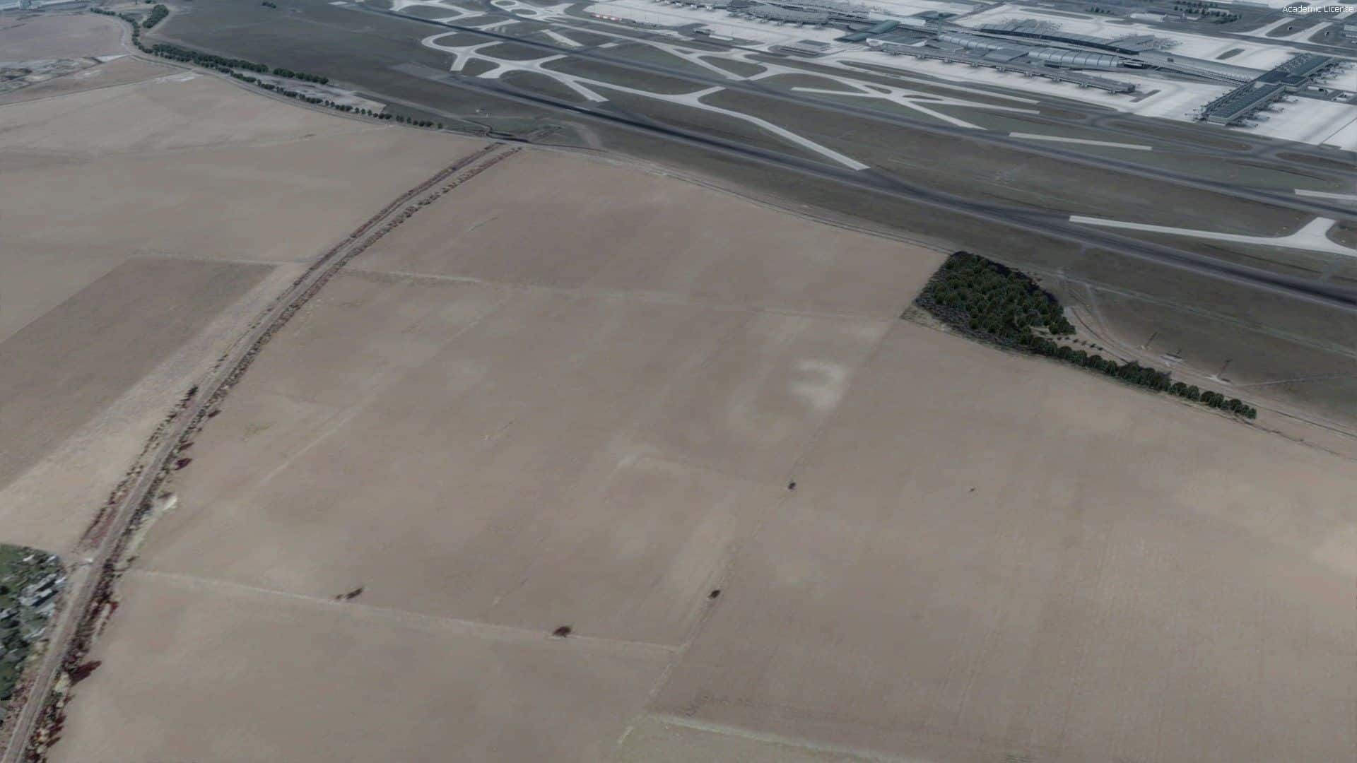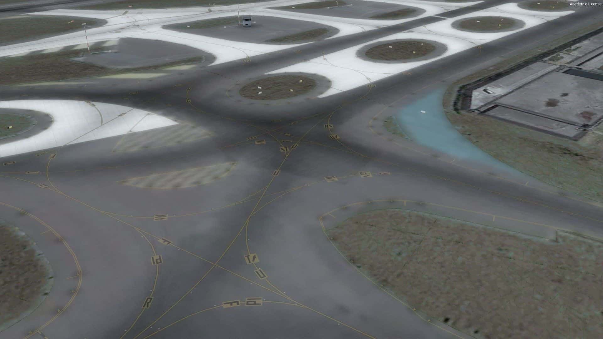 Um den Flughafen herum liegen Felder und im Westen ein Gewerbegebiet. Taxi2Gate hat das Umfeld auf einer Fototextur umgesetzt und einige zusätzliche Gebäude modelliert.