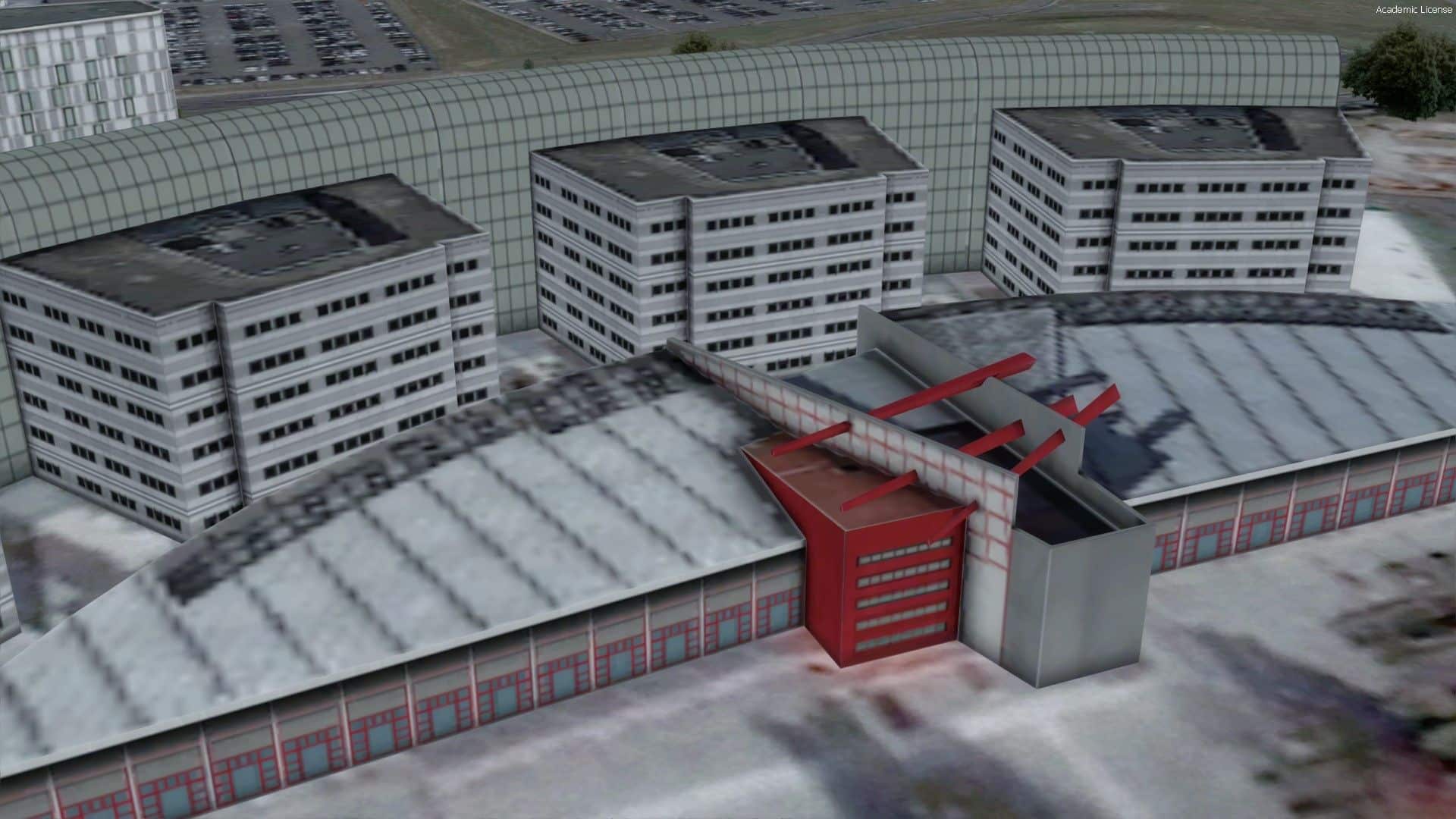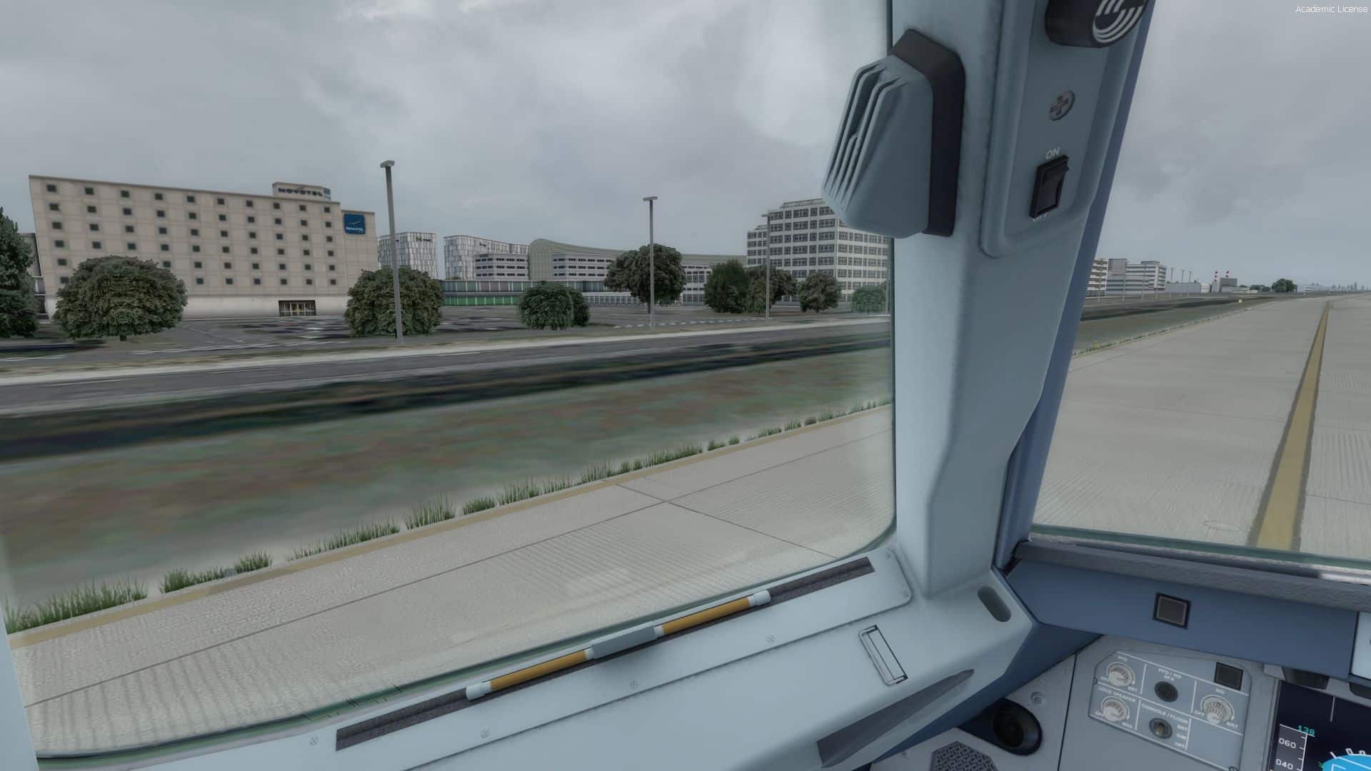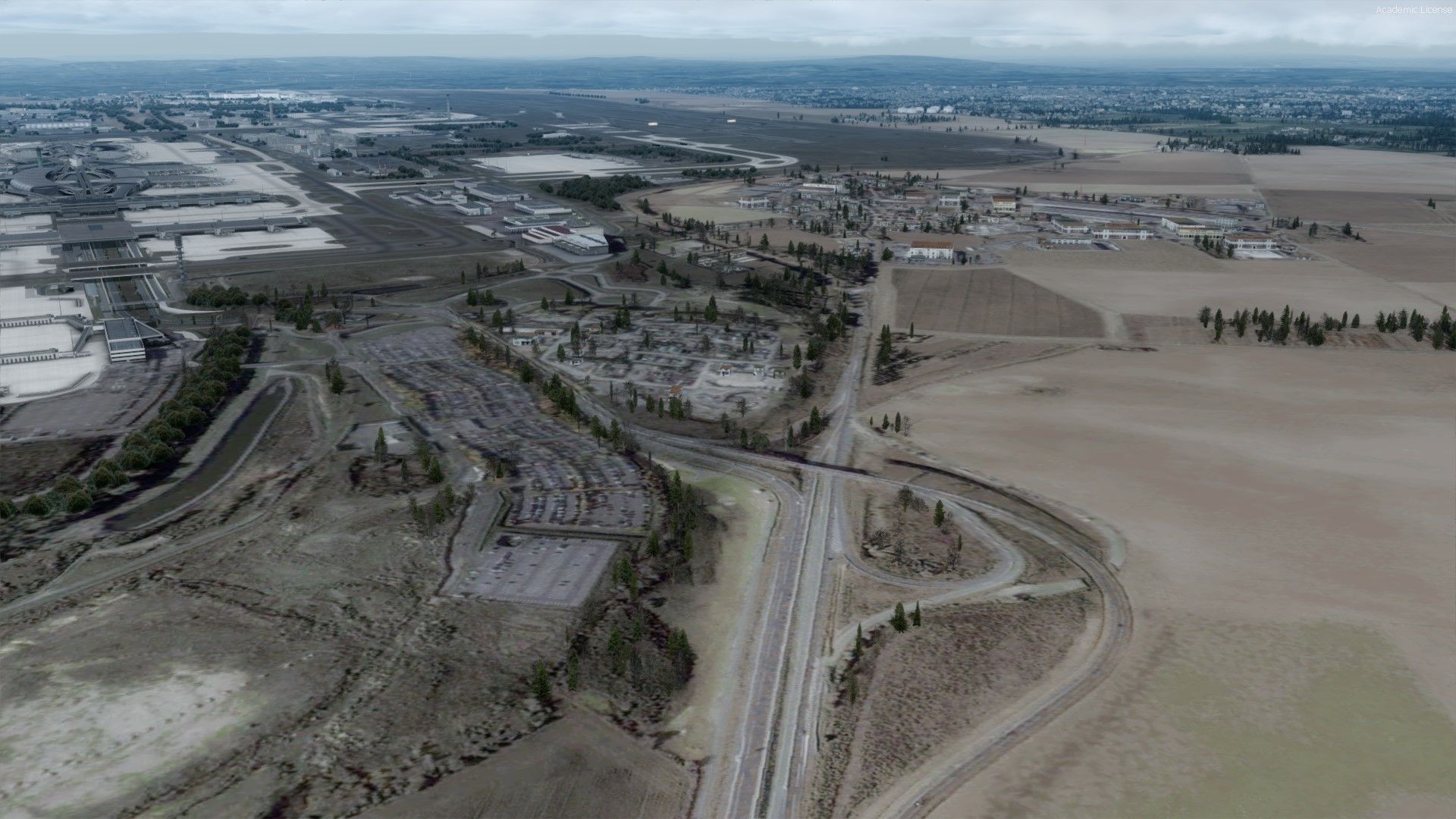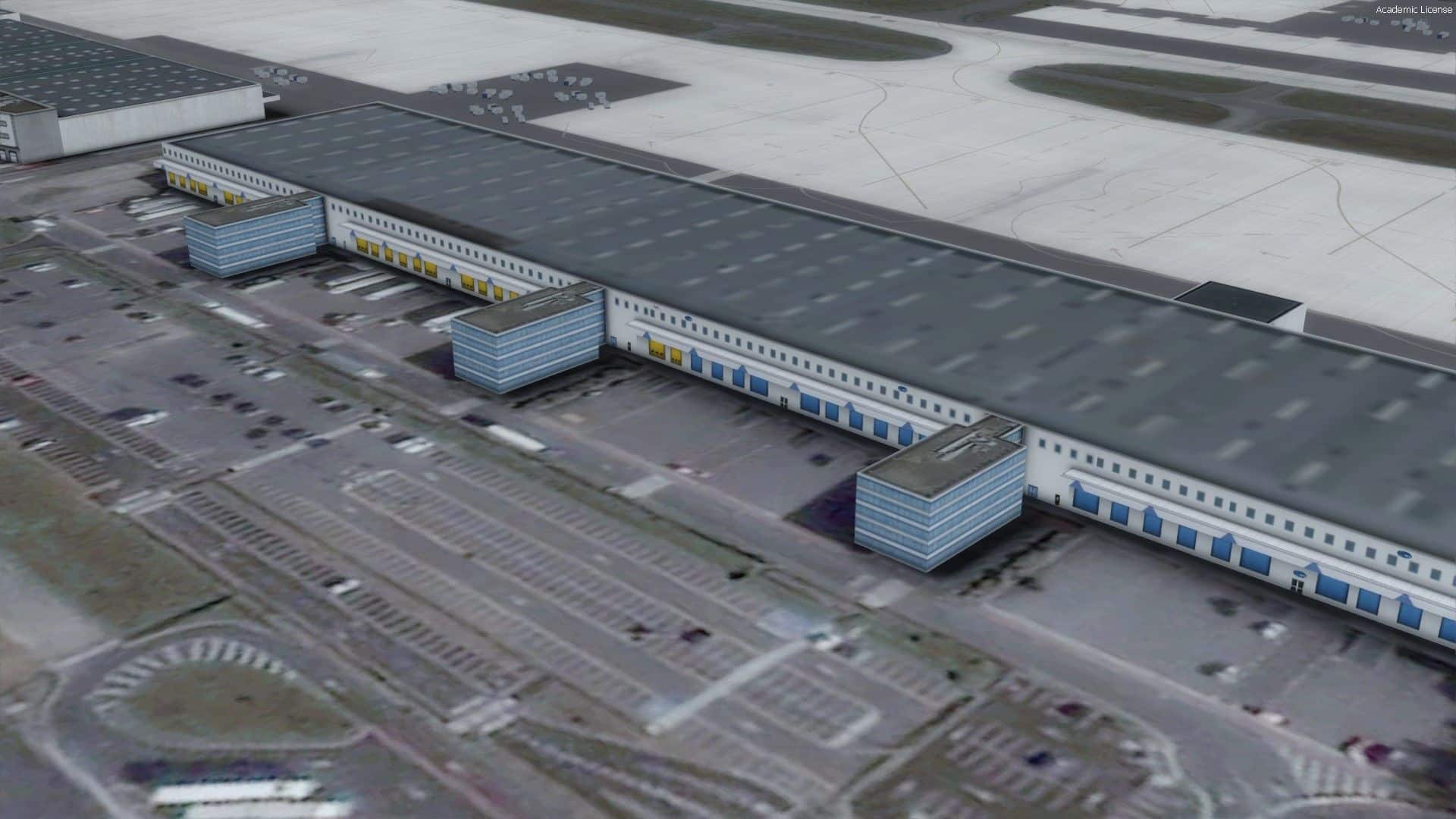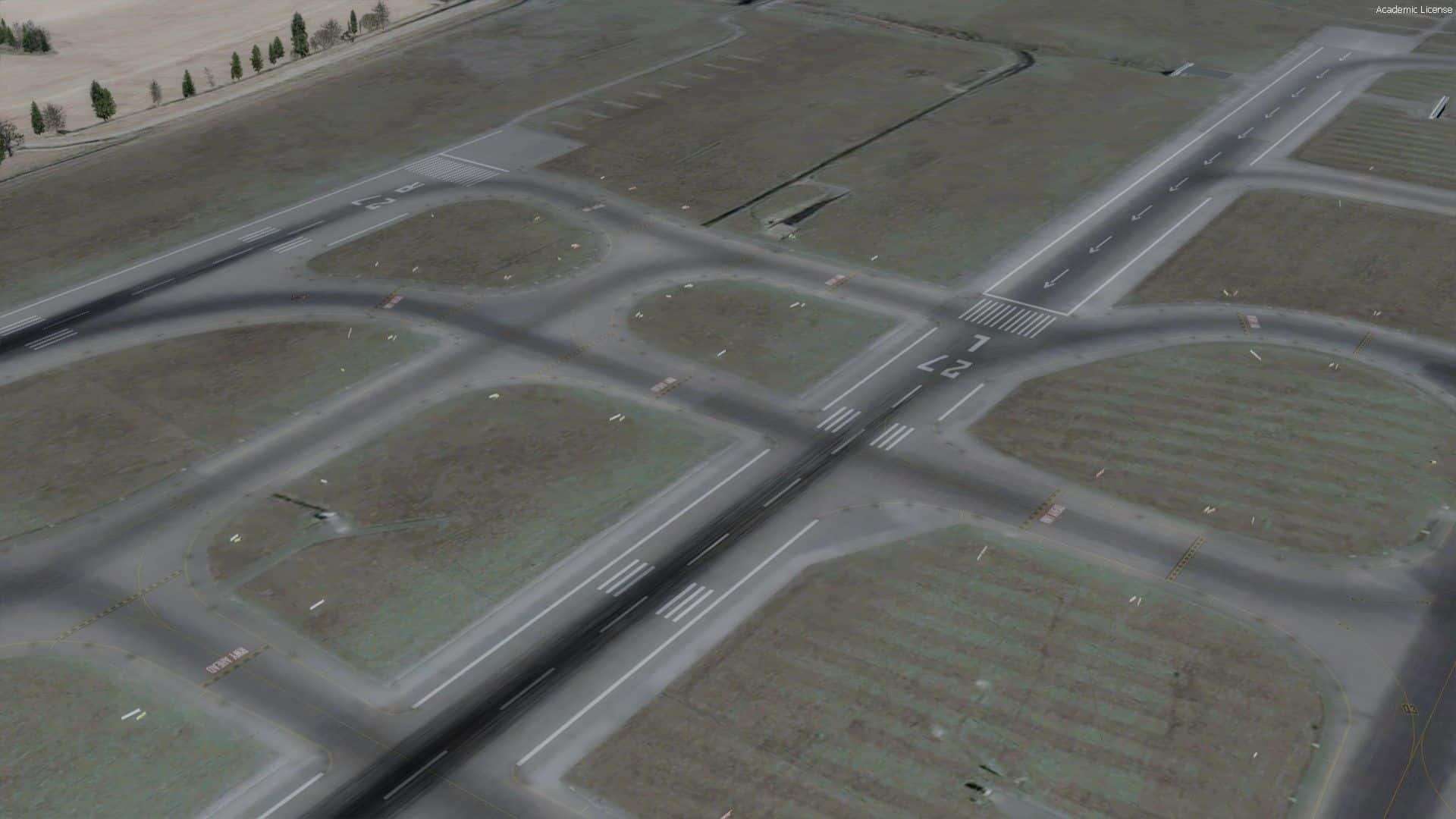 Um den Flughafen herum liegen Felder und im Westen ein Gewerbegebiet. Taxi2Gate hat das Umfeld auf einer Fototextur umgesetzt und einige zusätzliche Gebäude modelliert.