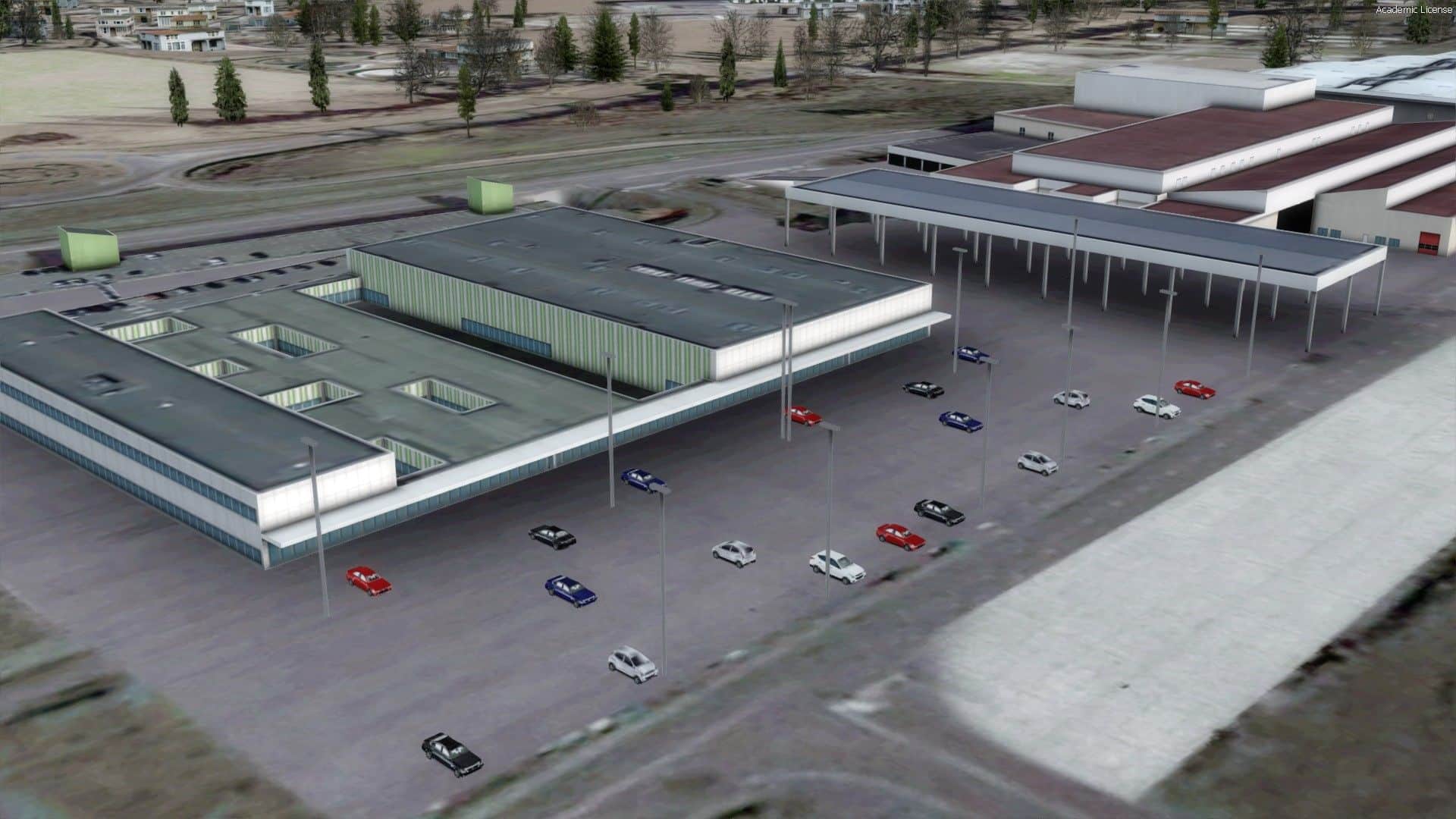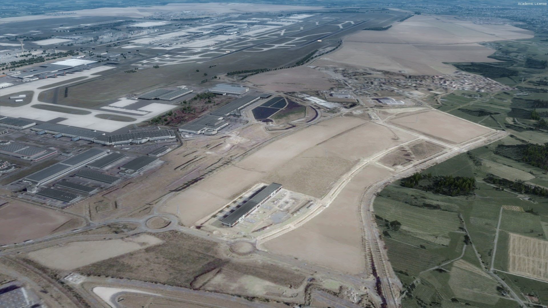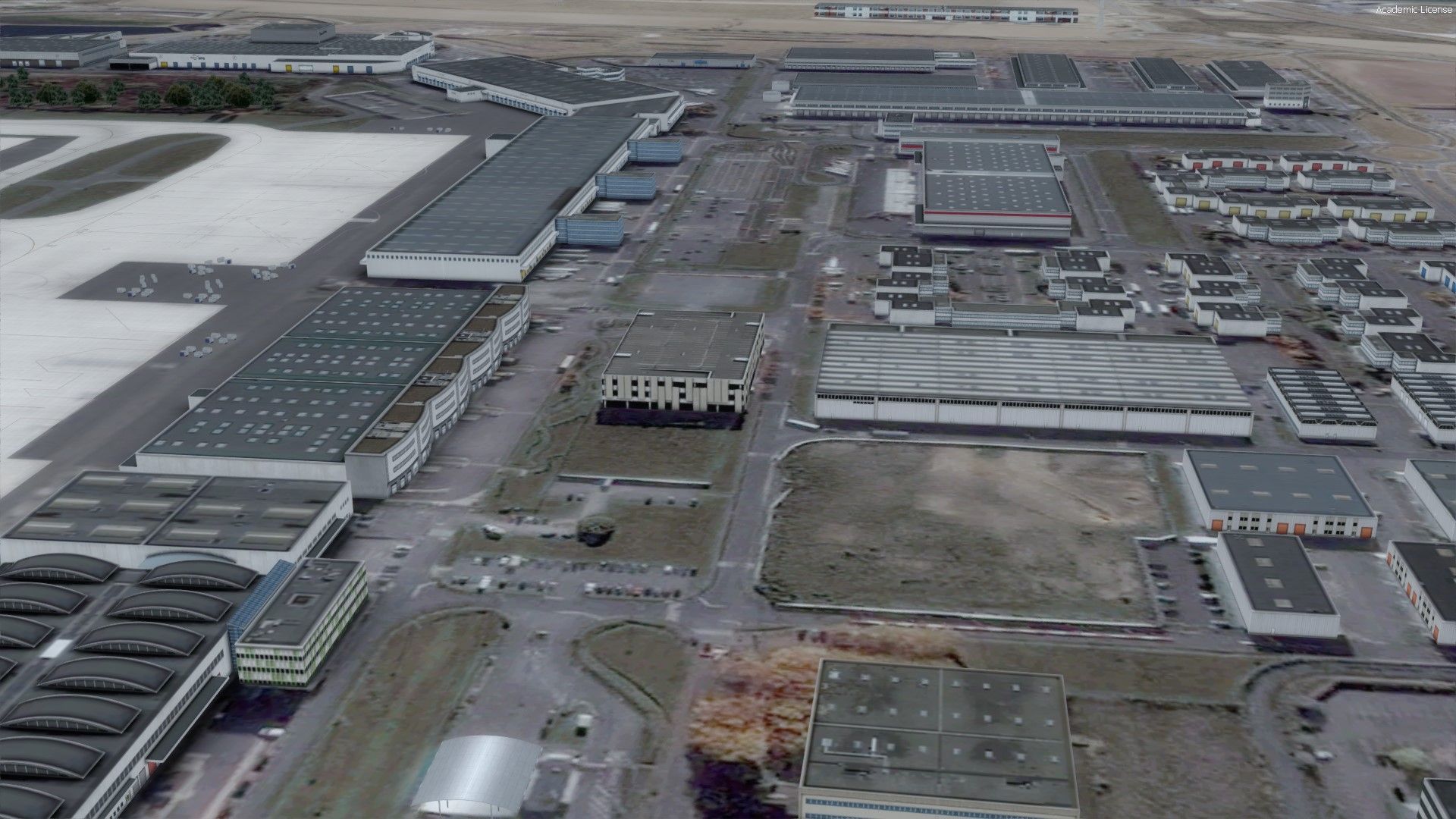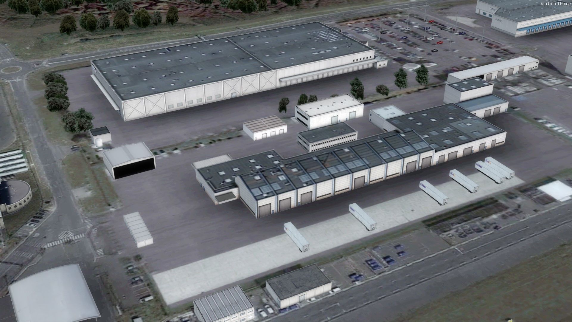 Um den Flughafen herum liegen Felder und im Westen ein Gewerbegebiet. Taxi2Gate hat das Umfeld auf einer Fototextur umgesetzt und einige zusätzliche Gebäude modelliert.