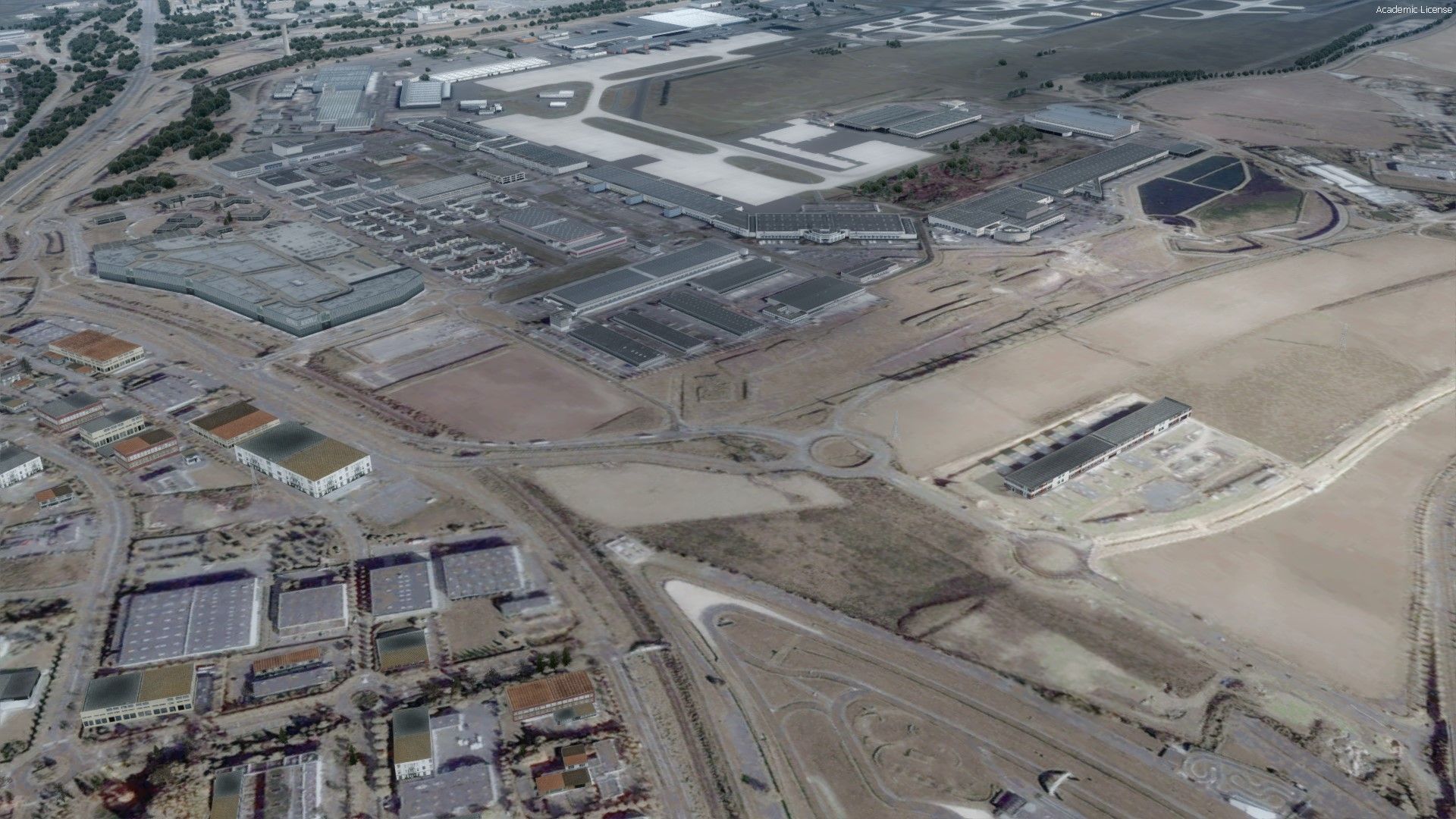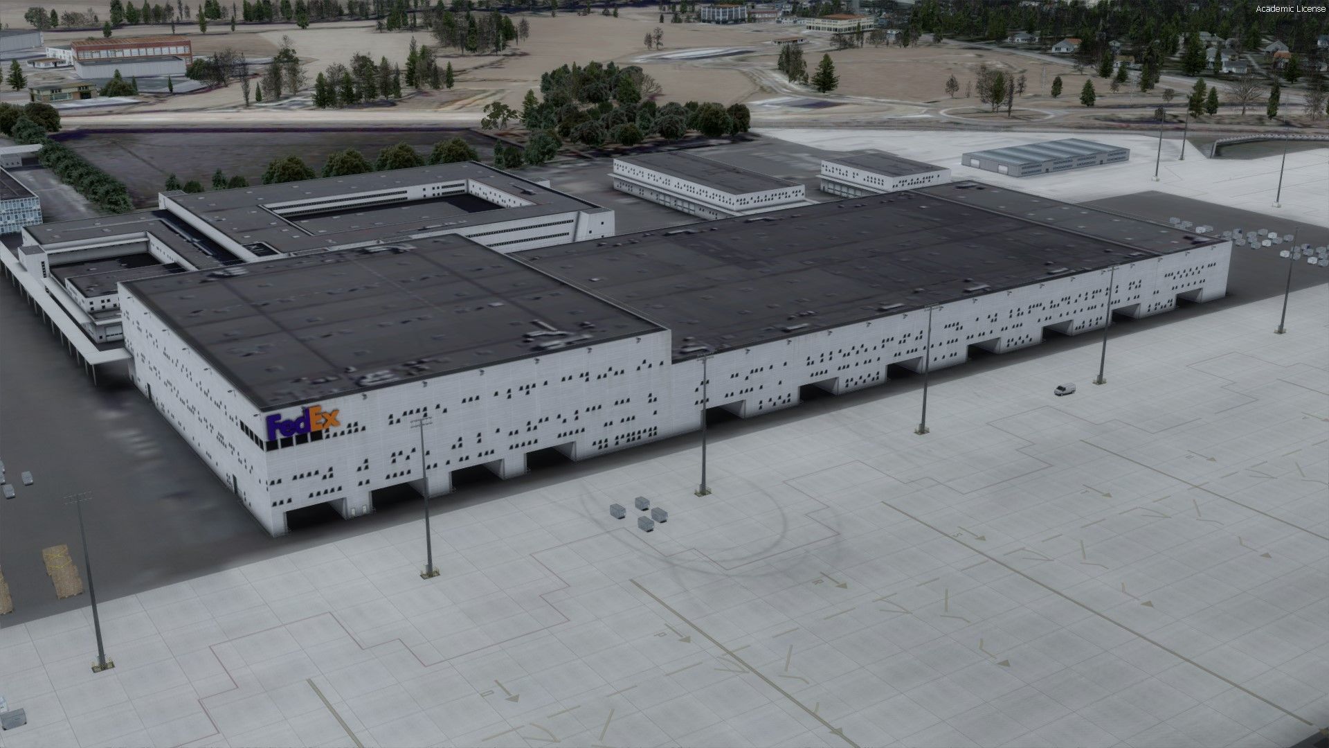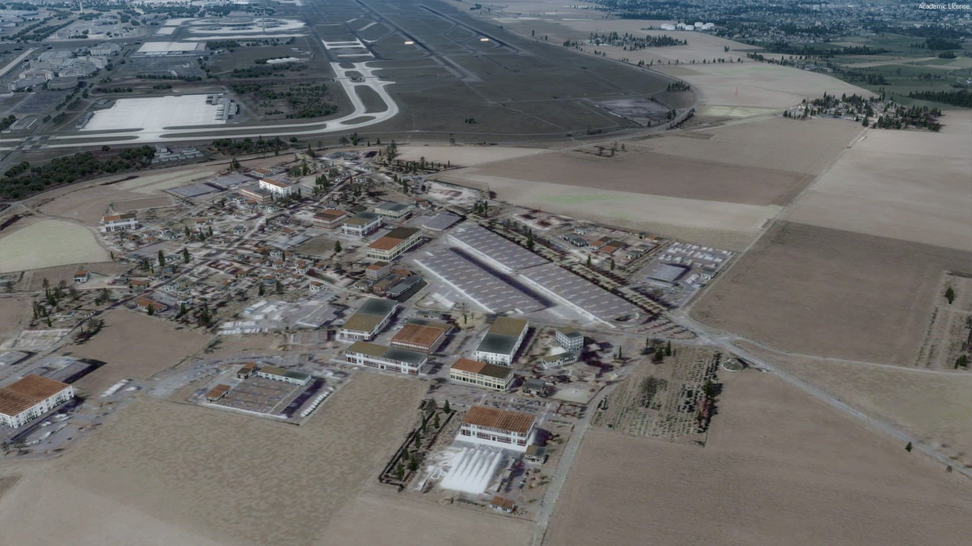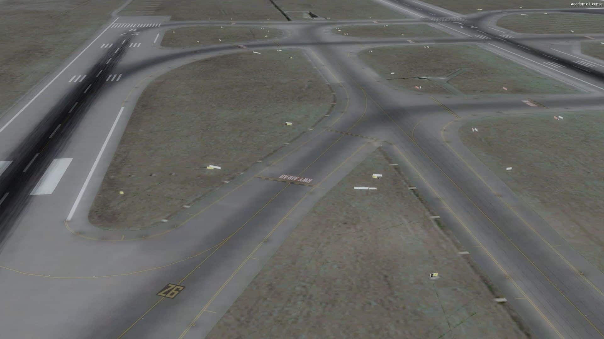 Um den Flughafen herum liegen Felder und im Westen ein Gewerbegebiet. Taxi2Gate hat das Umfeld auf einer Fototextur umgesetzt und einige zusätzliche Gebäude modelliert.