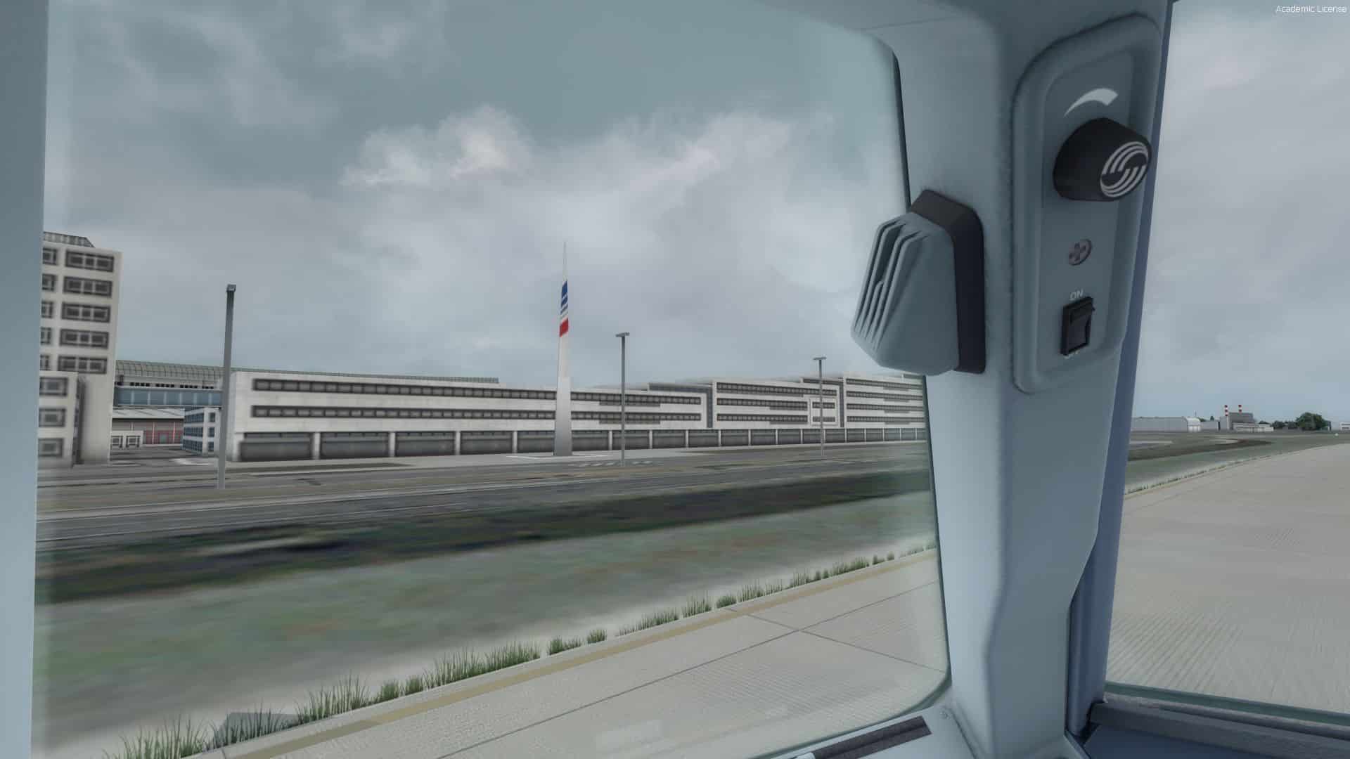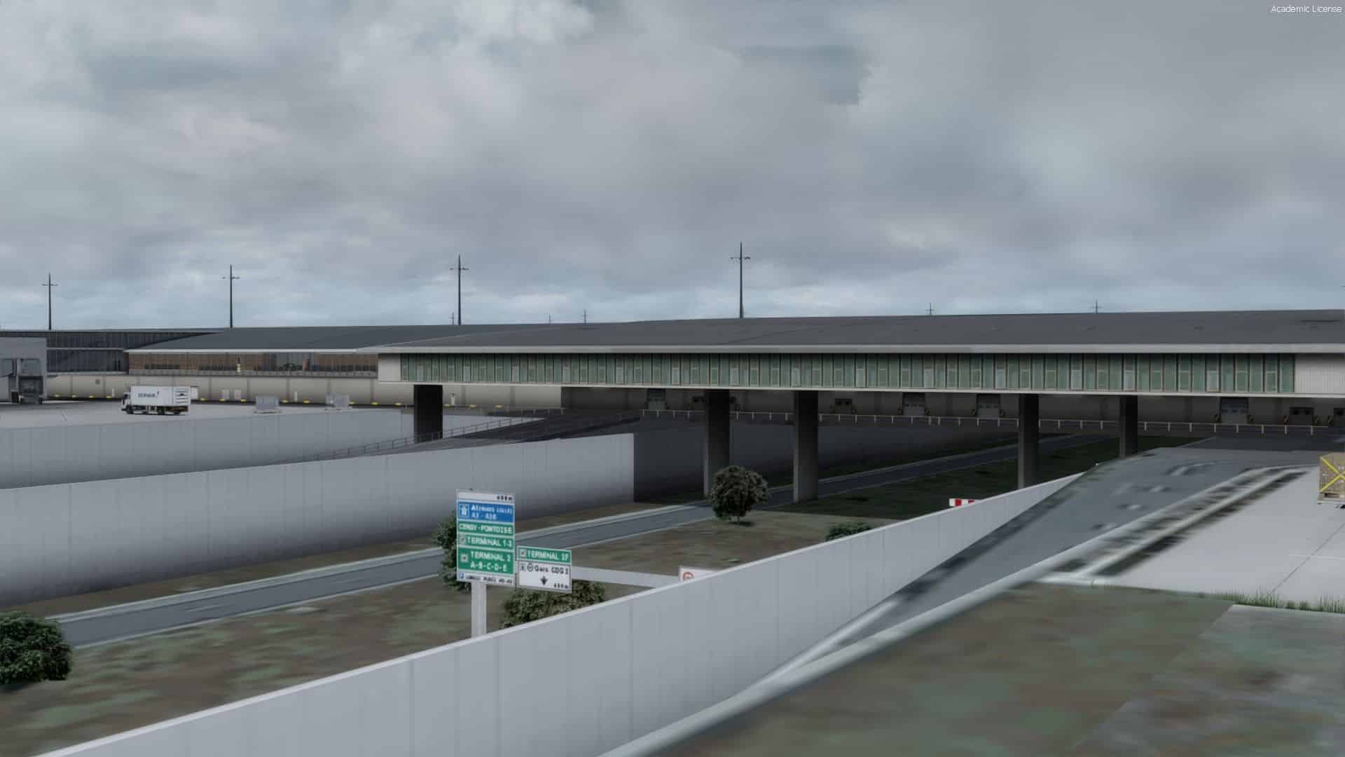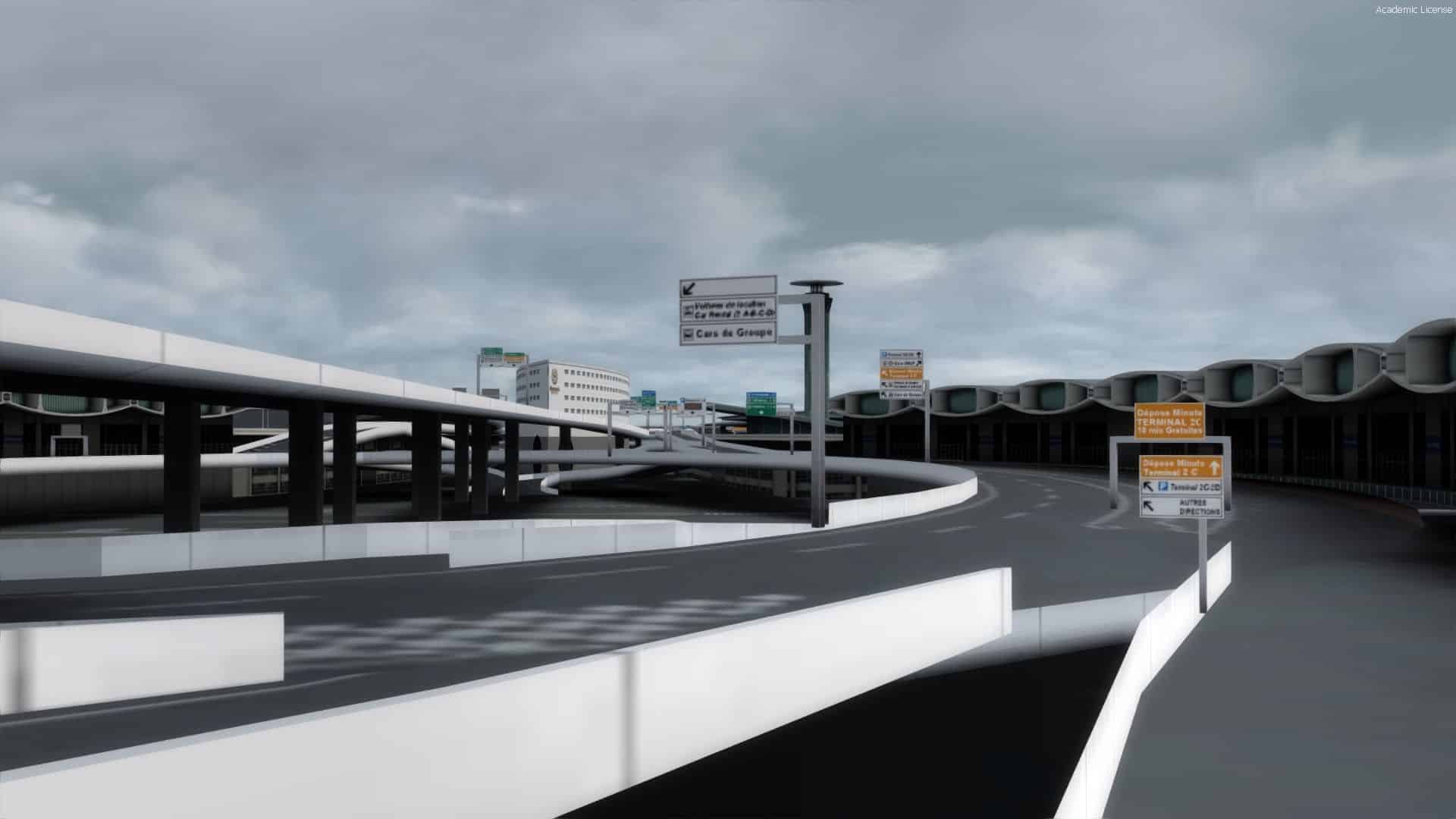 Leider sind die Straßenunterführungen unter den Rollwegen, von denen es in Paris vielerlei gibt, sehr unansehlich umgesetzt worden. Ungenaue Terrainanpassungen mit scharfen Kanten gipfeln in schwarzen Wänden unter den Brücken. Das hat mich persönlich stark enttäuscht. Dafür hält sich der gute Eindruck der Bodentexturen. Hinweise, Schilder und scharfe Linien leiten uns den Weg zum Gate. Auch die Gebäude, wie beispielsweise das Runde Terminal 1, machen einen guten Eindruck und liefern aus dem Cockpit ein komplexes und plastisches Bild.