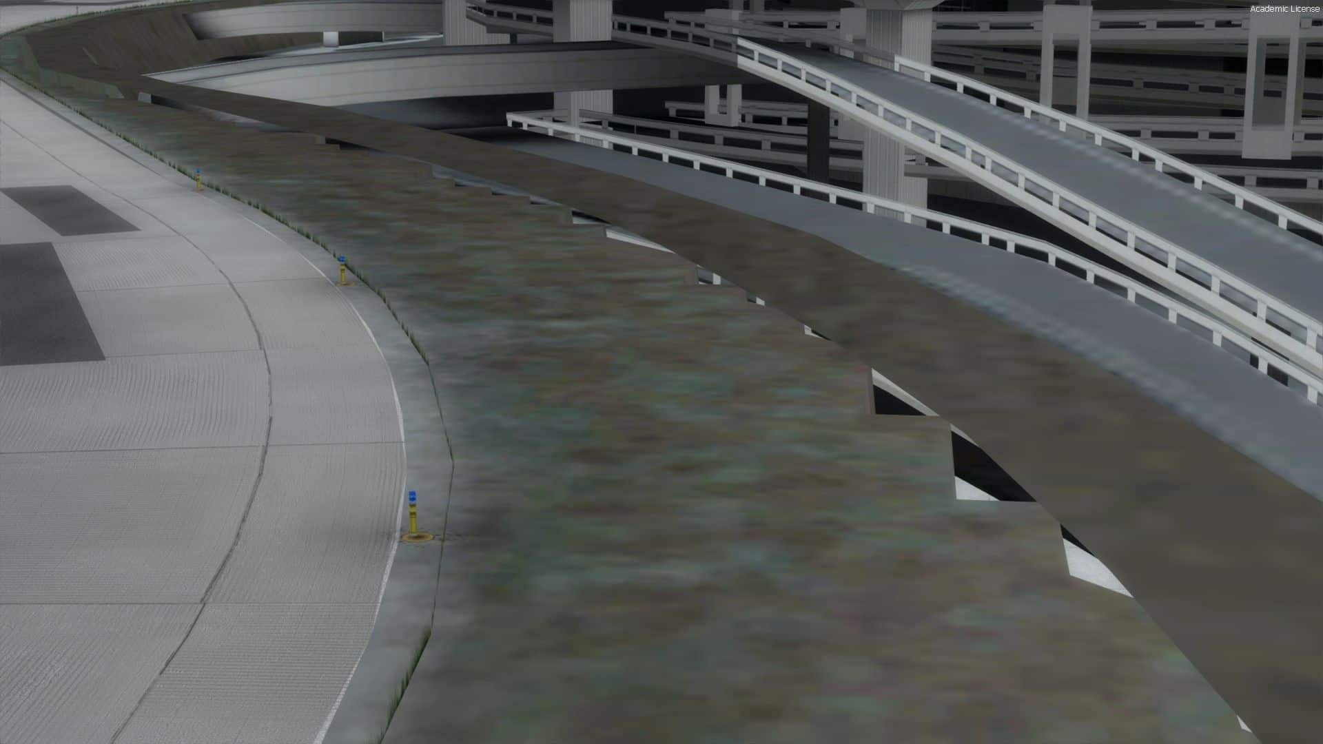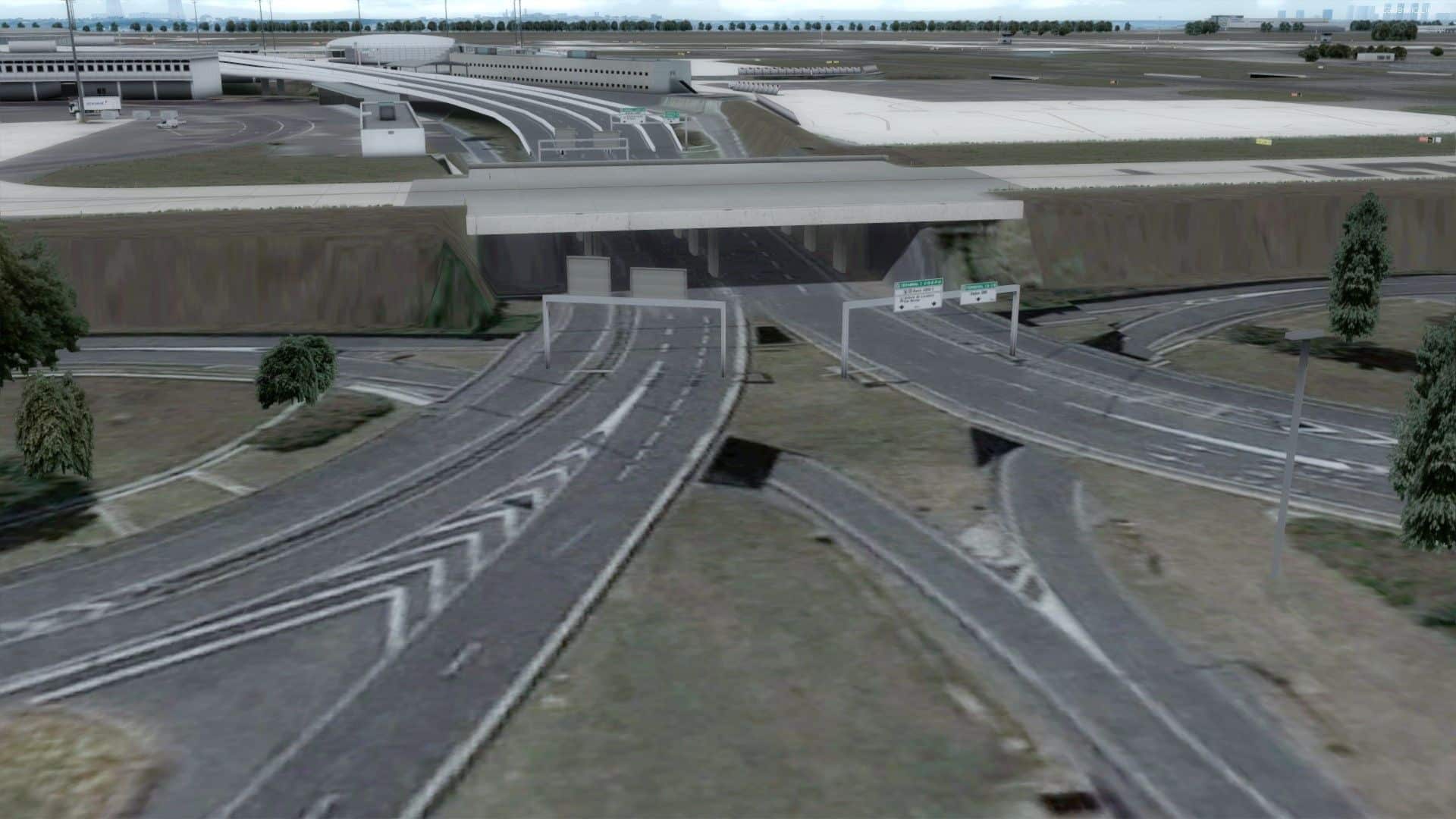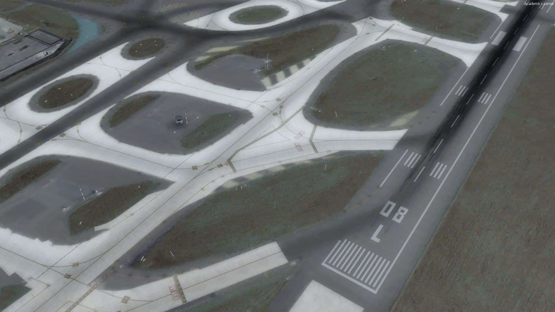 Ein großer Minuspunkt der Szenerie ist für mich die schwache Umsetzung der Autobahn- und Straßenunterführungen. Sie sind, wie bereits erwähnt, zumeist als schwarze Wände dargstellt. Zudem sind auch hier unsaubere Höhenmodelle zu erkennen. Auf diese Weise stören die Bereiche mehr, als das sie ein realistisches Bild der komplexen Zufahrten liefern. Besonders aus weiter Entfernung springen die schwarzen Flächen prägnant ins Auge und machen das Gesamtbild kaputt. Fehlt dafür ganz einfach das Know-How? Nein! Taxi2Gate zeigt, dass die Entwickler derartige Brücken eigentlich umsetzen können. Die Taxiwayquerungen an den Modulen E und F sind plastisch und sauber modelliert worden. Leider flickern die Texturen an den Randübergängen (Was übrigens in mehreren Bereichen auffällt), dennoch liefern sie ein stimmiges und gut anzusehendes Bild. Warum also nicht immer so?