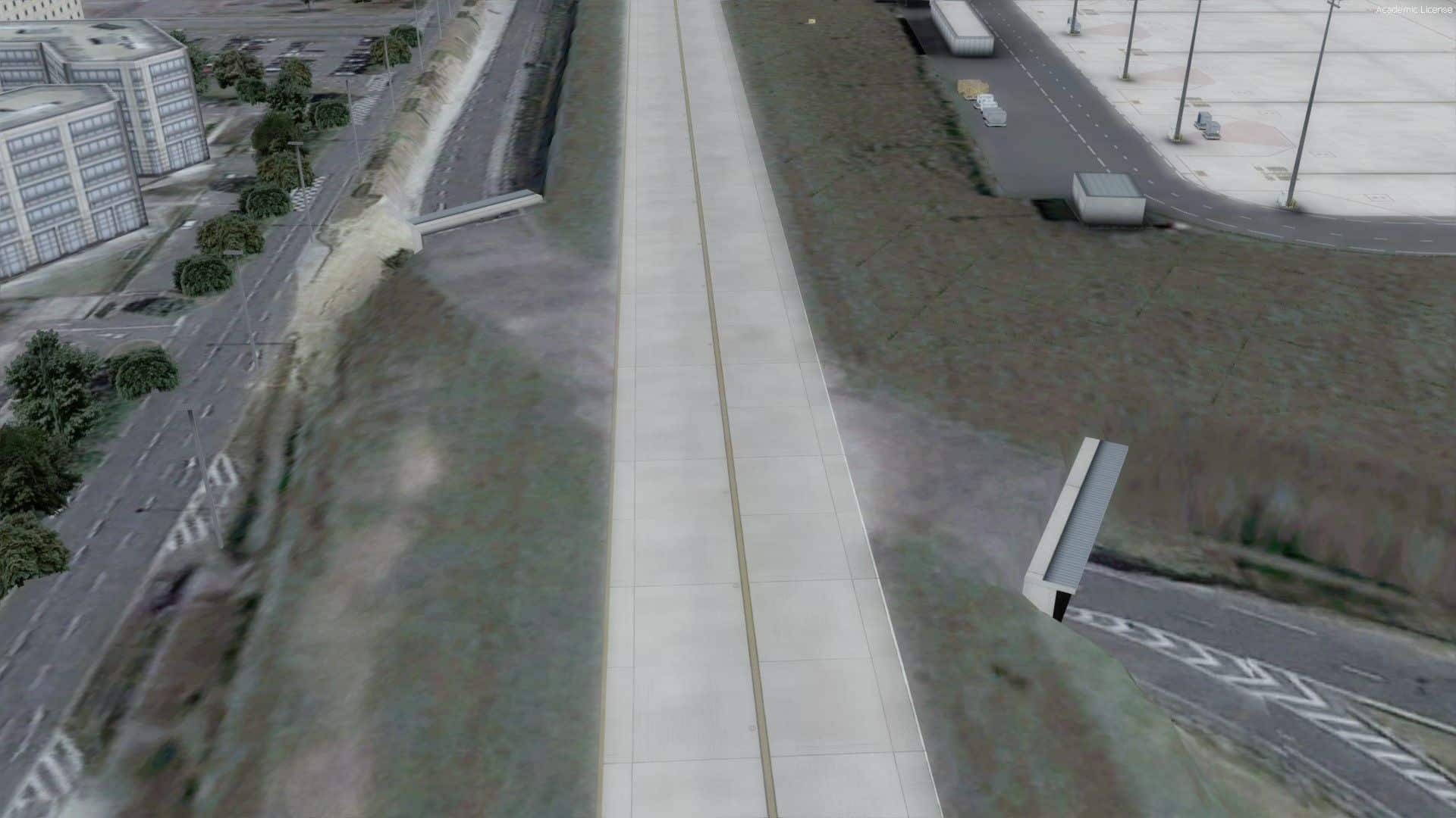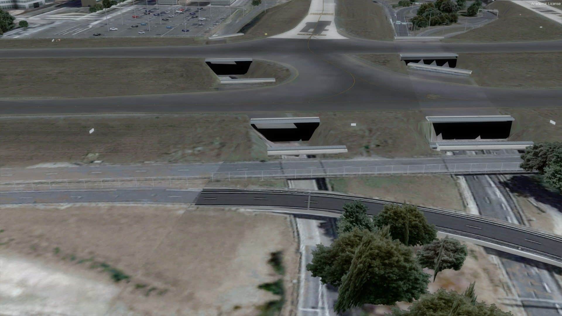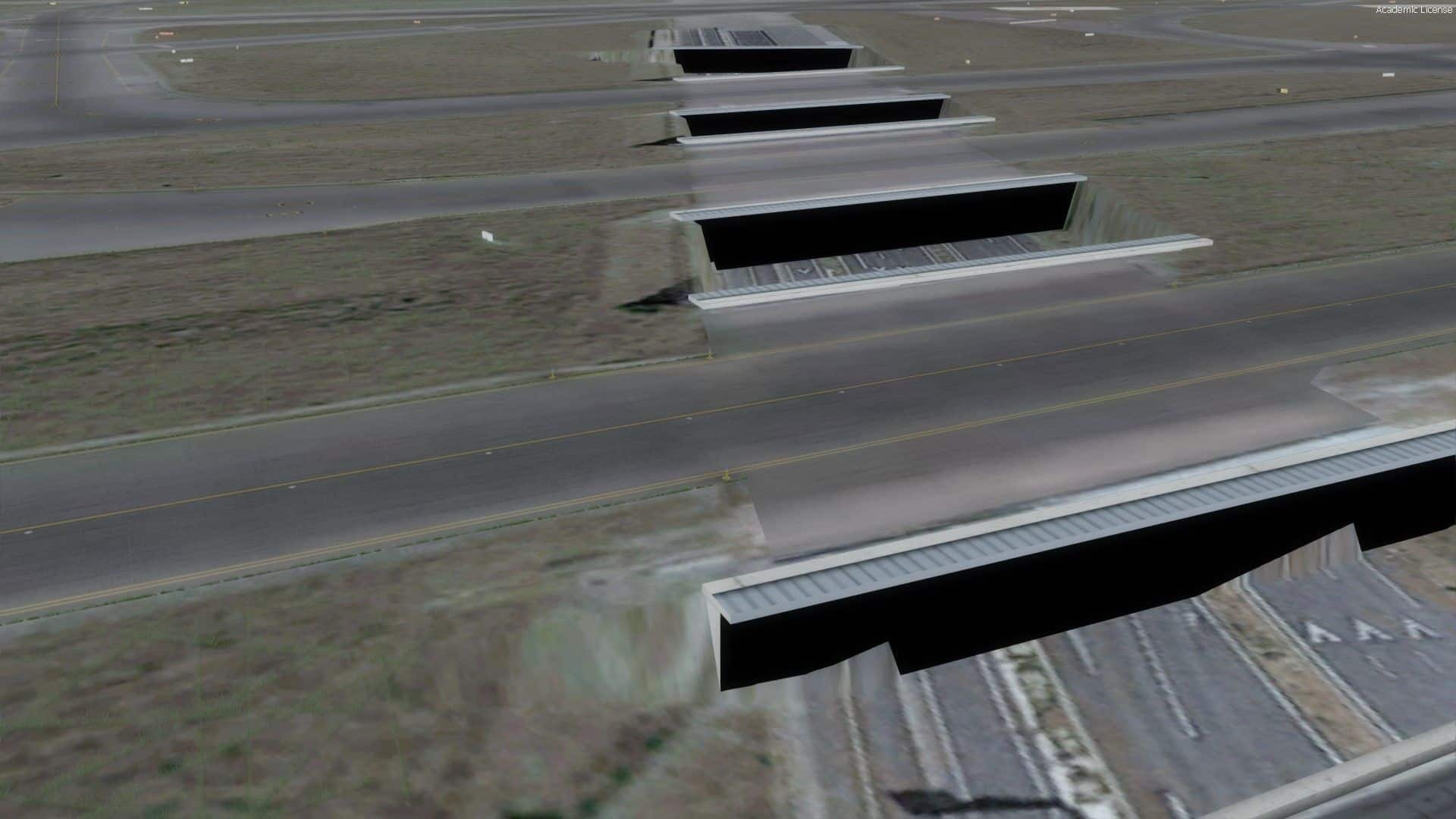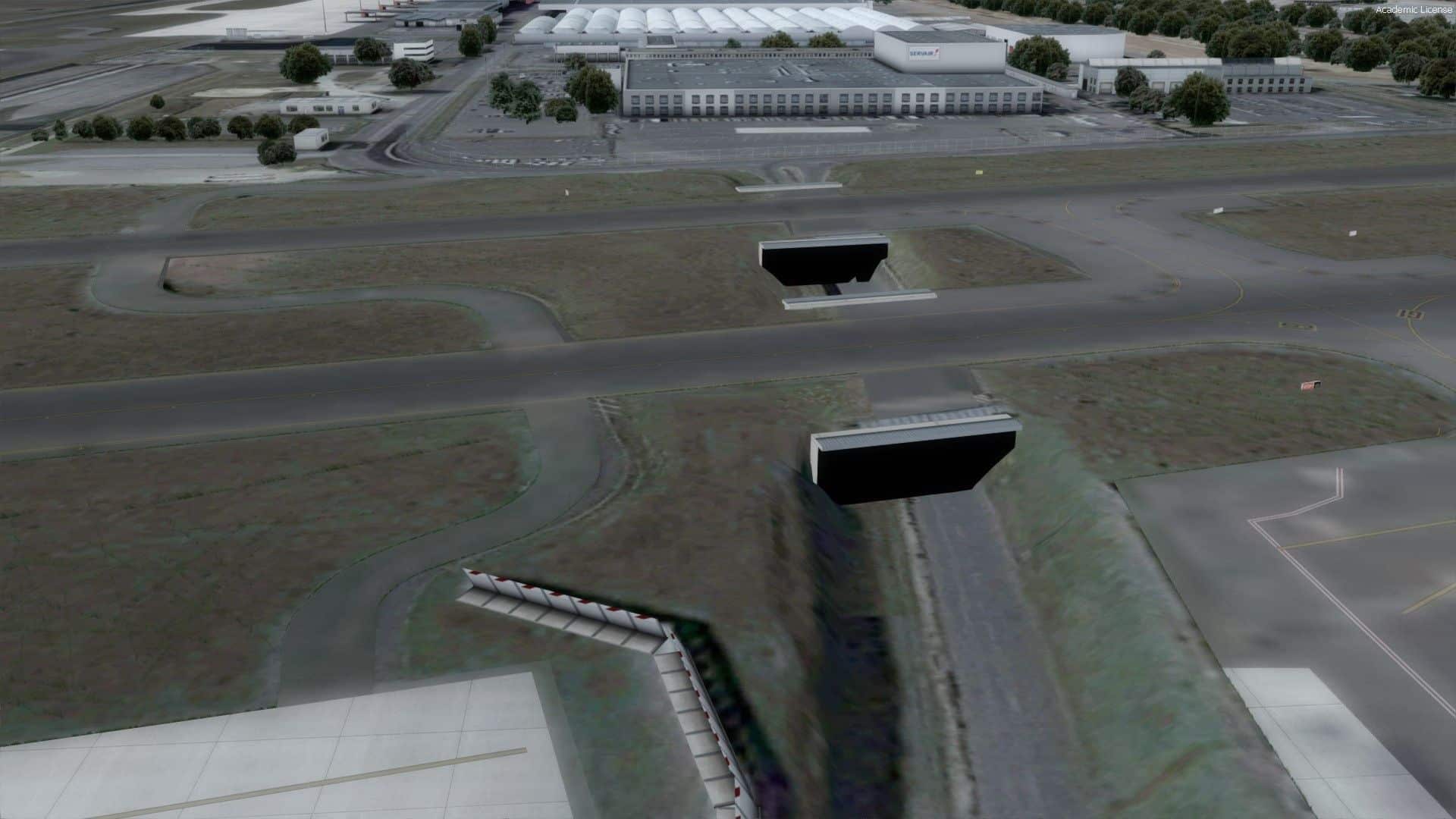 Ein großer Minuspunkt der Szenerie ist für mich die schwache Umsetzung der Autobahn- und Straßenunterführungen. Sie sind, wie bereits erwähnt, zumeist als schwarze Wände dargstellt. Zudem sind auch hier unsaubere Höhenmodelle zu erkennen. Auf diese Weise stören die Bereiche mehr, als das sie ein realistisches Bild der komplexen Zufahrten liefern. Besonders aus weiter Entfernung springen die schwarzen Flächen prägnant ins Auge und machen das Gesamtbild kaputt. Fehlt dafür ganz einfach das Know-How? Nein! Taxi2Gate zeigt, dass die Entwickler derartige Brücken eigentlich umsetzen können. Die Taxiwayquerungen an den Modulen E und F sind plastisch und sauber modelliert worden. Leider flickern die Texturen an den Randübergängen (Was übrigens in mehreren Bereichen auffällt), dennoch liefern sie ein stimmiges und gut anzusehendes Bild. Warum also nicht immer so?
