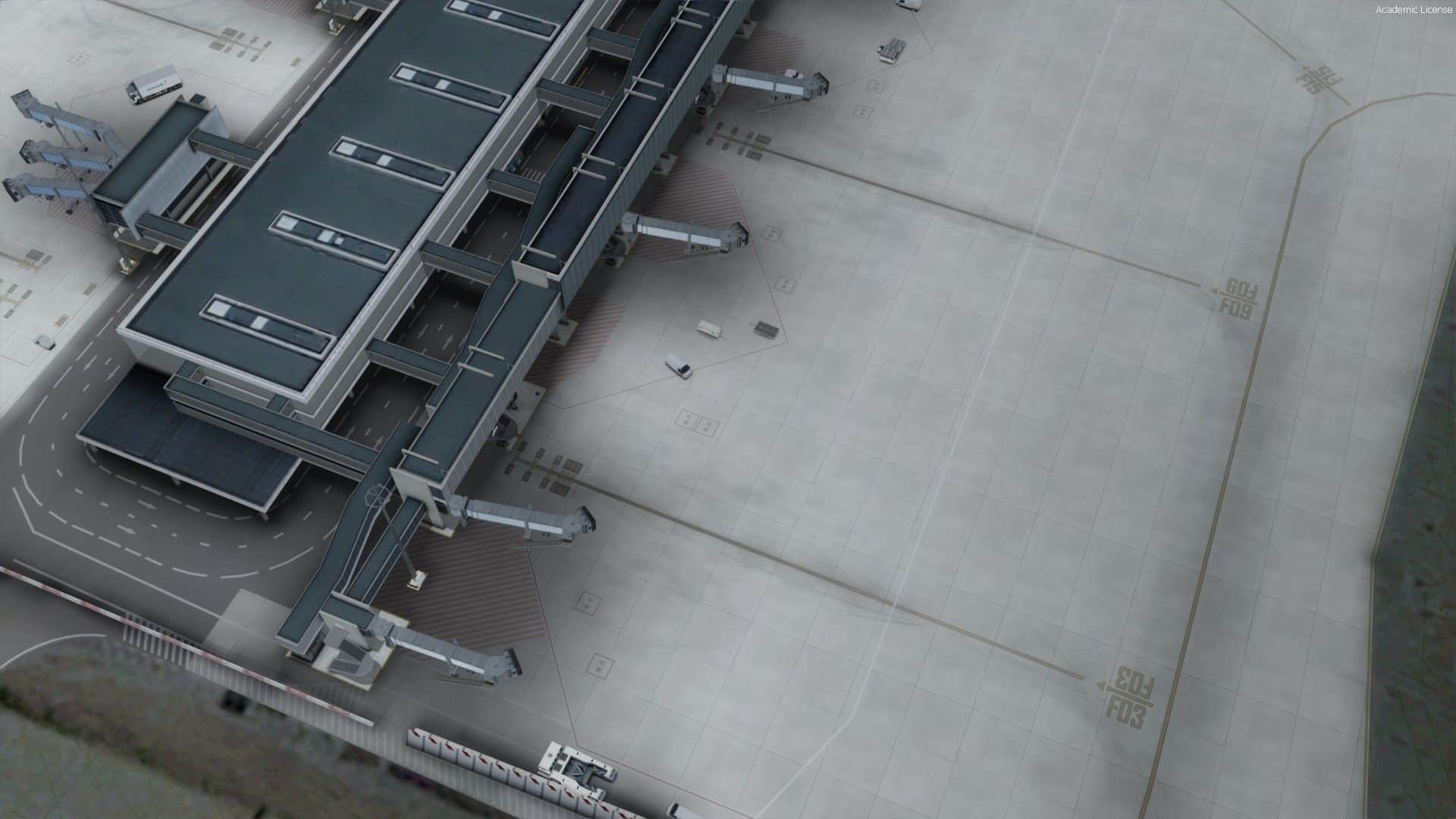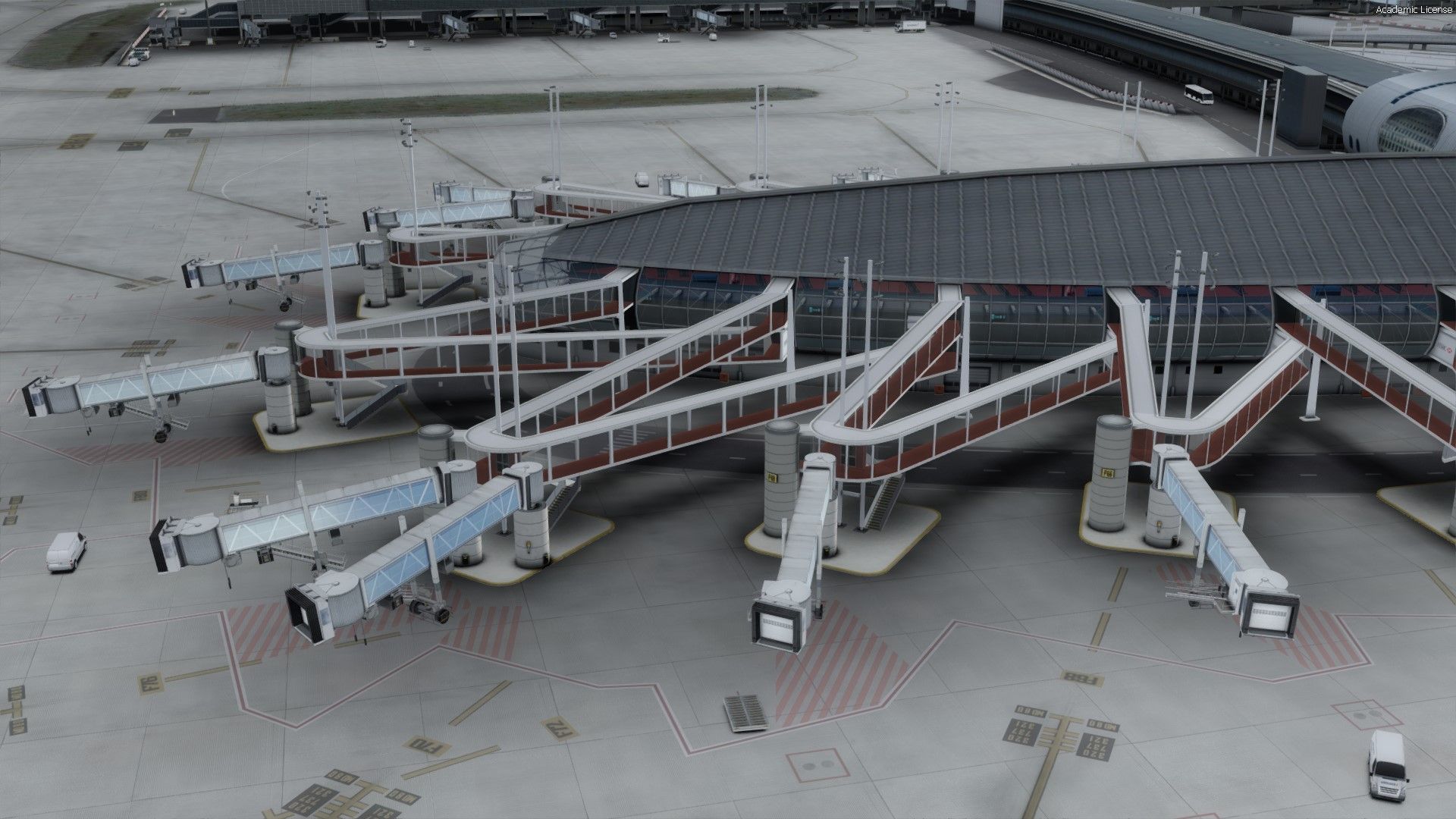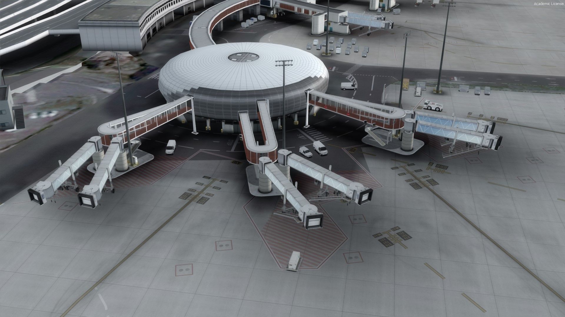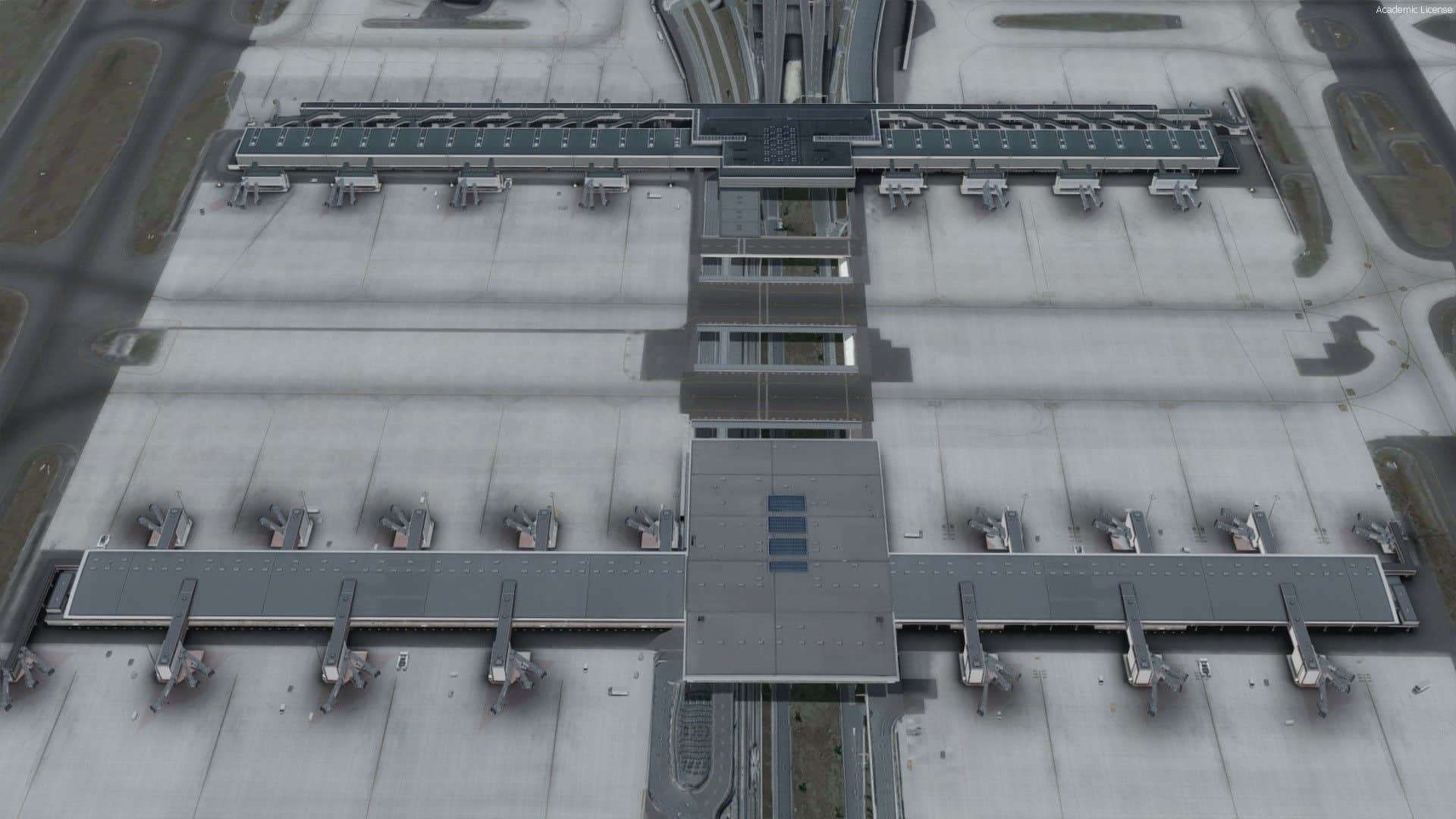 Die Satellitengebäude verfügen über einen plastischen Innenraum. Sie sind passend texturiert und mit einigen Details wie Flutlichtmasten, Treppen und Aggregaten ausgestattet. Um die Parkpositionen herum sind typische Flughafenfahrzeuge verteilt. Alle Fluggastbrücken sind mit SODE animiert worden und auch ansprechend modelliert worden.