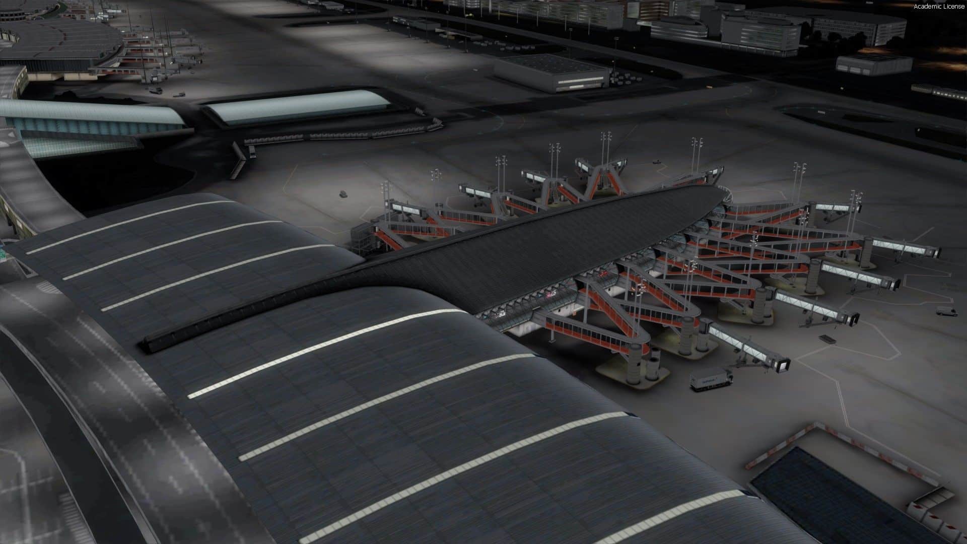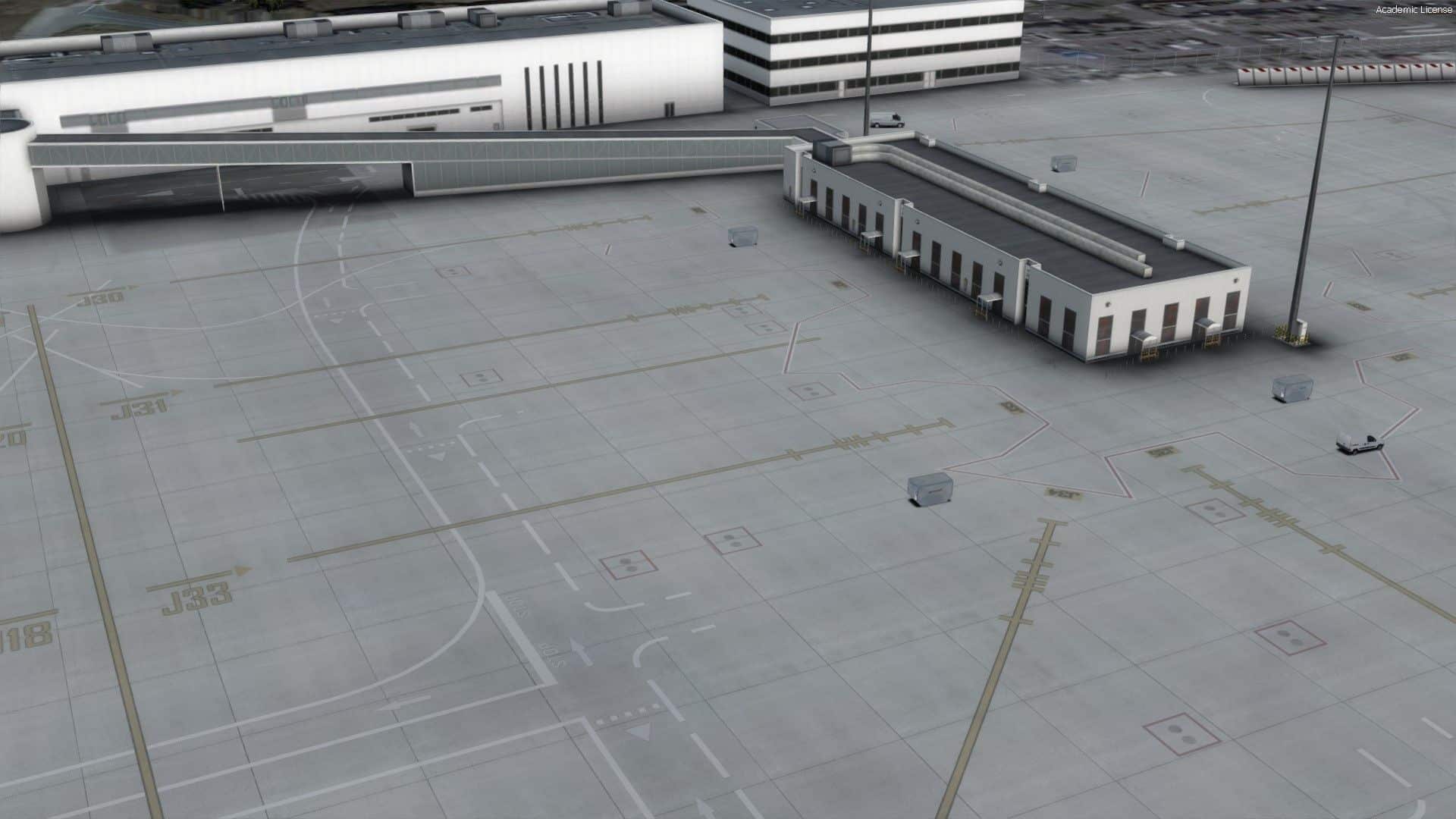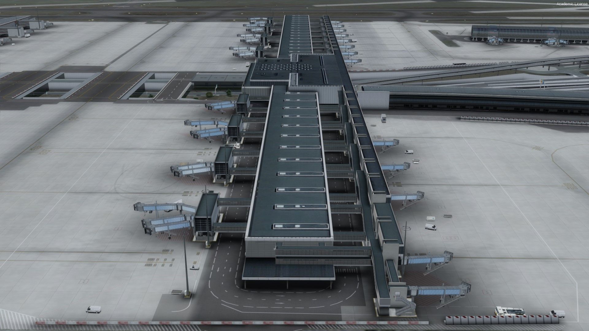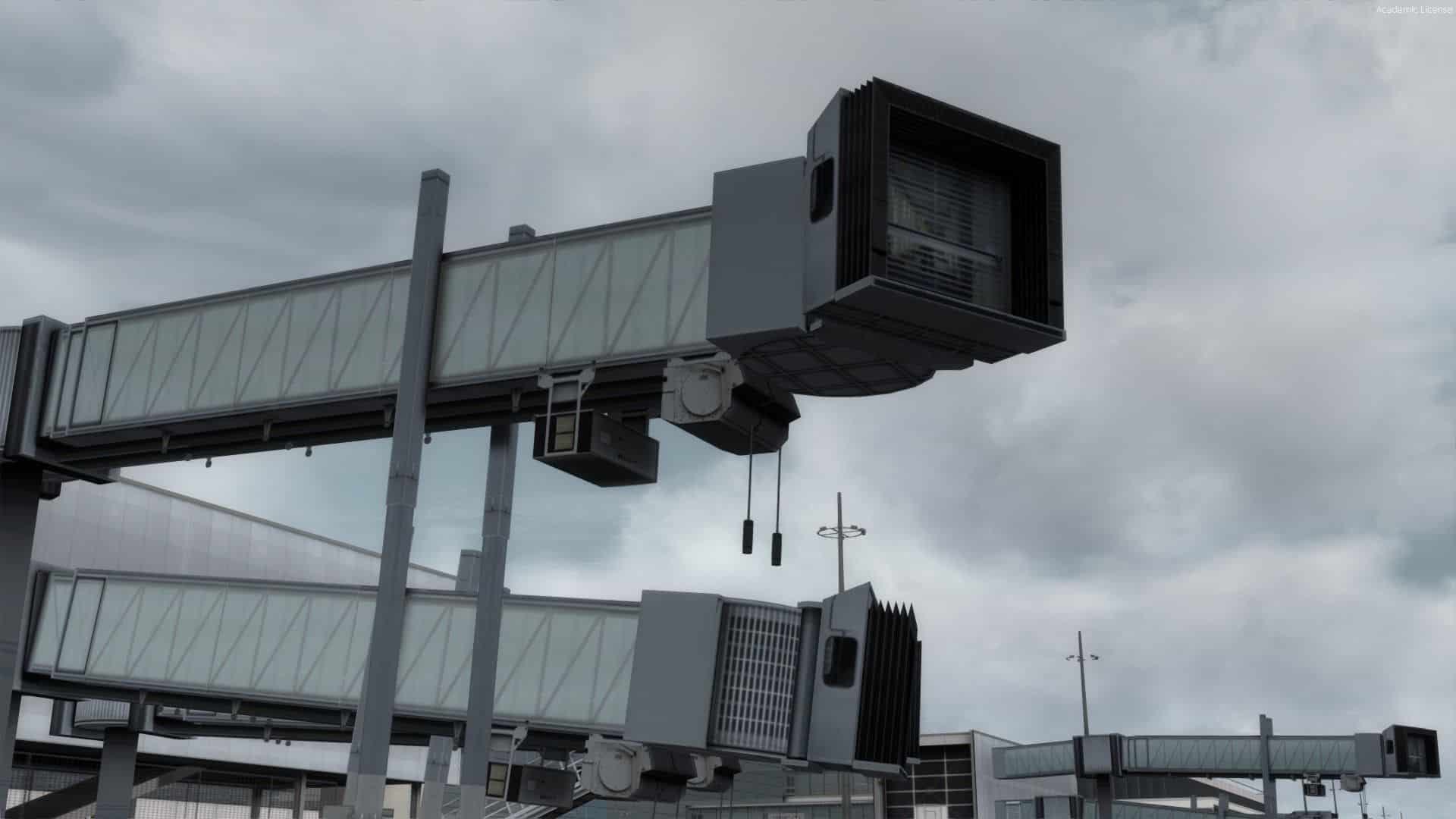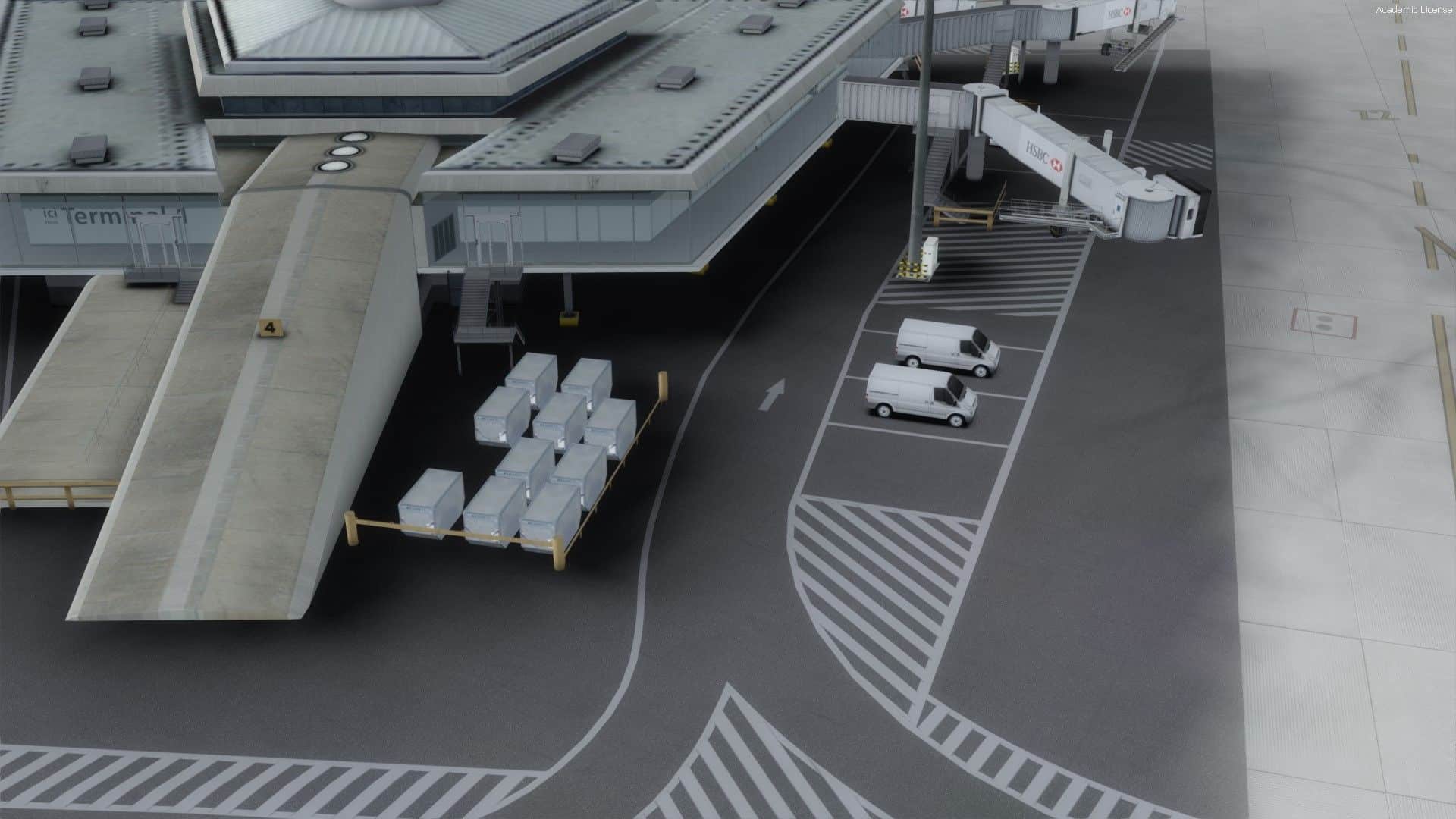 Die Satellitengebäude verfügen über einen plastischen Innenraum. Sie sind passend texturiert und mit einigen Details wie Flutlichtmasten, Treppen und Aggregaten ausgestattet. Um die Parkpositionen herum sind typische Flughafenfahrzeuge verteilt. Alle Fluggastbrücken sind mit SODE animiert worden und auch ansprechend modelliert worden.