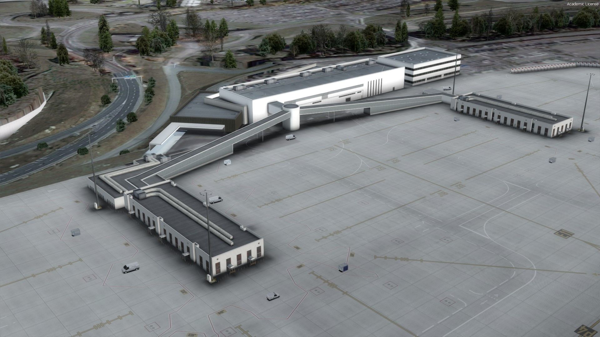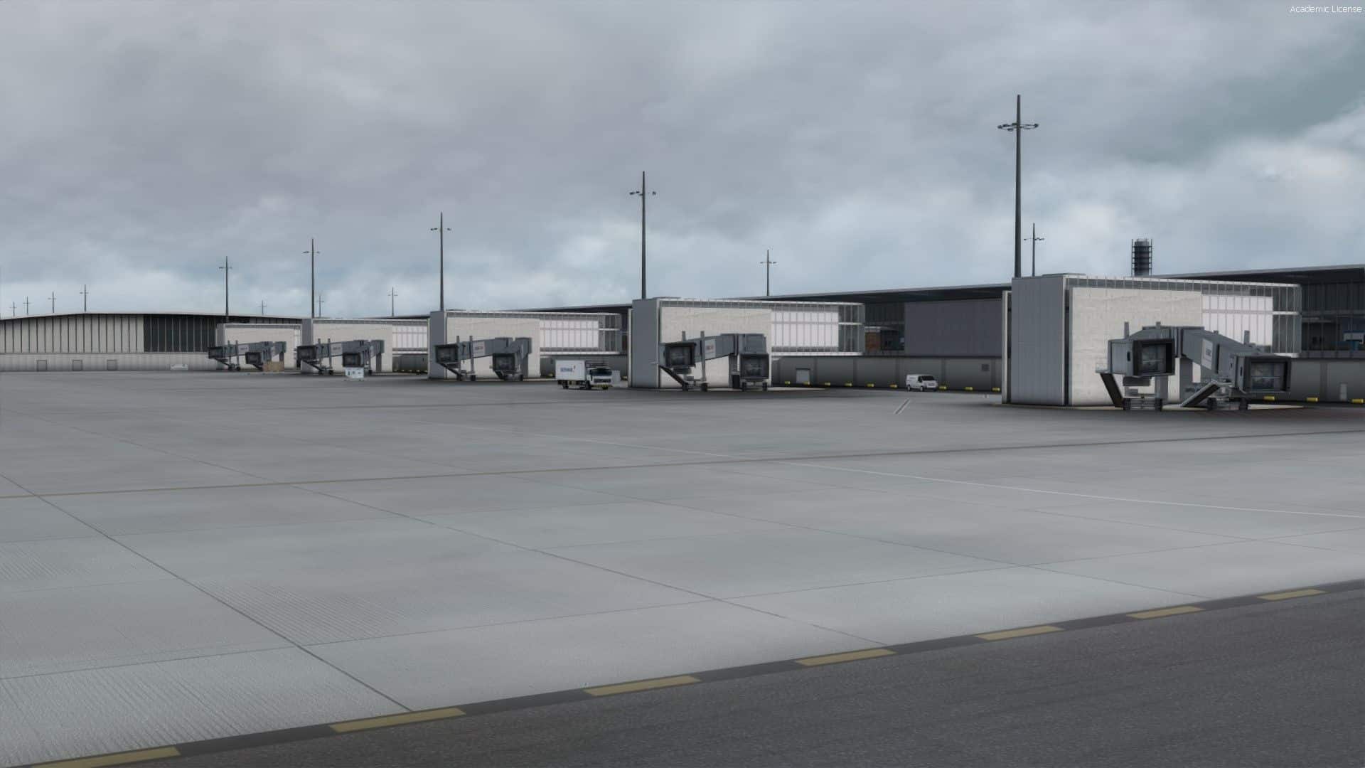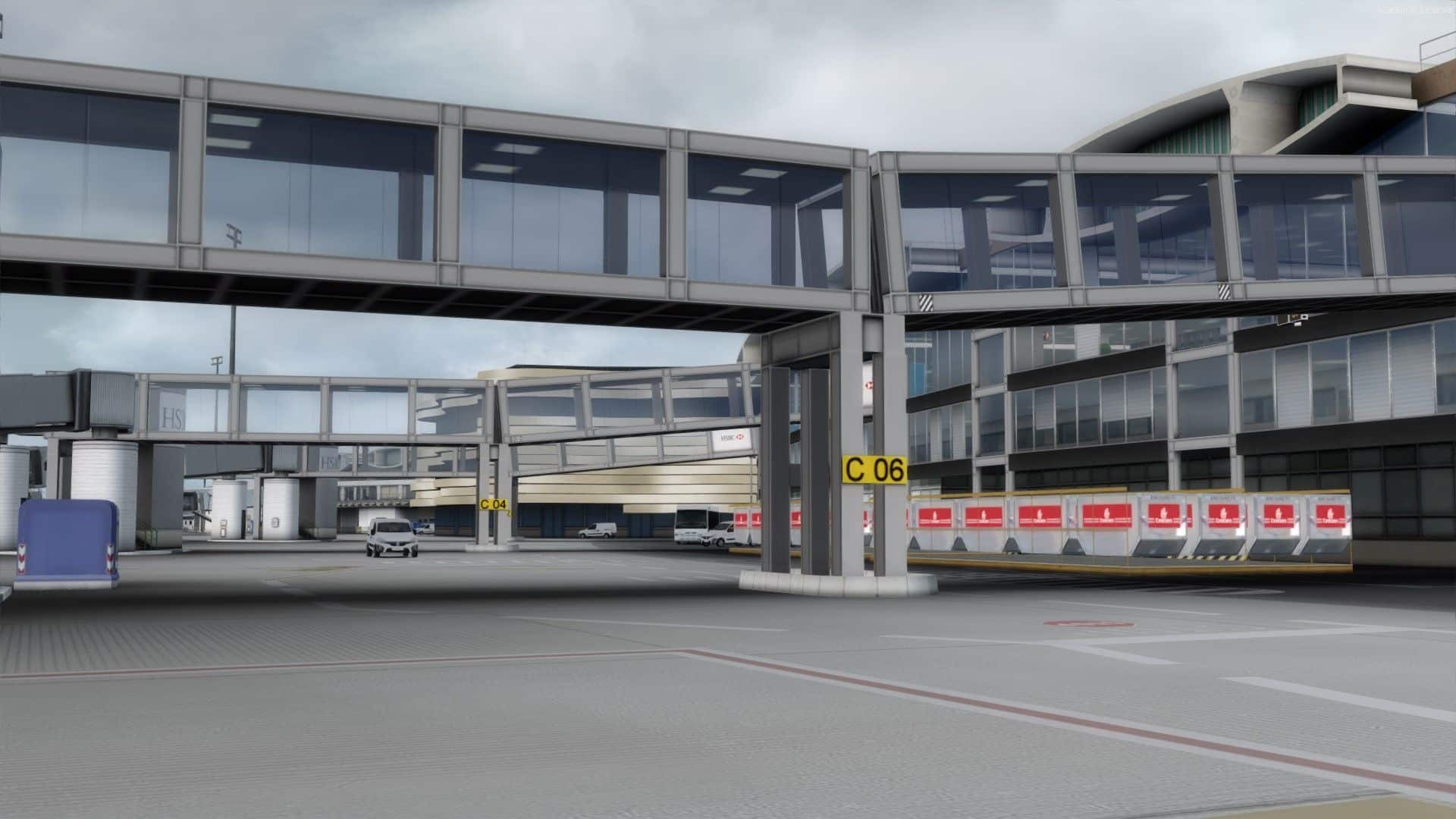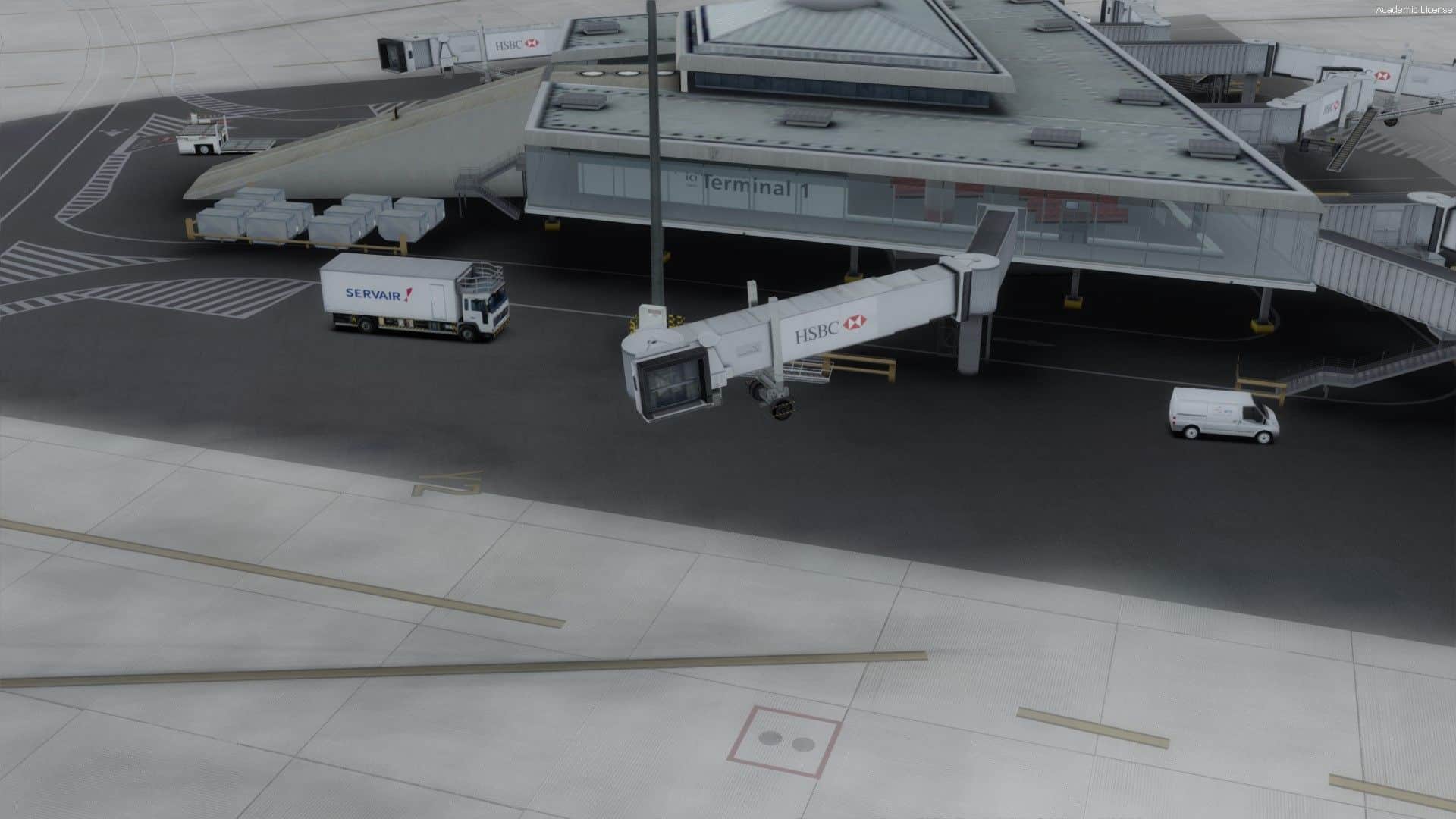 Die Satellitengebäude verfügen über einen plastischen Innenraum. Sie sind passend texturiert und mit einigen Details wie Flutlichtmasten, Treppen und Aggregaten ausgestattet. Um die Parkpositionen herum sind typische Flughafenfahrzeuge verteilt. Alle Fluggastbrücken sind mit SODE animiert worden und auch ansprechend modelliert worden.