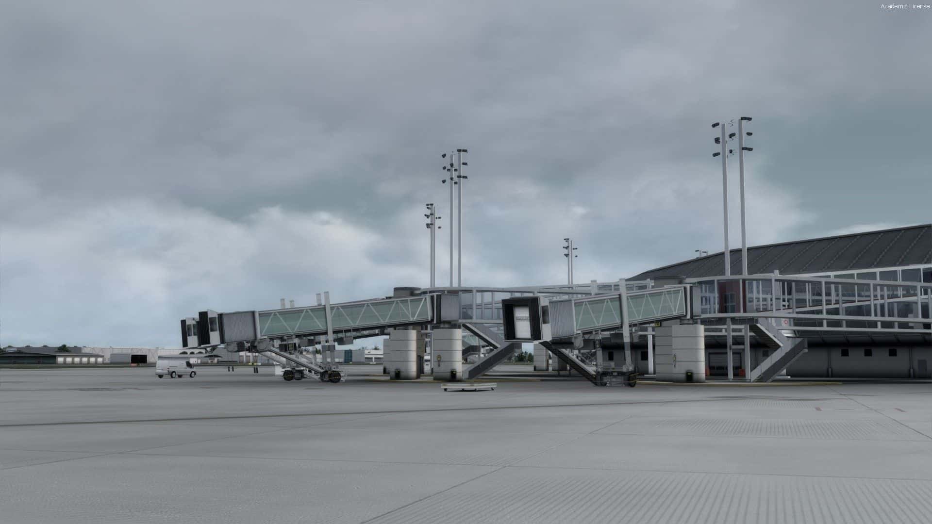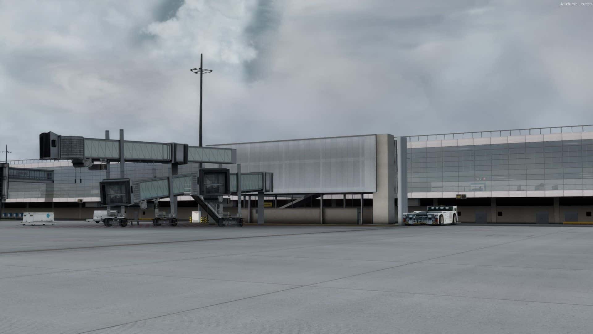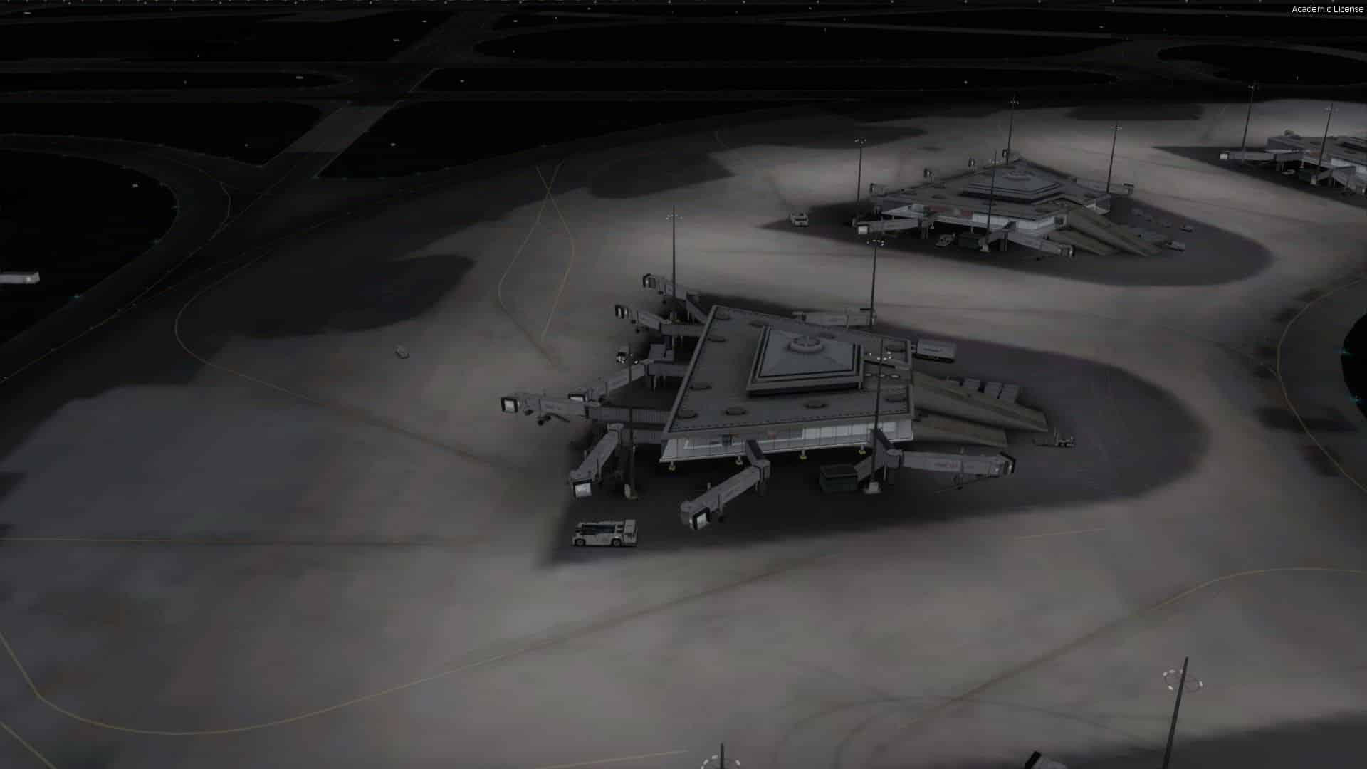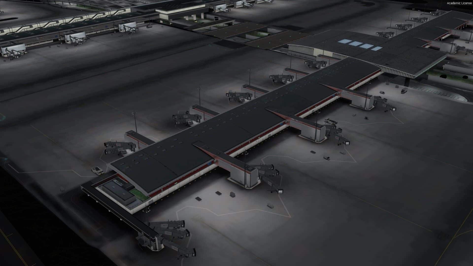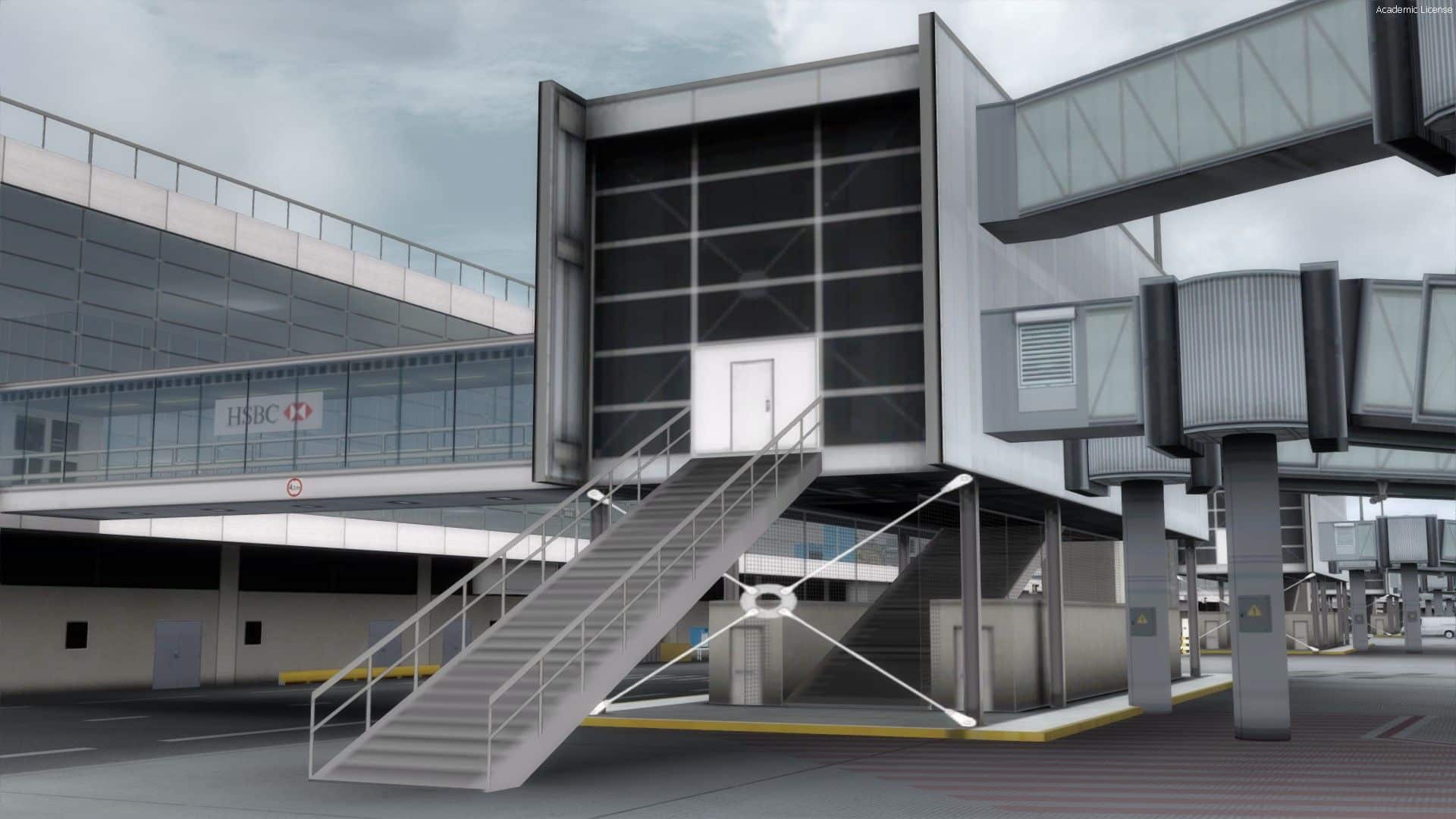 Die Satellitengebäude verfügen über einen plastischen Innenraum. Sie sind passend texturiert und mit einigen Details wie Flutlichtmasten, Treppen und Aggregaten ausgestattet. Um die Parkpositionen herum sind typische Flughafenfahrzeuge verteilt. Alle Fluggastbrücken sind mit SODE animiert worden und auch ansprechend modelliert worden.