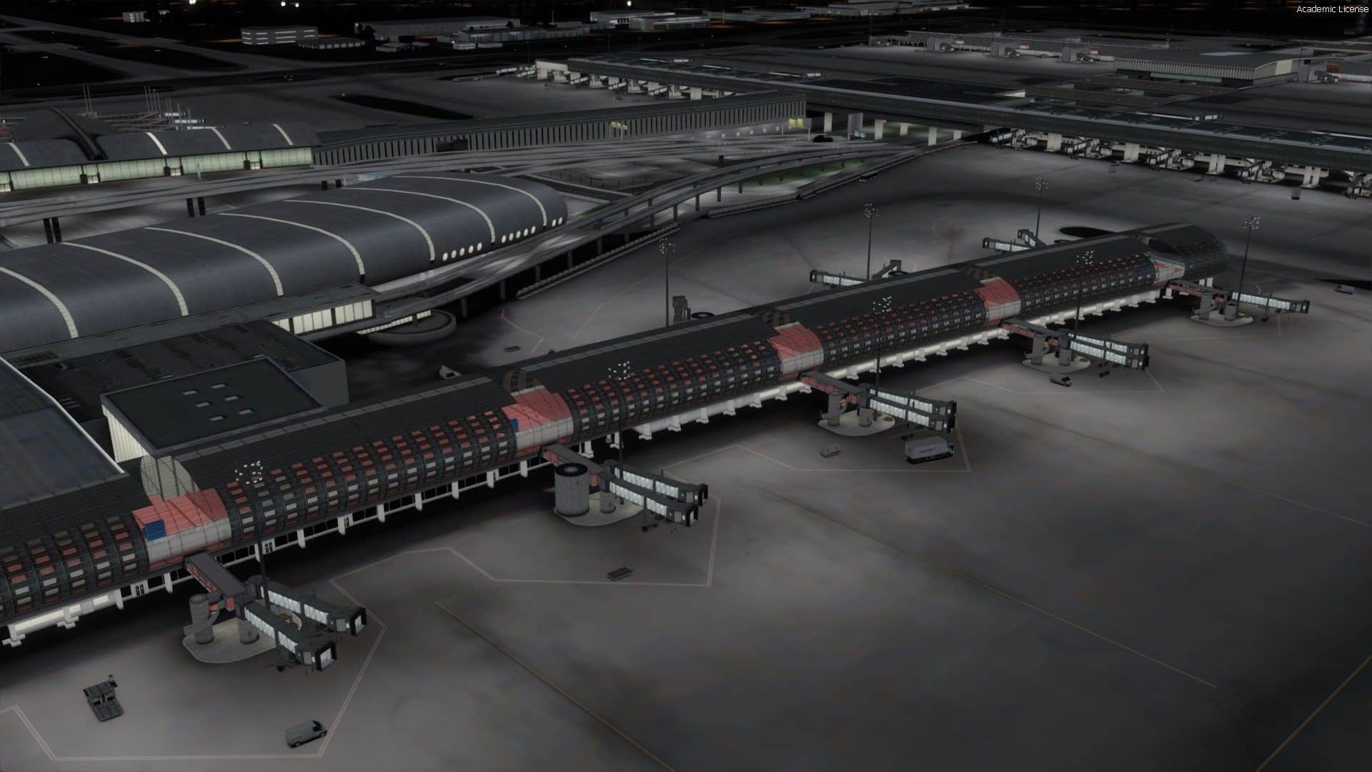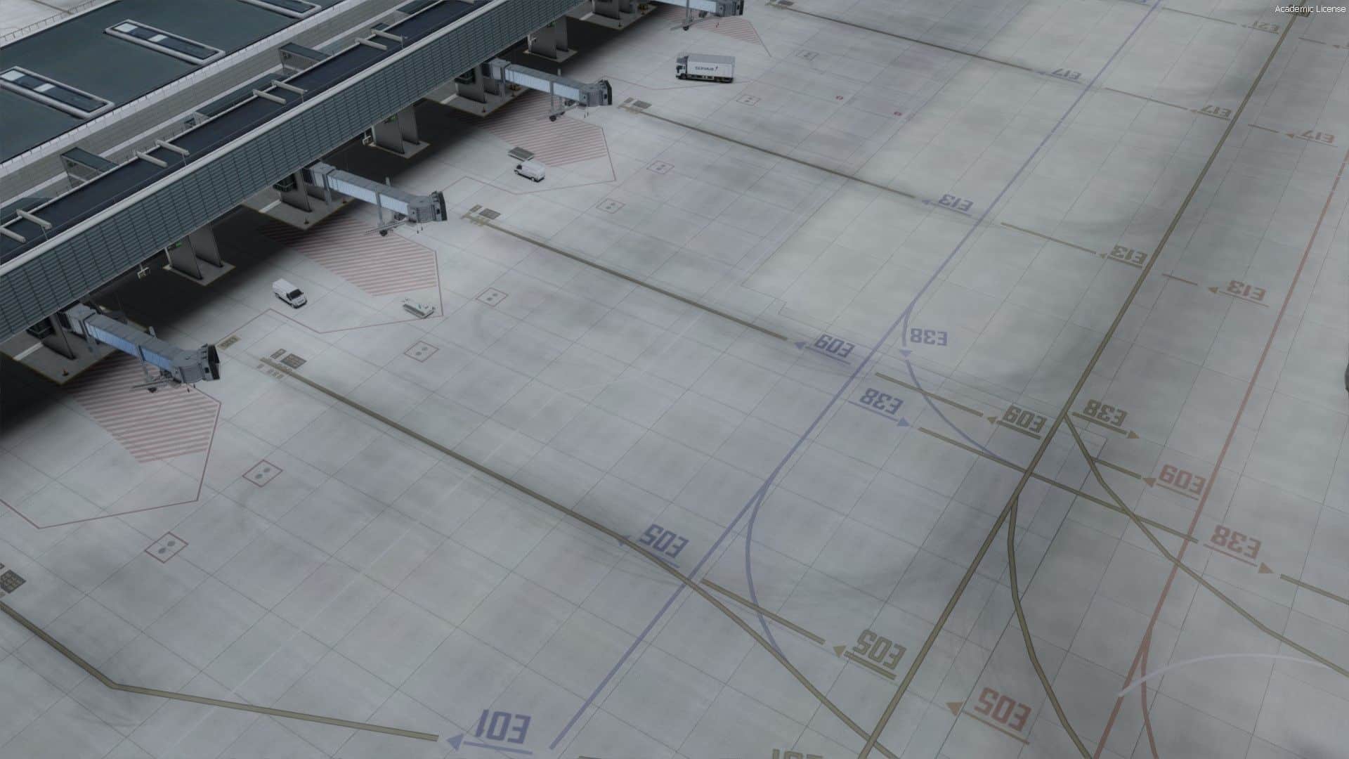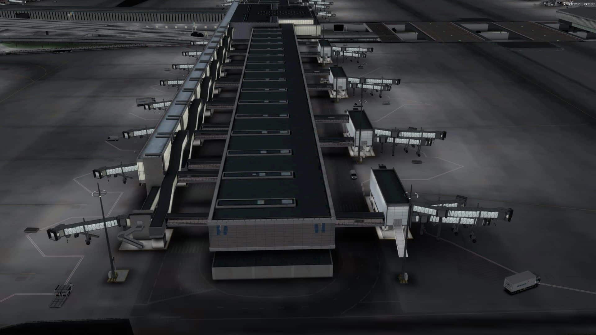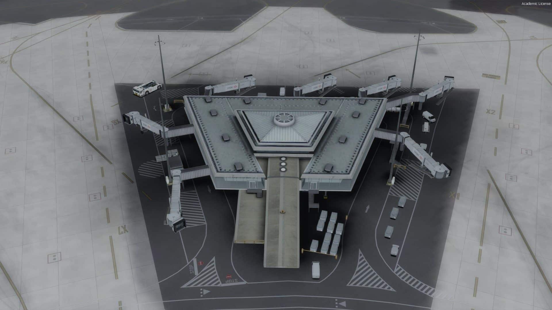 Die Satellitengebäude verfügen über einen plastischen Innenraum. Sie sind passend texturiert und mit einigen Details wie Flutlichtmasten, Treppen und Aggregaten ausgestattet. Um die Parkpositionen herum sind typische Flughafenfahrzeuge verteilt. Alle Fluggastbrücken sind mit SODE animiert worden und auch ansprechend modelliert worden.