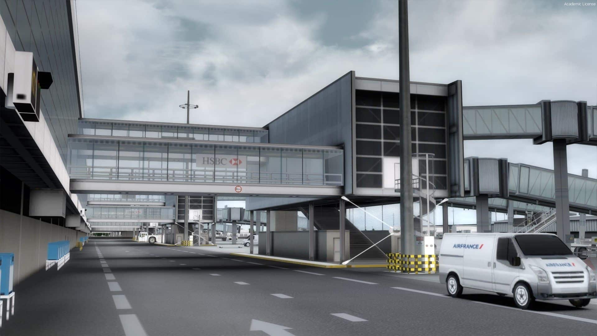 Einige statische Fahrzeuge sind an den einzelnen Parkpositionen platziert worden und Details wie Wendeltreppen, Raucherbereiche oder Sicherungskästen zieren das Gebäudeumfeld. Dynamischen Fahrzeugverkehr sucht man aber leider auf dem gesamten Flughafen vergebens. Das Gelände wirkt dadurch sehr still und einsam. Meiner Meinung wären auch noch mehr statische Fahrzeuge dem „Feeling“ zuträglich gewesen. Somit fehlt der Szenerie ein wenig der Charakter des zweitgrößten europäischen Verkehrsflughafens.
