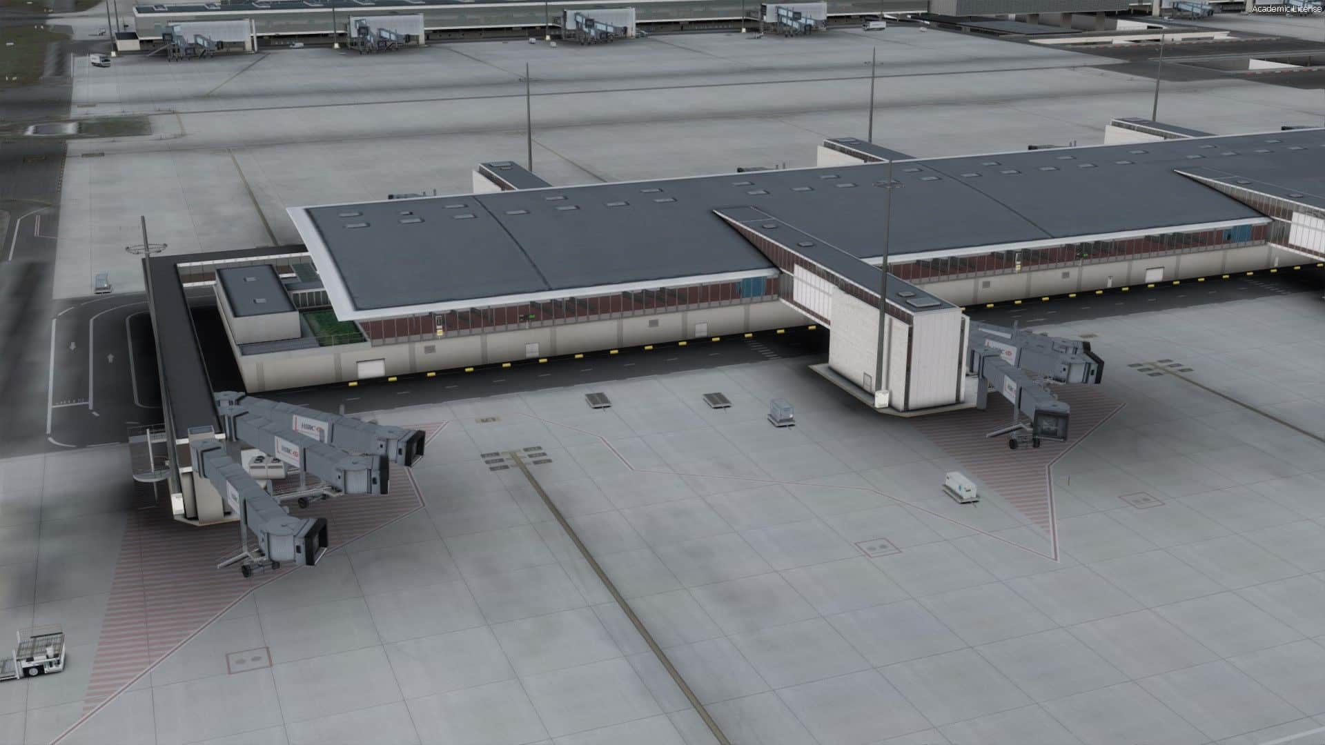 Die Regionallinie HOP! by Air France bedient dezentrale Strecken und Strecken mit geringem Aufkommen. Flüge werden weit ausserhalb der großen Terminals, am Modul G abgefertigt. Taxi2Gate hat das Gebäude wenig aufregend und, ganz nach dem realen Vorbild, zweckgebunden umgesetzt. Auch hier hätten mehr Details auf dem Vorfeld nicht geschadet. Tatsächlich ist das kleine Vorfeld in der Realität nämlich aufgrund der kurzen Turnarounds der ERJs sehr geschäftig. Nutzt man AI-Traffic platzieren sich in diesem Bereich fälschlicherweise Airbusse der Air France.