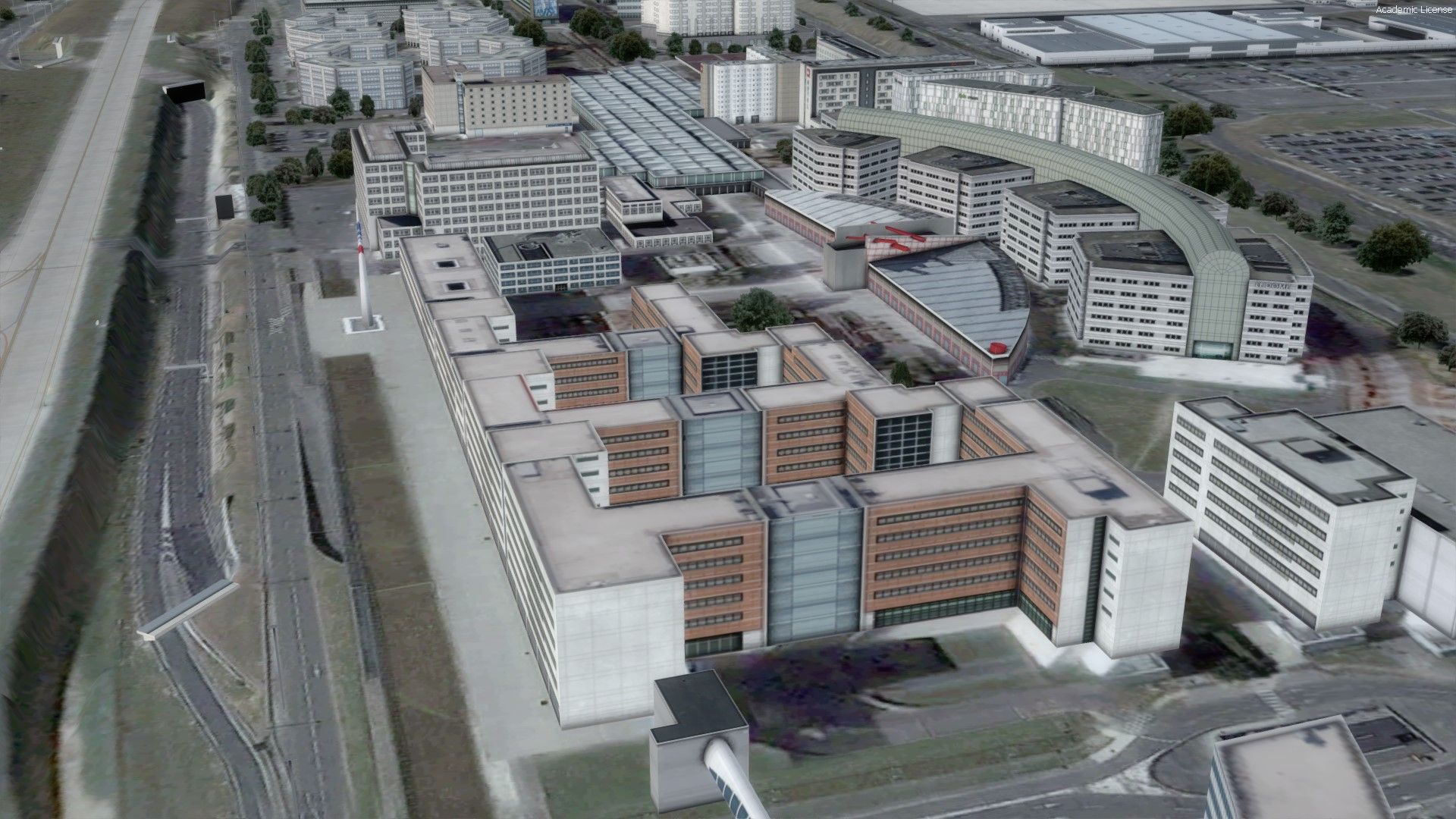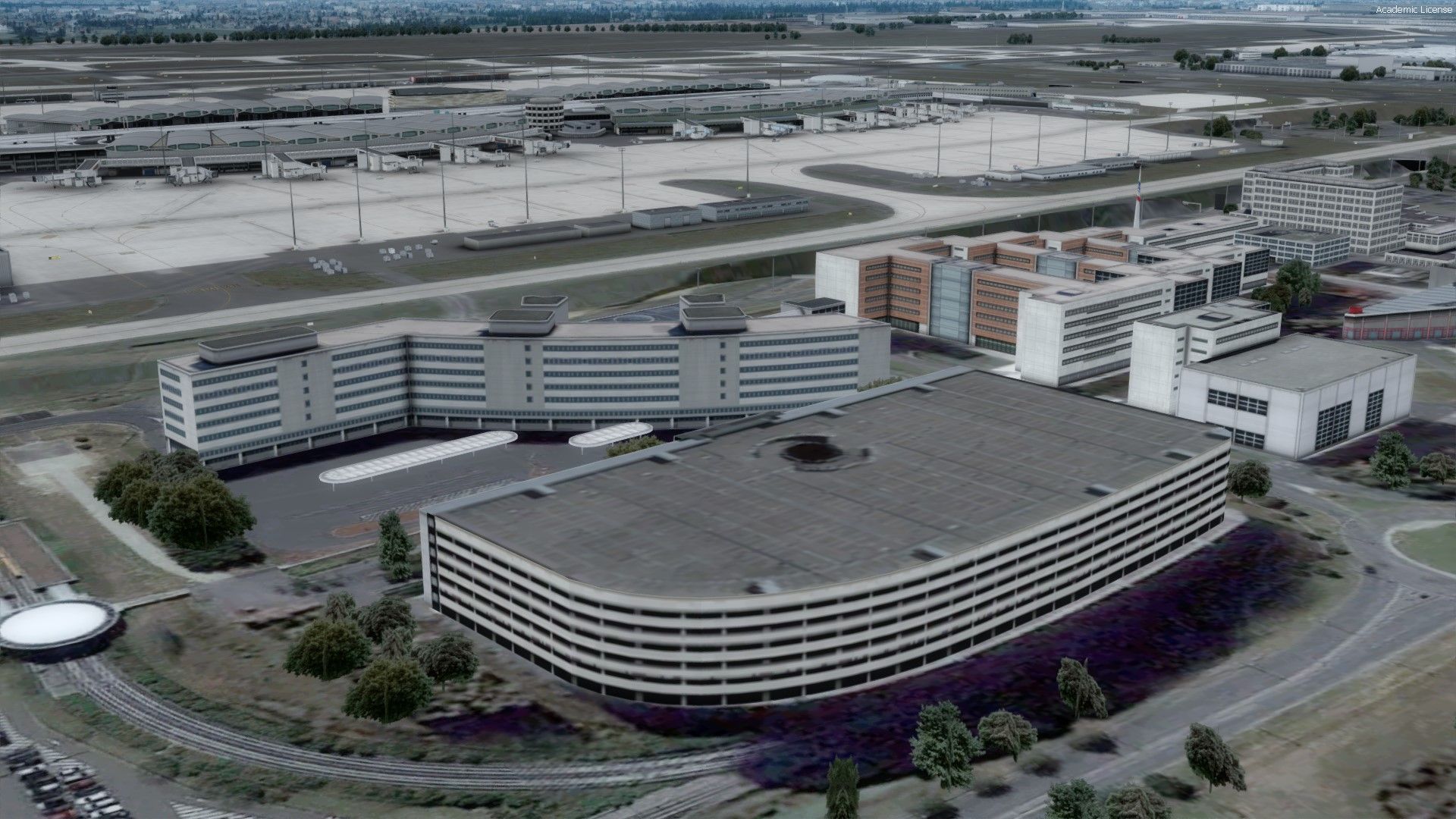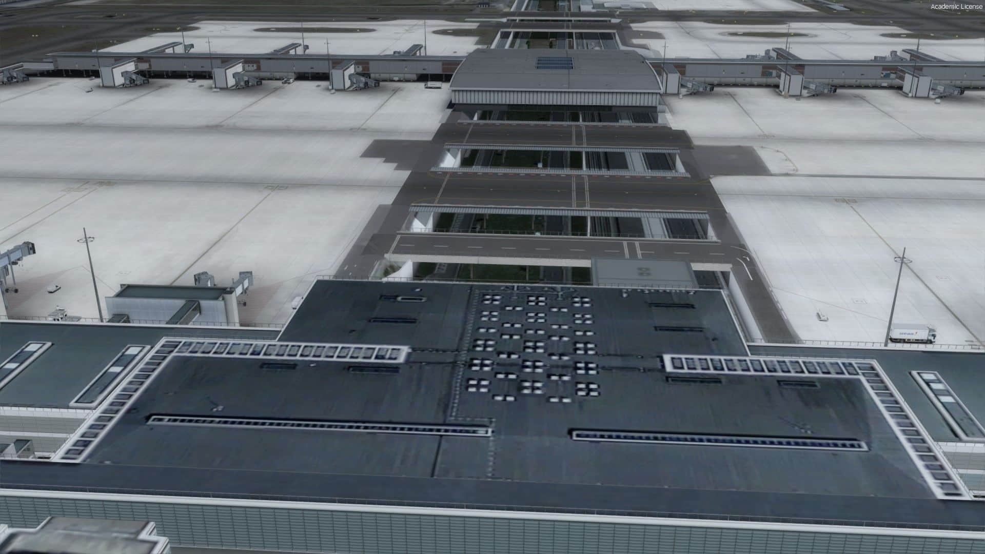Die Dächer der Gebäude sind nur einfach texturiert worden. Vereinzelt sind zwar Klimaanlagen oder Versorgungsschächte modelliert worden, der Großteil wird jedoch durch eine grobe Fototapete abgedeckt. Gleiches gilt im Übrigen auch für die Oberseite des großen Hauptgebäudes. In der Realität befindet sich im Zentrum ein offener Innenhof, der das berühmte Treppenhaus aus gläsernen Fahrtreppen beherbergt. Taxi2Gates Umsetzung zeigt an dieser Stelle leider nur eine schwarze Scheibe.