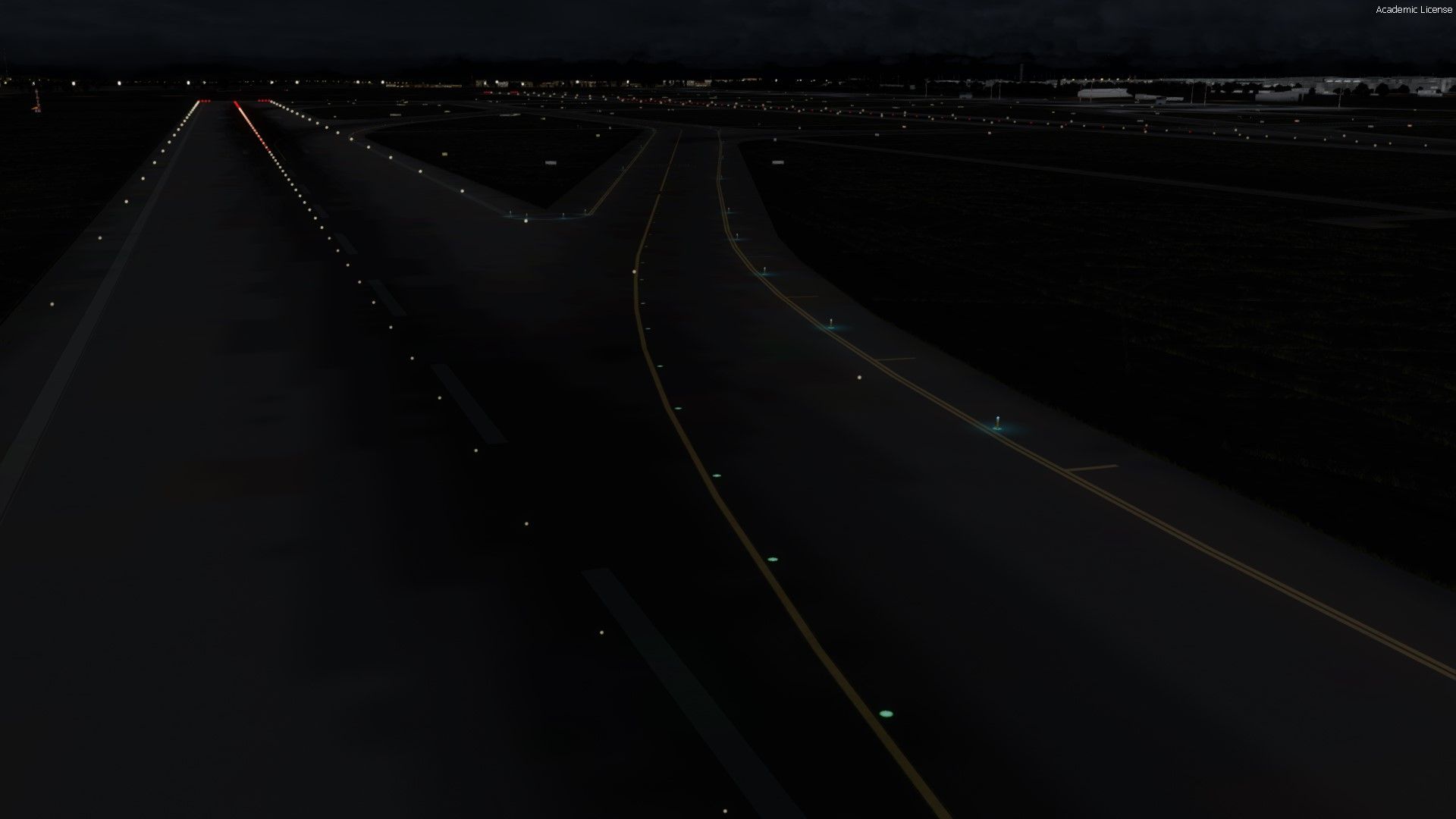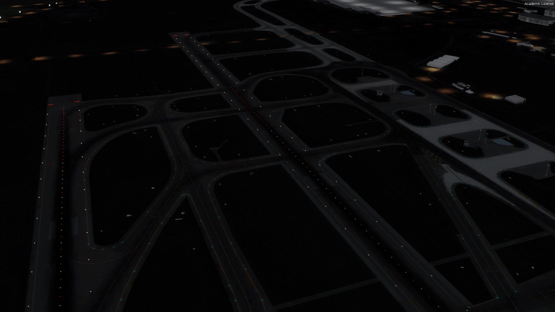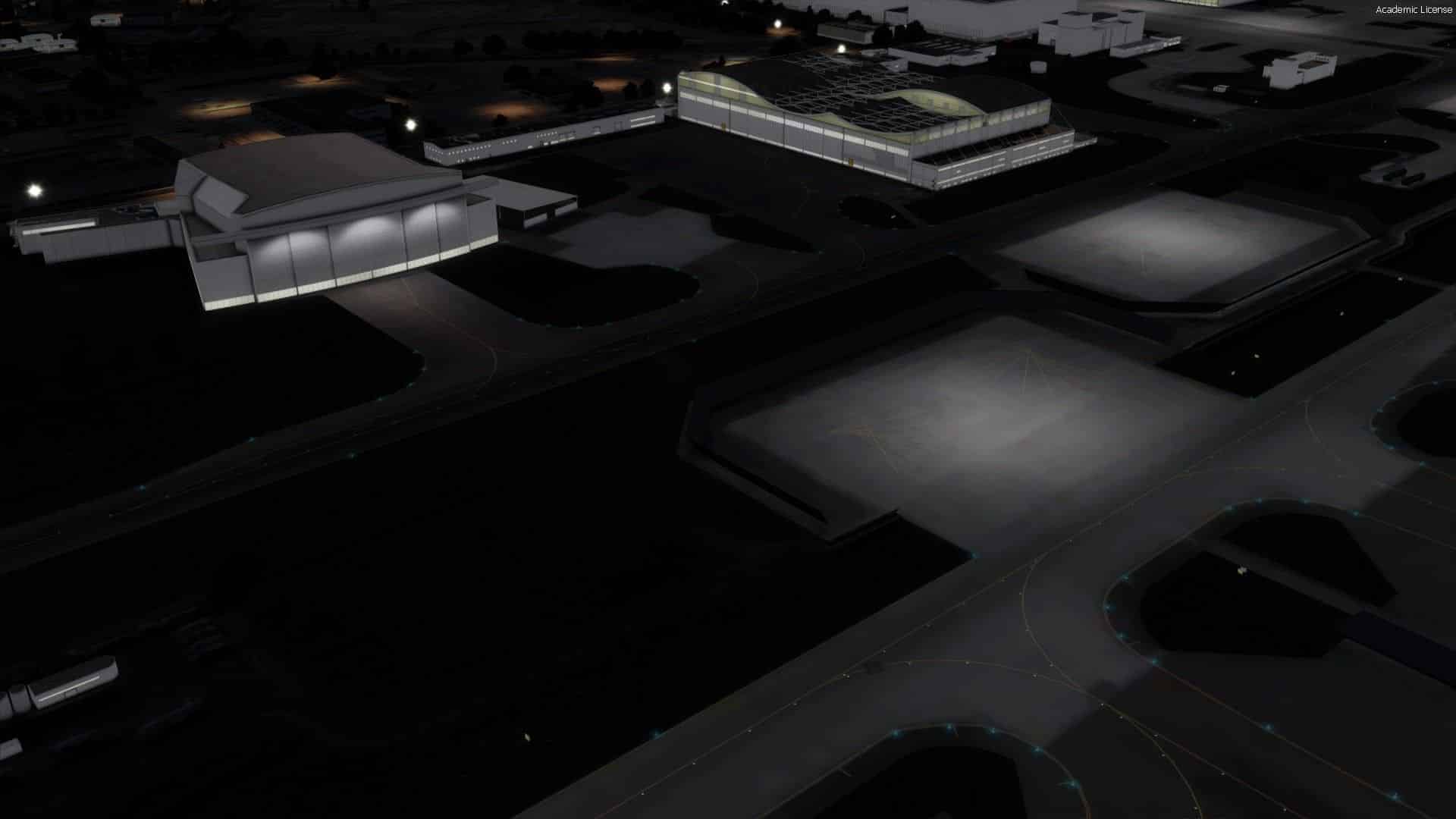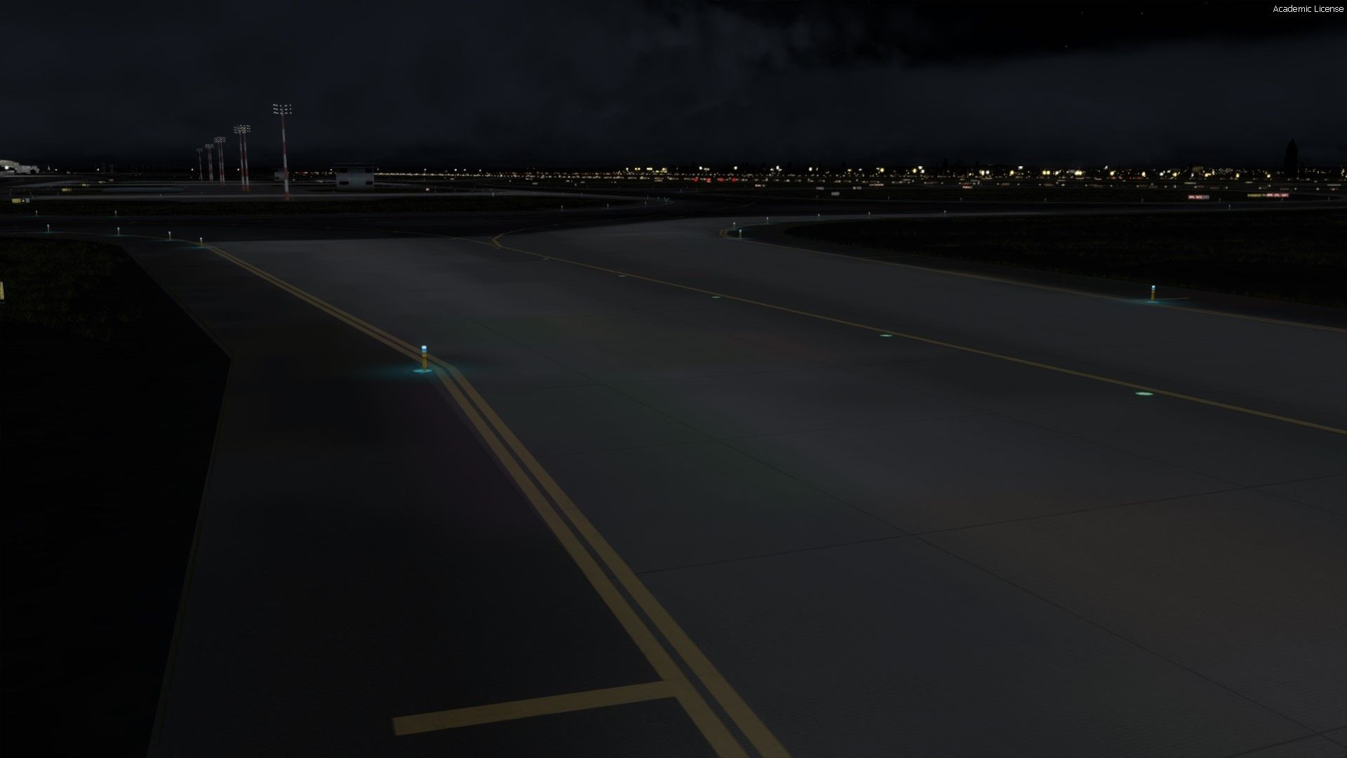 An einigen Stellen des Geländes wird der Boden beleuchtet obwohl es keine Lichtquelle in der näheren Umgebung gibt. Anscheinend wurde die zugrundeliegende Fototextur in diesen Bereichen nicht näher bearbeitet. Mir persönlich sind zudem die Taxiways etwas zu hell geraten. Obwohl sie nicht stark befeuert sind, stellen sie einen Kontrast zum umliegenden Gras dar, was aus meiner Sicht unnatürlich wirkt.