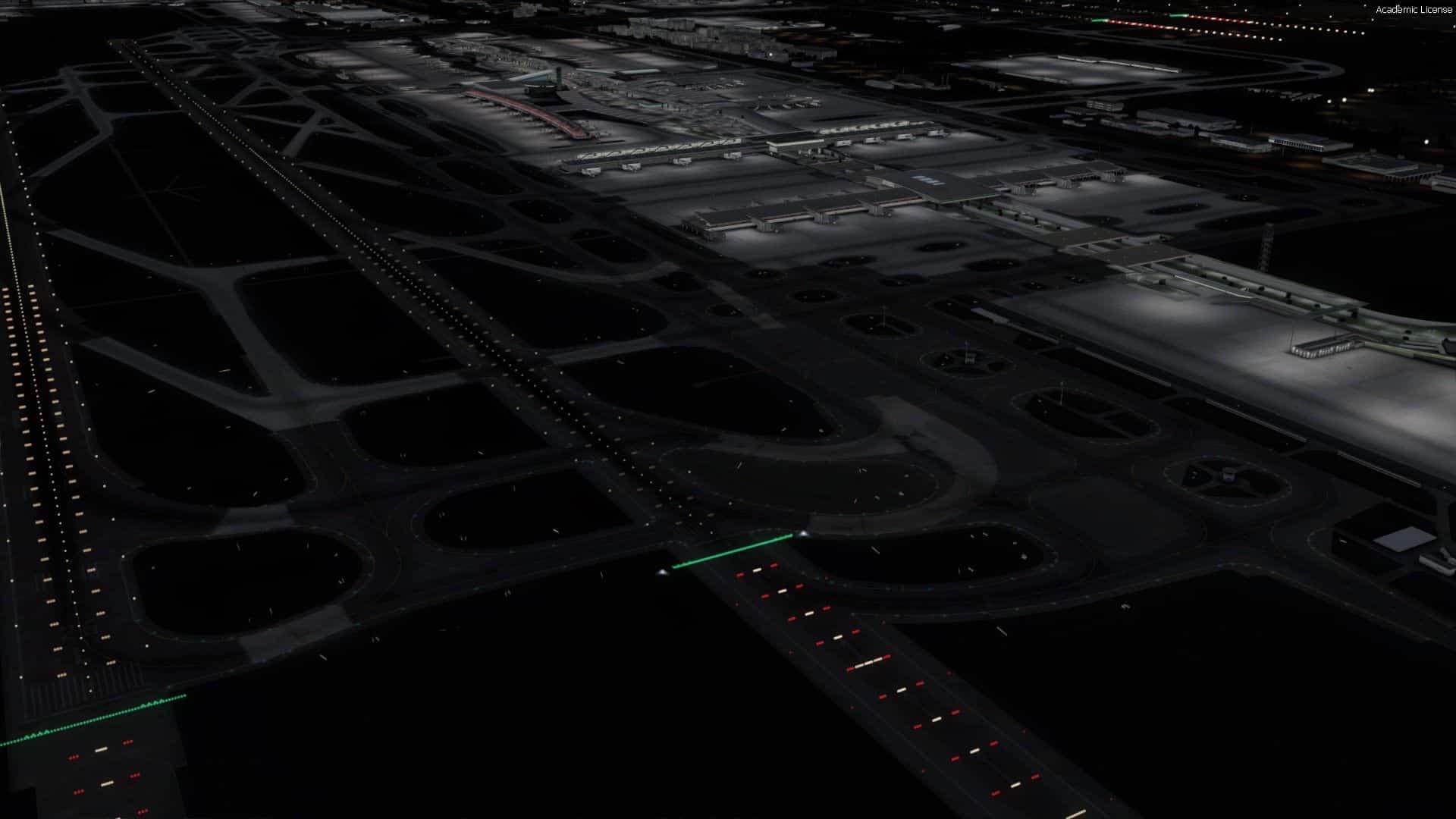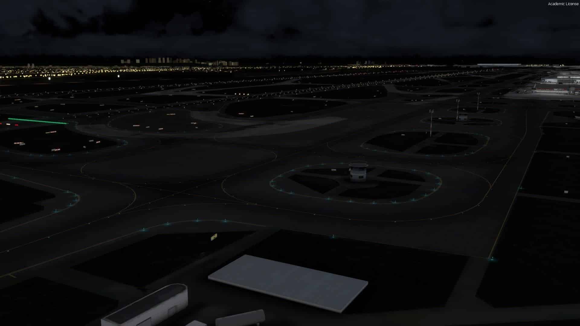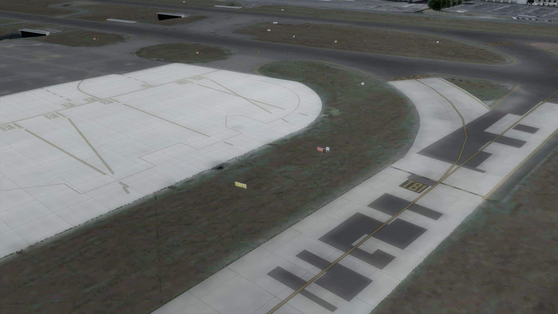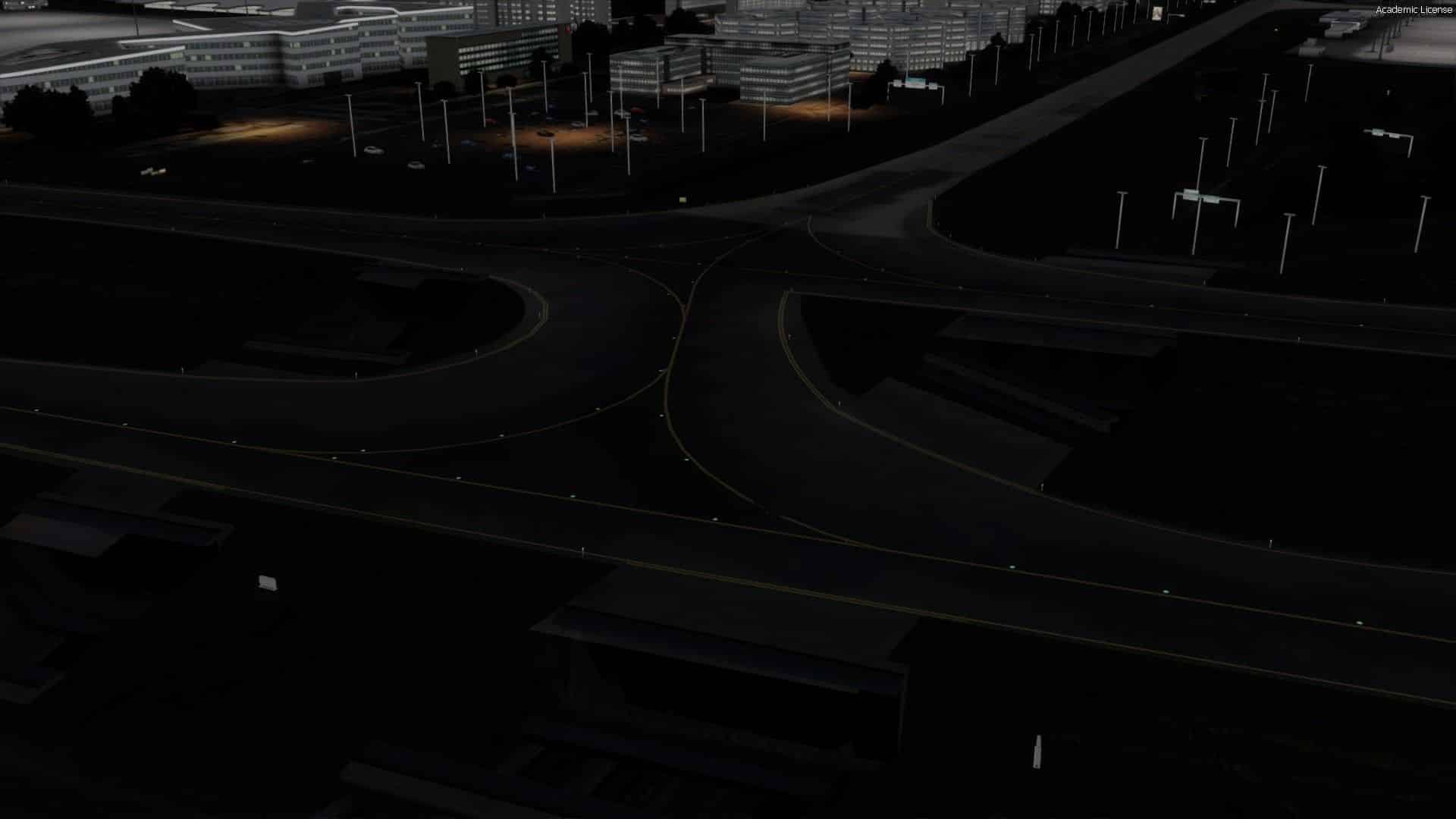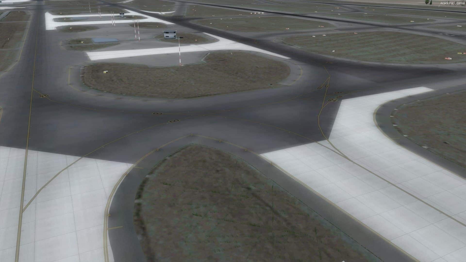 An einigen Stellen des Geländes wird der Boden beleuchtet obwohl es keine Lichtquelle in der näheren Umgebung gibt. Anscheinend wurde die zugrundeliegende Fototextur in diesen Bereichen nicht näher bearbeitet. Mir persönlich sind zudem die Taxiways etwas zu hell geraten. Obwohl sie nicht stark befeuert sind, stellen sie einen Kontrast zum umliegenden Gras dar, was aus meiner Sicht unnatürlich wirkt.
