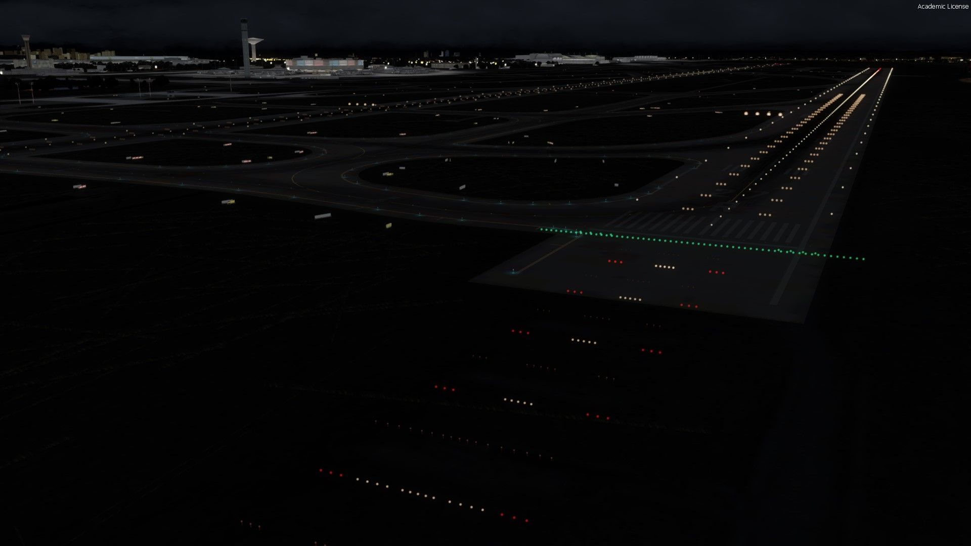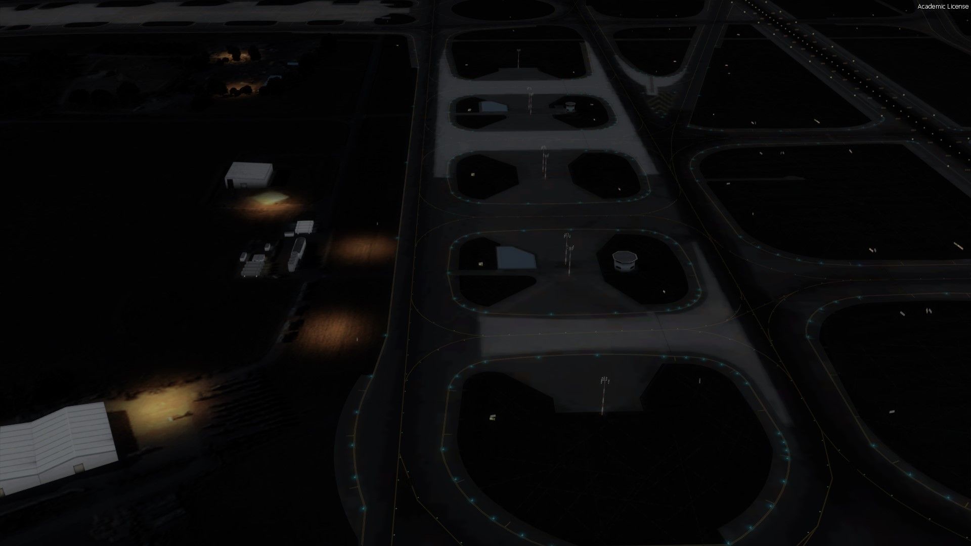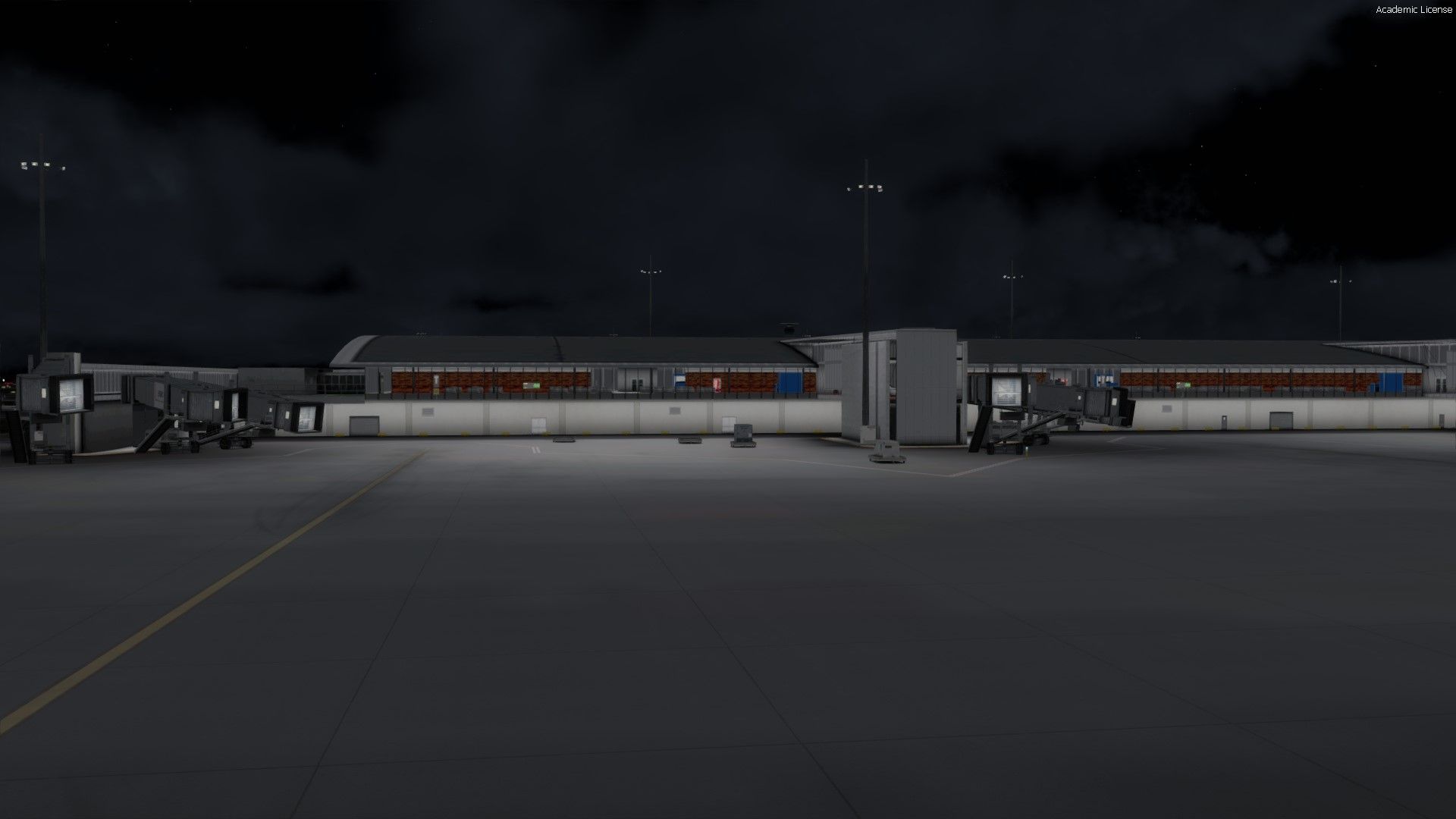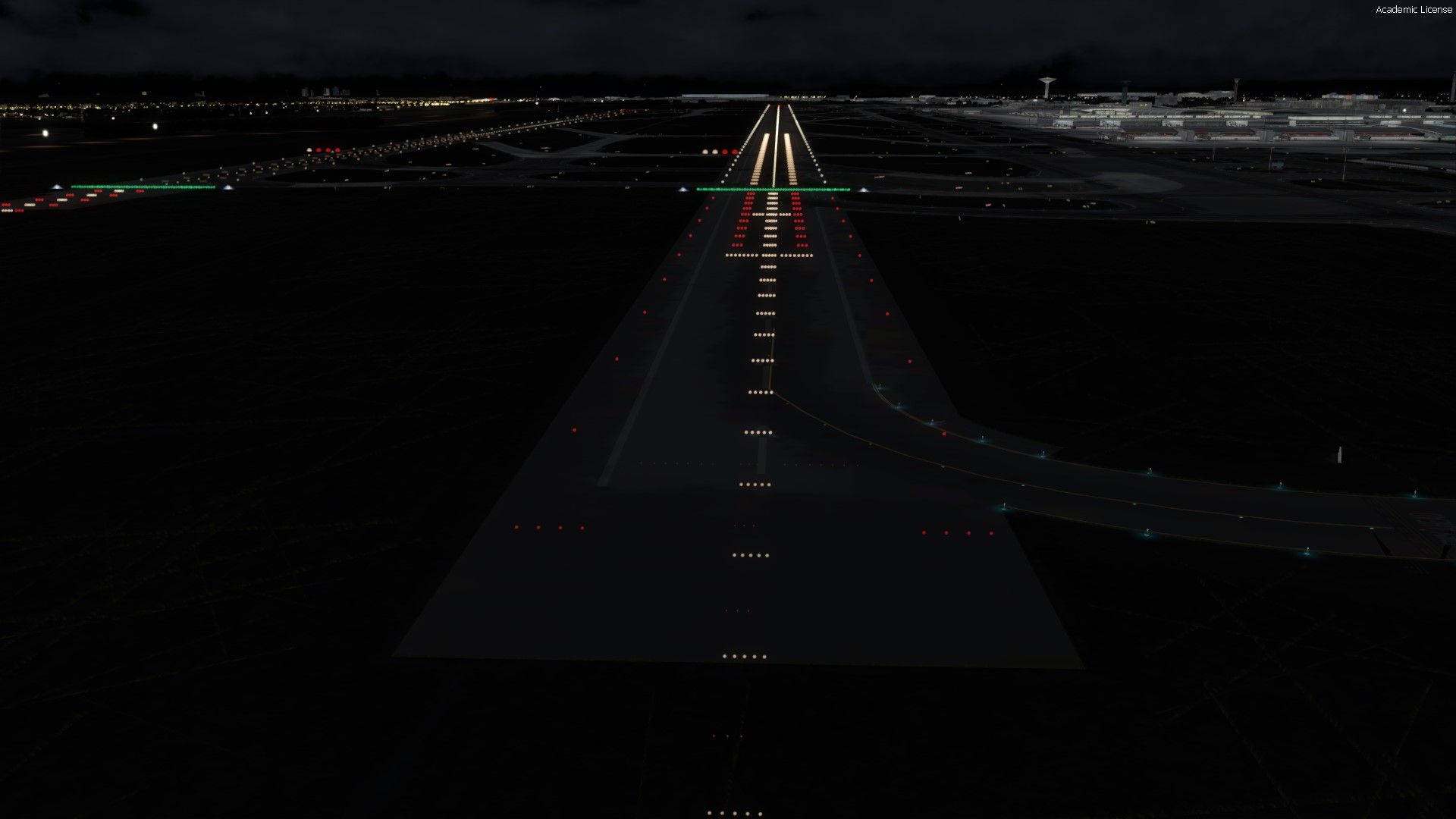 An einigen Stellen des Geländes wird der Boden beleuchtet obwohl es keine Lichtquelle in der näheren Umgebung gibt. Anscheinend wurde die zugrundeliegende Fototextur in diesen Bereichen nicht näher bearbeitet. Mir persönlich sind zudem die Taxiways etwas zu hell geraten. Obwohl sie nicht stark befeuert sind, stellen sie einen Kontrast zum umliegenden Gras dar, was aus meiner Sicht unnatürlich wirkt.