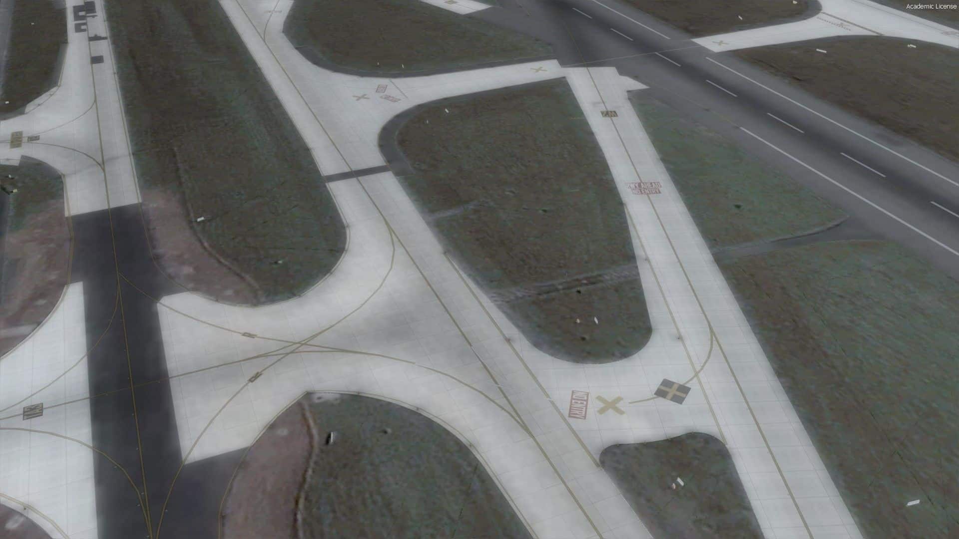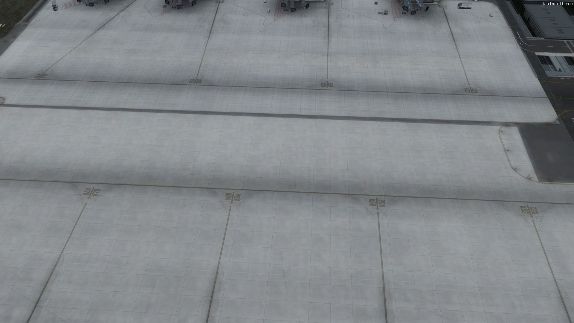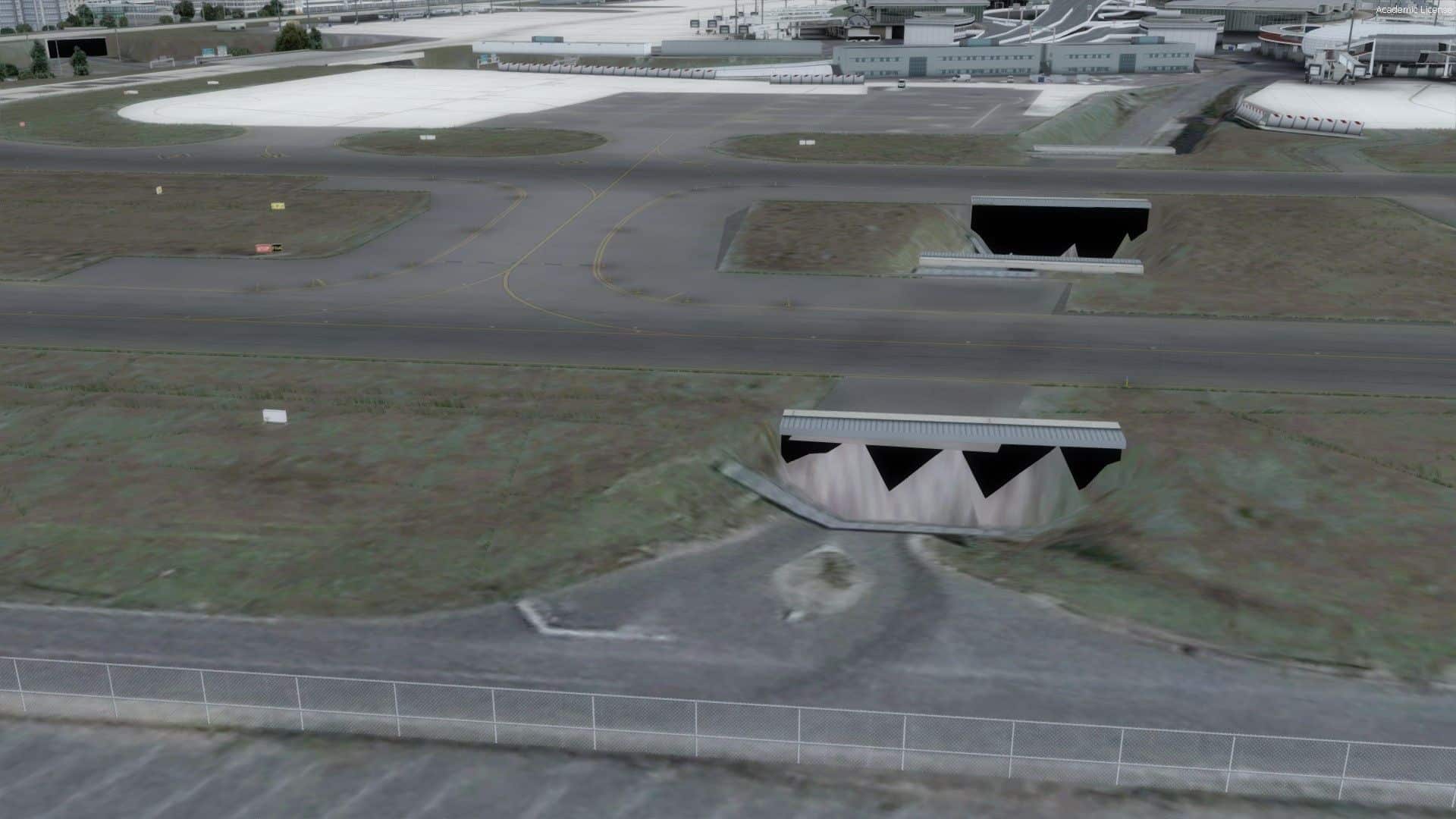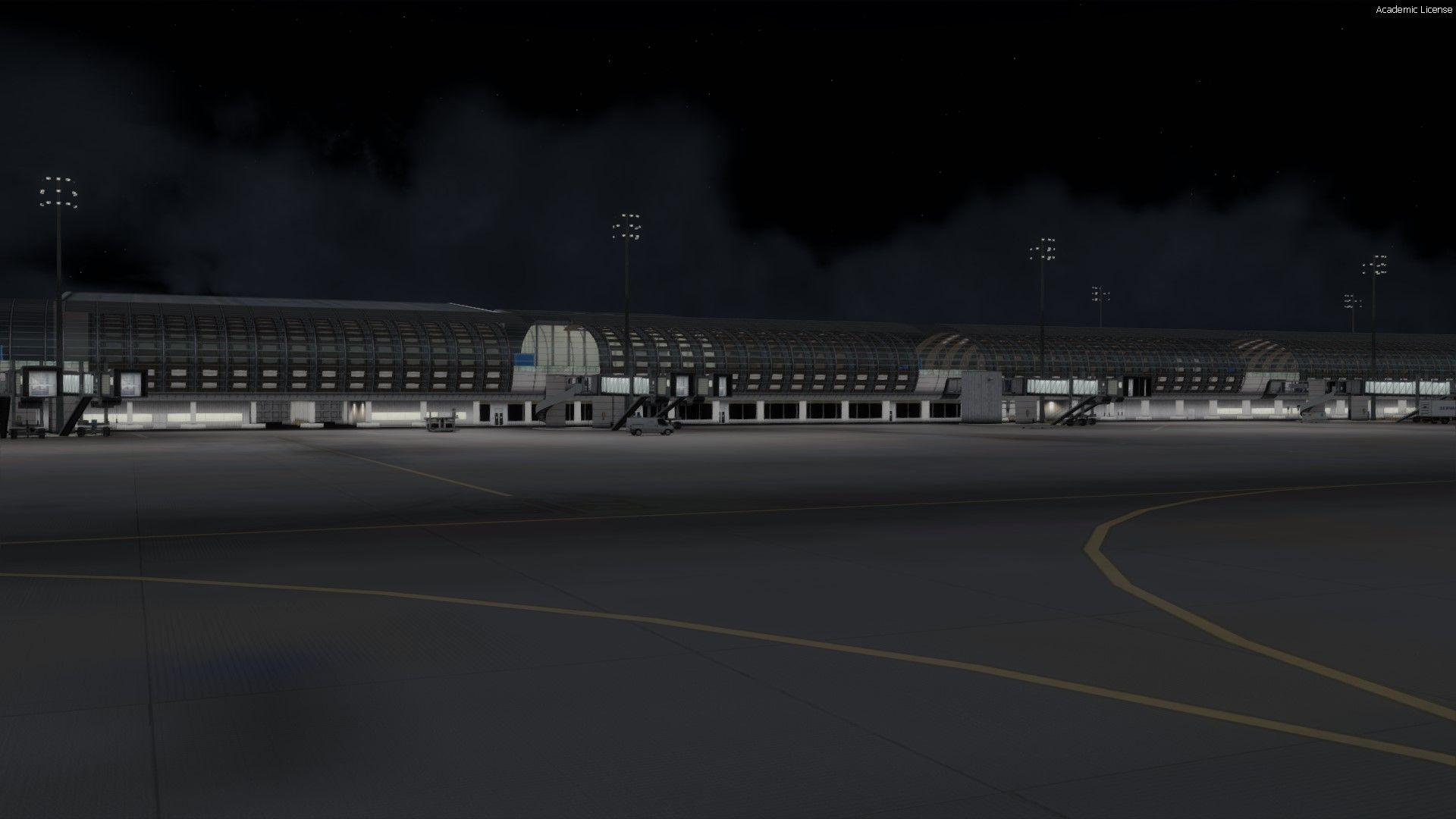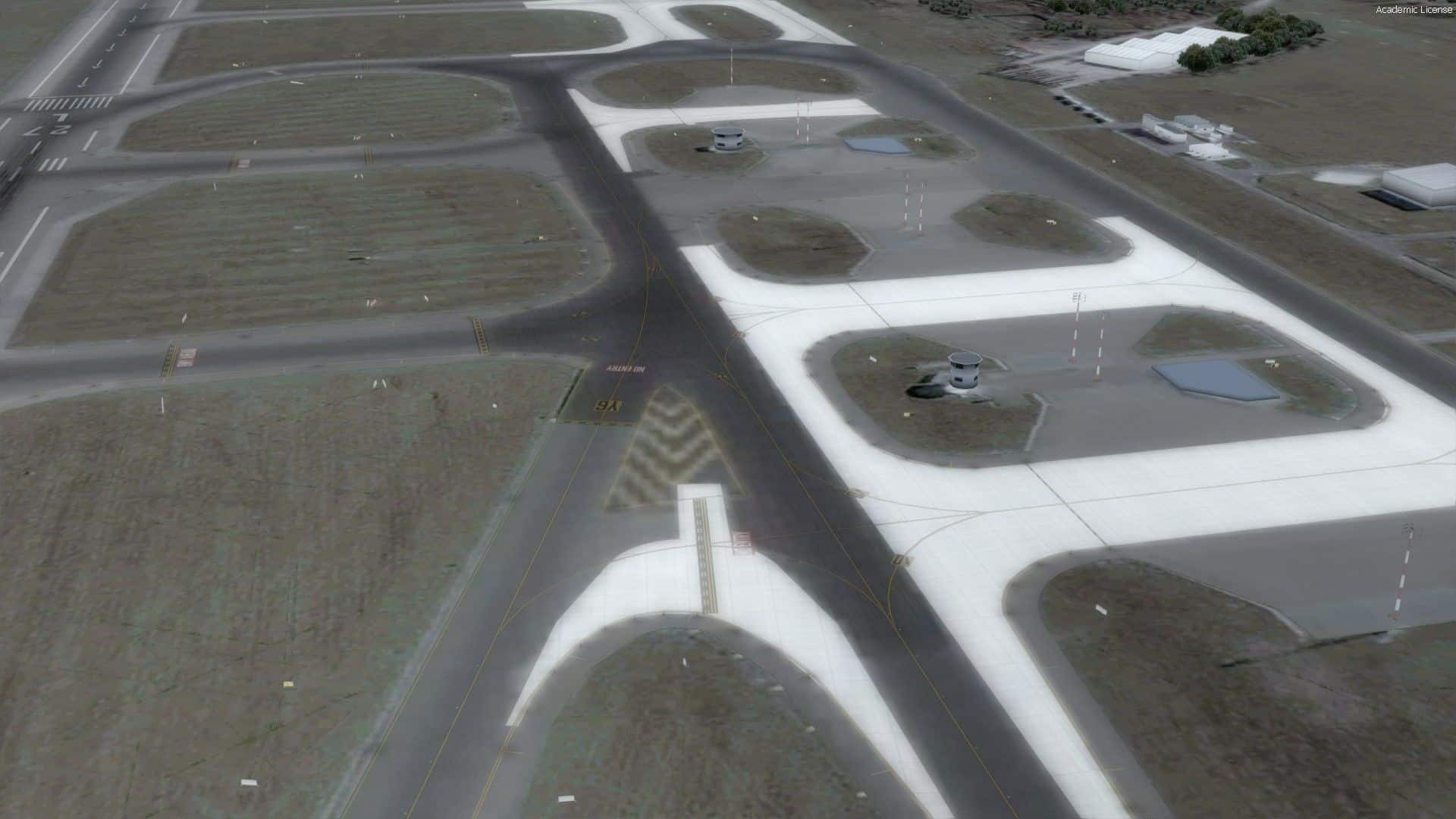 An einigen Stellen des Geländes wird der Boden beleuchtet obwohl es keine Lichtquelle in der näheren Umgebung gibt. Anscheinend wurde die zugrundeliegende Fototextur in diesen Bereichen nicht näher bearbeitet. Mir persönlich sind zudem die Taxiways etwas zu hell geraten. Obwohl sie nicht stark befeuert sind, stellen sie einen Kontrast zum umliegenden Gras dar, was aus meiner Sicht unnatürlich wirkt.