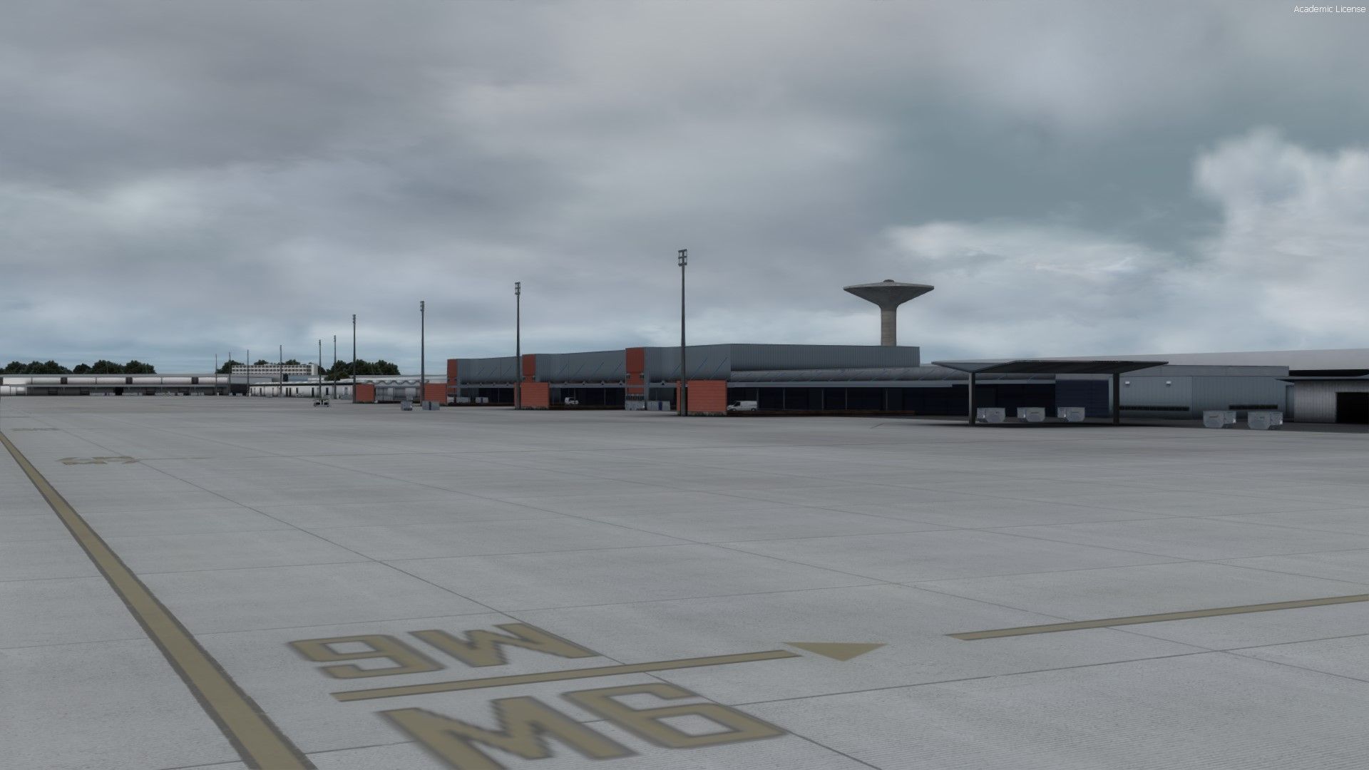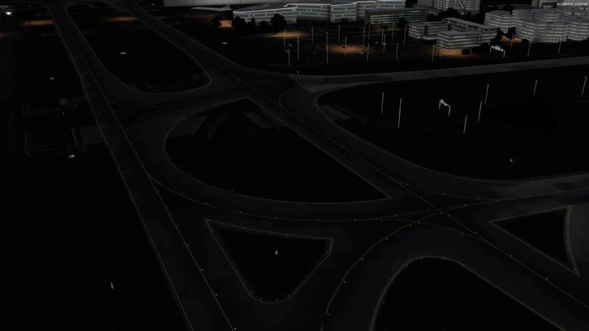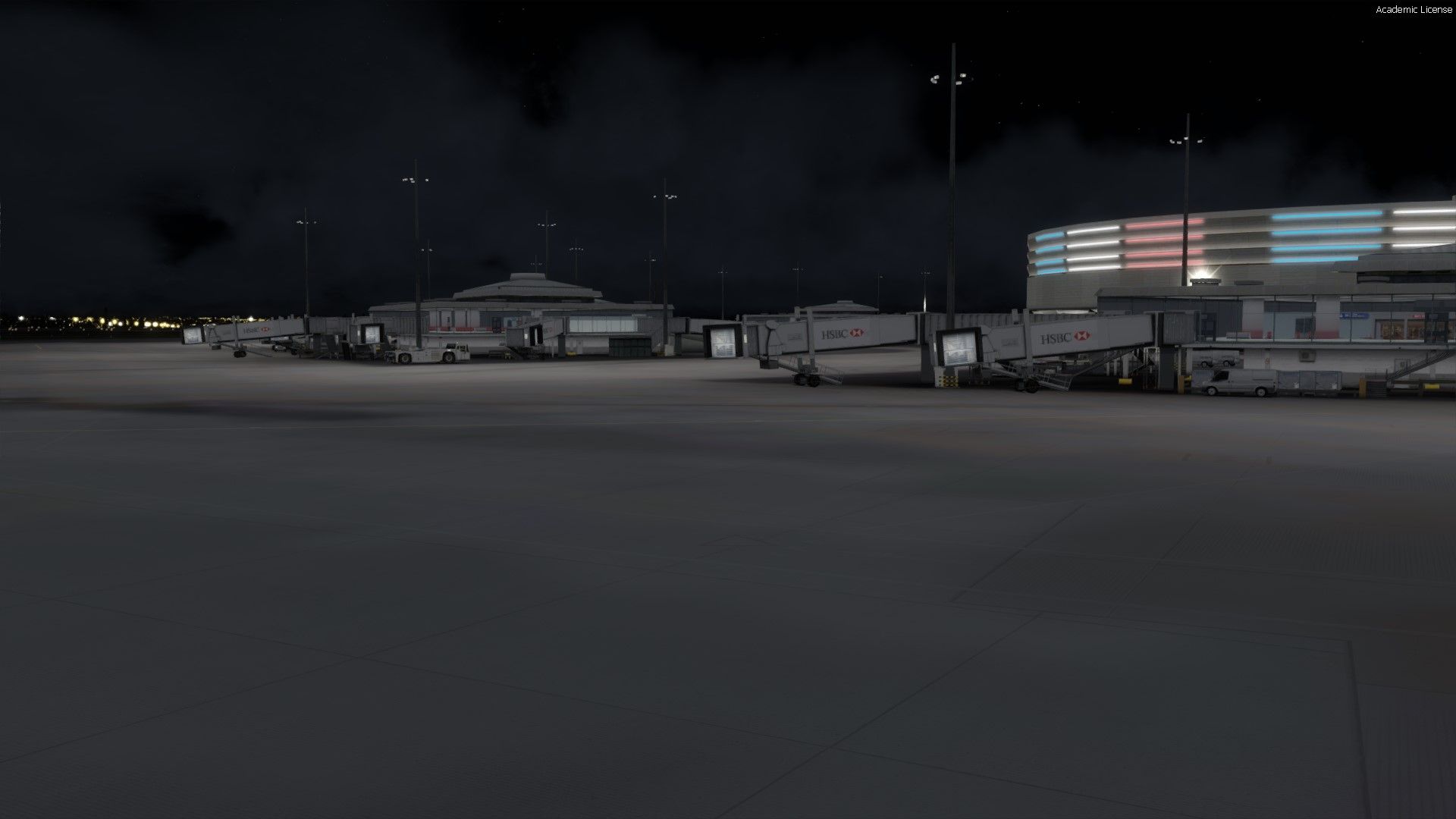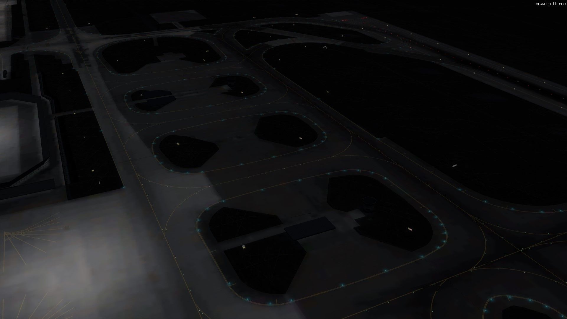 An einigen Stellen des Geländes wird der Boden beleuchtet obwohl es keine Lichtquelle in der näheren Umgebung gibt. Anscheinend wurde die zugrundeliegende Fototextur in diesen Bereichen nicht näher bearbeitet. Mir persönlich sind zudem die Taxiways etwas zu hell geraten. Obwohl sie nicht stark befeuert sind, stellen sie einen Kontrast zum umliegenden Gras dar, was aus meiner Sicht unnatürlich wirkt.