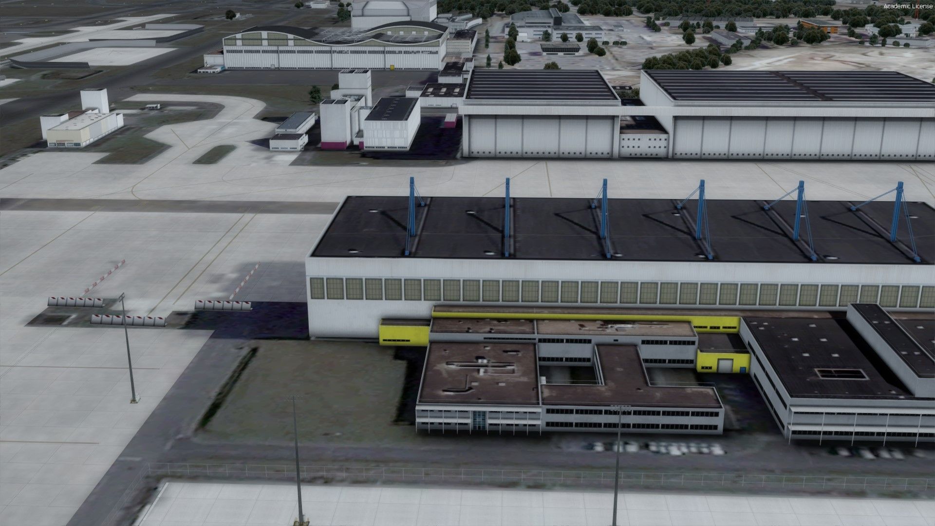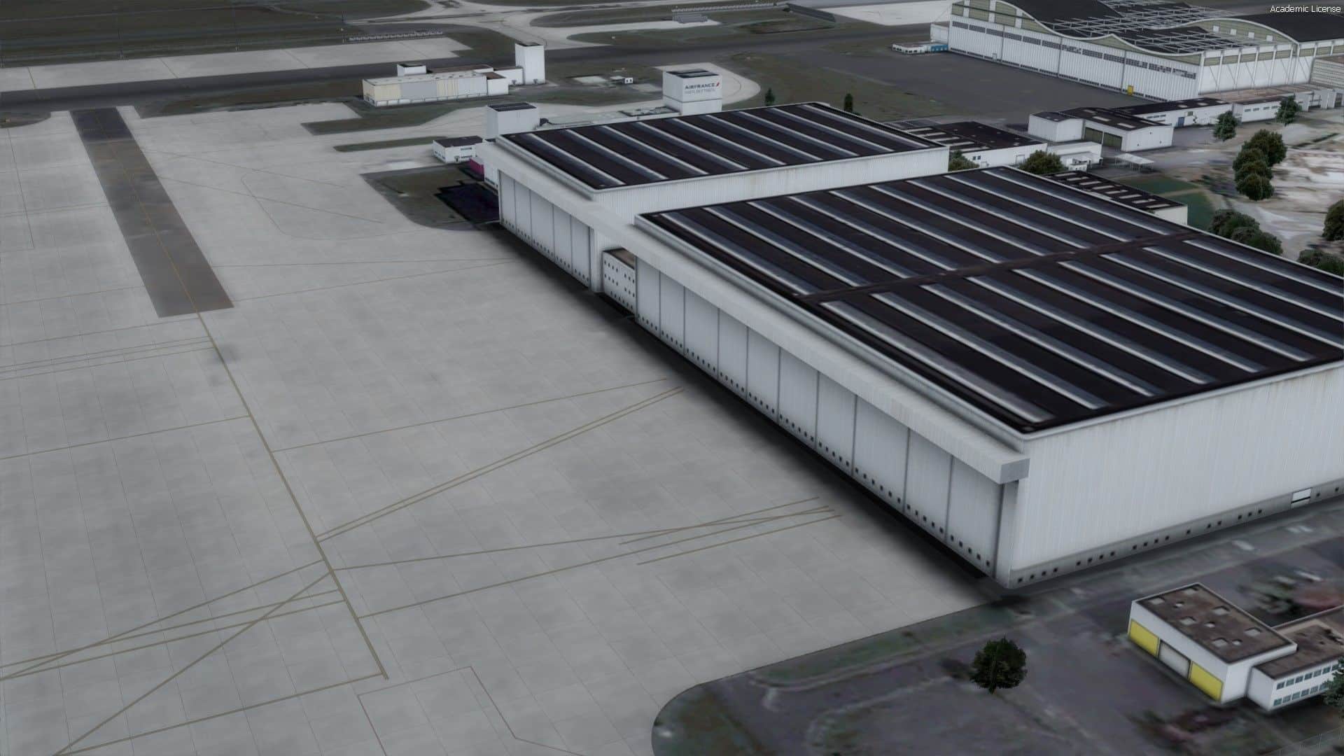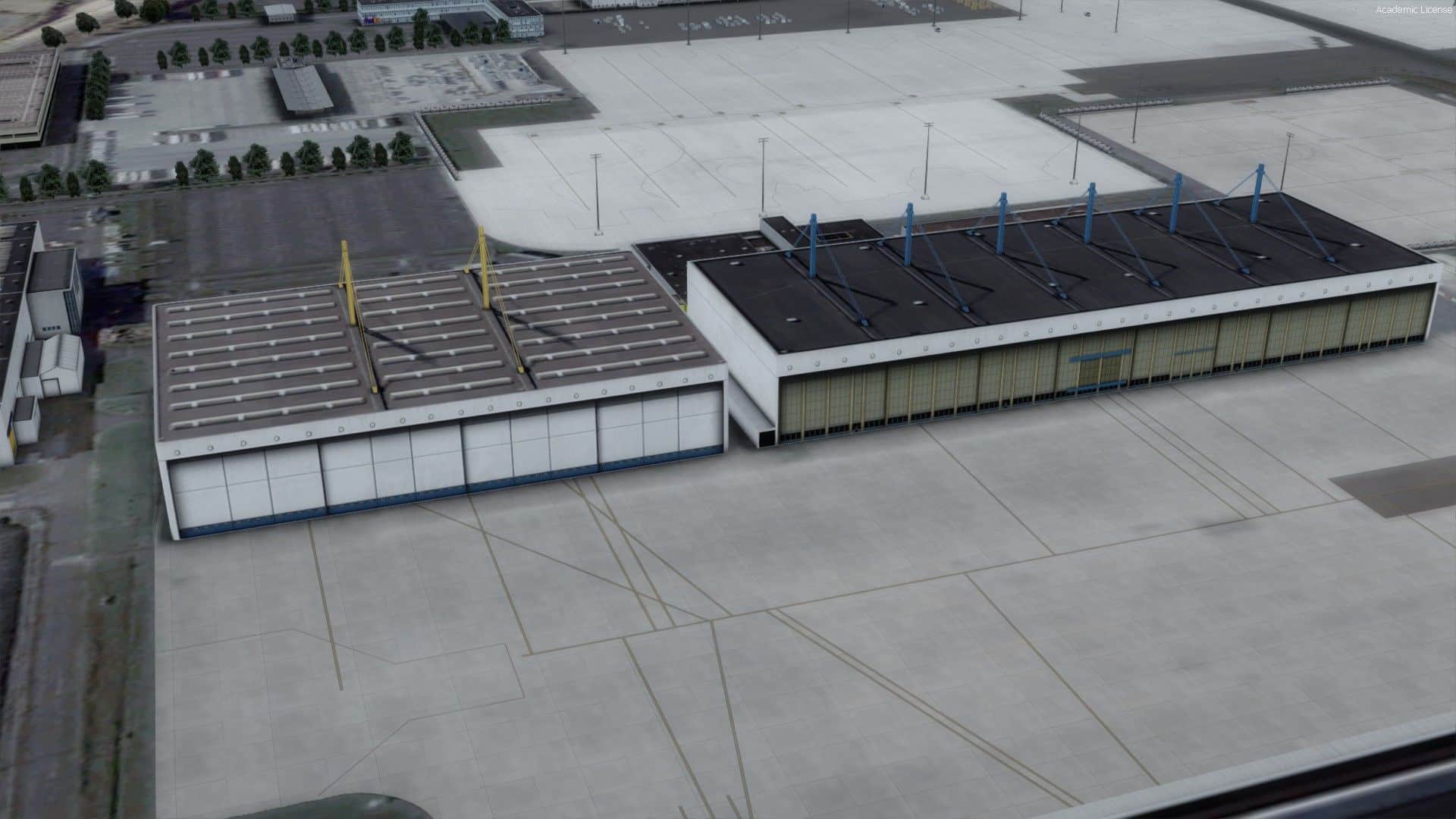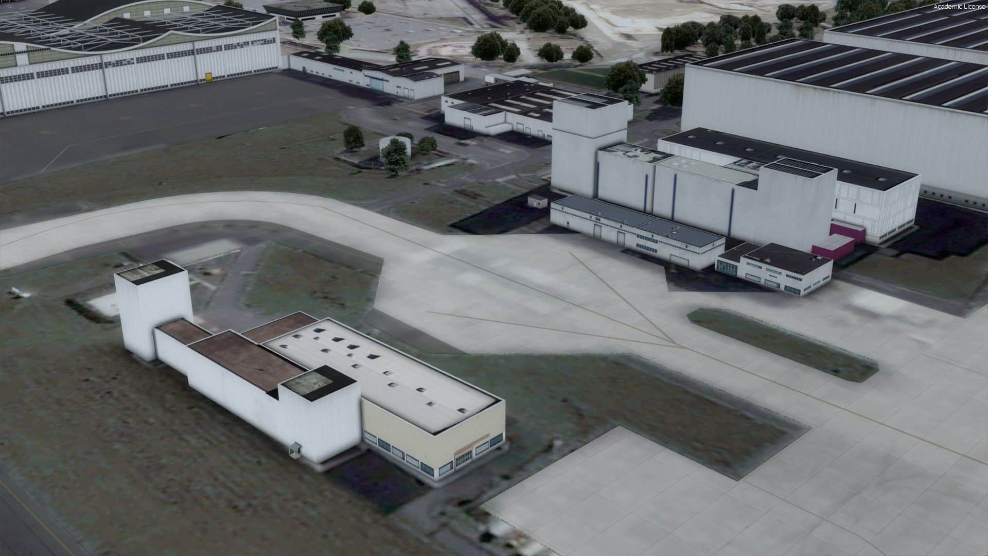 Gleiches gilt für die Wartungsbereiche. Die Gebäudemodelle lassen sich gut anschauen, Dach- und Torkonstruktionen von Hangars wurden sauber umgesetzt.