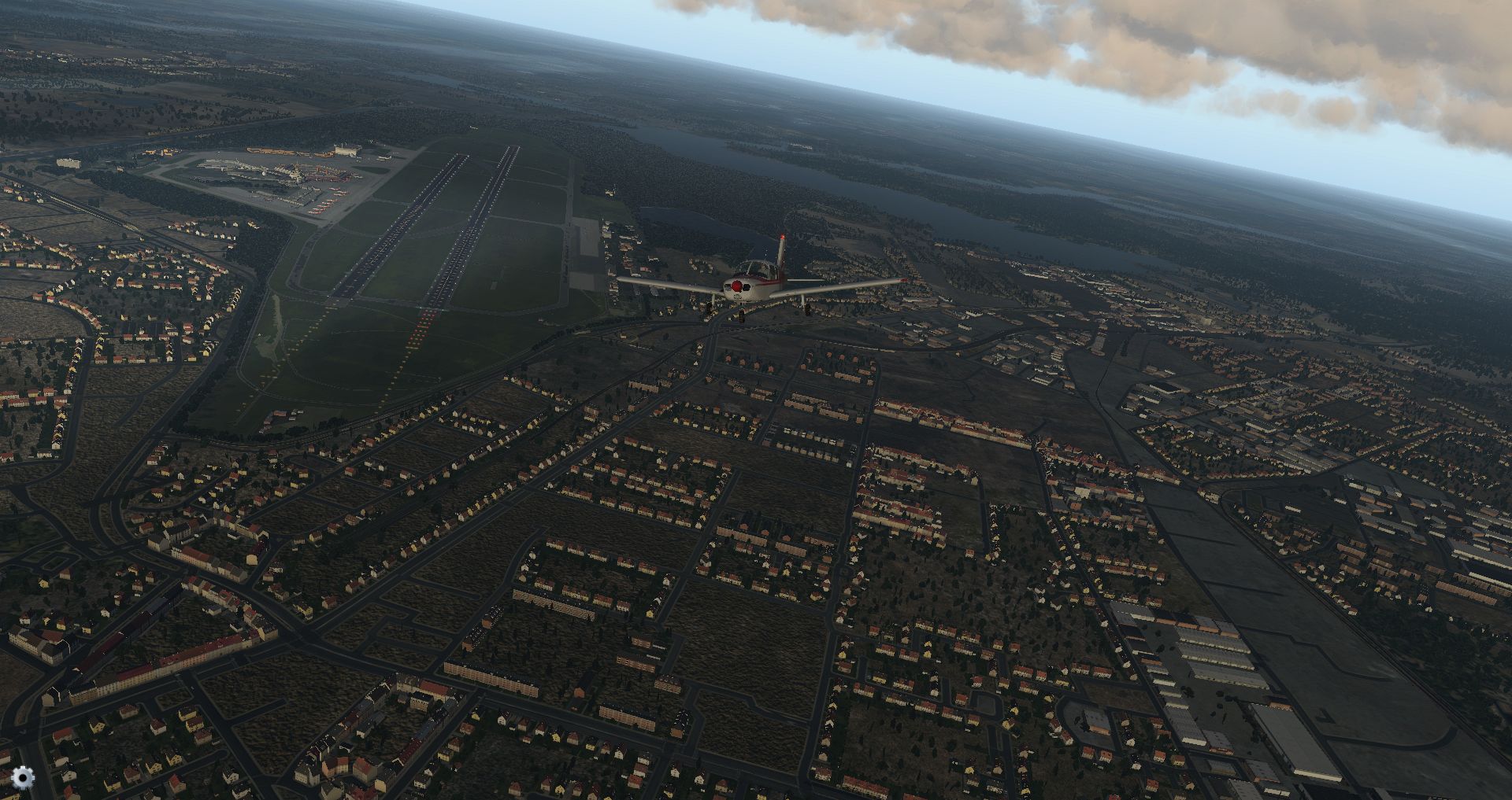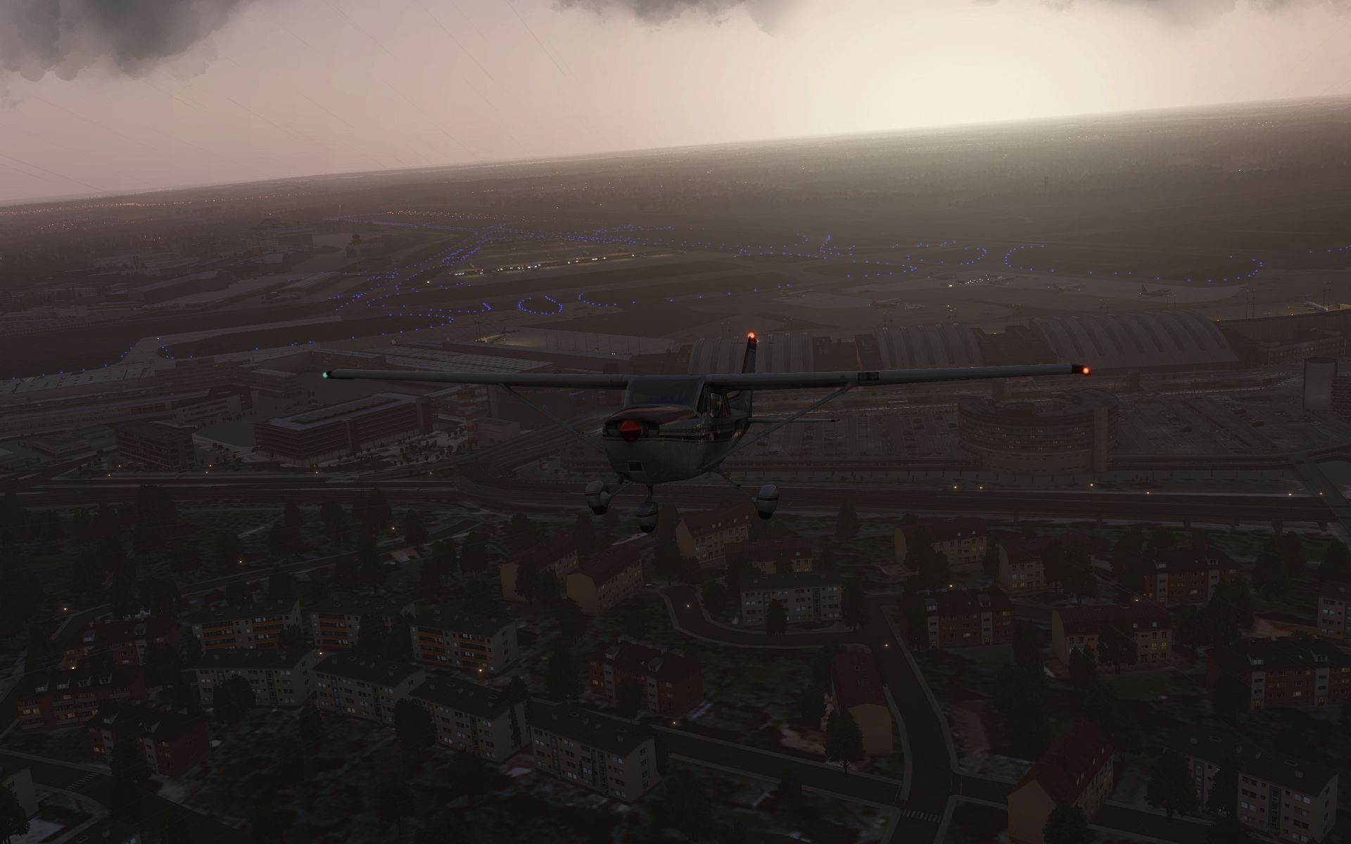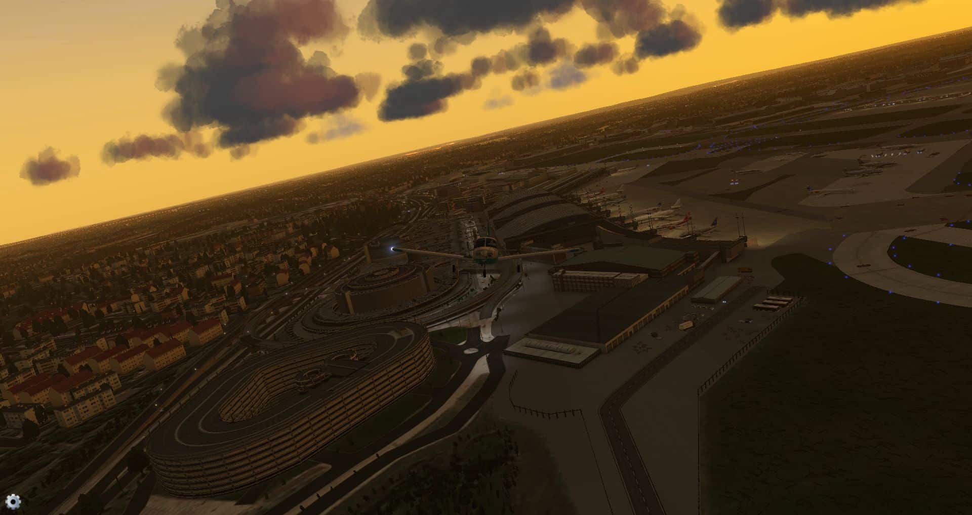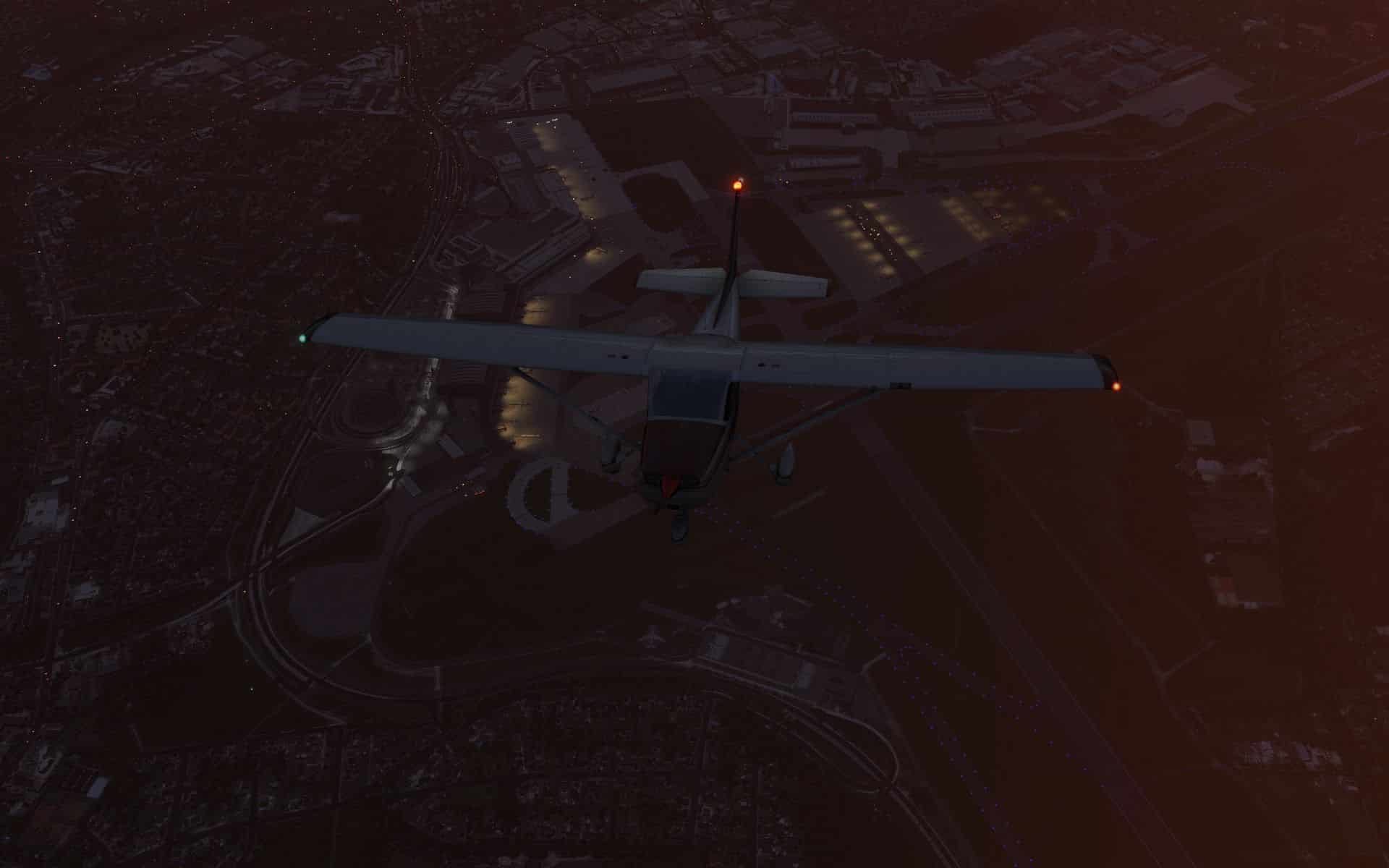 Es klart auf und wir gewinnen an Höhe, um zu sehen wie sich der Flughafen und seine Effekte aus der Entfernung machen.