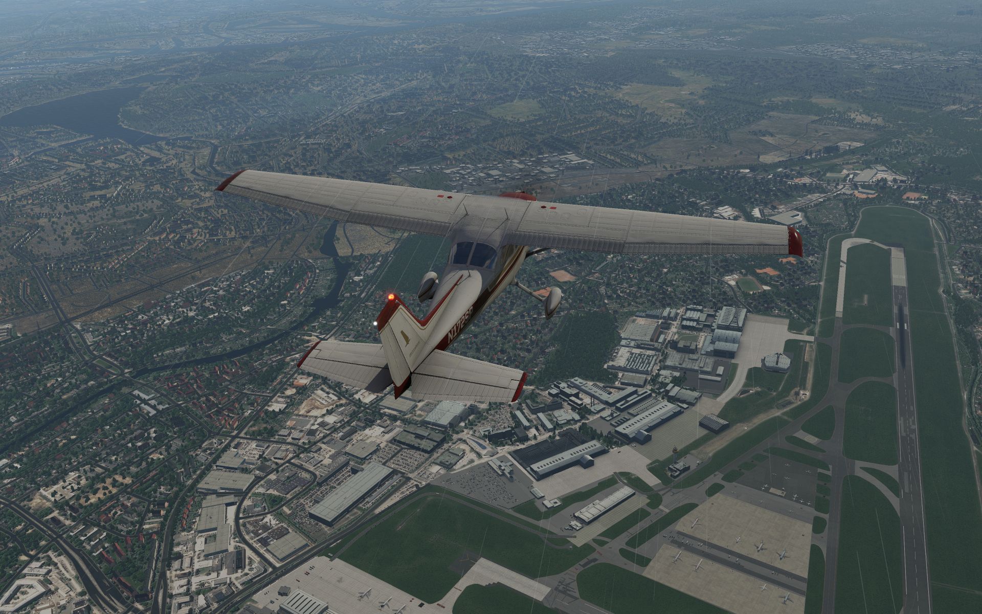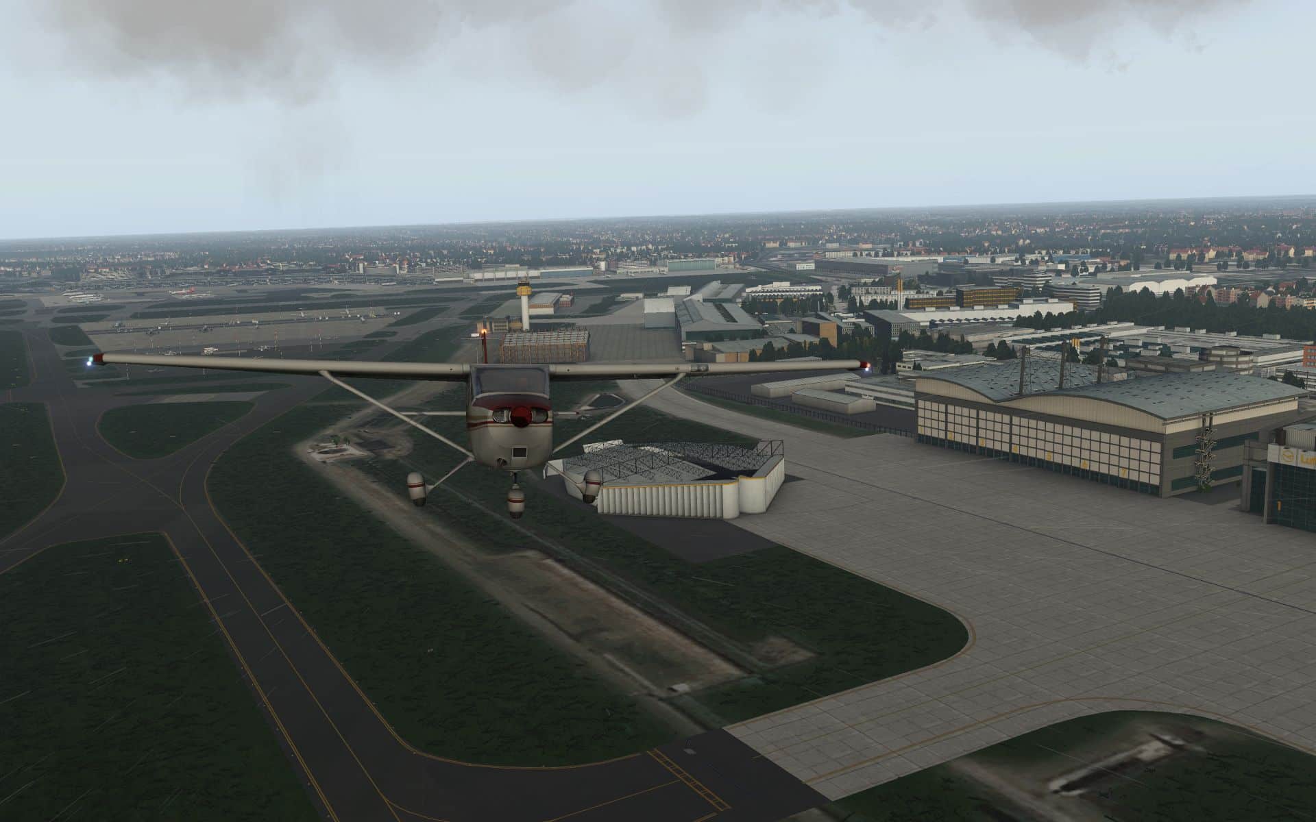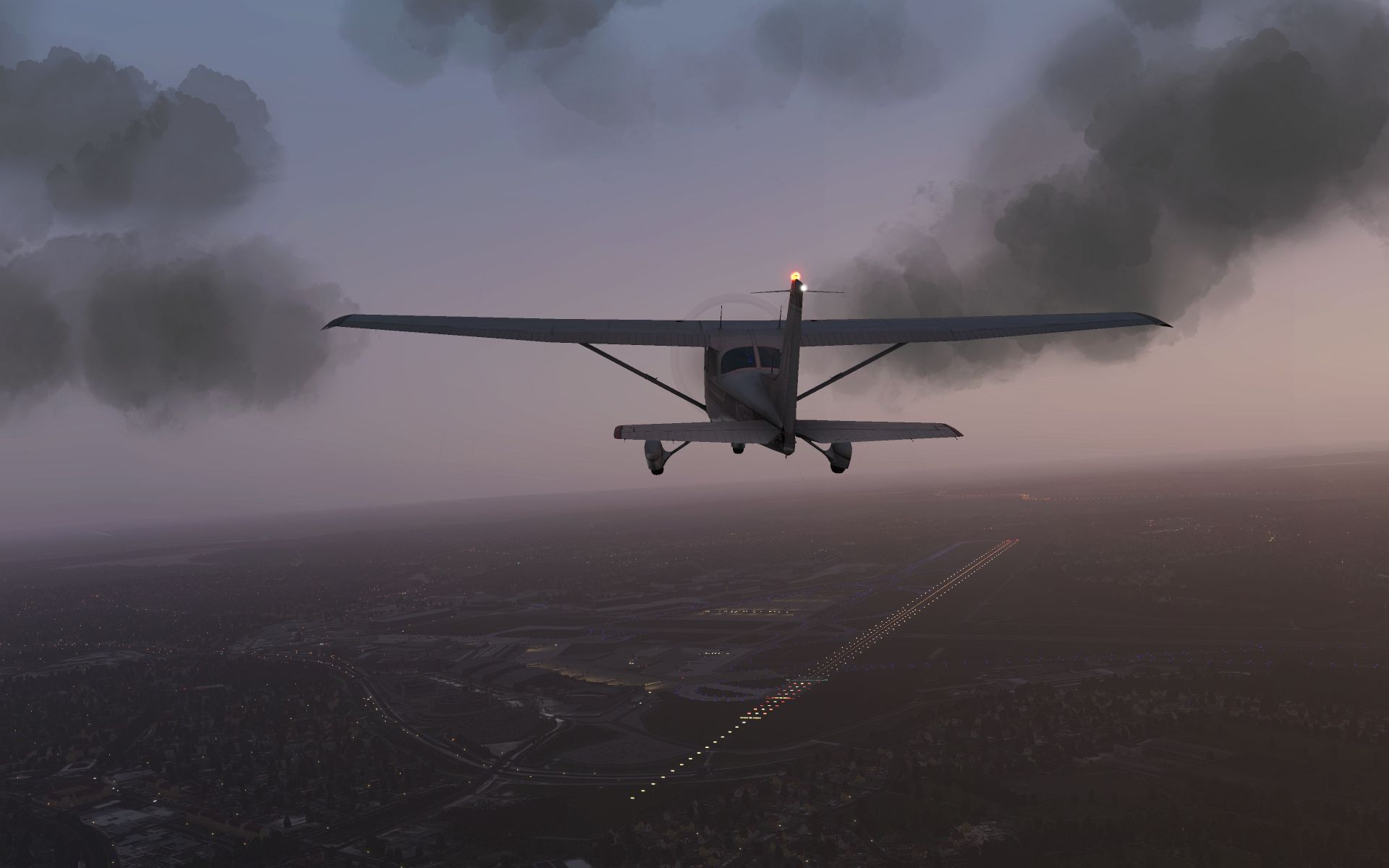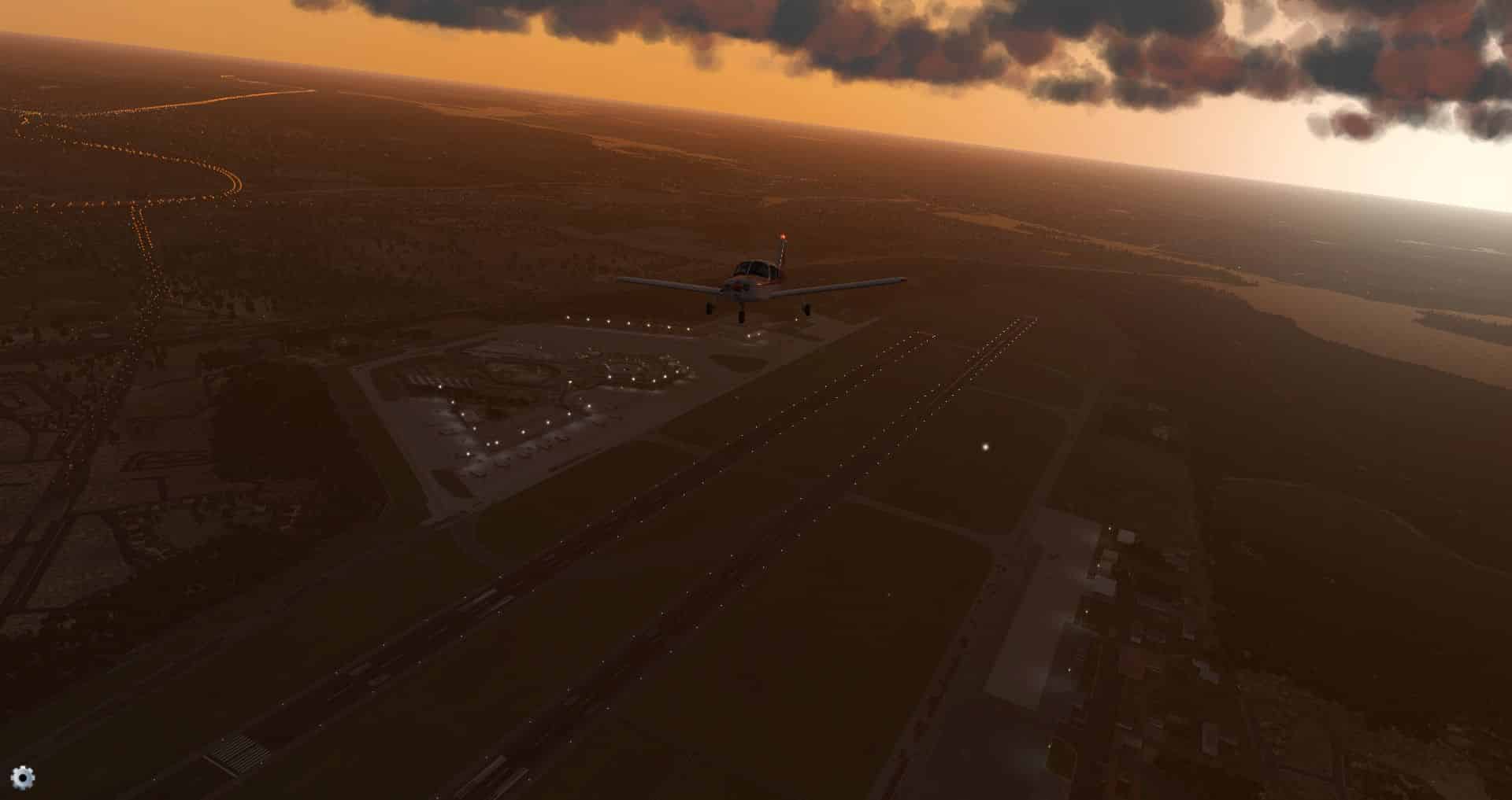 Es klart auf und wir gewinnen an Höhe, um zu sehen wie sich der Flughafen und seine Effekte aus der Entfernung machen.