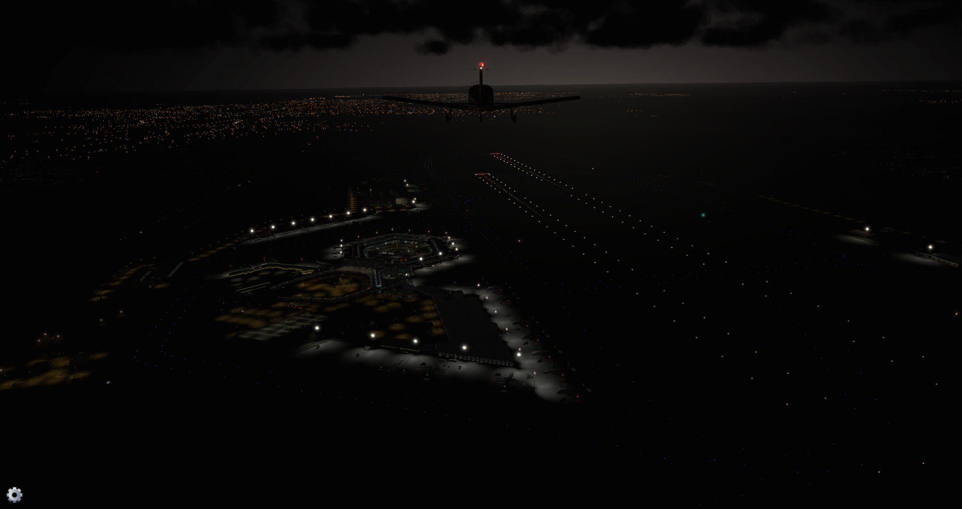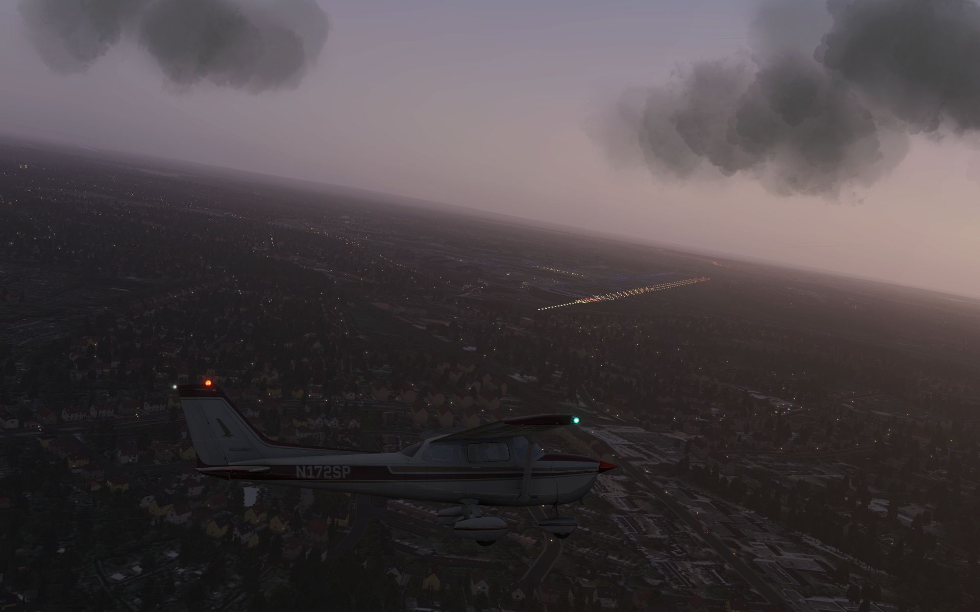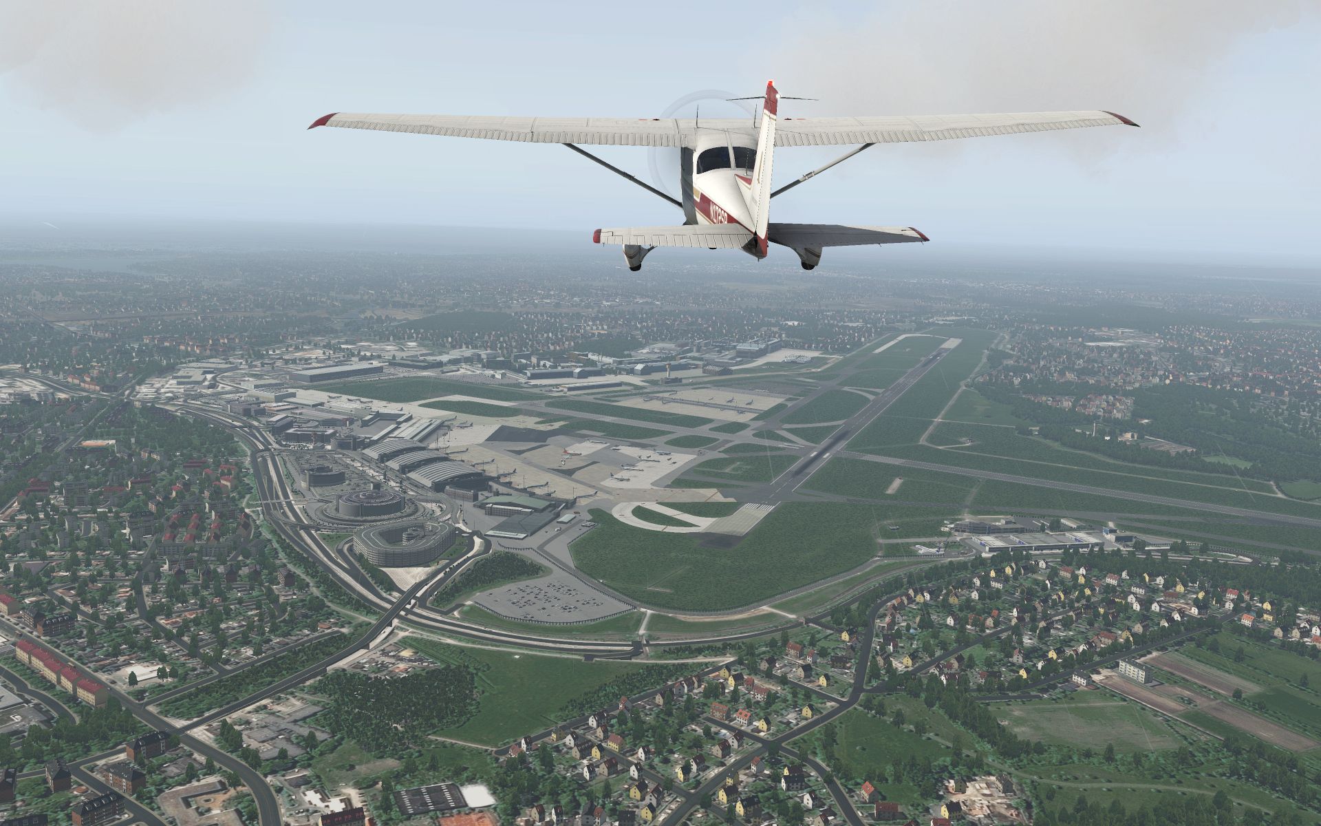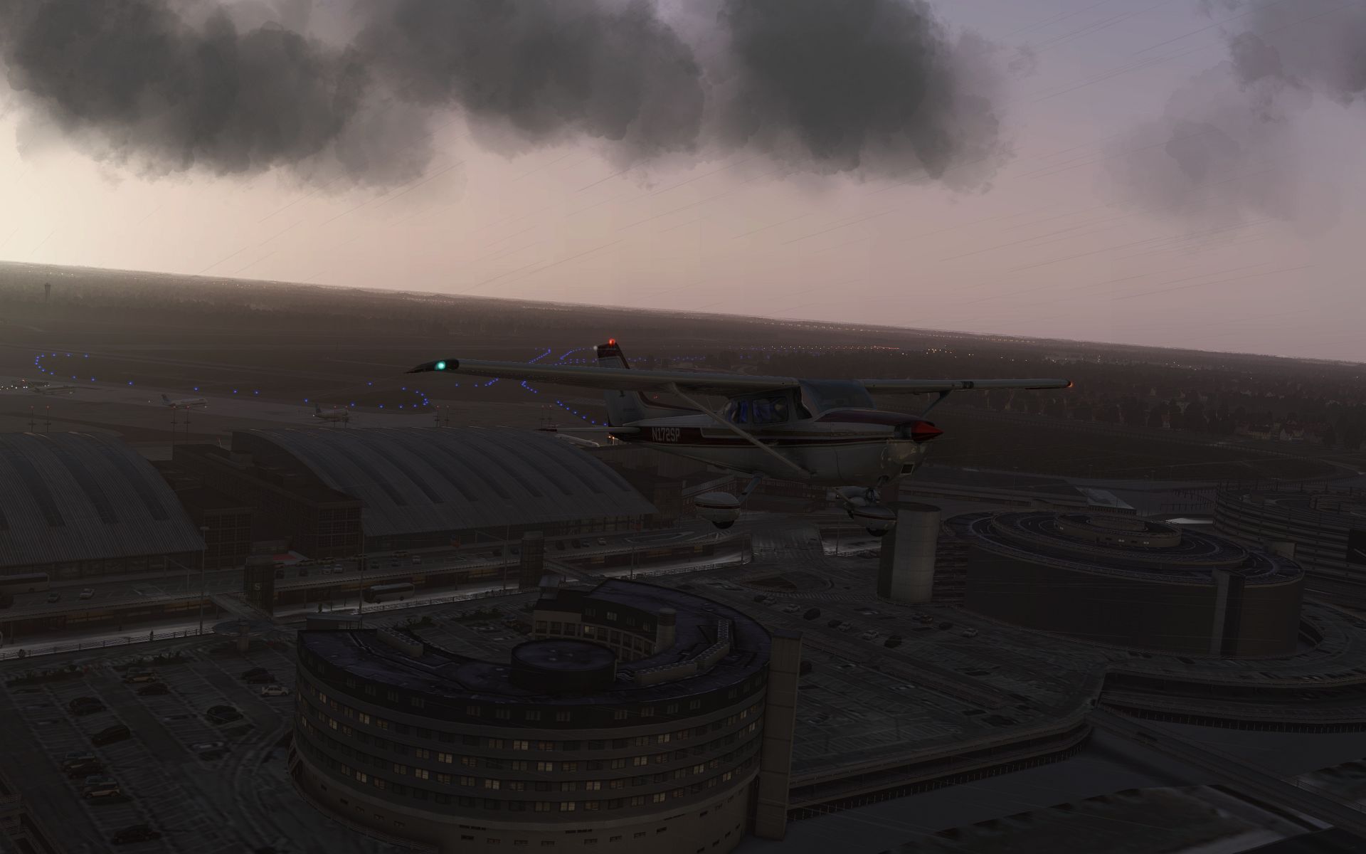 Es klart auf und wir gewinnen an Höhe, um zu sehen wie sich der Flughafen und seine Effekte aus der Entfernung machen.