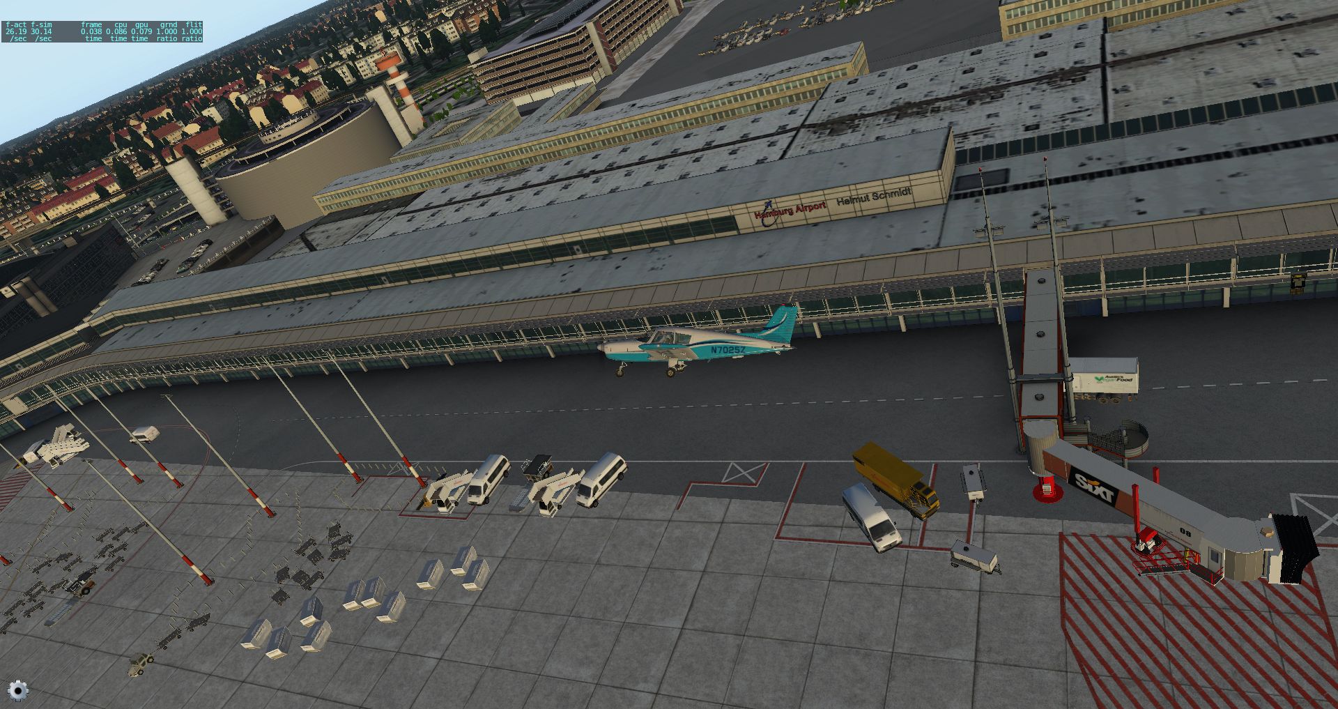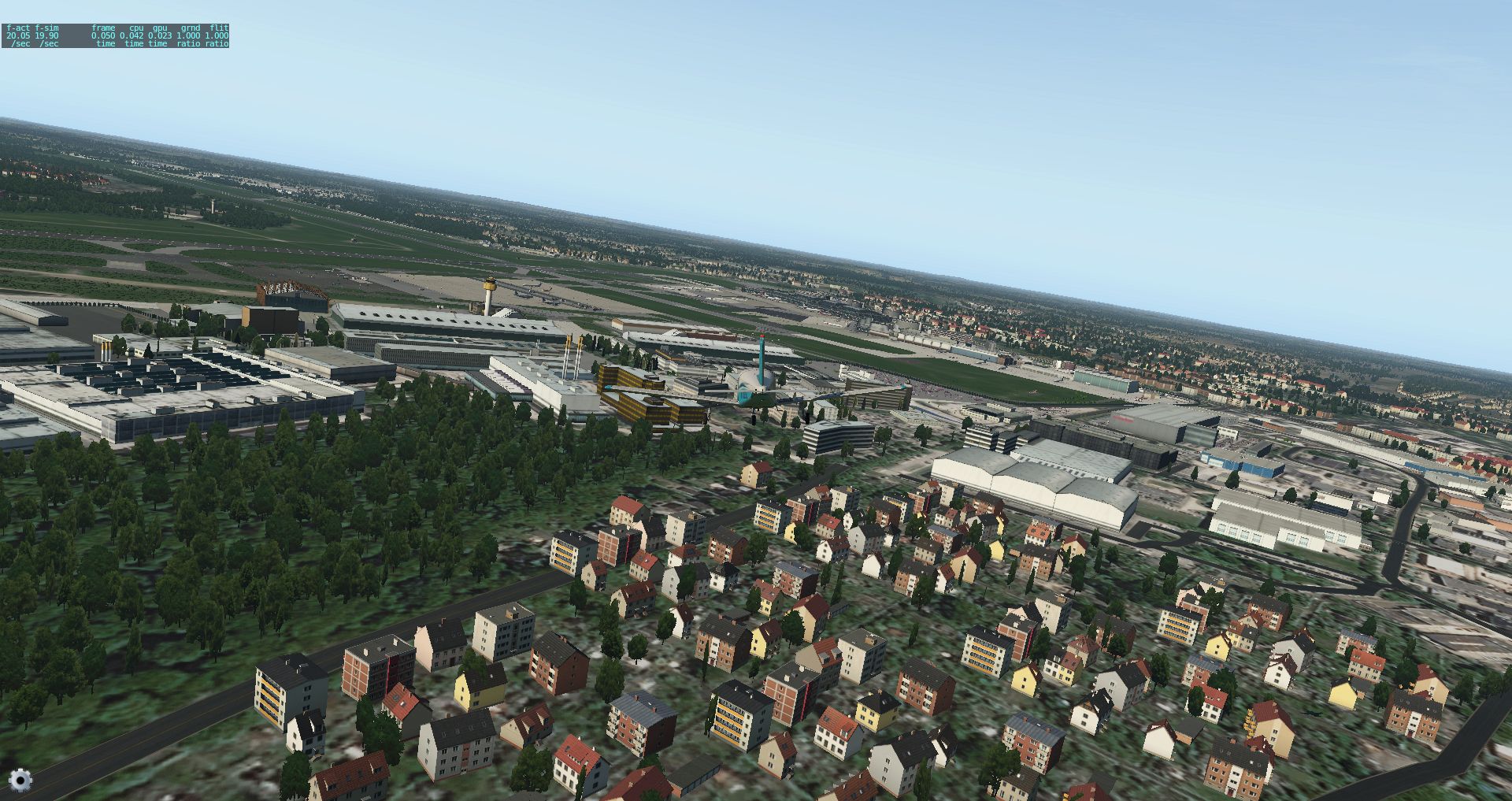 Man kann beim besten Willen nicht erkennen, wo das vom Flughafen mitgelieferte Gebiet endet. Allerdings fällt auch auf, dass Hamburg ein wenig uniform wirkt, weil die momentanen Daten noch keine Gebäudehöhen gespeichert haben. Dies soll sich bis zu Release von X-Plane 11 ändern.