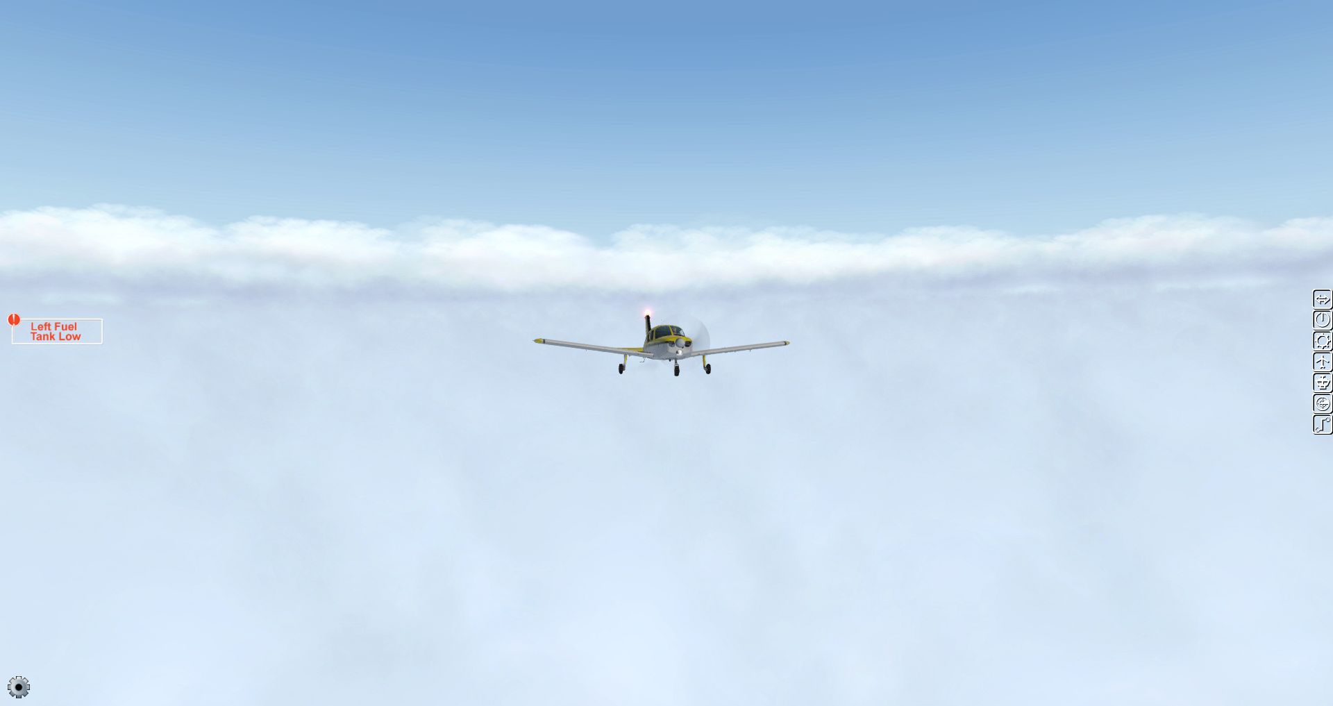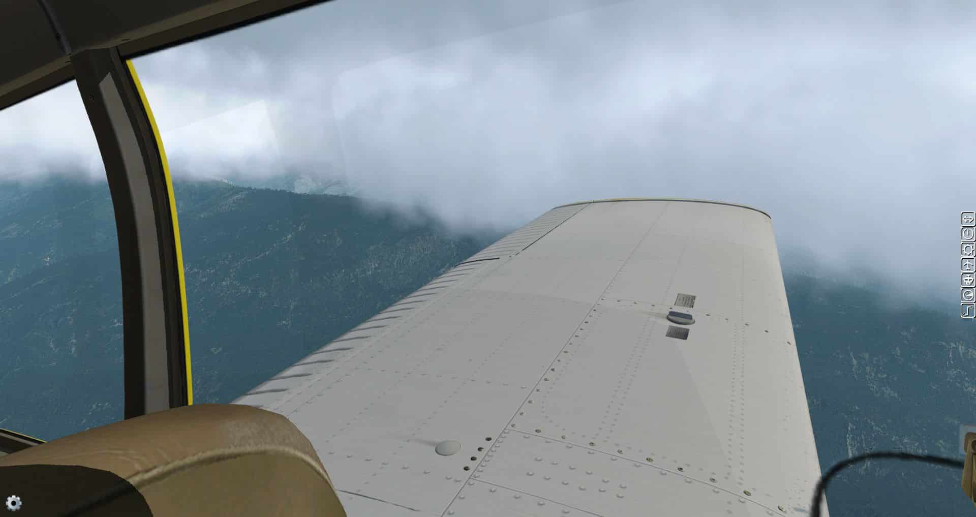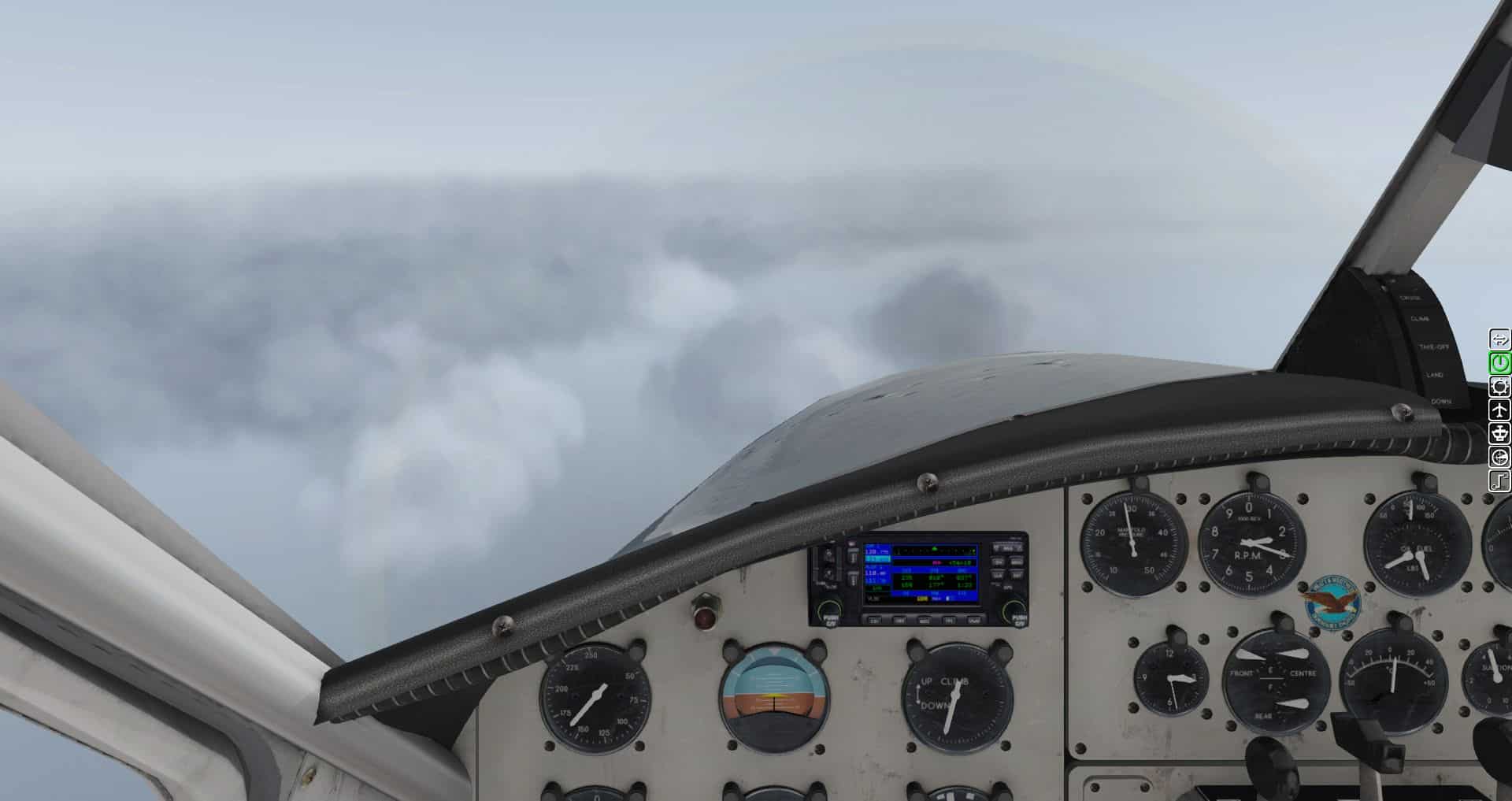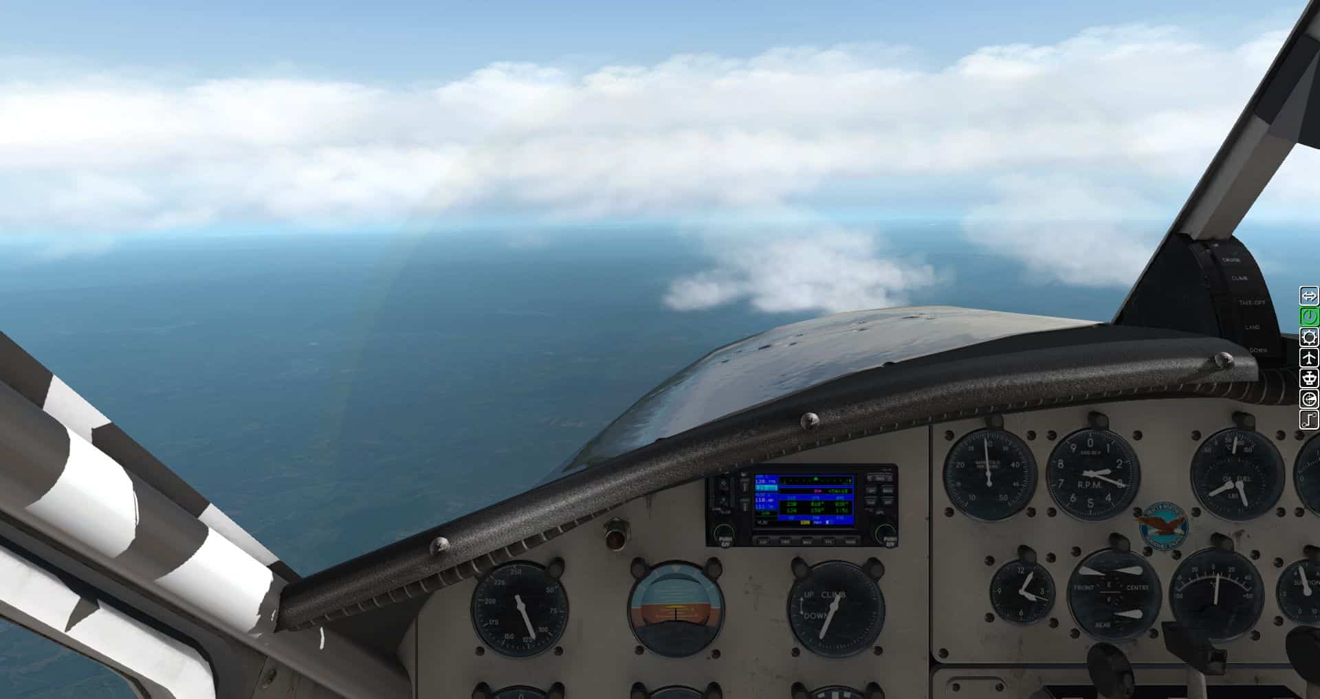 Unterhalb der Wolken kann Sky Maxx Pro in dieser Situation einfach nicht mithalten. Außerdem war es sich sehr unsicher in Bezug auf die Ausleuchtung. In den Wolken gab es allerdings wesentlich mehr Struktur. Und es gab einen weiteren wesentlichen Unterschied. Bei den Defaullt Wolken endete die Wolkendecke genau bei 10.000 Fuß, der Obergrenze des Metar Systems. In Sky Maxx Pro erreichten wir in 16.500 Fuß (Oberhalb der Dienstgipfelhöhe der Cherokee, aber das sind die Segnungen eines X-Plane 10 Flugmodelles in X-Plane 11) gerade mal die Wolkenobergrenze.