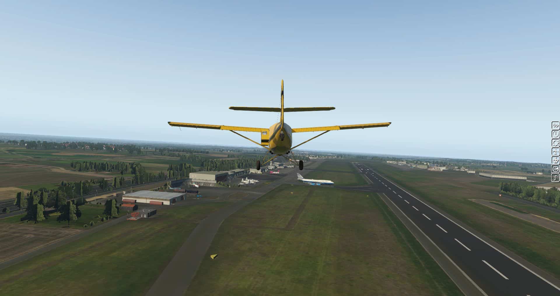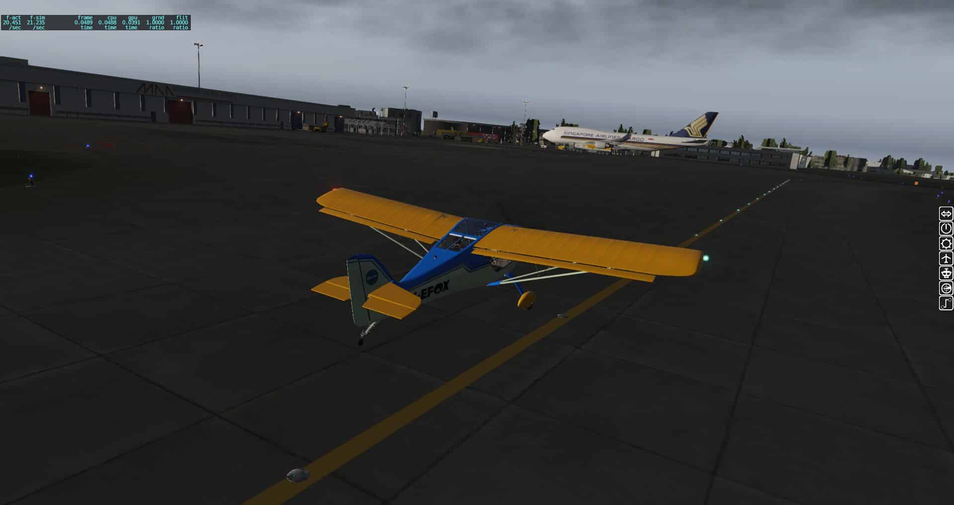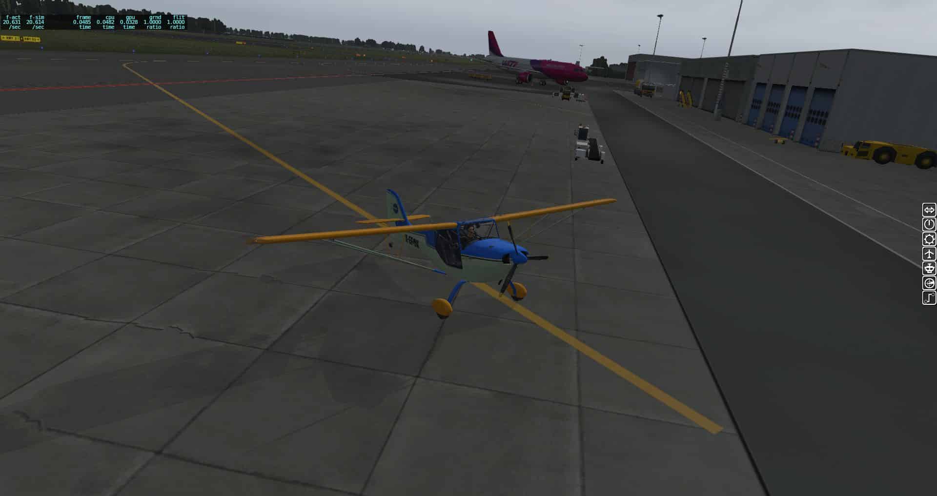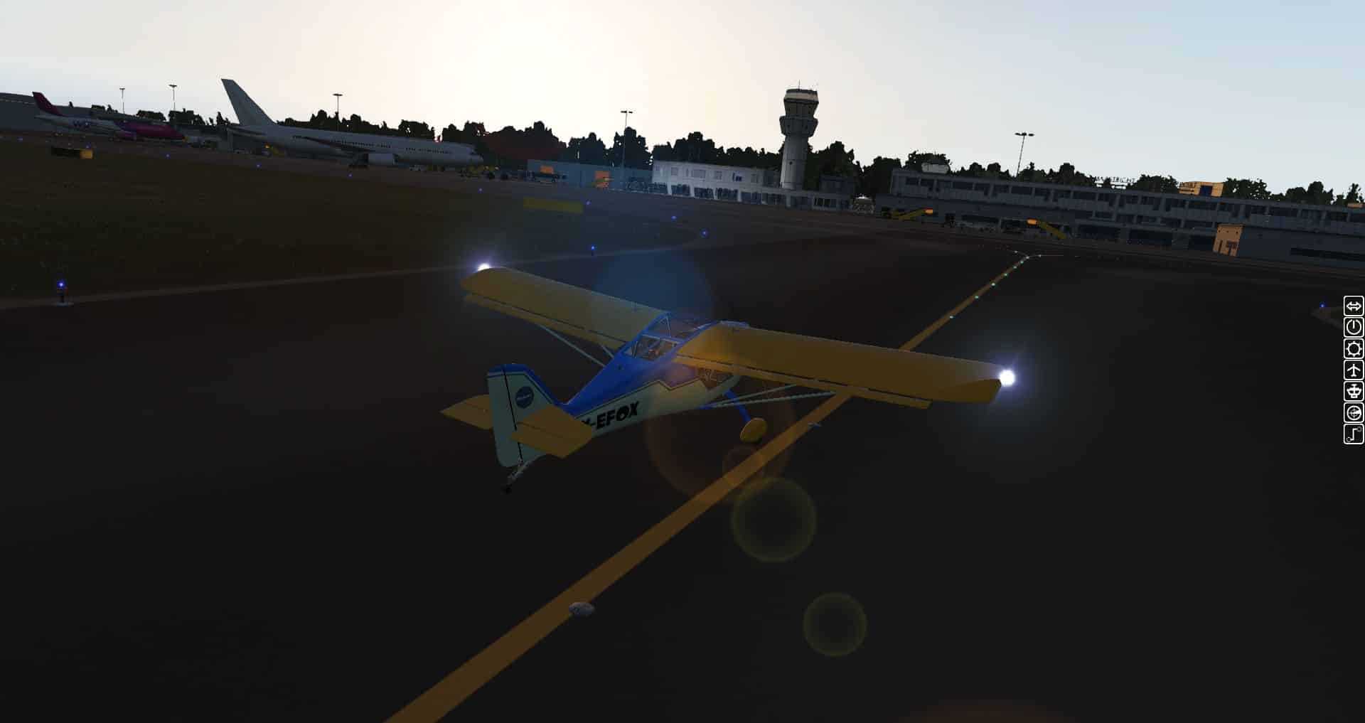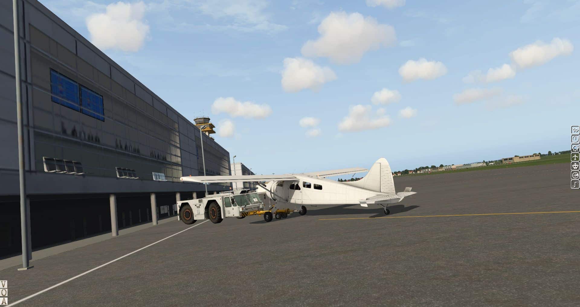 Sofort nach dem Neustart fällt auf, dass der Flugzeugschlepper nicht mehr ein statisches Modell ist, sondern auf dem Vorfeld herumfährt. Unser Flugzeug benötigt solche Unterstützung nicht. Allerdings konnte es nur vorsichtig anrollen, da die Maschine als Ultraleichtflugzeug und Taildragger in der Public Beta 14 sehr anfällig war.