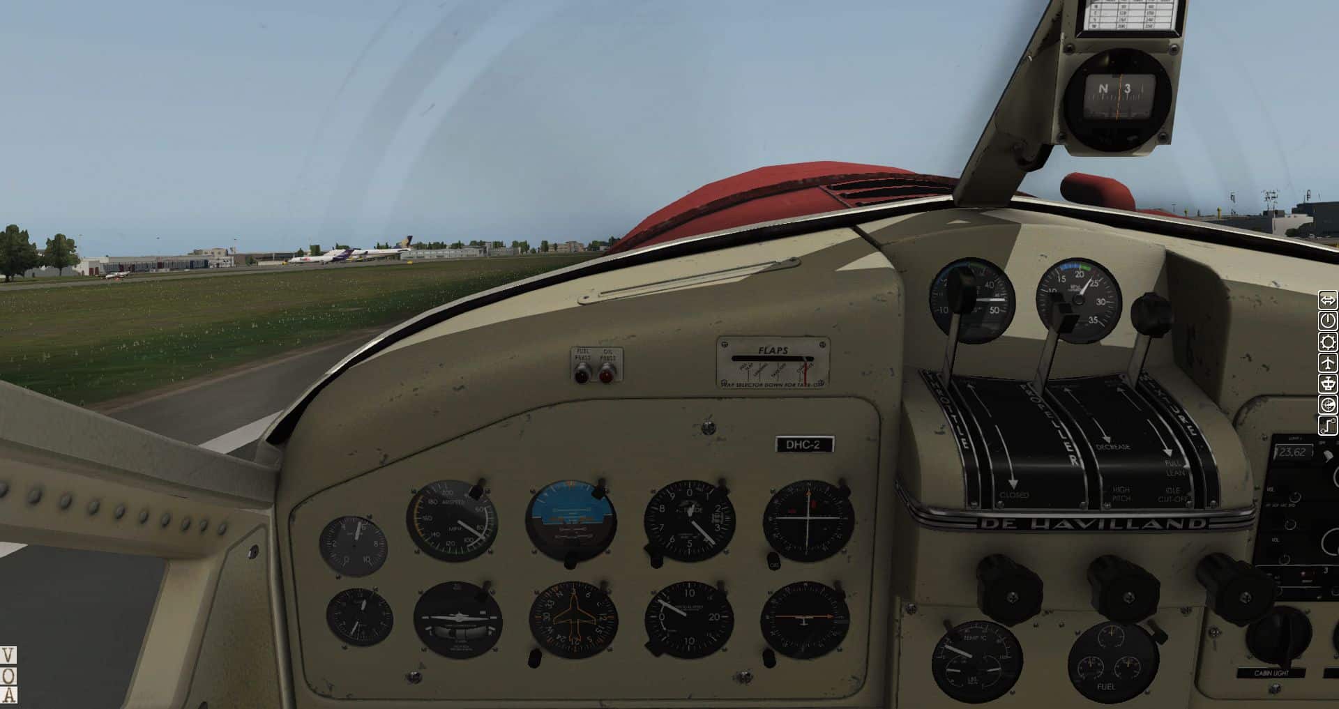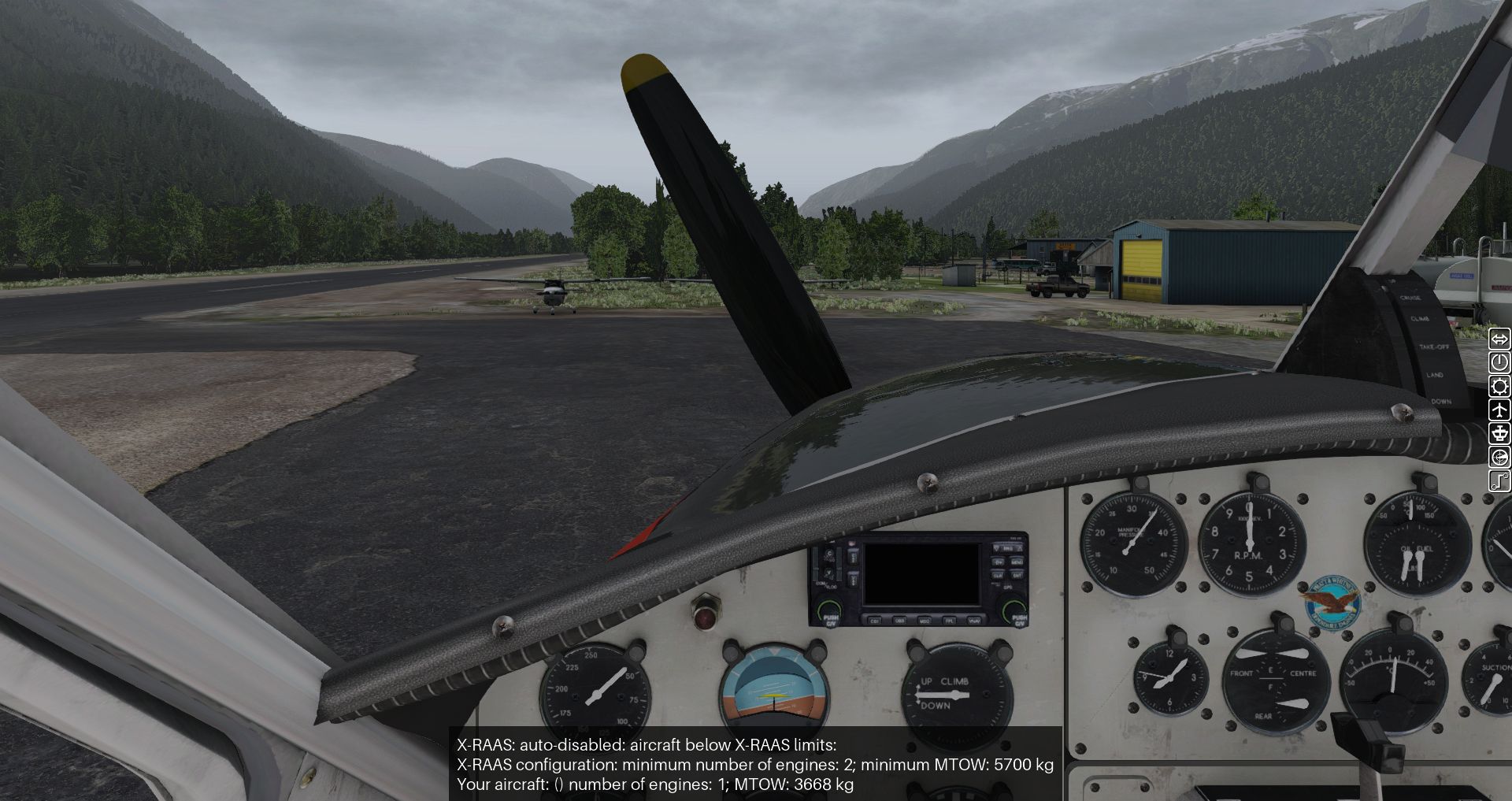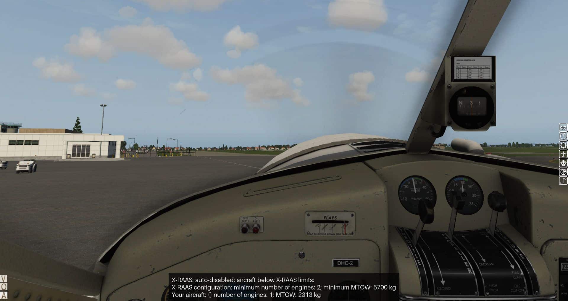 Die alte Beaver ist noch nicht an X-plane 11 angepasst, aber die Grafikengine von X-Plane 11 hat mit ihr keine Probleme. Ihr Cockpit kann immer noch voll überzeugen. Wer sich über den eingeblendeten Kommentar wundert: Dies ist X-RAAS 2 , ein Programm das in größeren Maschinen vor dem Auffahren und überqueren von Start-/Landebahnen warnt.