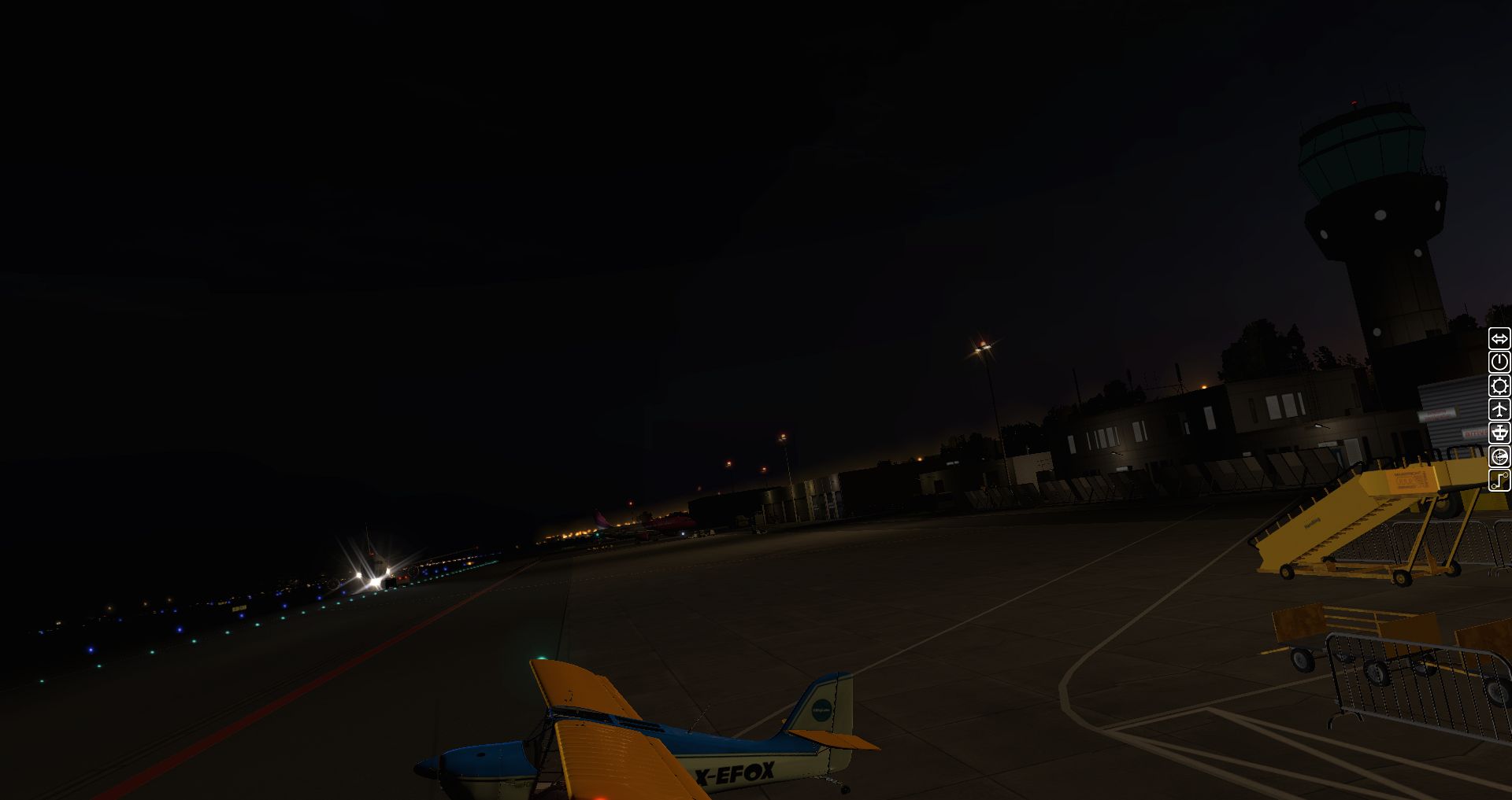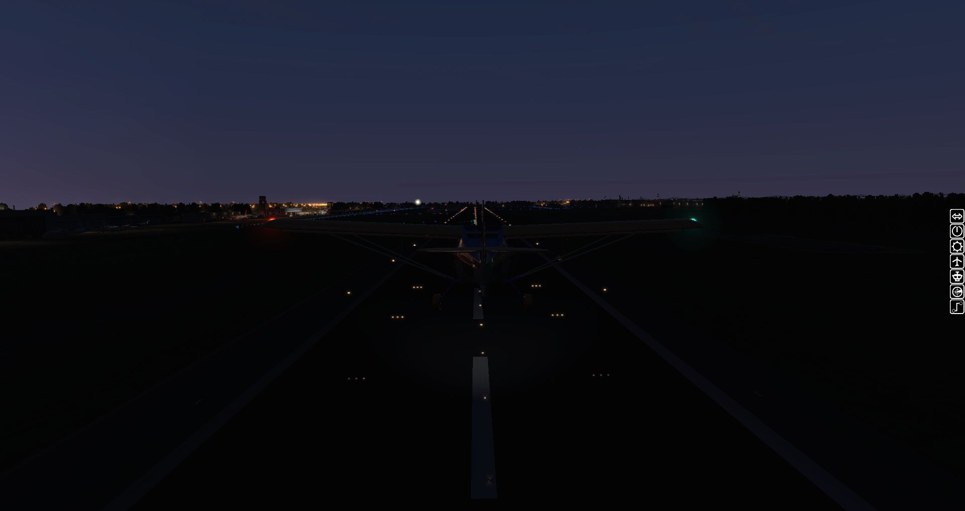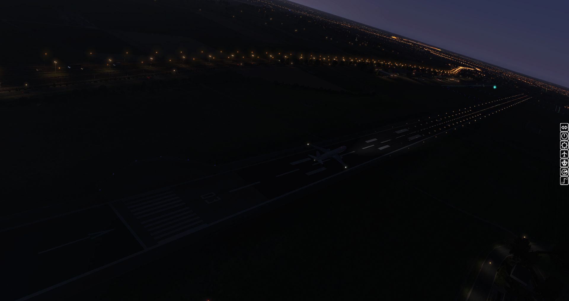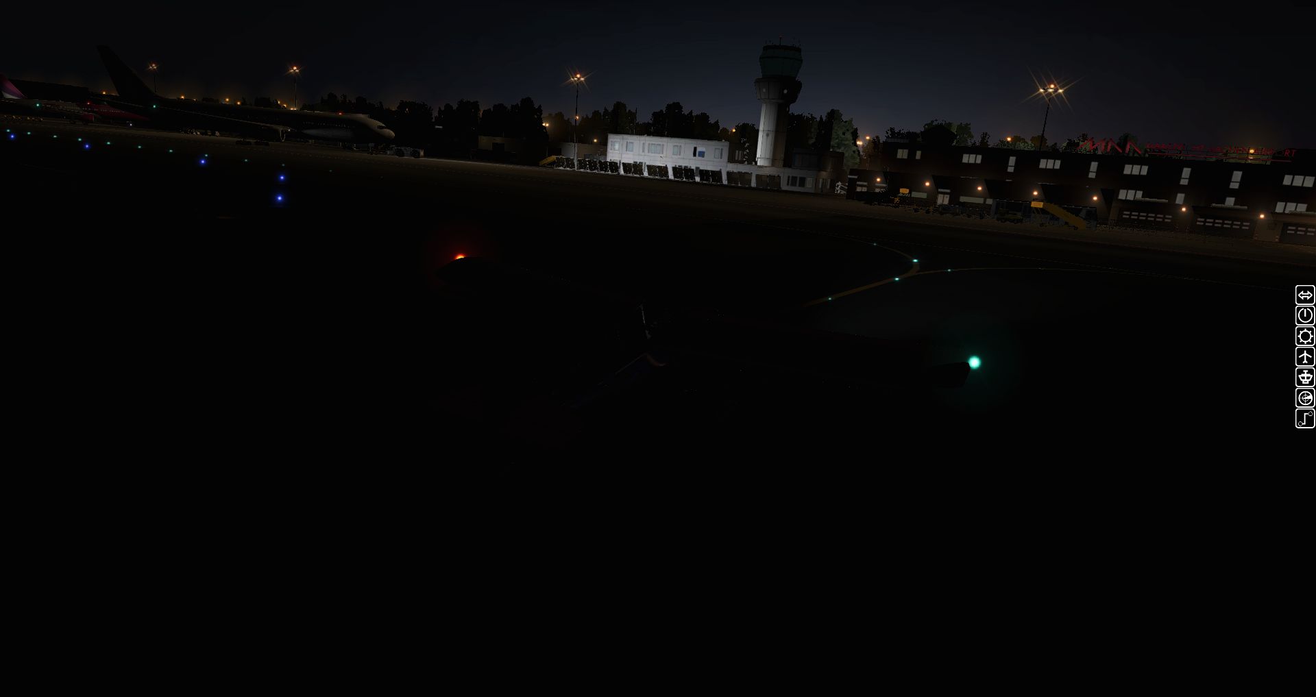 Nach einer kleinen Drehung richten wir uns wieder auf die Landebahn und die Wartungshangars aus. Wieder zeigt sich die Nachtbeleuchtung von ihrer besten Seite.