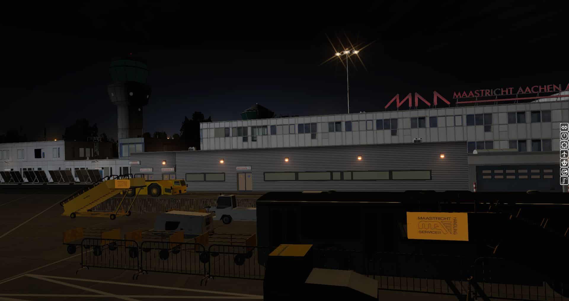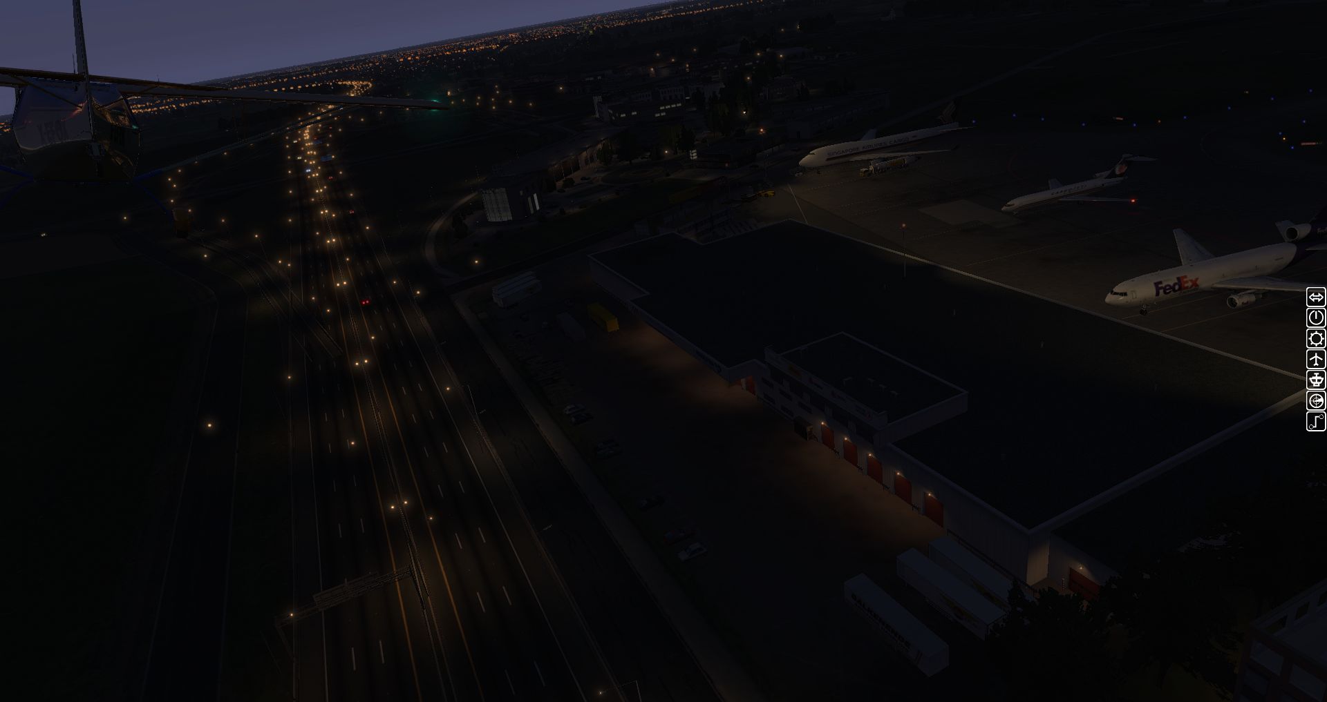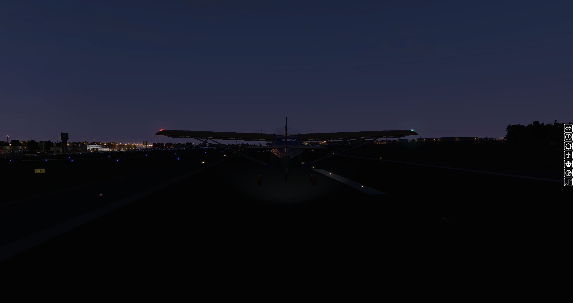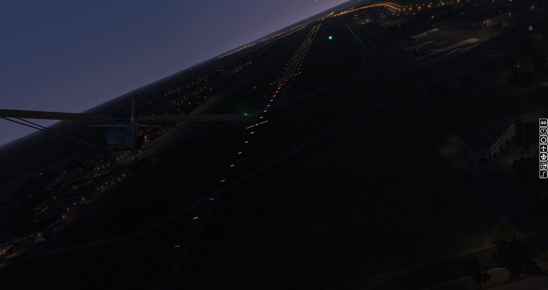 Nach einer kleinen Drehung richten wir uns wieder auf die Landebahn und die Wartungshangars aus. Wieder zeigt sich die Nachtbeleuchtung von ihrer besten Seite.