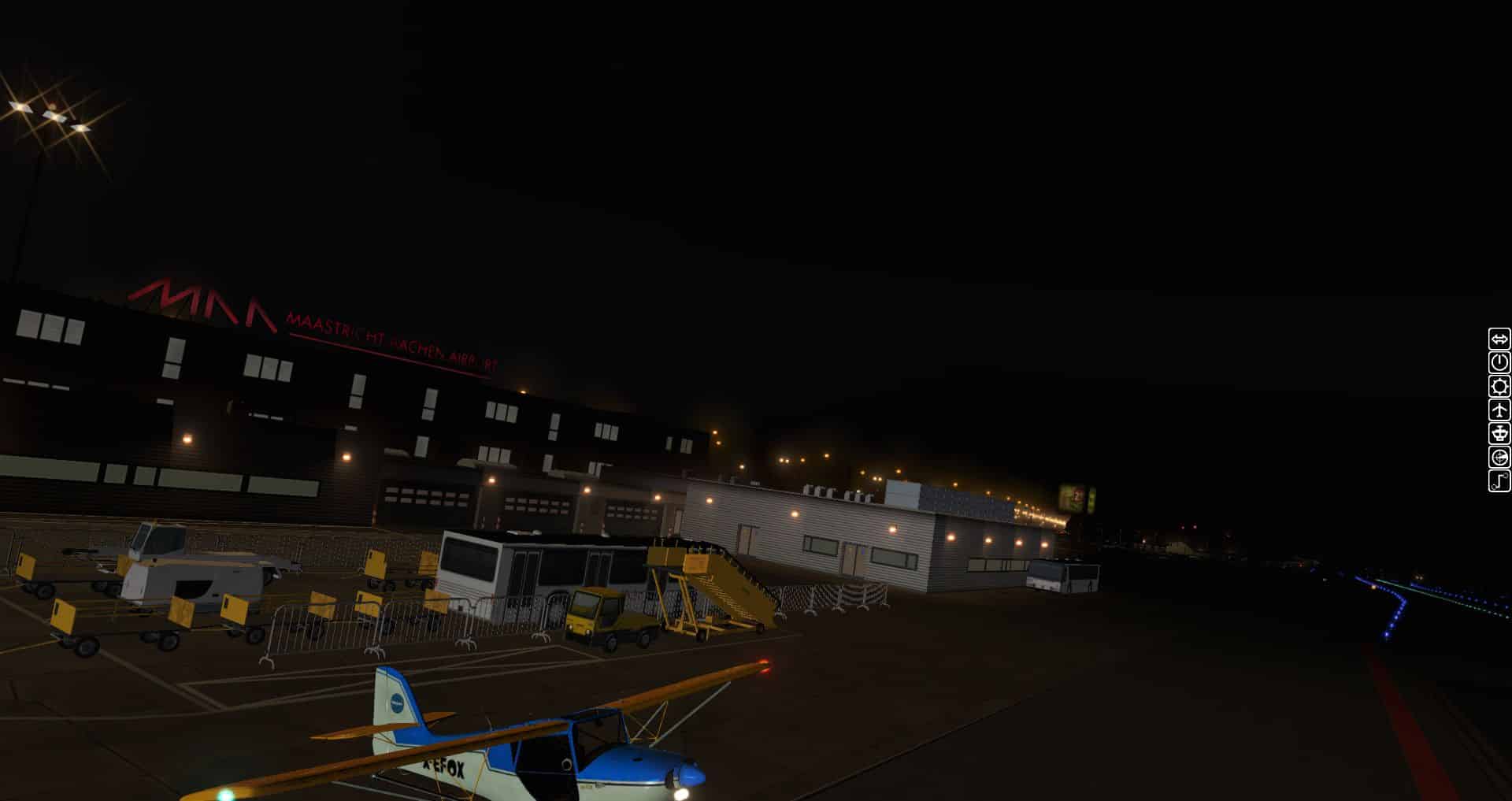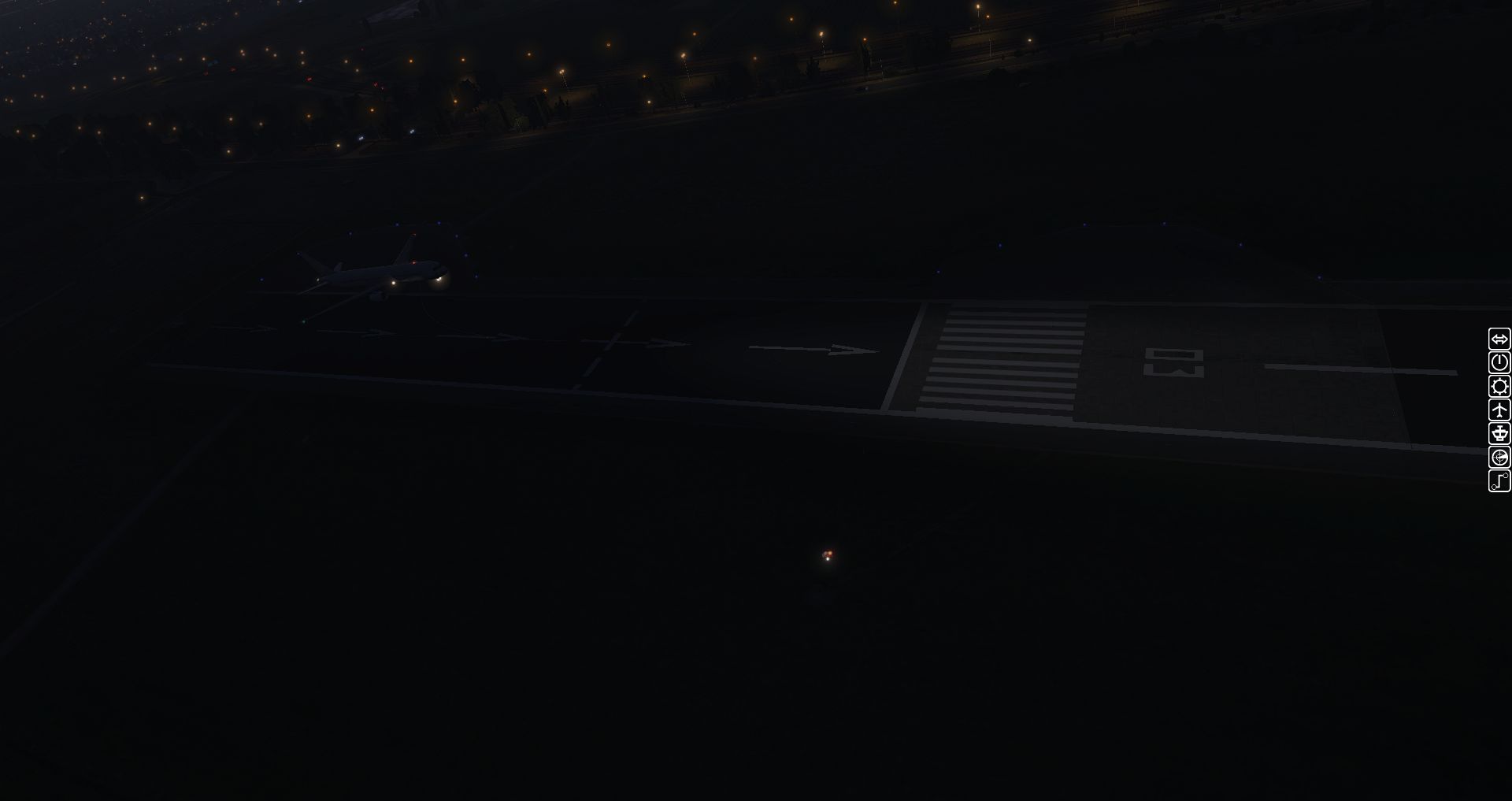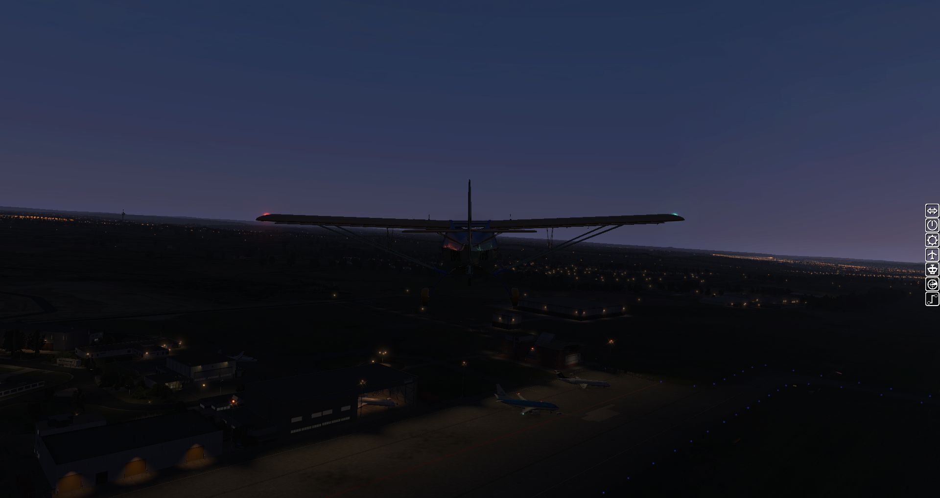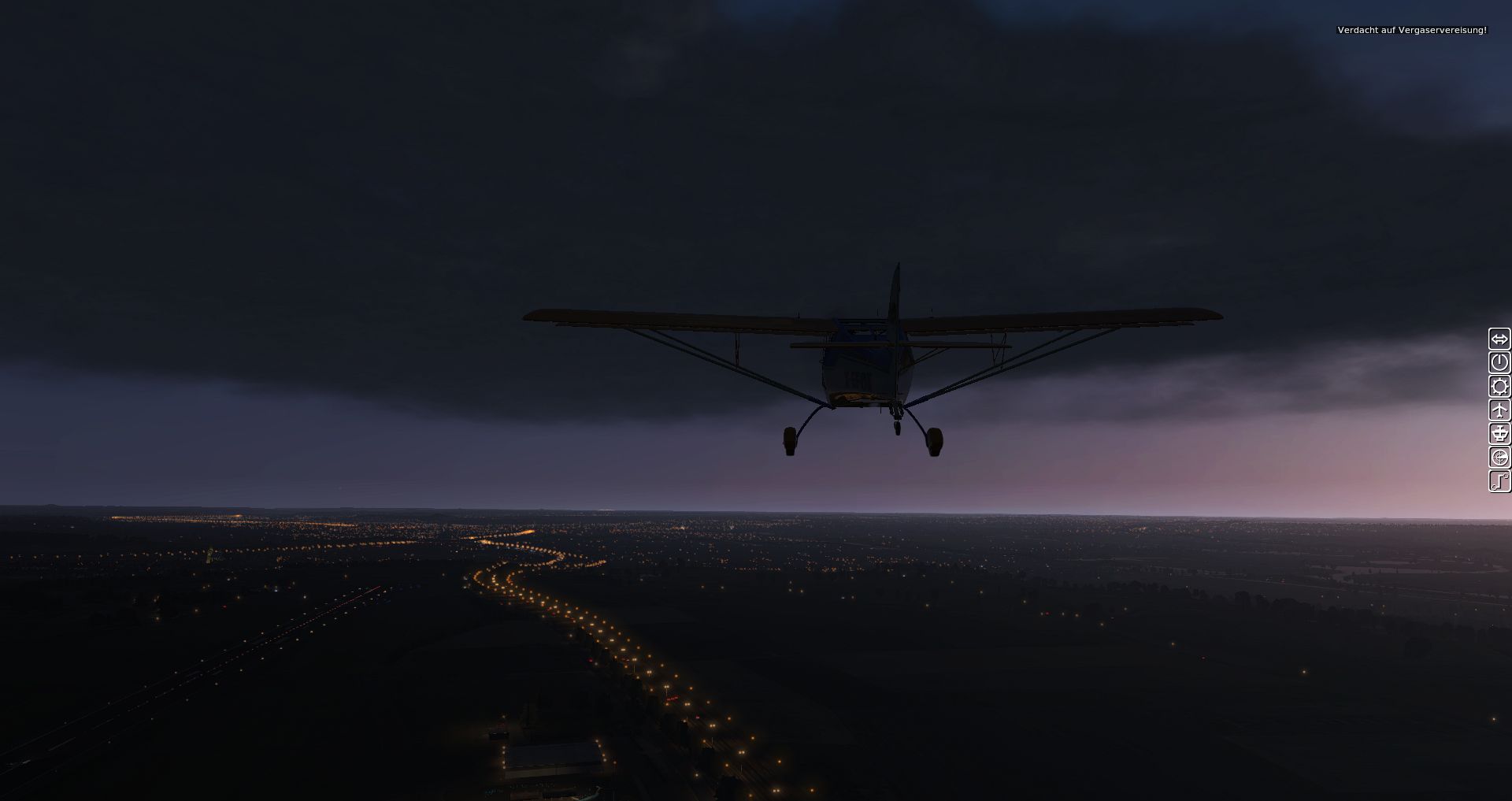 Nach einer kleinen Drehung richten wir uns wieder auf die Landebahn und die Wartungshangars aus. Wieder zeigt sich die Nachtbeleuchtung von ihrer besten Seite.