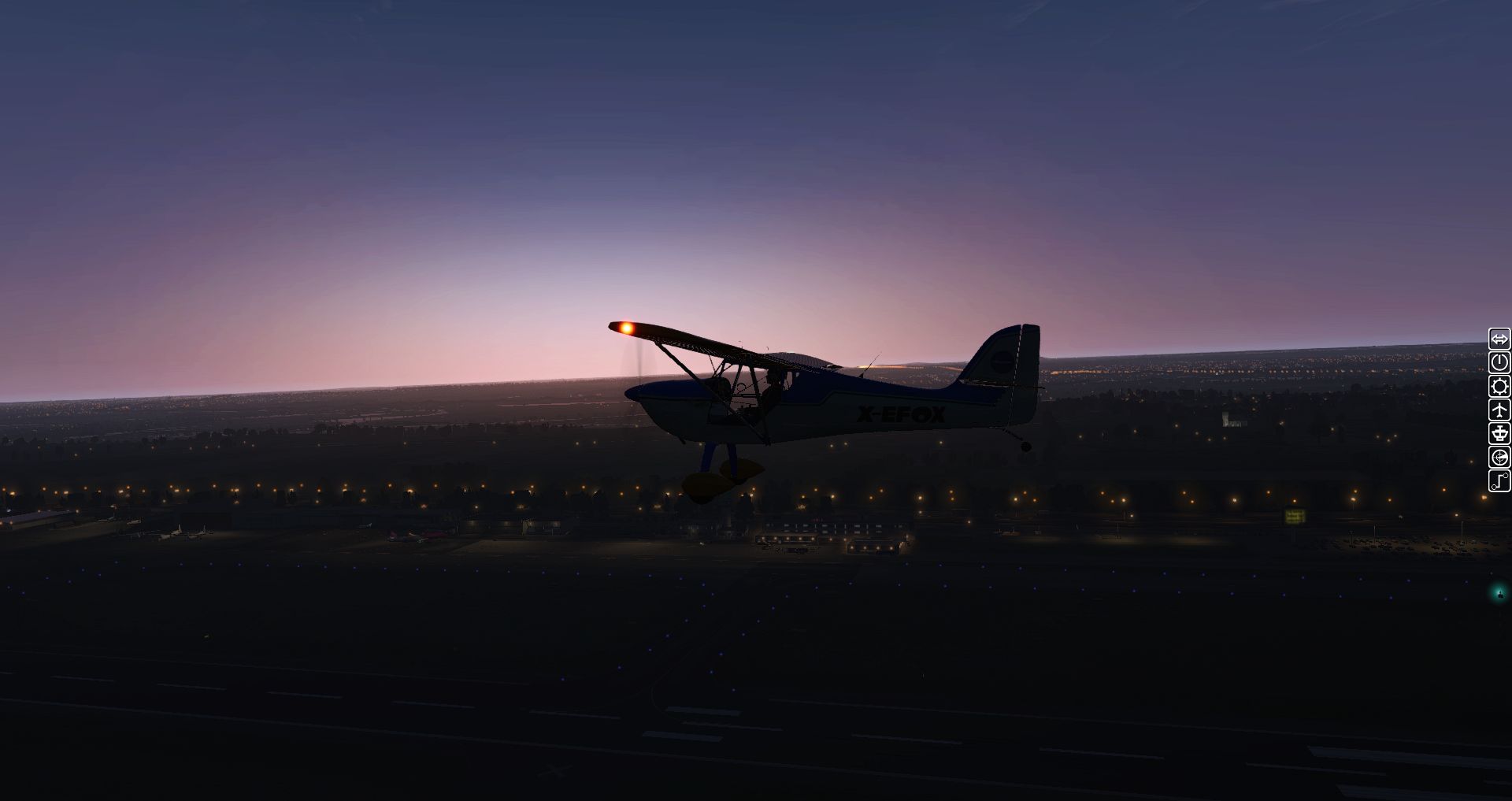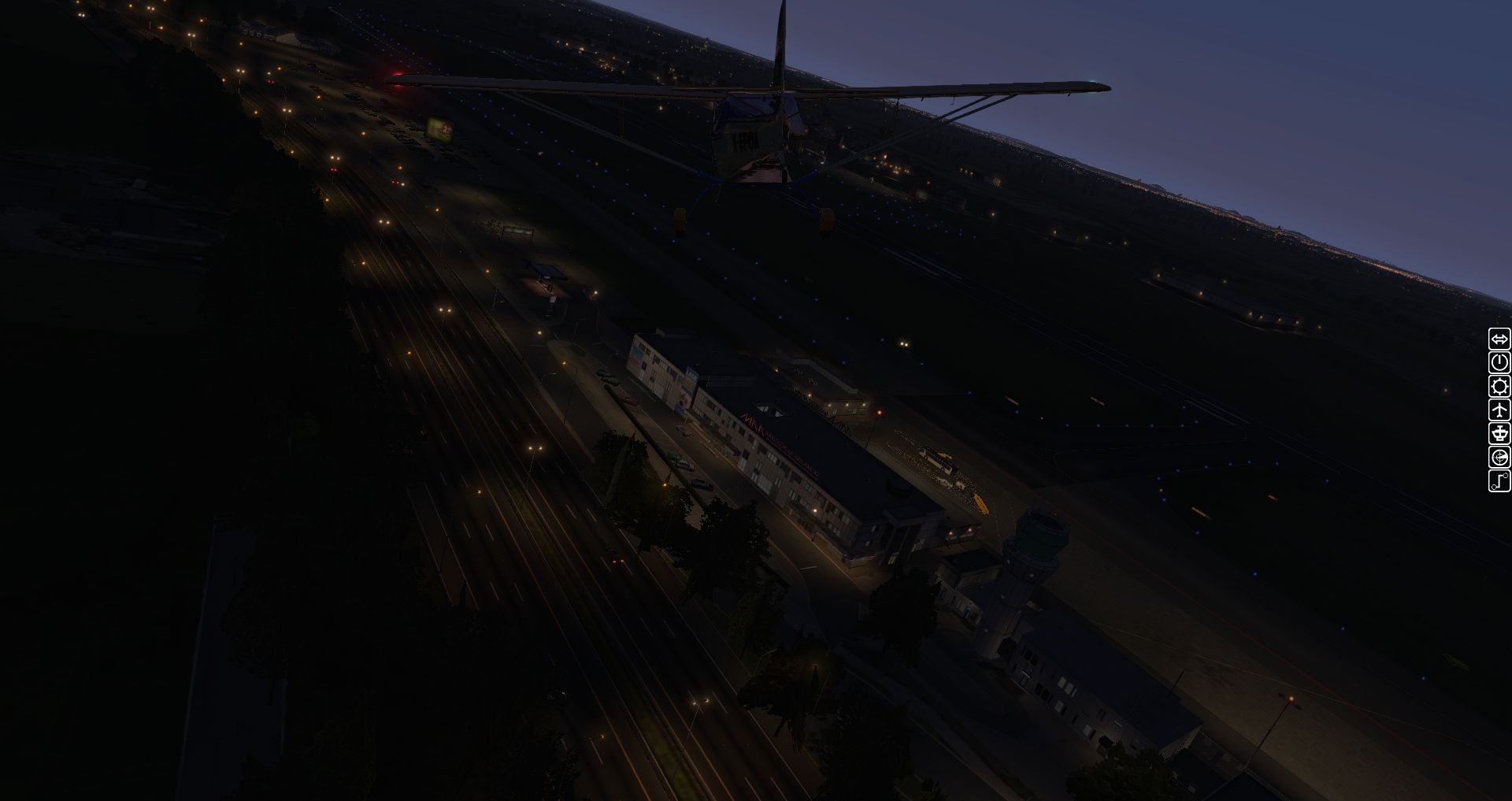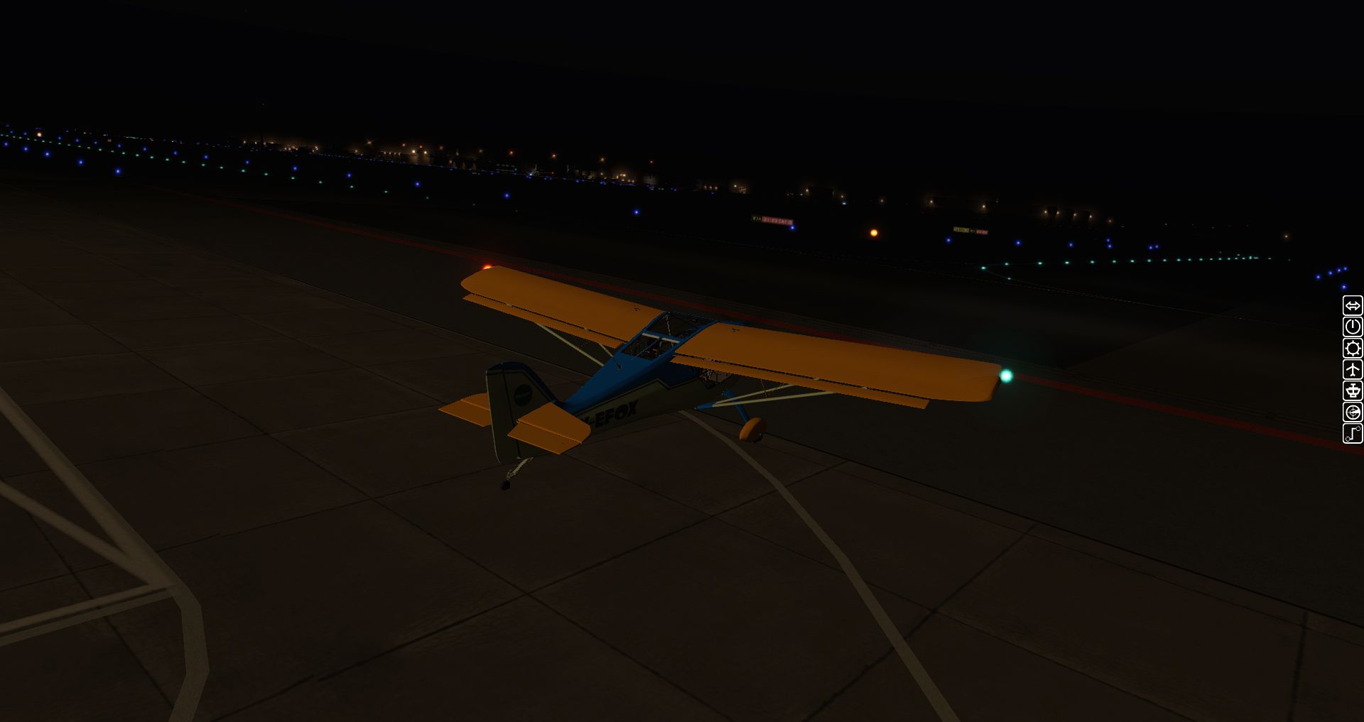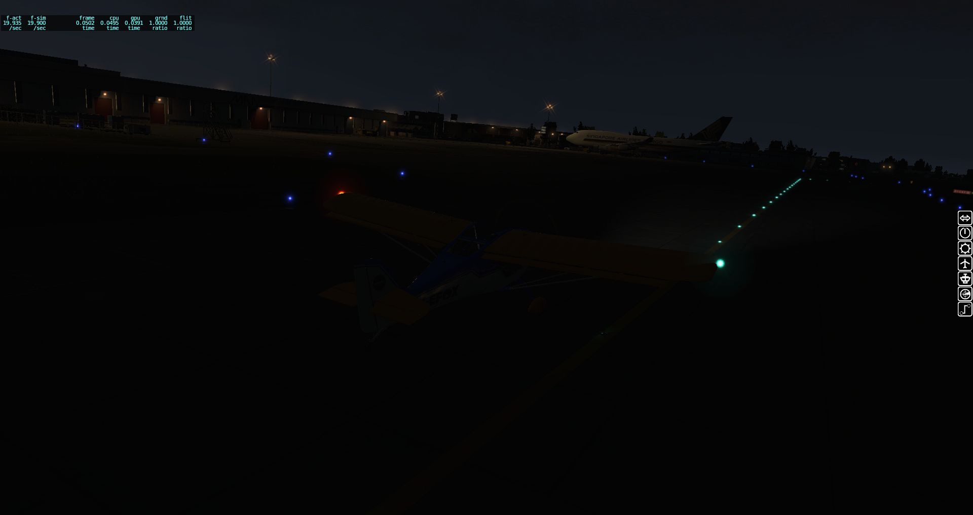 Nach einer kleinen Drehung richten wir uns wieder auf die Landebahn und die Wartungshangars aus. Wieder zeigt sich die Nachtbeleuchtung von ihrer besten Seite.