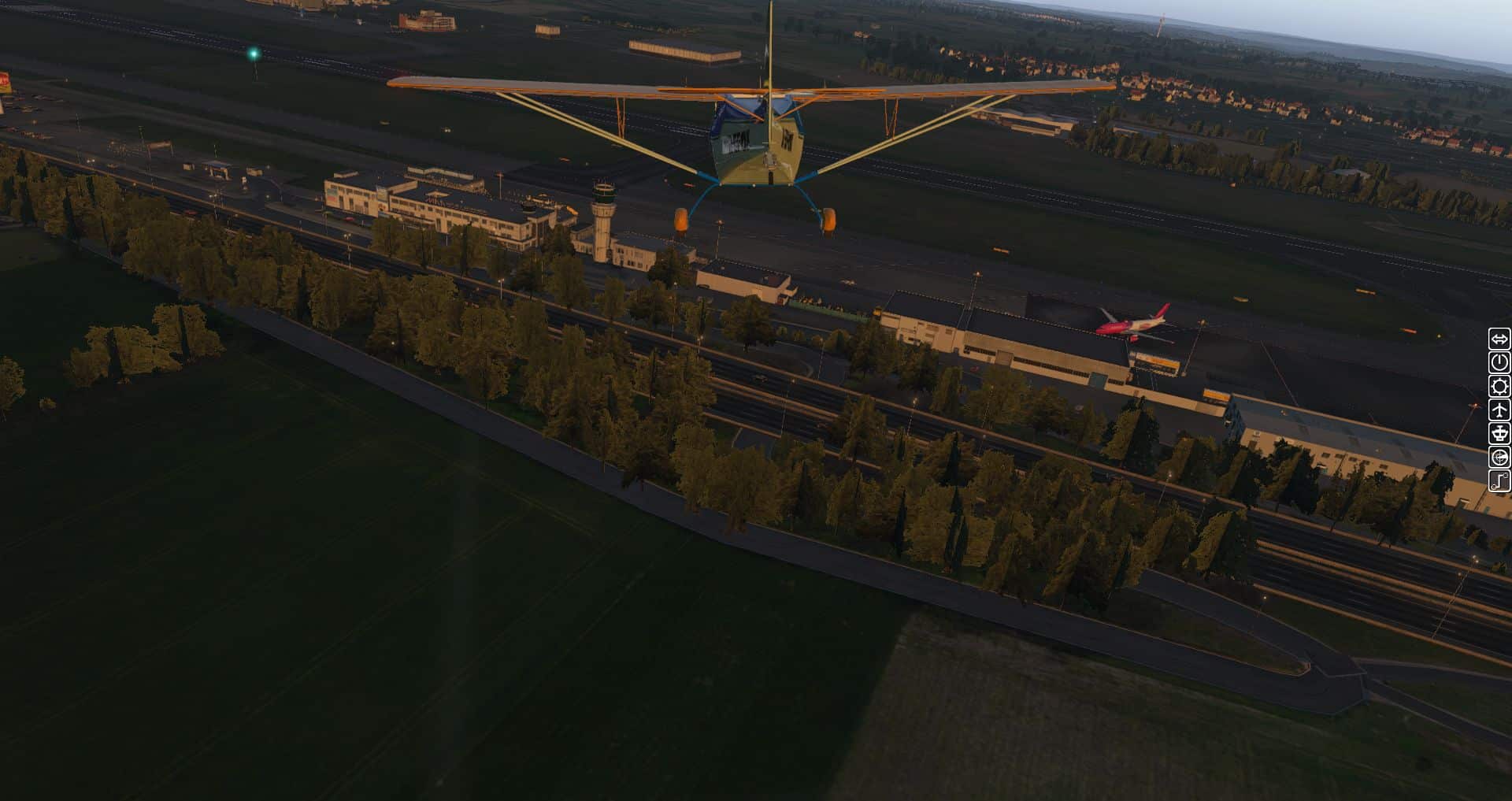 X-Plane tauscht schnell, während des Flugs die Lackierung aus. Auch die Einbettung des Flughafens in das umgebende Gelände mit seinen Landclass Texturen geht in Ordnung, könnte jedoch auf Seite der Häuser besser sein.