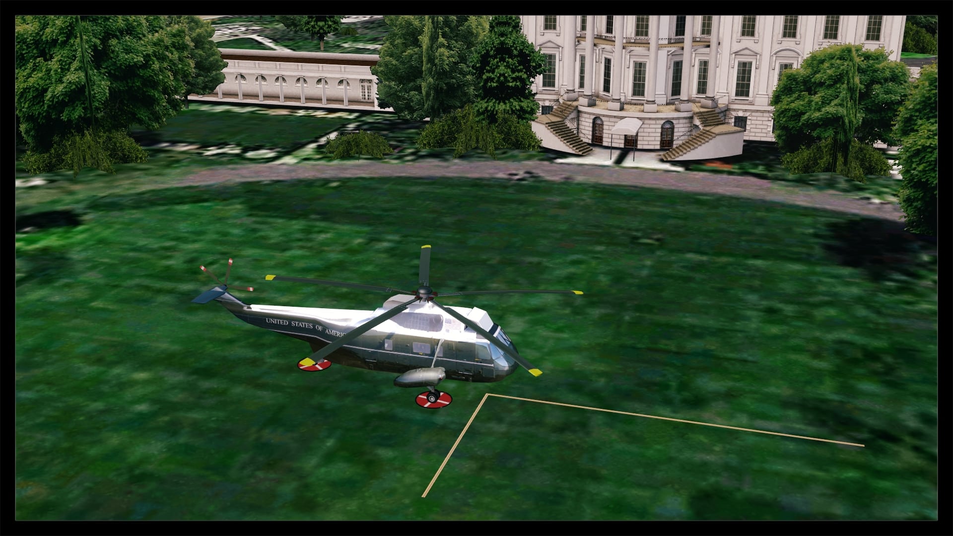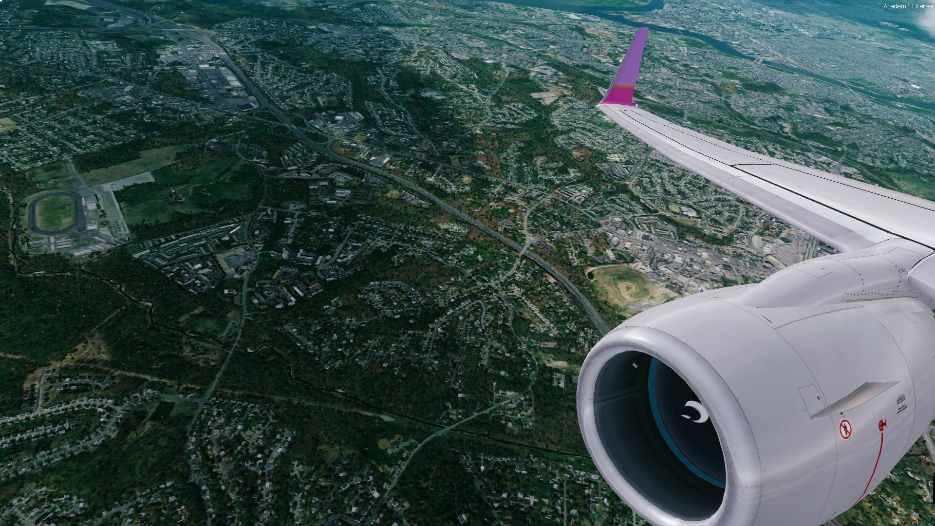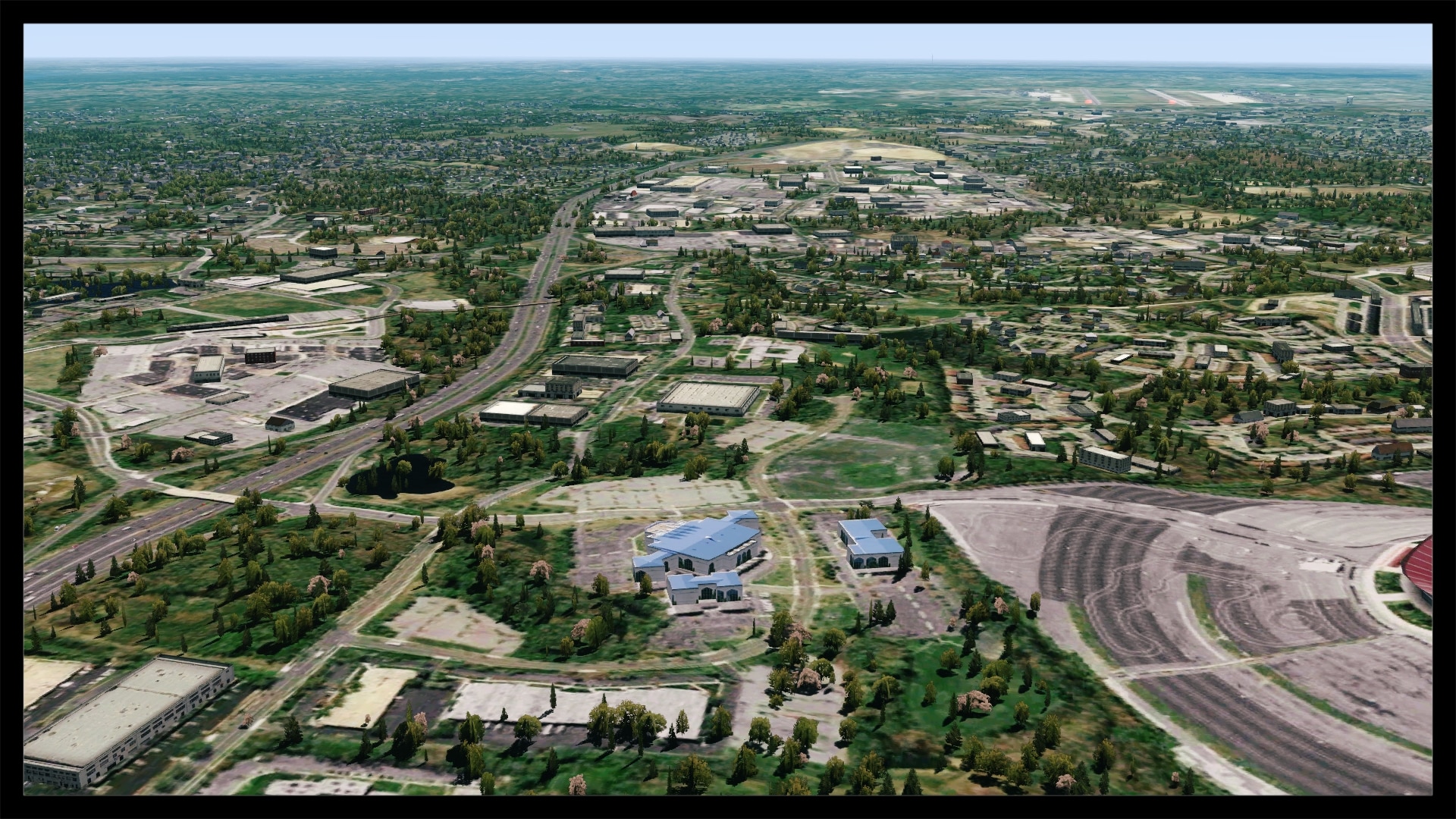 Auf dem Weg zum Air Force One Flugplatz, denn diese ist auf der Joint Base Andrews stationiert, überqueren wir die ersten Vororte. Die Bebauung und Anordnung stimmt nach Vergleichen mit Google Earth Bildern überein. Daher sei hier angemerkt, dass unter manchen Bildern die Koordinaten stehen, so kann man das selber nachvollziehen. Das Einbinden von Google Earth Aufnahmen ist leider nicht möglich. Beim Anflug auf Andrews erkennt man auch den vorgelagerten Golfplatz. Alles in allem wirkt die Positionierung der Autogen Gebäude sehr genau, nur der Untergrund mag nicht unbedingt so richtig gefallen, ist die Auflösung doch relativ niedrig.