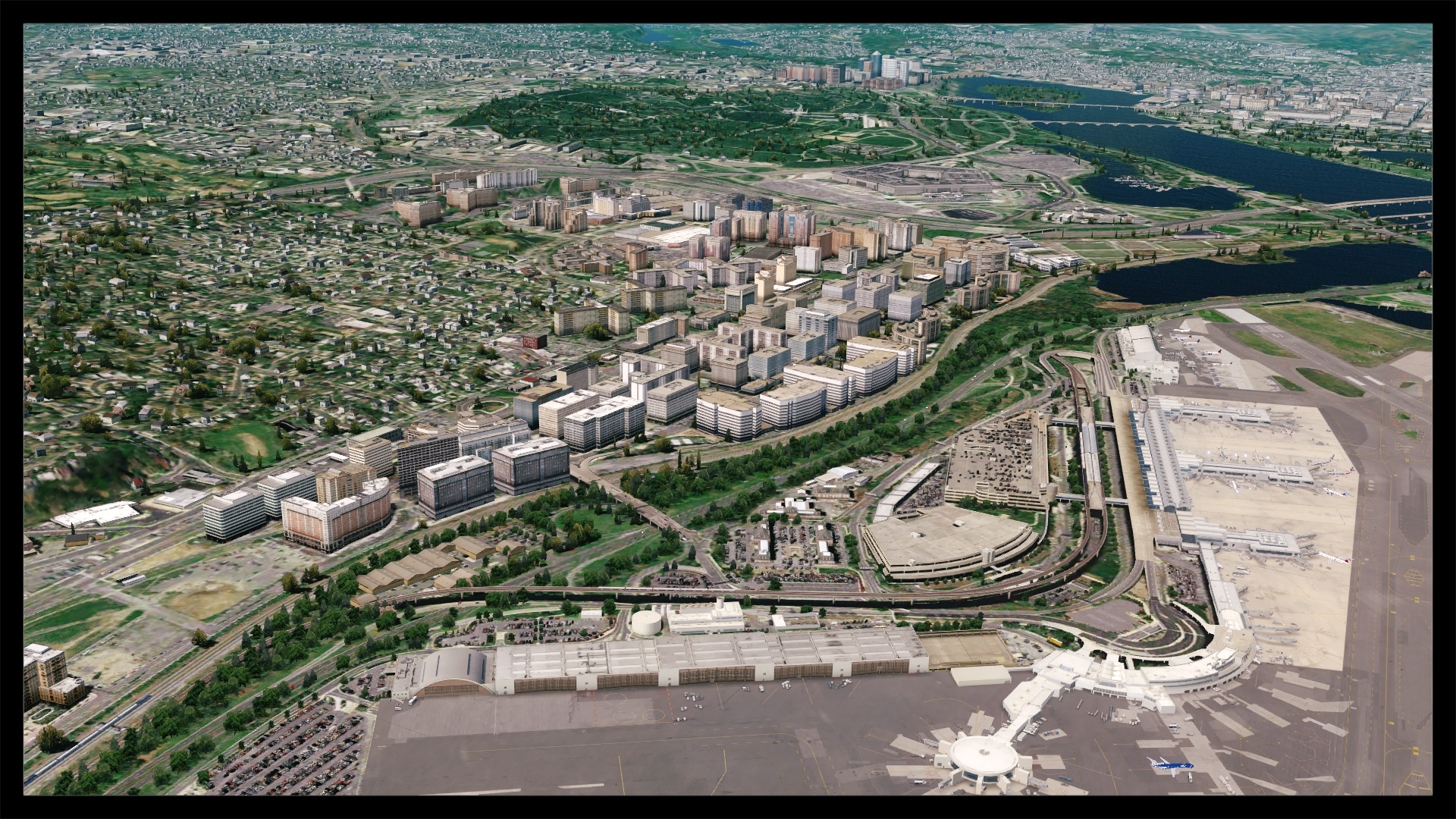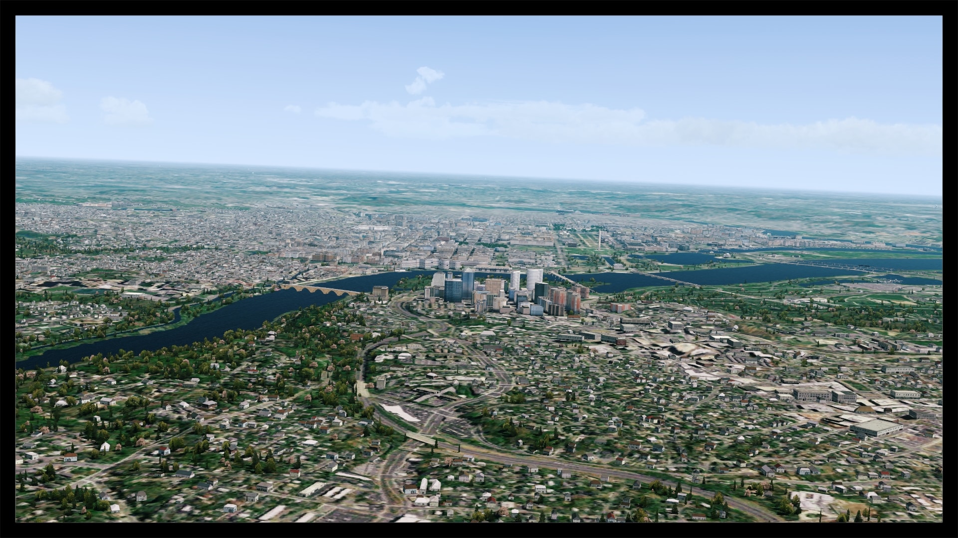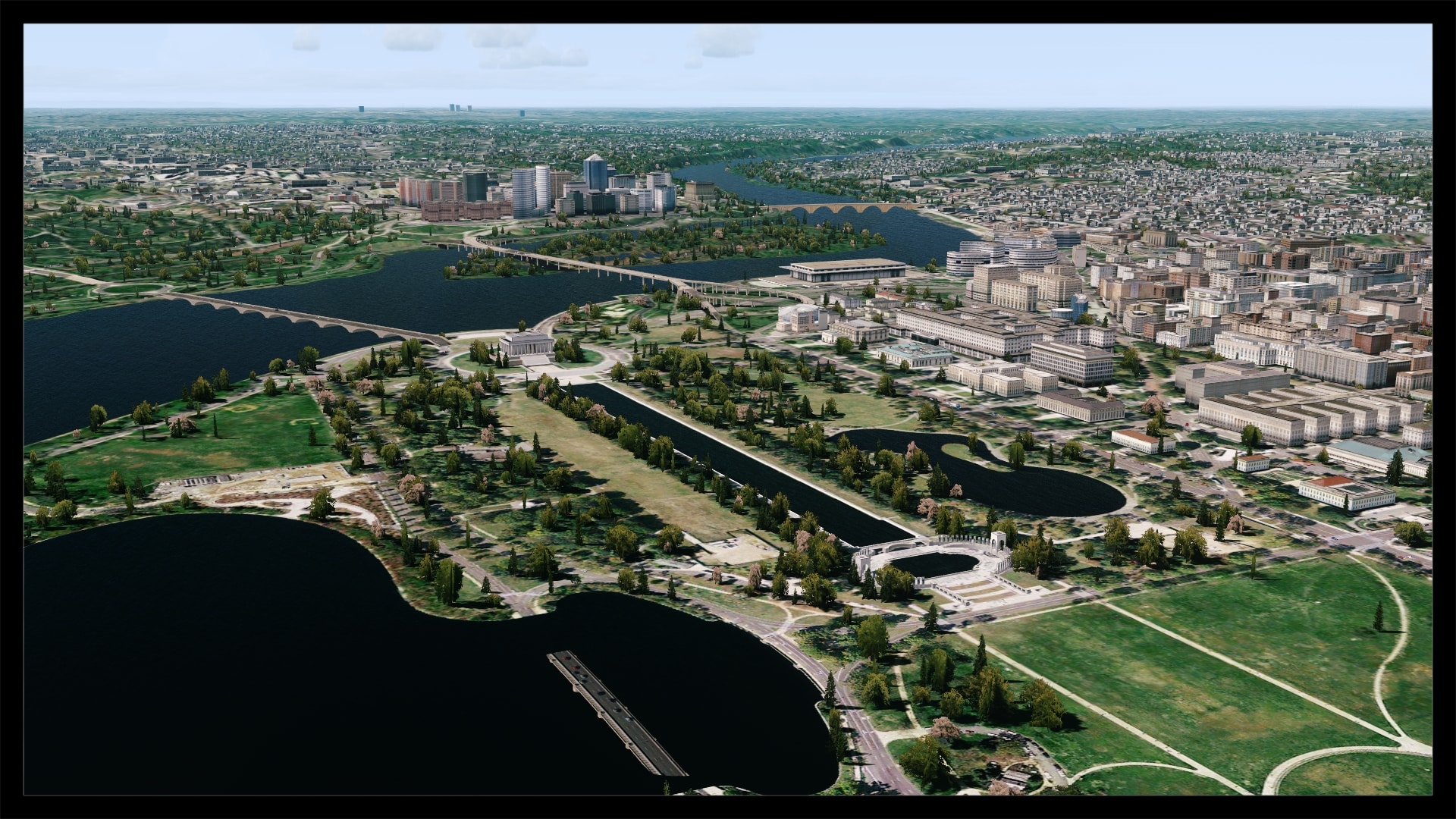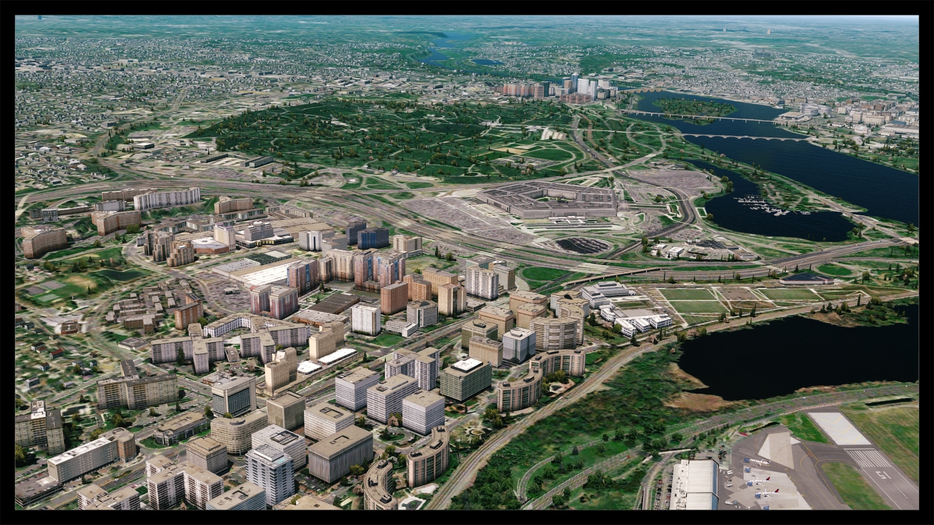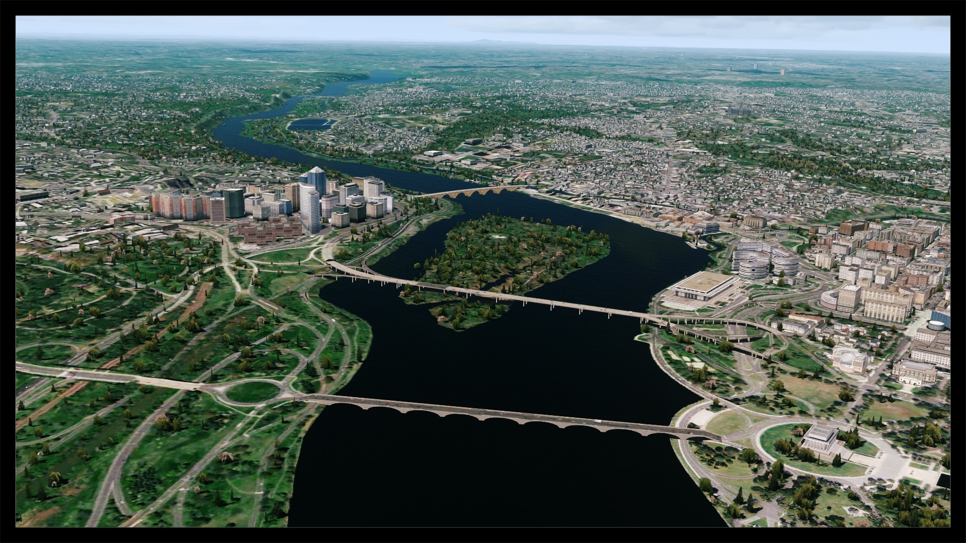 Beim Überqueren des Ronald Reagan Airports, so der Beiname, stellen wir eine höher aufgelöste Bodentextur fest, welche sich über den ganzen Innenstadtbereich zieht. Die Wohn- und Geschäftshäuser sind sauber erstellt und ebenso präzise platziert.