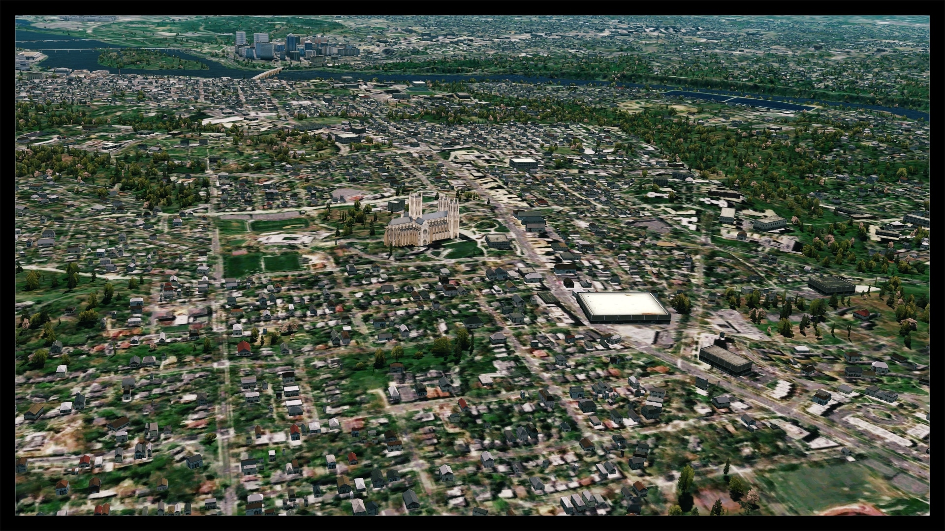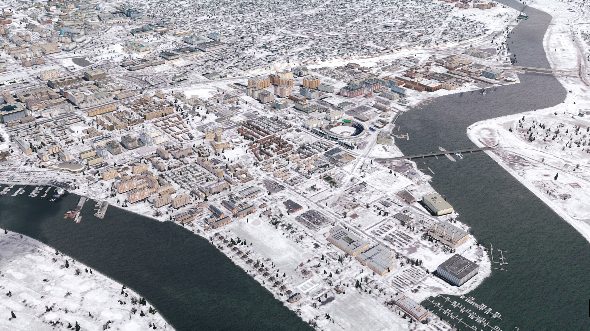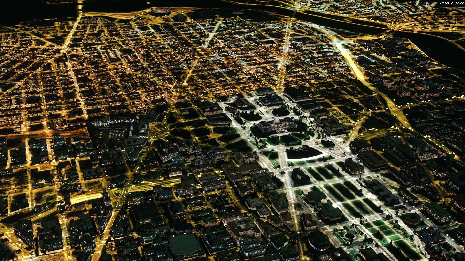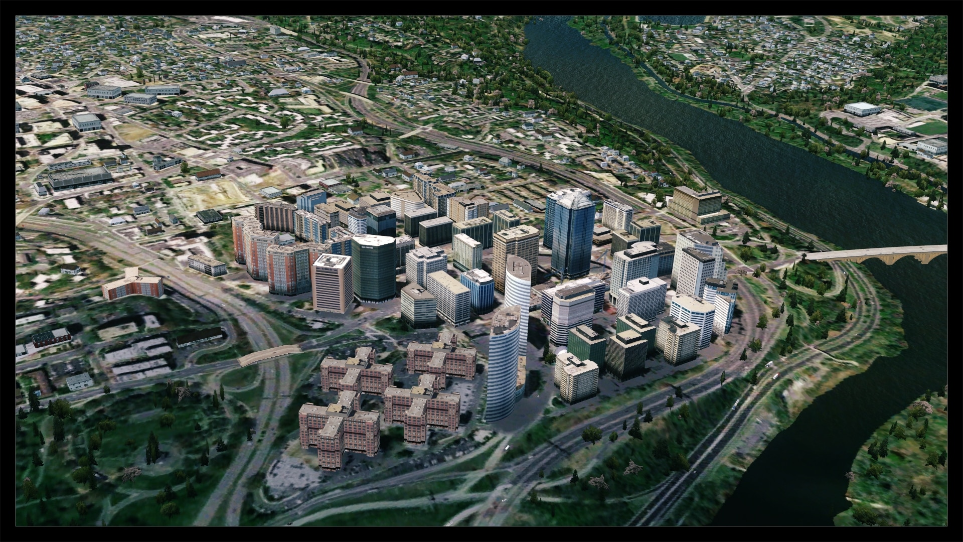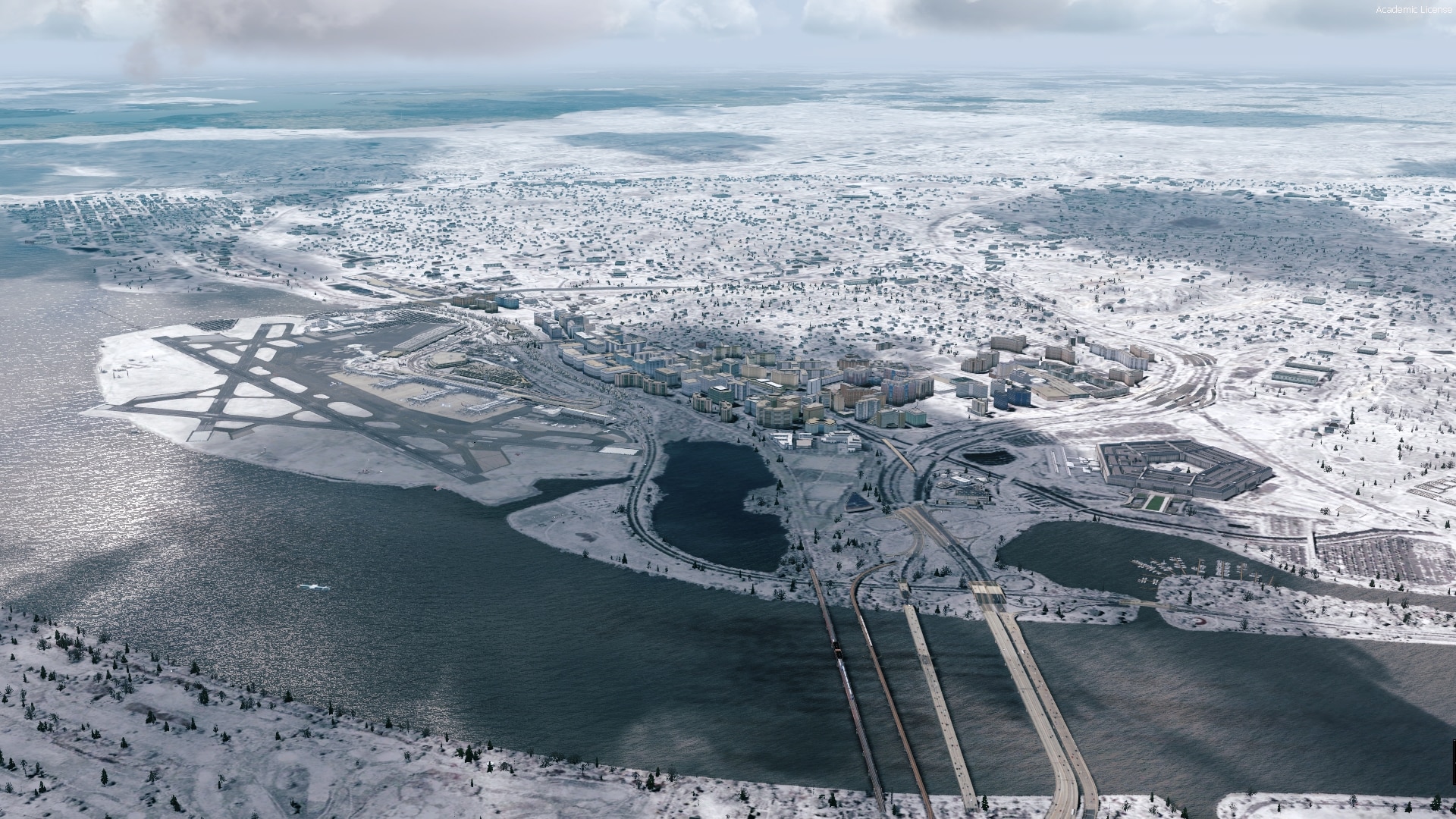 Beim Überqueren des Ronald Reagan Airports, so der Beiname, stellen wir eine höher aufgelöste Bodentextur fest, welche sich über den ganzen Innenstadtbereich zieht. Die Wohn- und Geschäftshäuser sind sauber erstellt und ebenso präzise platziert.