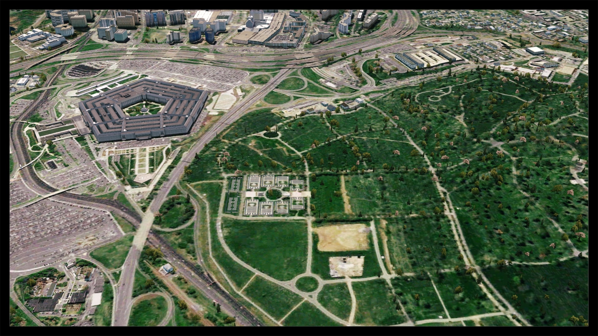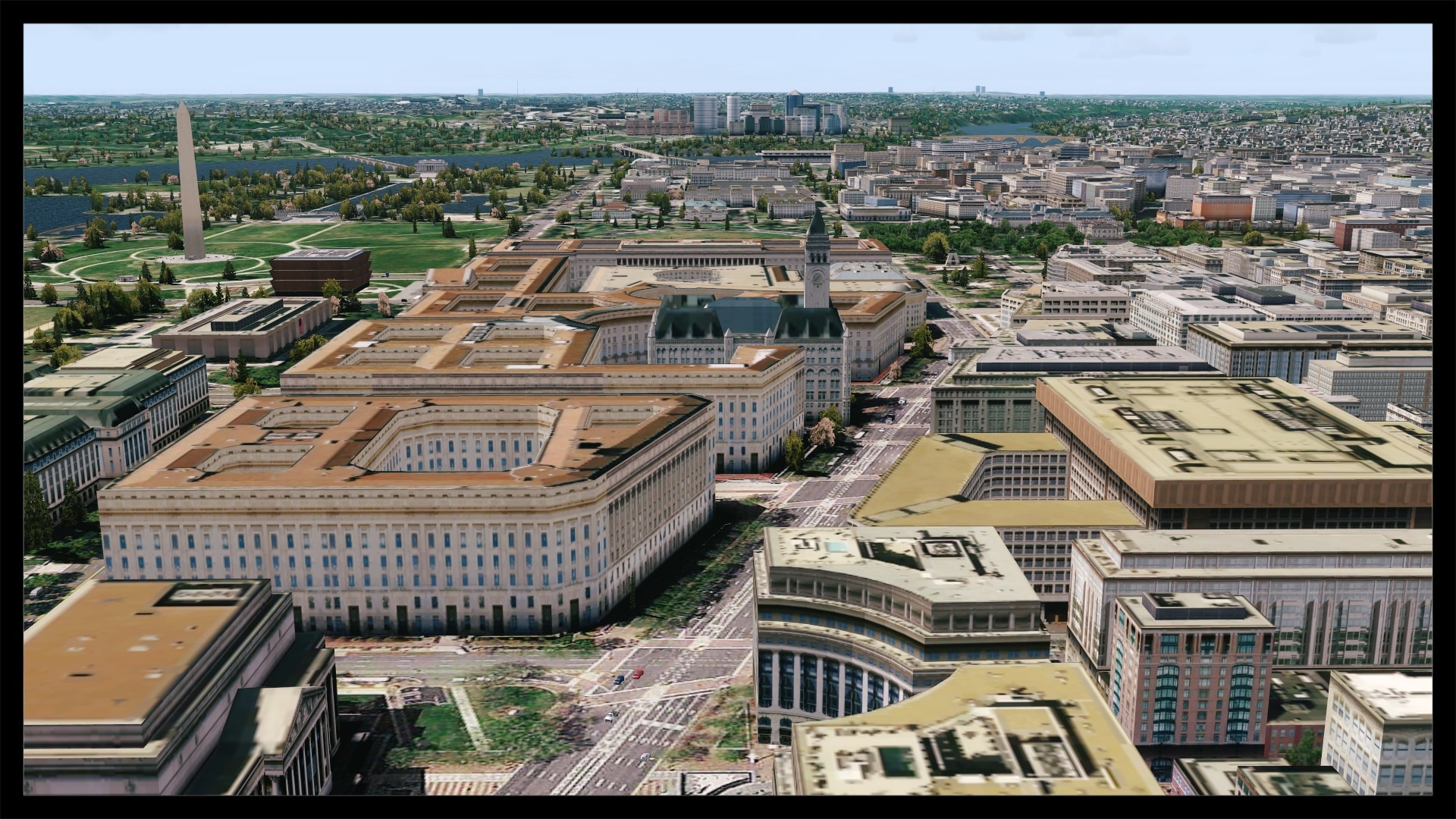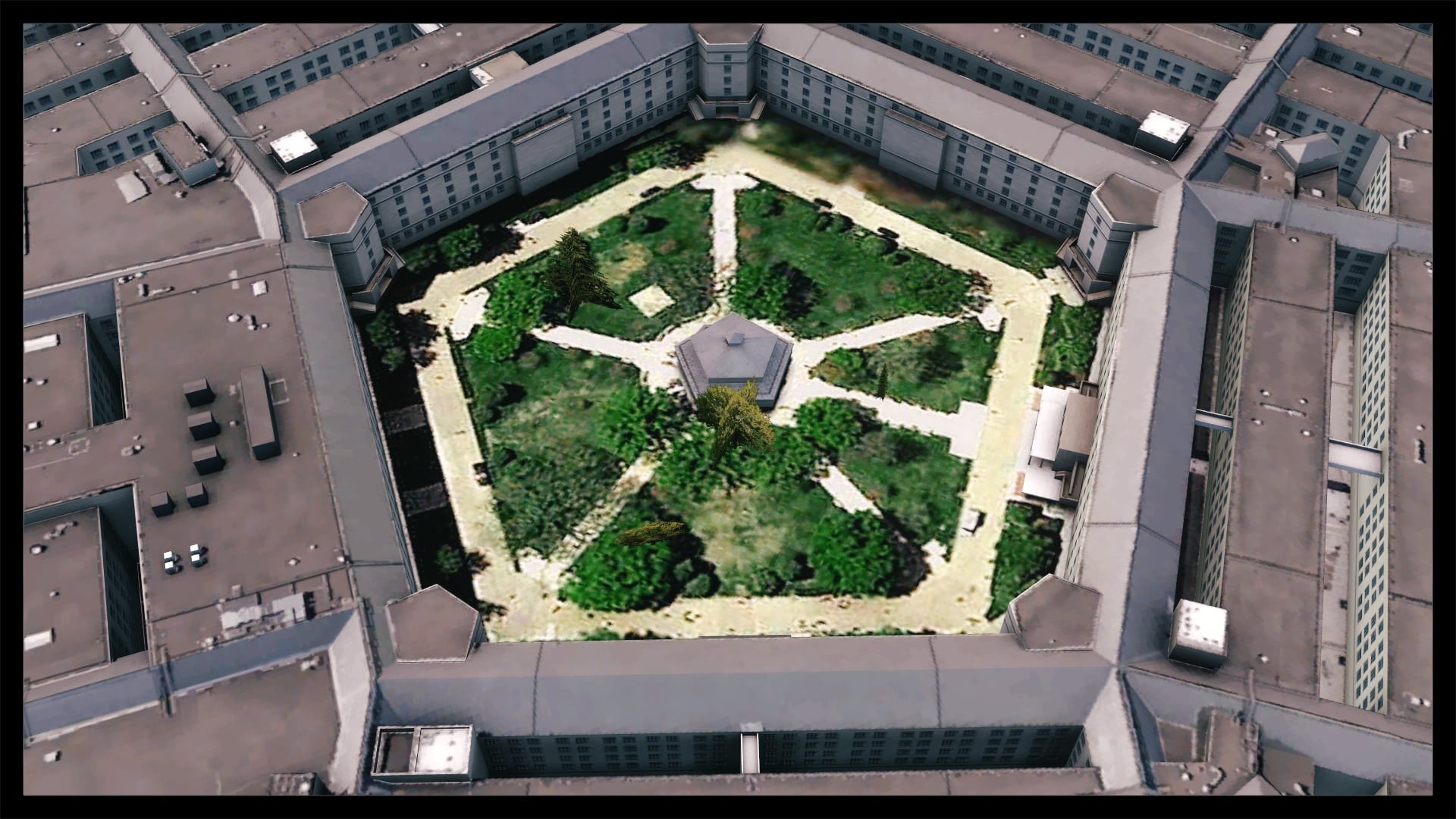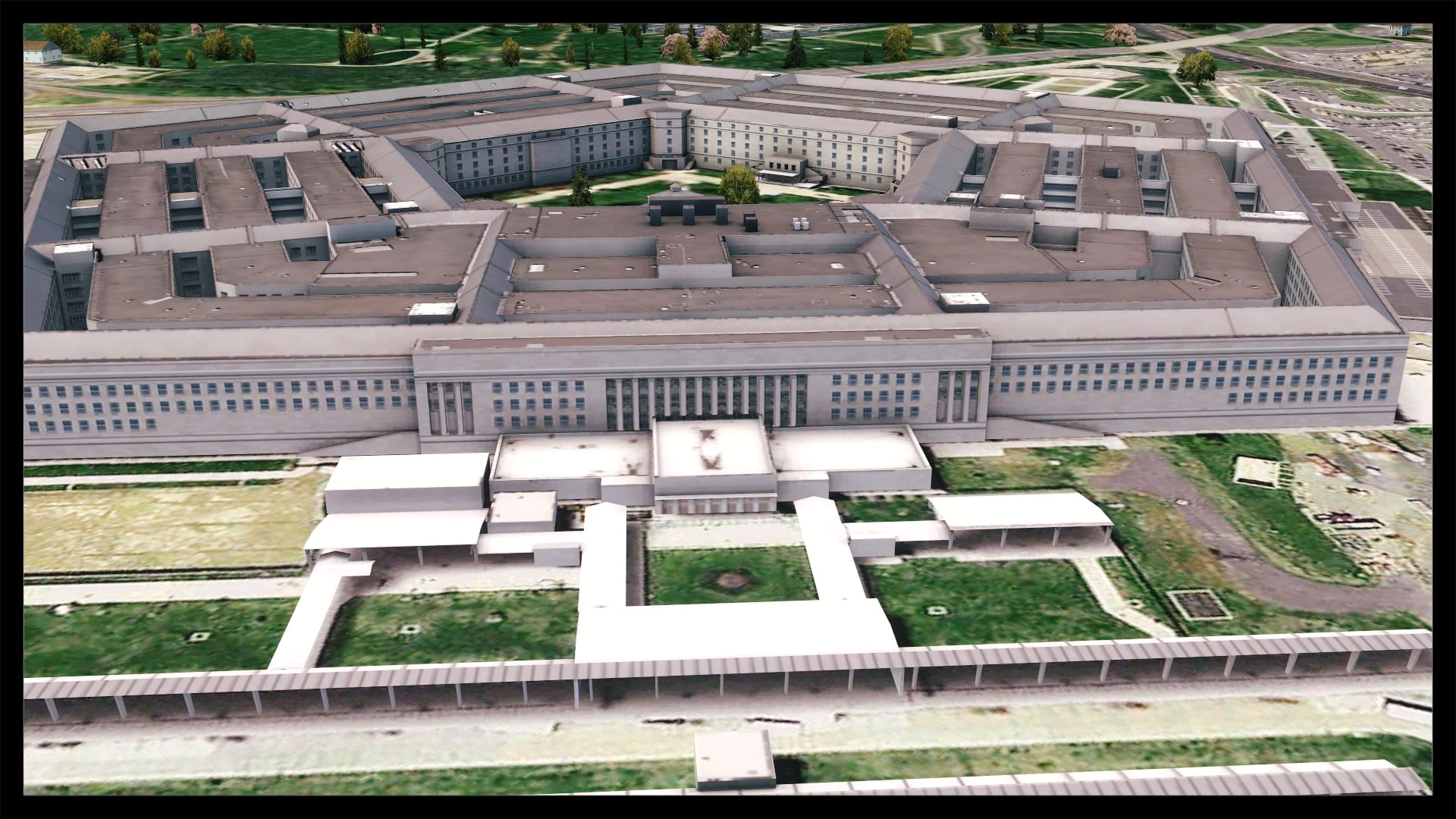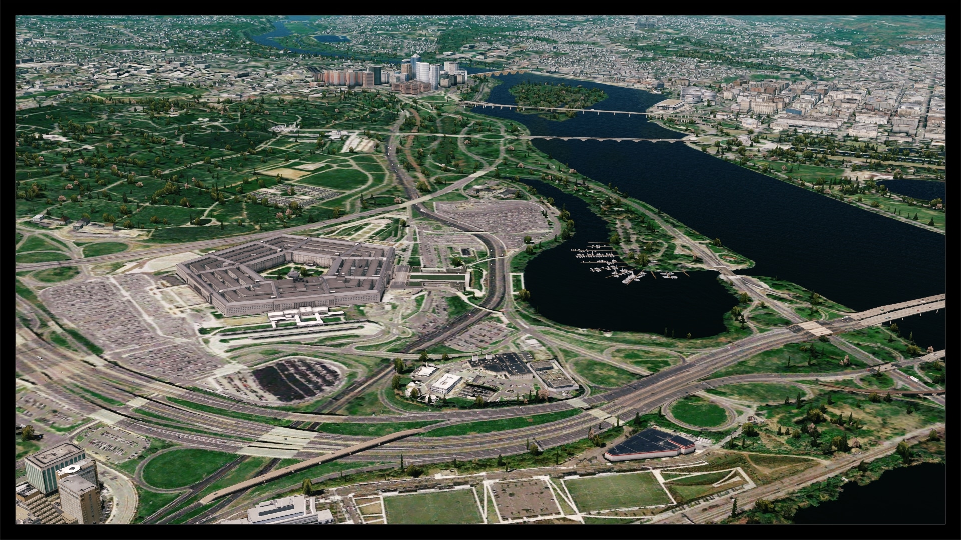 Hinter den Gebäuden erblicken wir das fünfeckige Pentagon, welches ich auf den ersten Blick als zu dunkel und grau empfand. Nach einem Abgleich mit Originalaufnahmen entspricht dies jedoch der Realität. Interessant ist, warum das Pentagon fünfeckig ist: Ursprünglich sollte das Gebäude an einem anderen Ort errichtet werden. Das dafür vorgesehene Gelände wurde von fünf Straßen umschlossen, welche man natürlich im Bauentwurf des Pentagon berücksichtigte. Allerdings legte Präsident Roosevelt sein Veto ein, da er bedenken hatte, das Gebäude könne die Blickachse vom Nationalfriedhof auf die Stadt Washington D.C. stören. Also suchte man einen anderen Platz, behielt jedoch die fünfeckige Form aus dem Bauentwurf bei.