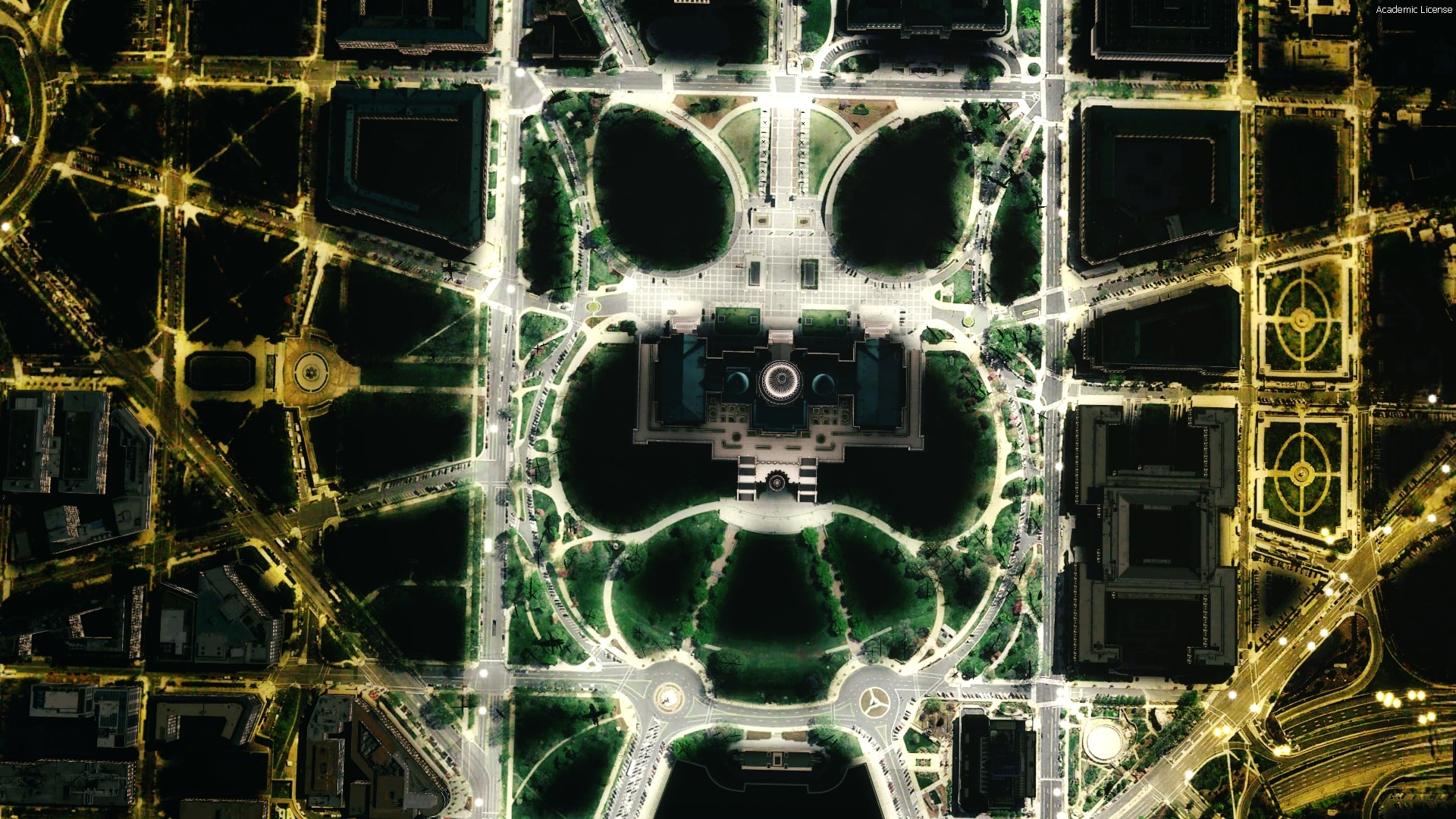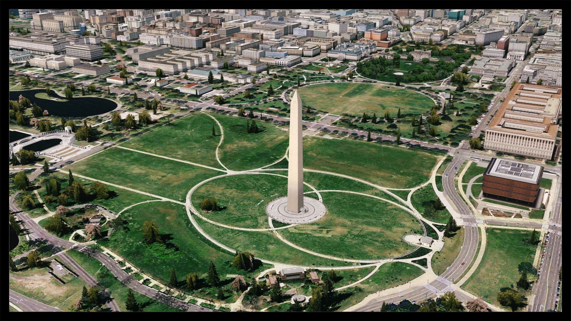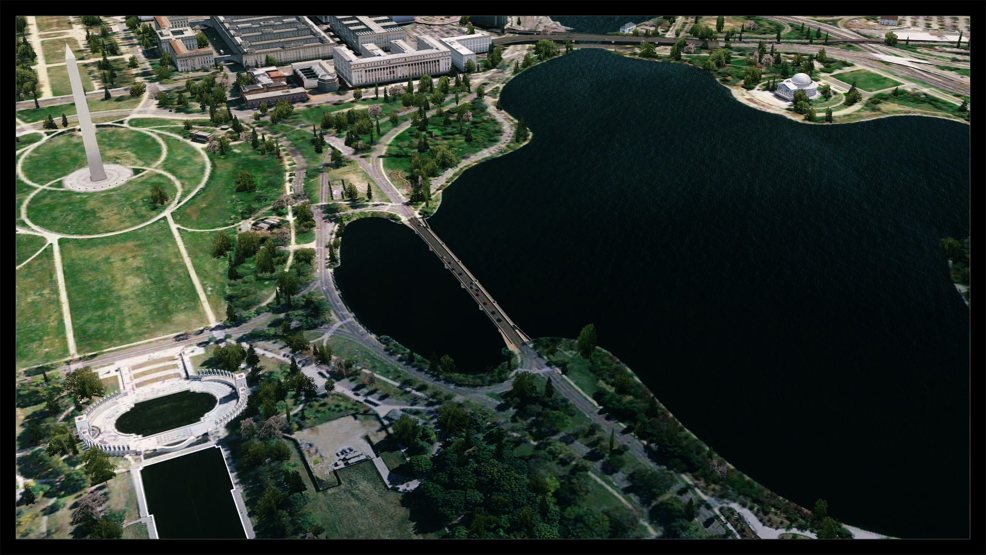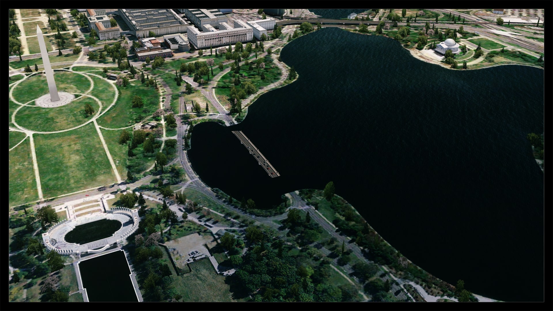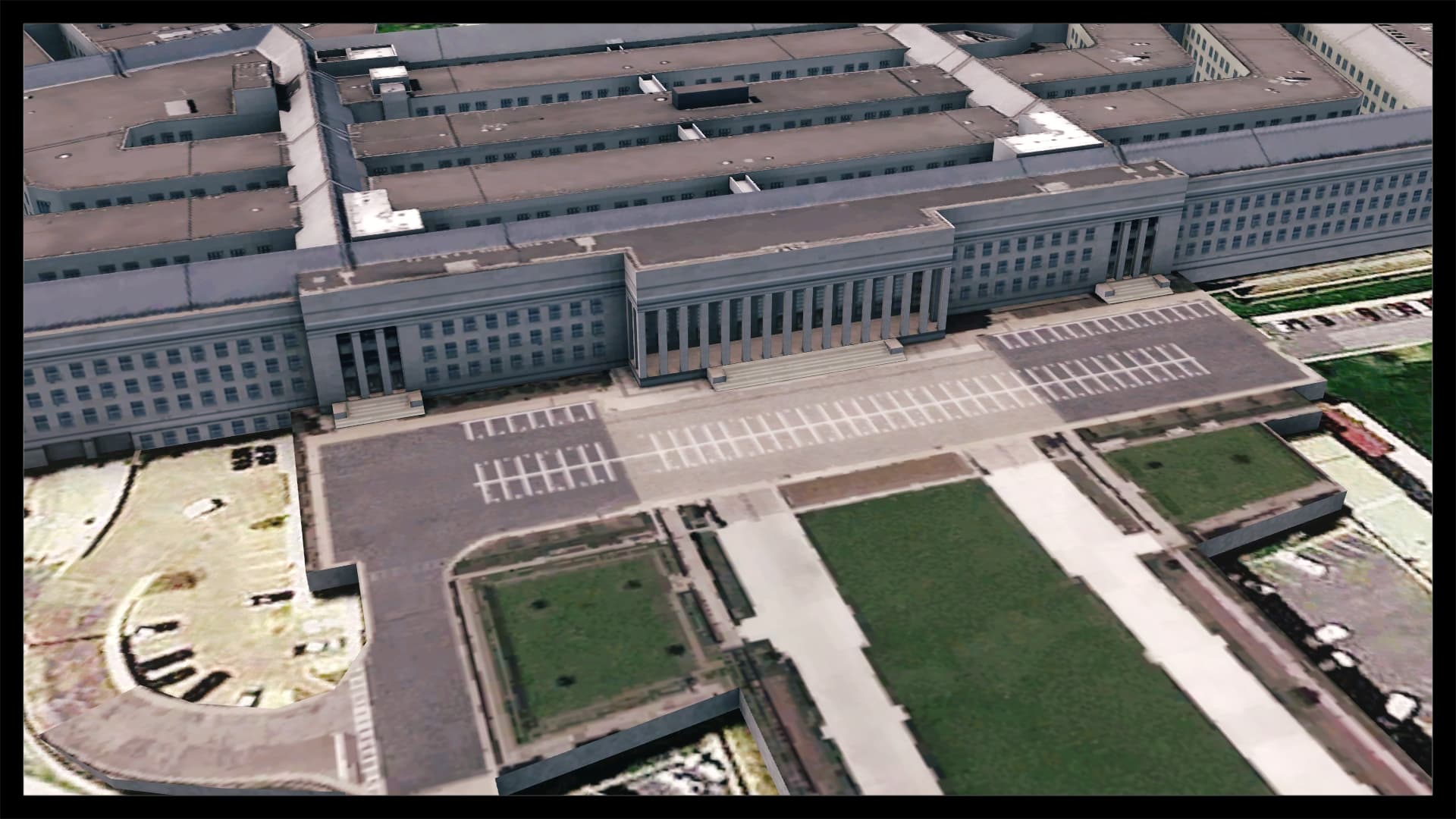 Hinter den Gebäuden erblicken wir das fünfeckige Pentagon, welches ich auf den ersten Blick als zu dunkel und grau empfand. Nach einem Abgleich mit Originalaufnahmen entspricht dies jedoch der Realität. Interessant ist, warum das Pentagon fünfeckig ist: Ursprünglich sollte das Gebäude an einem anderen Ort errichtet werden. Das dafür vorgesehene Gelände wurde von fünf Straßen umschlossen, welche man natürlich im Bauentwurf des Pentagon berücksichtigte. Allerdings legte Präsident Roosevelt sein Veto ein, da er bedenken hatte, das Gebäude könne die Blickachse vom Nationalfriedhof auf die Stadt Washington D.C. stören. Also suchte man einen anderen Platz, behielt jedoch die fünfeckige Form aus dem Bauentwurf bei.