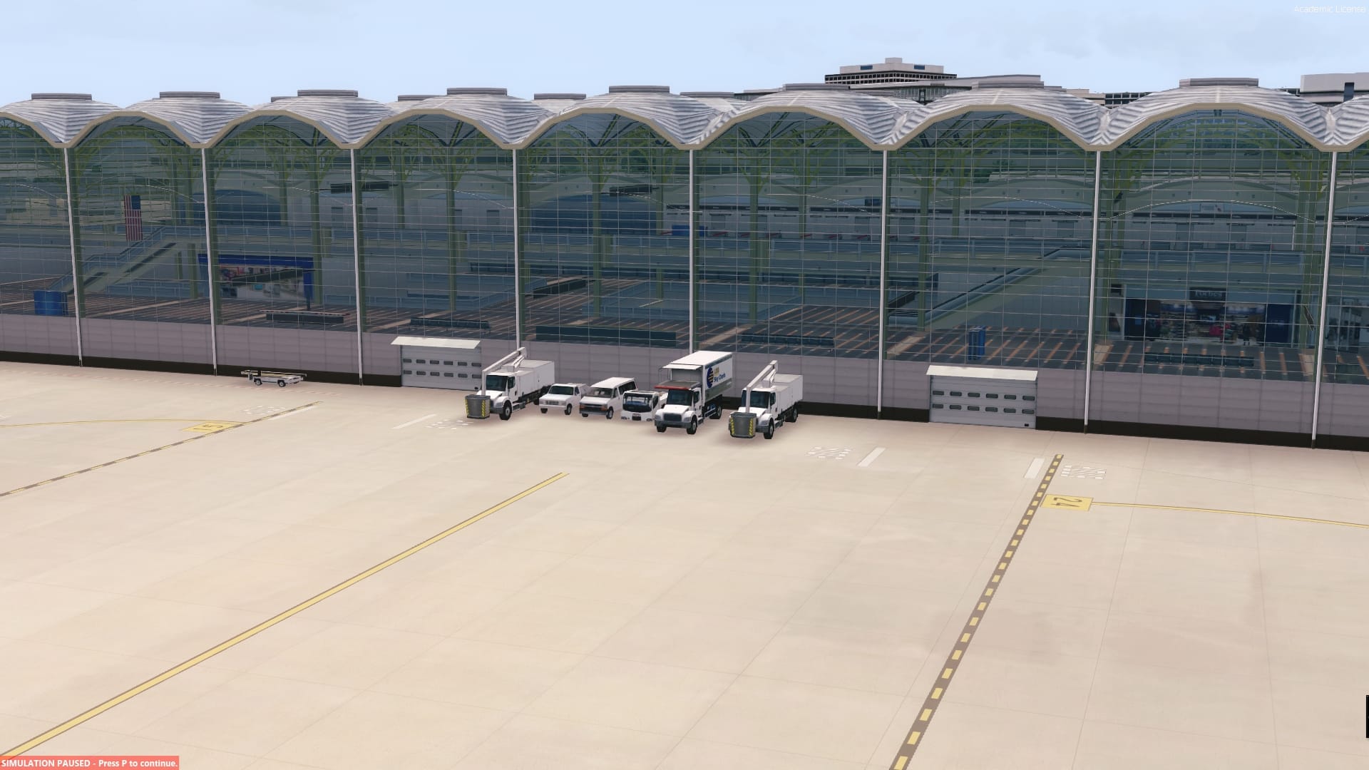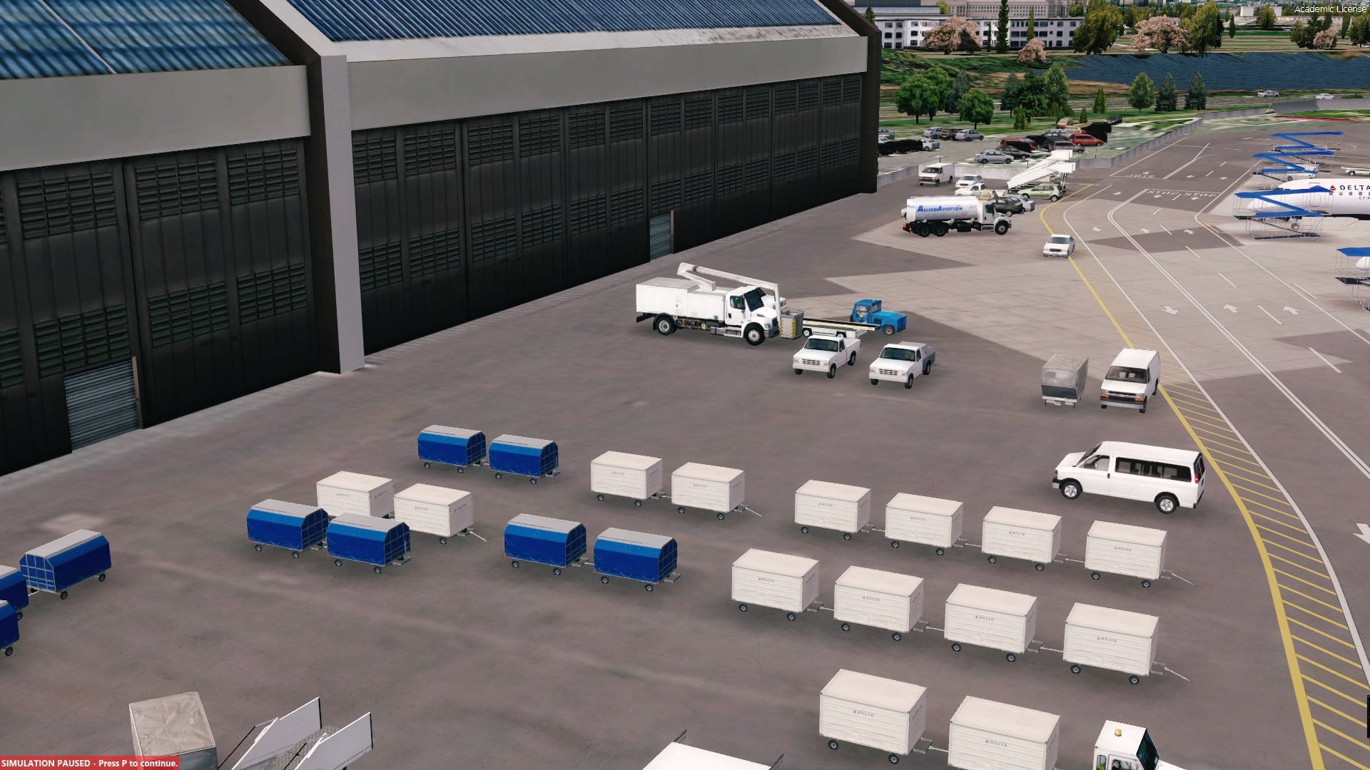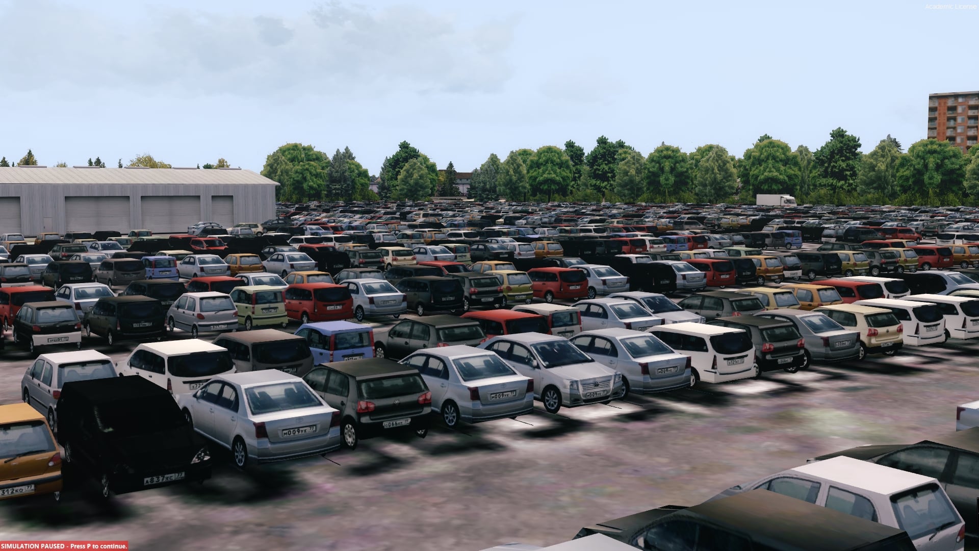 Zum Flair tragen auch die vielen geparkten Fahrzeuge am Ende der Bahn 01 und am südlichen Hangarbereich bei. Allerdings haben alle Autos russische Kennzeichen und die Zusammensetzung ähnelt mehr einem europäischen Parkplatz als einem U.S.-amerikanischen.