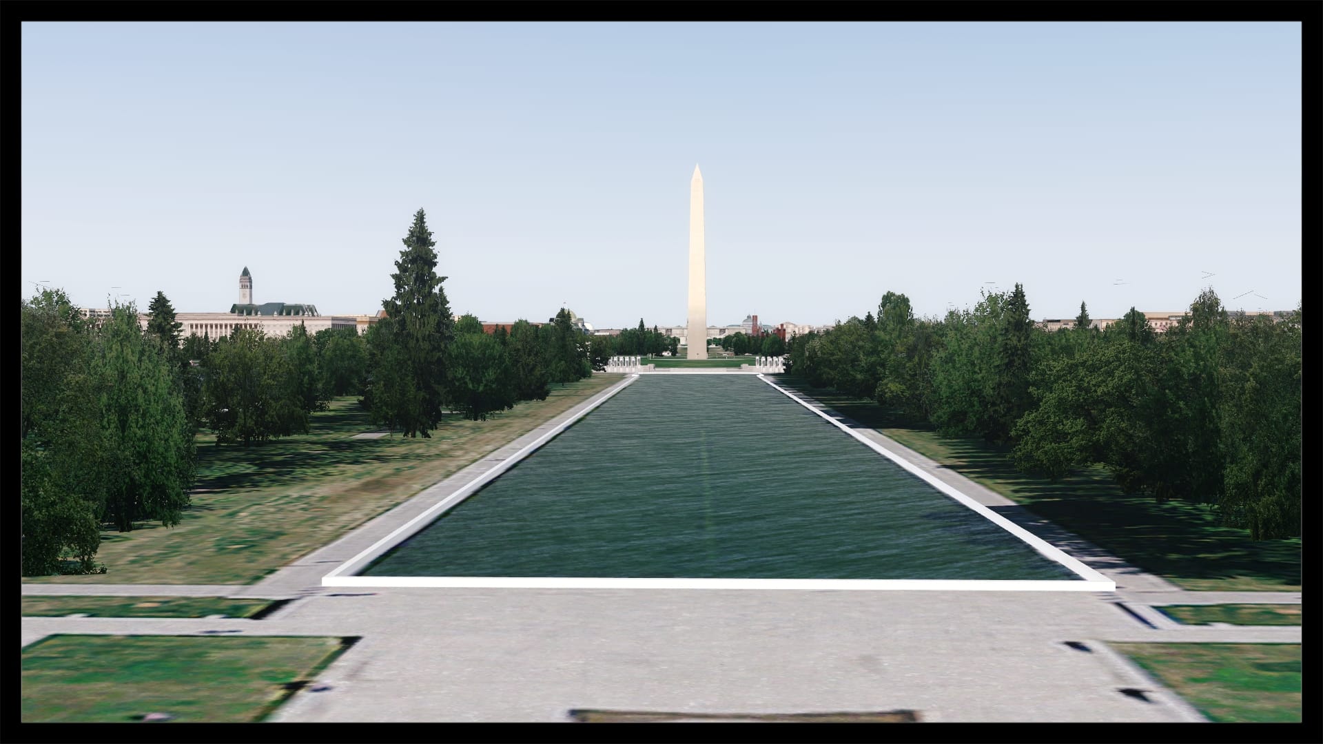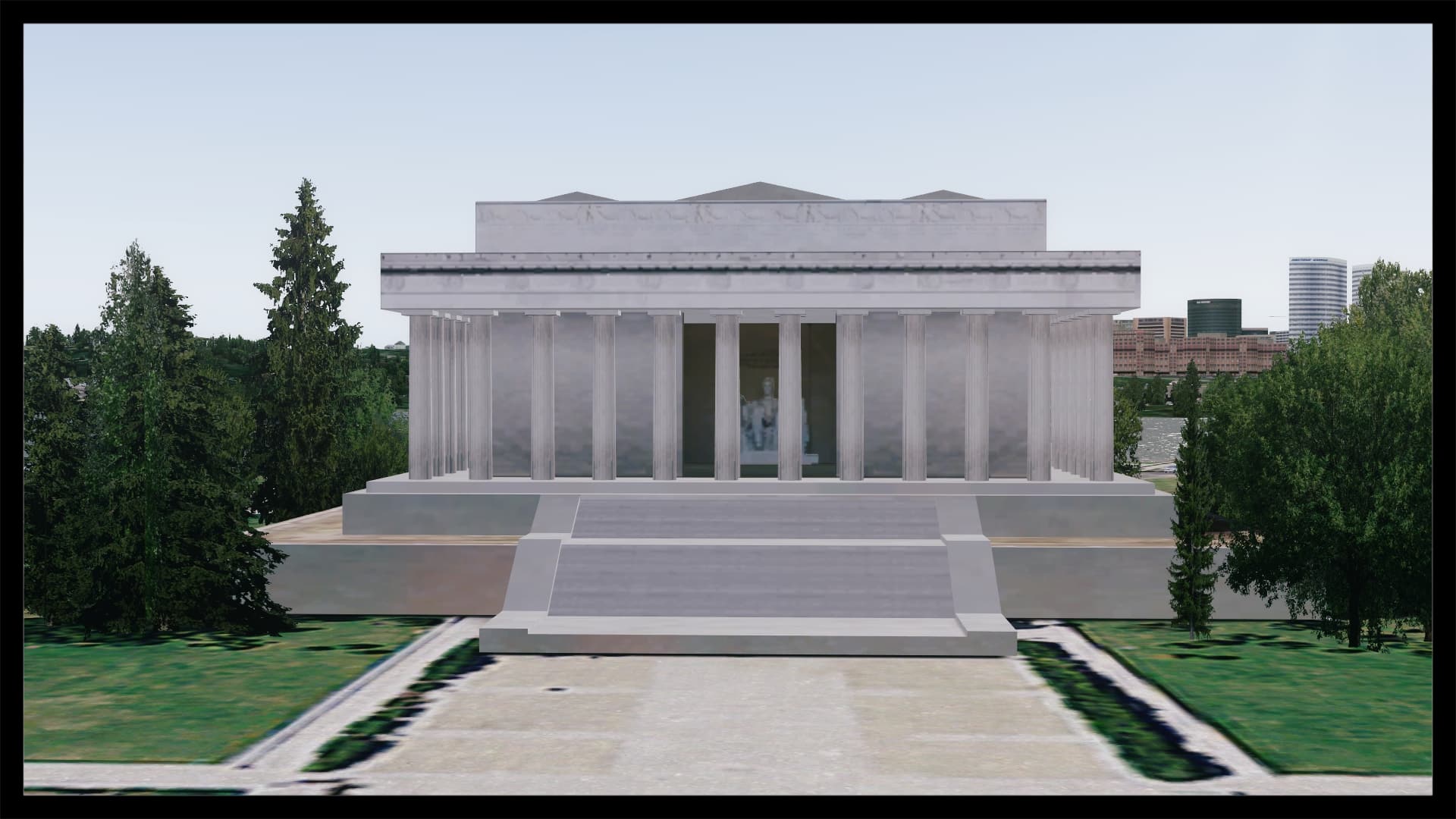 Durch das Überqueren der Arlington Memorial Bridge kommen wir direkt auf das Lincoln Memorial zu. Das Betrachten und Bewerten von jedem Gebäude würde den Rahmen sprengen. Drzewiecki Design hat sich jedoch nicht lumpen lassen. Bei einem zufälligen Abgleich von Gebäuden mit dem originalen Vorbild konnte ich keine Abweichungen feststellen. Damit meine ich primär das grobe Aussehen und die Platzierung. Wie bereits erwähnt, beträgt die Auflösung des Untergrundes in der Innenstadt 0,5m/Pixel. Dadurch zeichnet sich, mit etwas Flughöhe, ein gestochen scharfes Bild ab. Auf der anderen Seite ist dadurch der Übergang zum niedriger aufgelösten Bereich schnell zu erblicken.