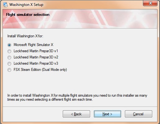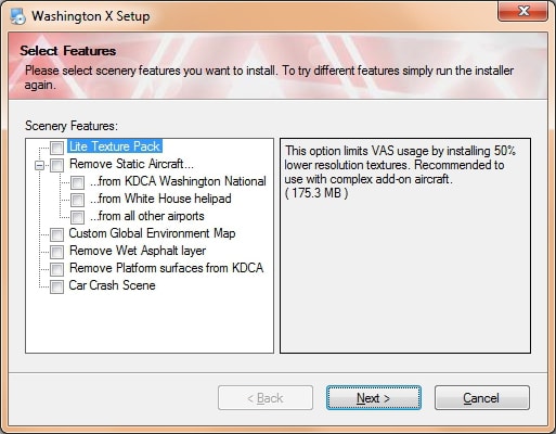 Für 33,86€ bekommt man vom Simmarket die virtuellen Besuchsrechte für Washington. Nachdem der 1,5 GB große Download auf der Festplatte ist, verläuft die weitere Installation problemlos. Der Washington X Installer unterstützt den FSX, FSX SE und P3D V1-V3 und erlaubt einige Einstellmöglichkeiten, um die Szenerie individuell an die eigenen Bedürfnisse anzupassen. Mit zum Lieferumfang gehören neben der Stadtumsetzung auch die Flughäfen KDCA Washington National Airport, KADW Joint Base Andrews, KCGS College Park Airport, KVKX Potomac Airfield und W32 Washington Executive Airport, wobei es sich bei den letztgenannten, bis auf Washington National, um ausdrückliche „Lite“ Umsetzungen handelt. Darüber hinaus wird auch ein vierseitiges Manual mitgeliefert, welches die nötigsten, aber auch wirklich nur die nötigsten Angaben enthält. Eine Karte mit dem genauen Grenzen der Szenerie oder Charts zu den Airports fehlen komplett. Allerdings findet man unter diesem Link die nötigen Anflugkarten.