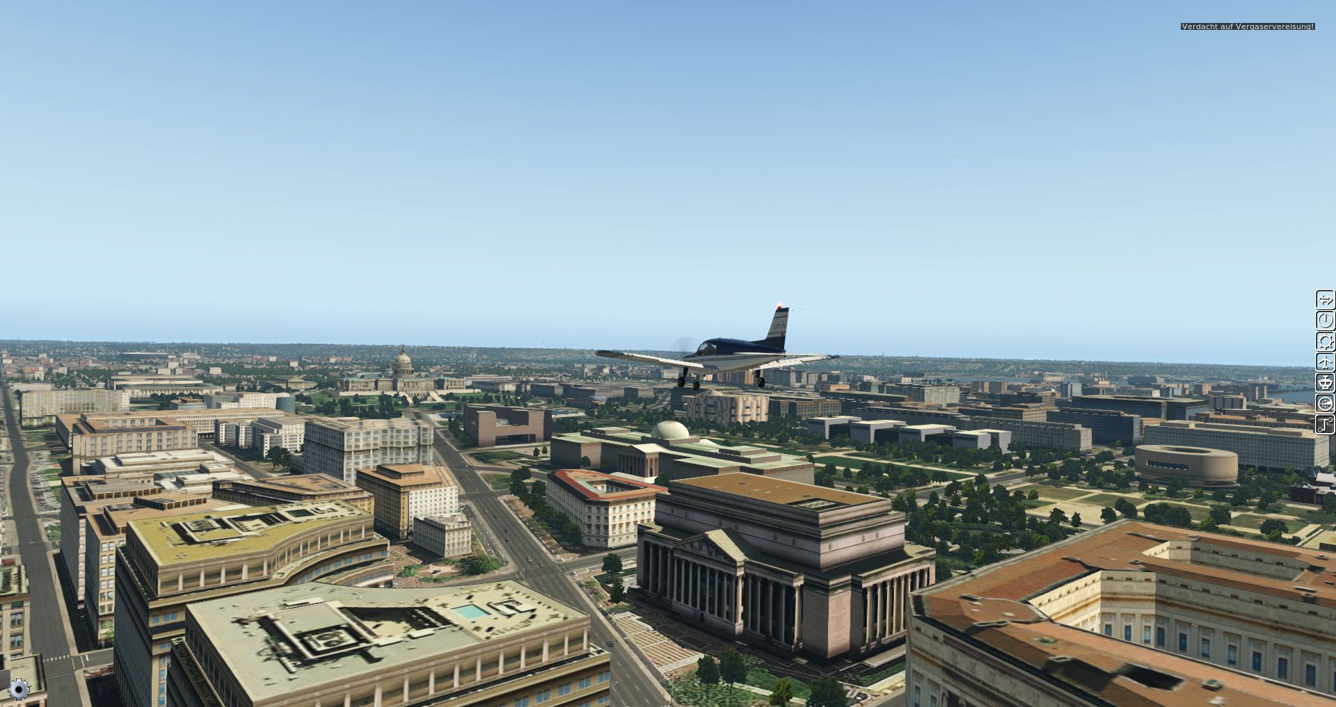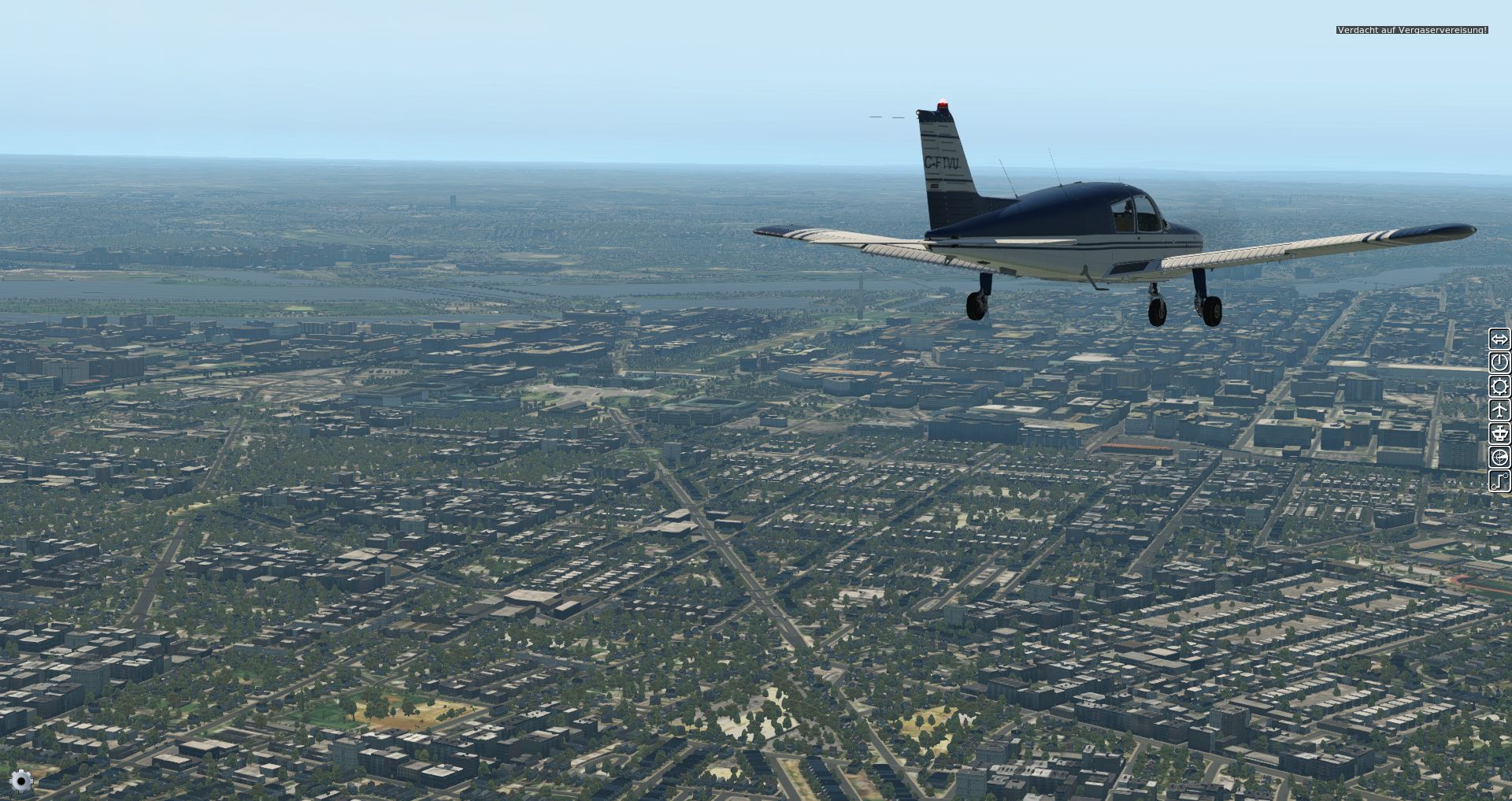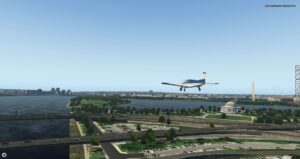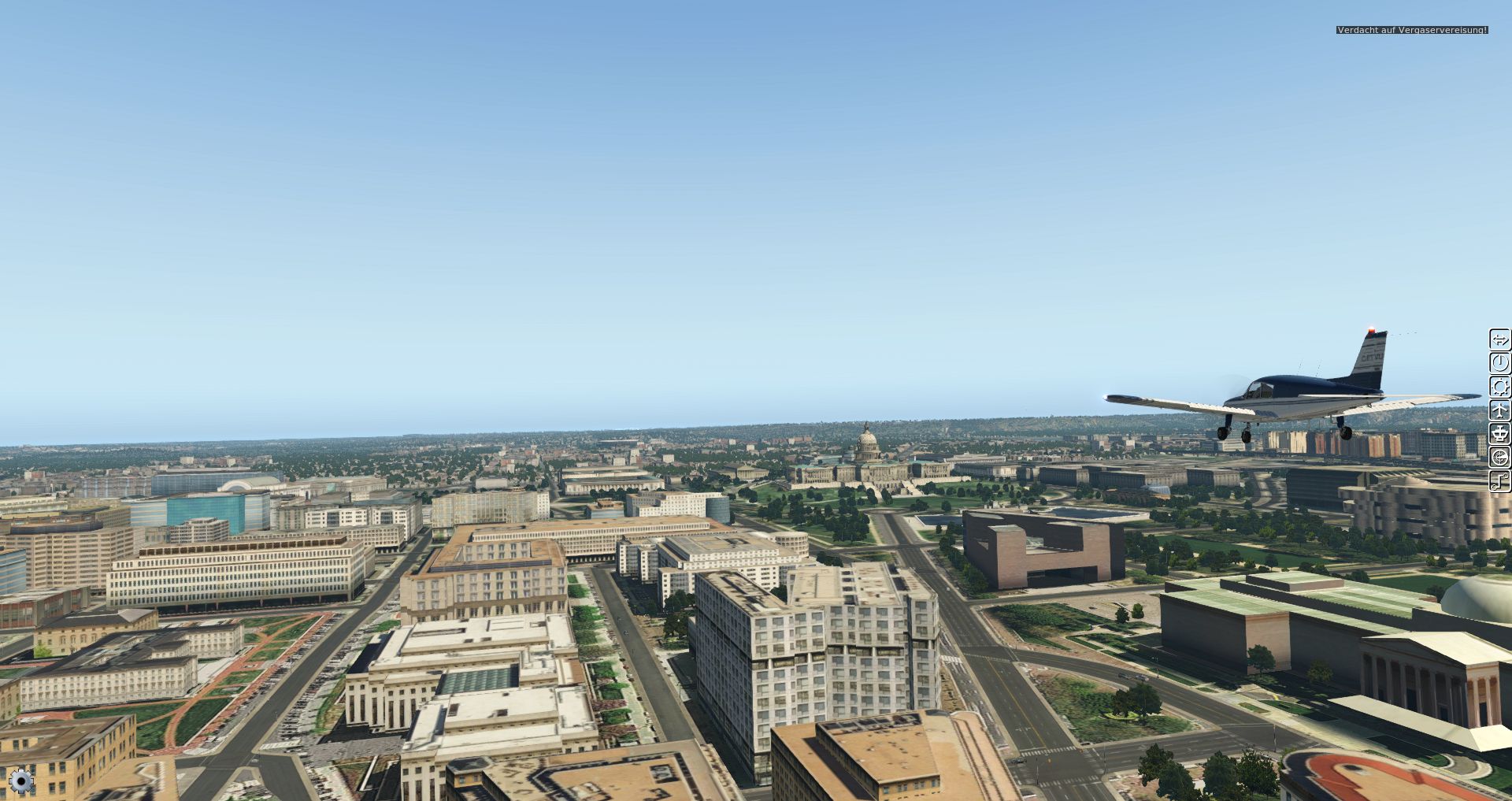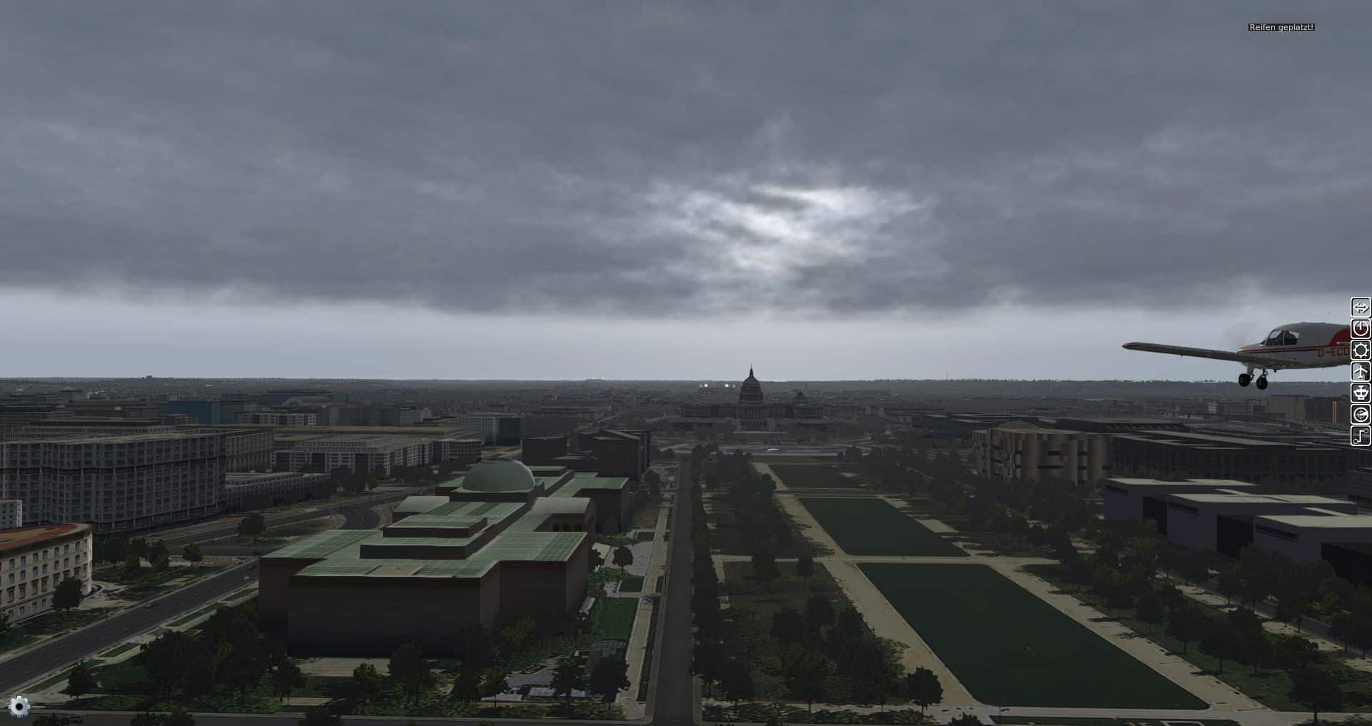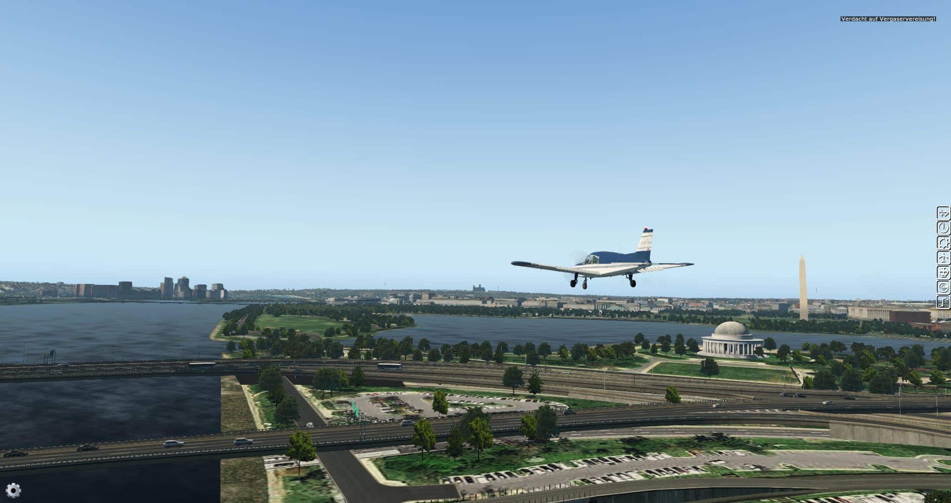 Der erste Flug erfolgt ohne jegliche Payware Addons. Da in einer Stadt-Szenerie eher Tiefflug benötigt wird, heben wir mit der Cessna 172 vom Flughafen Washington National (KDCA) ab.