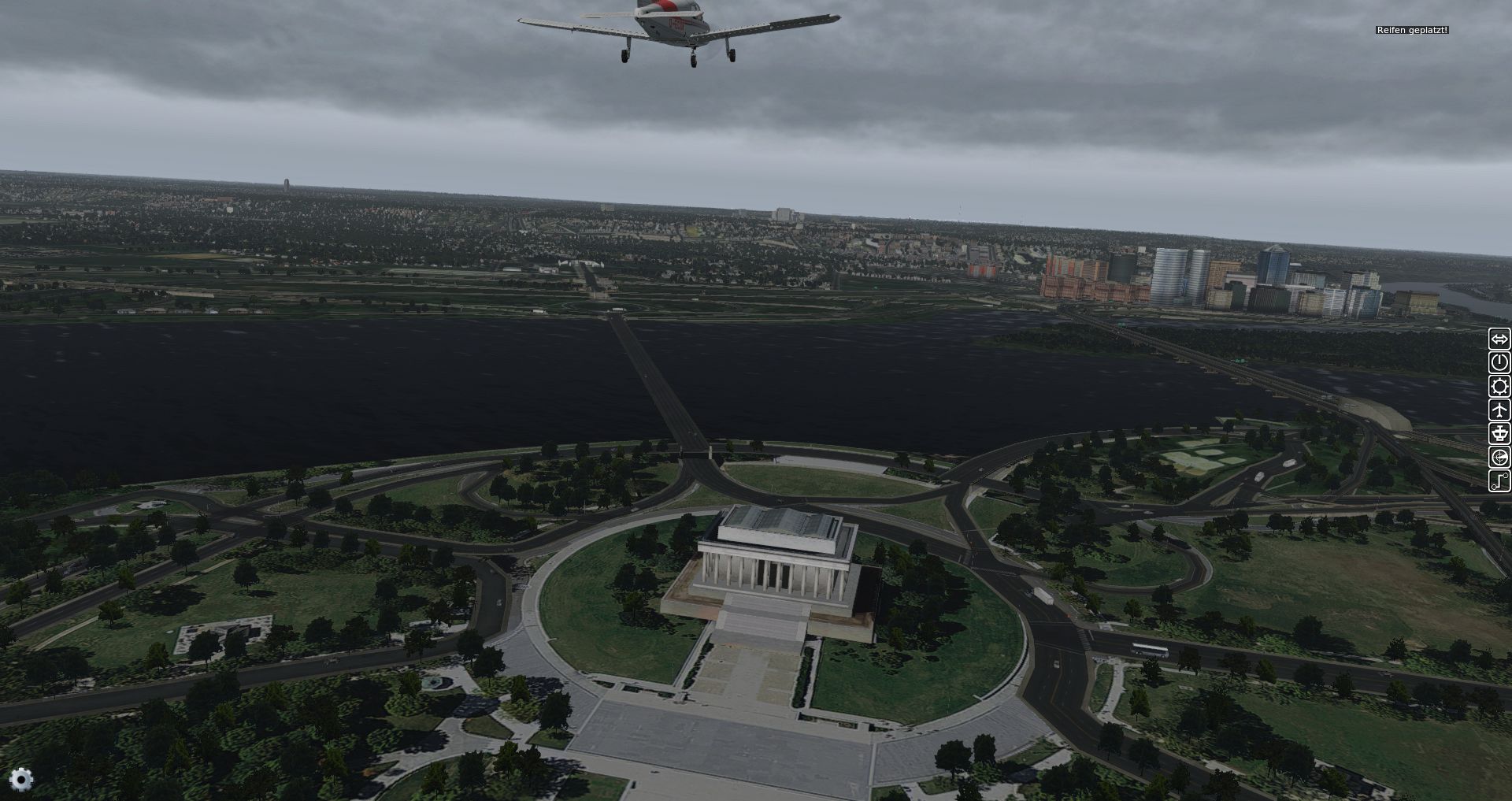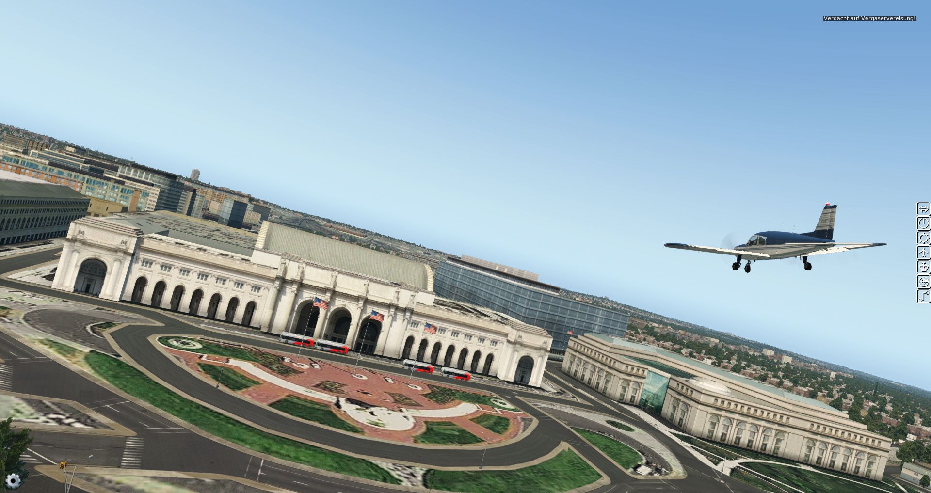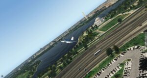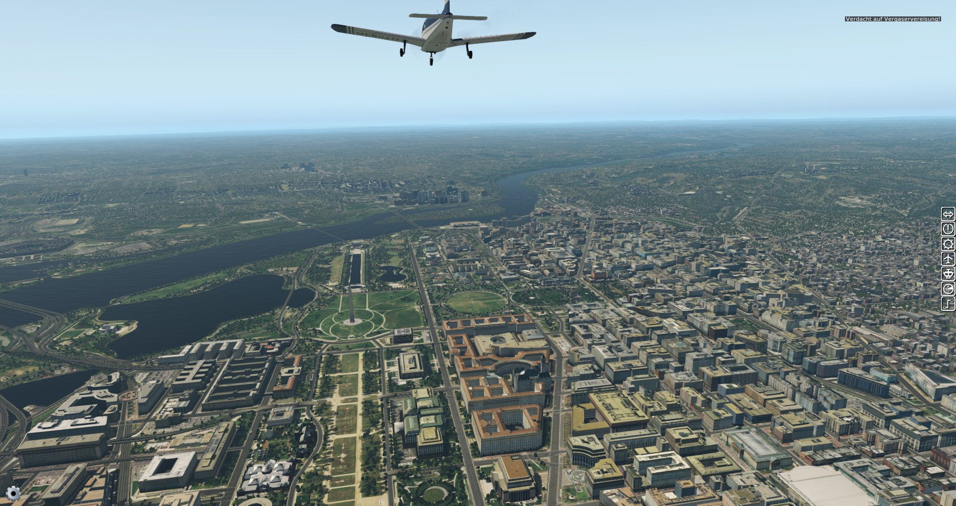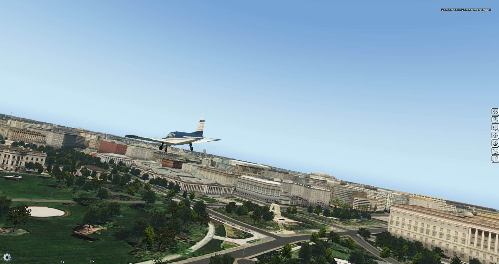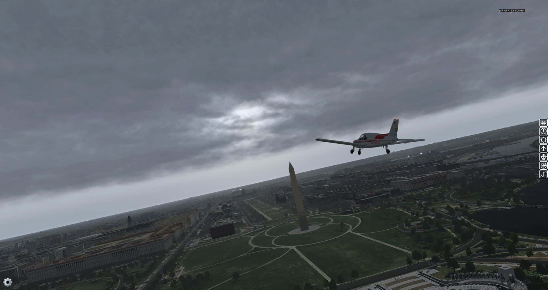 Der erste Flug erfolgt ohne jegliche Payware Addons. Da in einer Stadt-Szenerie eher Tiefflug benötigt wird, heben wir mit der Cessna 172 vom Flughafen Washington National (KDCA) ab.