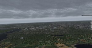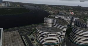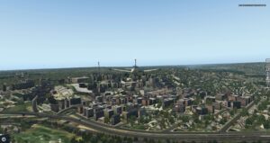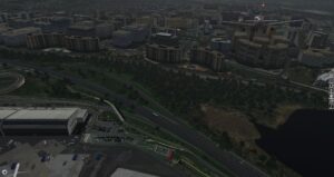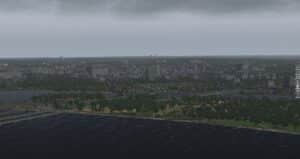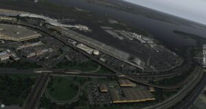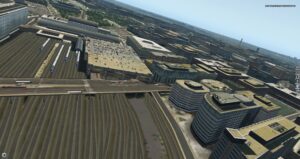 Vor den Hochhäusern liegen Eisenbahnschienen, die auch von den X-Plane-eigenen Eisenbahnen genutzt werden, genauso wie auf den Straßen der Standard-Autoverkehr fließt. In der direkten Umgebung der Custom-Gebäude wirkt das Gelände etwas flach und unscharf, doch direkt dahinter sieht es verdächtig nach den Default Gebäuden aus.