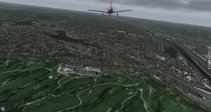 Seit der letzten Version von X-Plane 11 ist selbst mein alter i7-950 in der Lage, das AutoGen auf den maximalen Einstellungen zu betreiben und genau das macht sich hier positiv bemerkbar. Während auf freien Stellen, wie einem Golfplatz, die niedrig aufgelöste Fototextur ein wenig verloren wirkt, ziehen hier die scharfen Straßen und Gebäude den Blick auf sich.