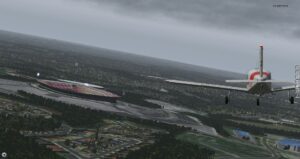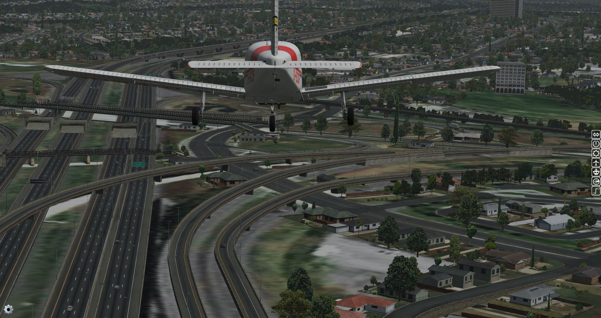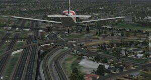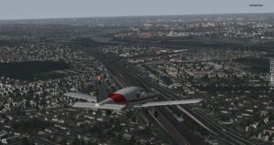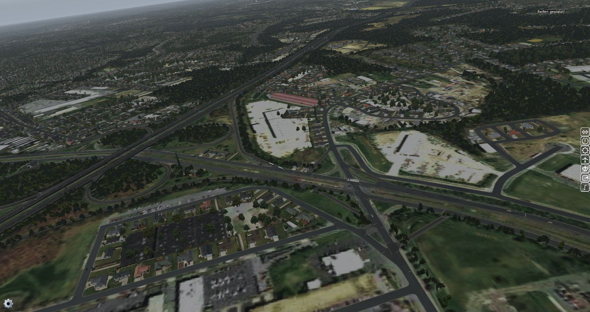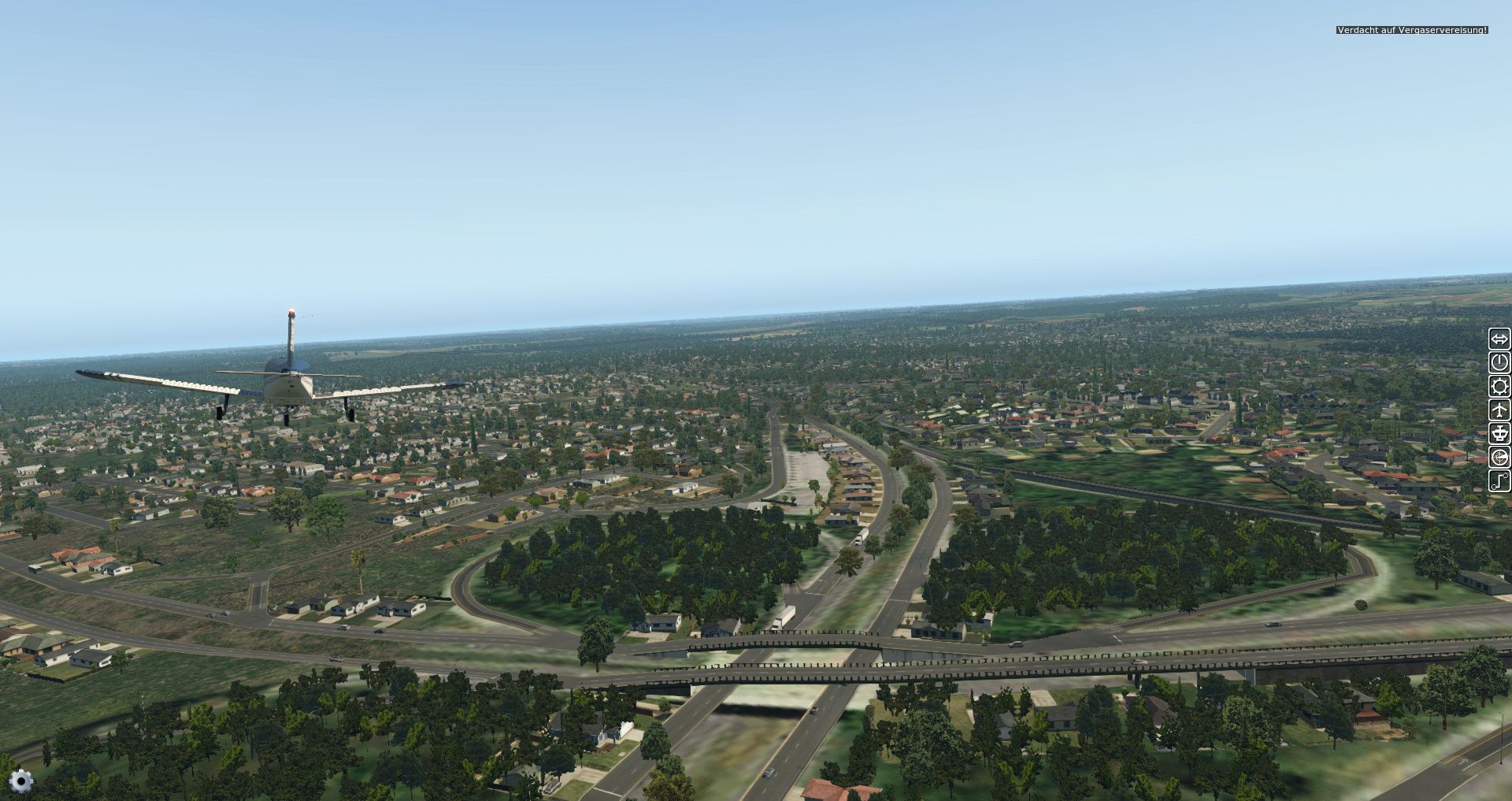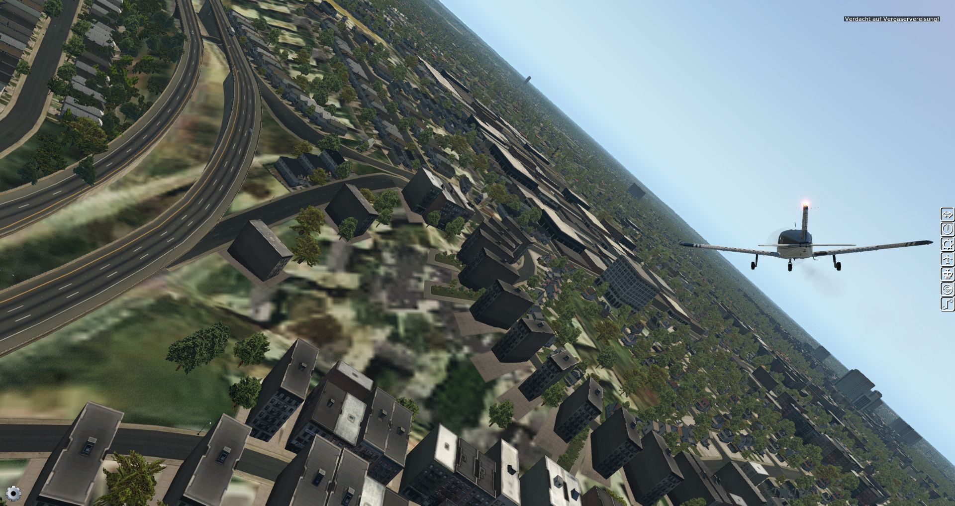 Im Tiefflug ist es unübersehbar: X-Plane Autobahnen, X-Plane Autobahnschilder und X-Plane Standard-Gebäude dominieren das Bild. Dadurch spielt auch die falsche Einordning der Fototexturen keine große Rolle. Wenn die Texturen in die Grafikkarte geladen werden, stellt die Grafikkarte fest, dass diese durch die Straße oder die Standardtexturen der Gebäude überdeckt werden und gibt diesen Speicher sofort wieder frei. Damit müssen diese ersetzten Texturabschnitte nicht erst aufwändig an das Bodenprofil angepasst werden, sondern das AutoGen platziert sofort seine Objekte an der gewünschten Stelle.
