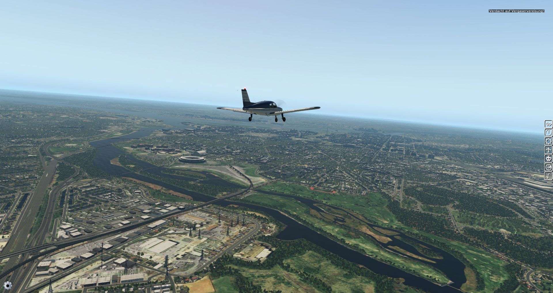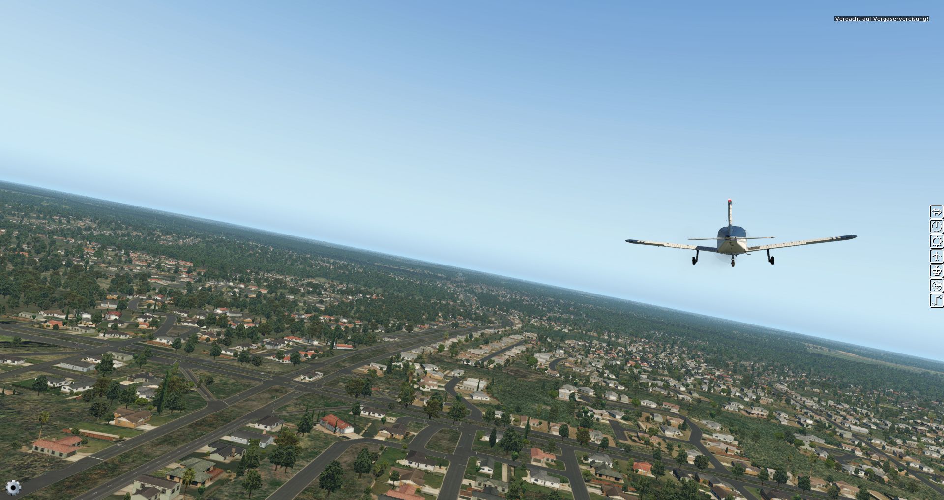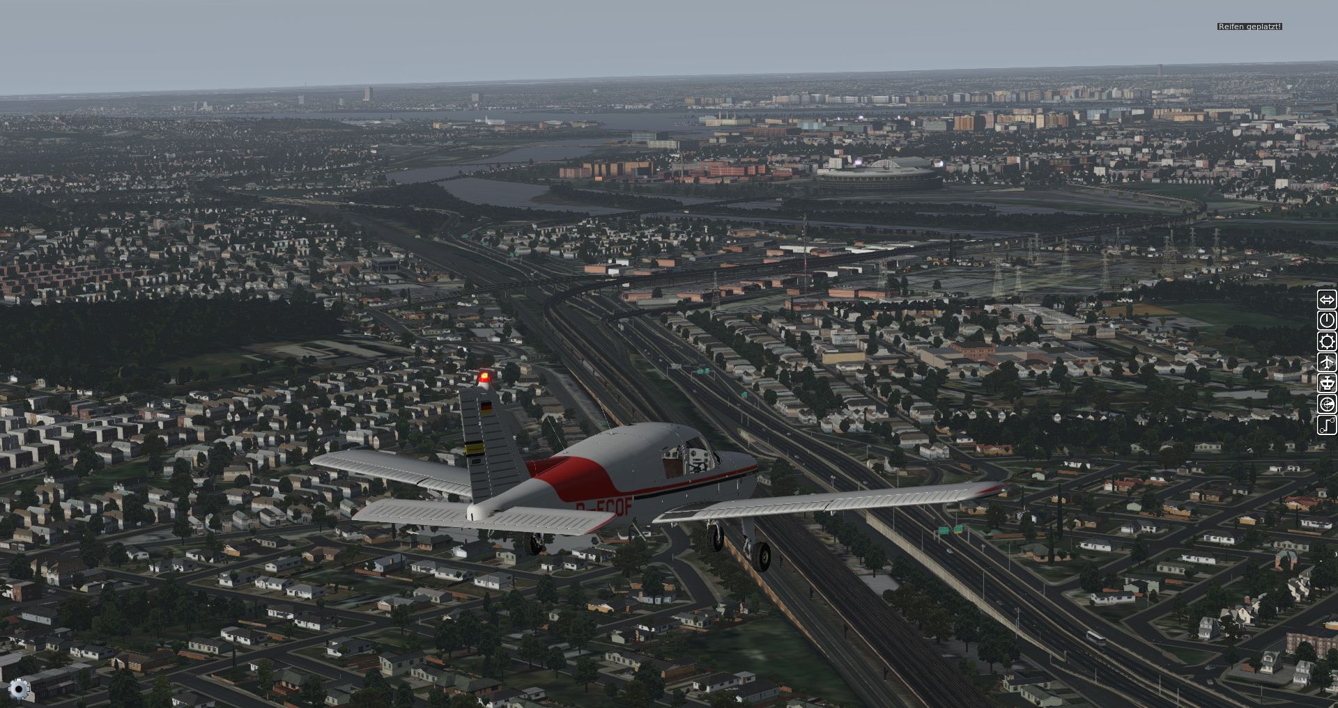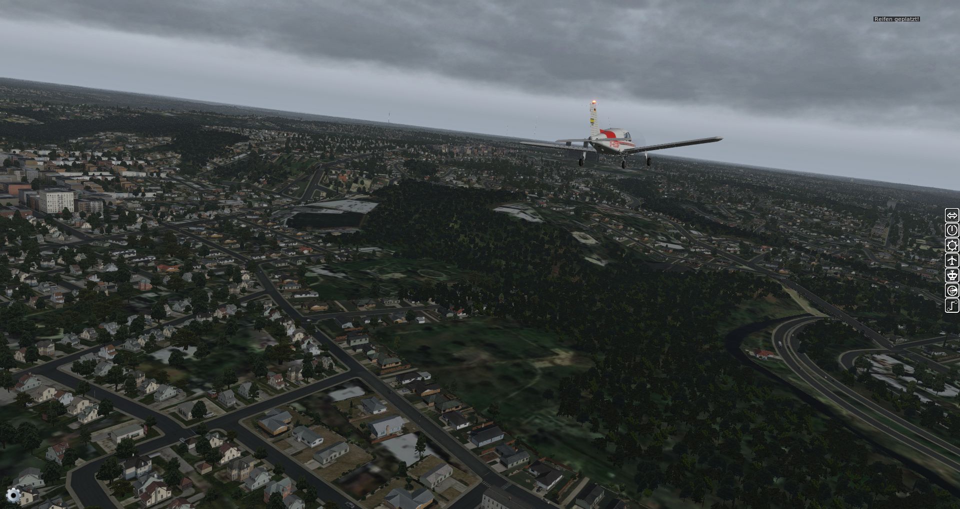 Der erste Flug dient dazu einen Überblick zu bekommen. Dabei nehme ich jedoch einen etwas anderen Weg, als Thomas für den P3D. Erst mal halten wir uns in den Randgebieten der Szenerie auf um die Integreation von AutoGen, Fototextur und Custom Gebäuden zu betrachten. Erst später gehen wir dann in die eigentlichen Kernbereiche wo Drzewiecki die Kontrolle an sich genommen hat. Als Maschine dient dabei ein vFlyteAir Cherokee 140 Classic. Sie hat zwar schon PBR Texturen, ist jedoch im Flugprofil noch nicht wirklich an X-Plane 11 angepasst.